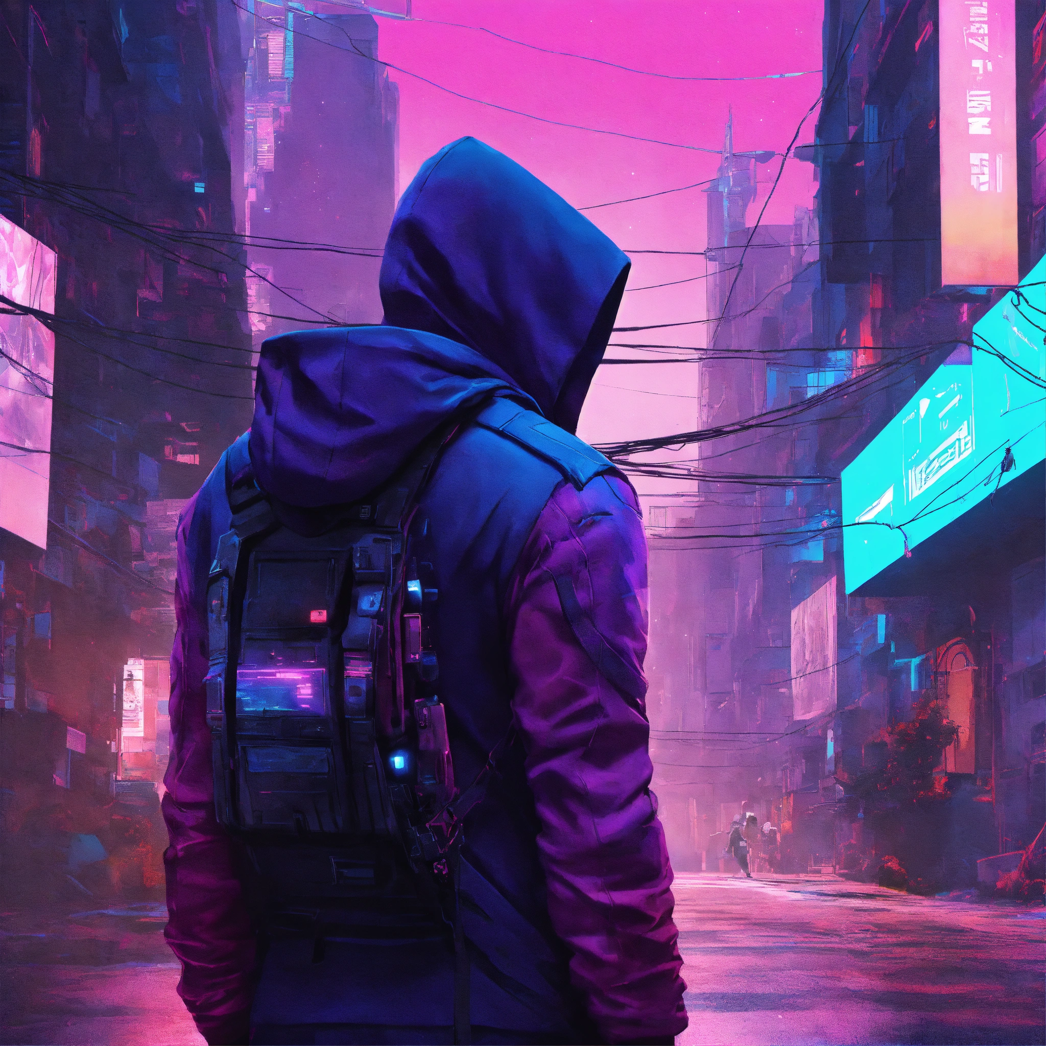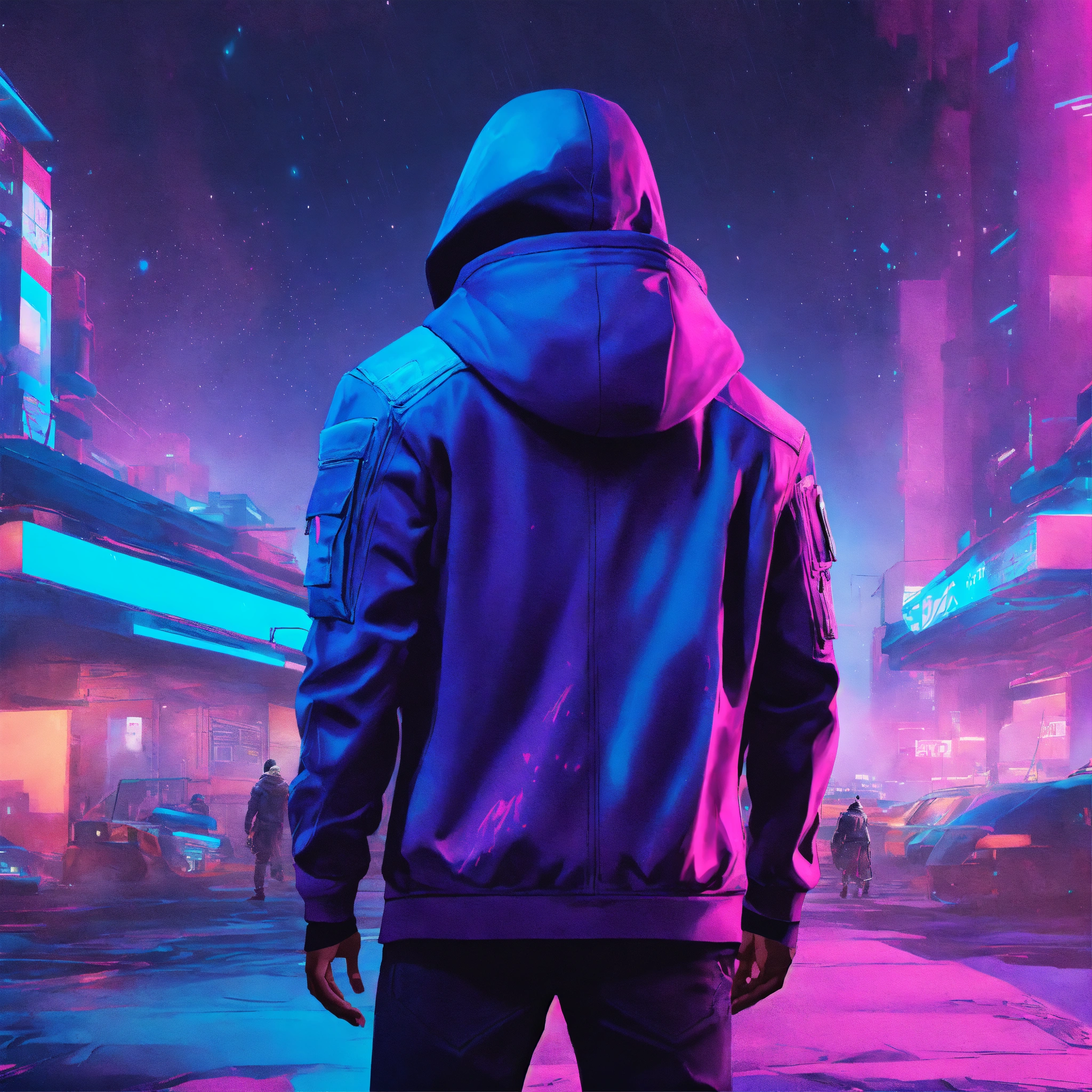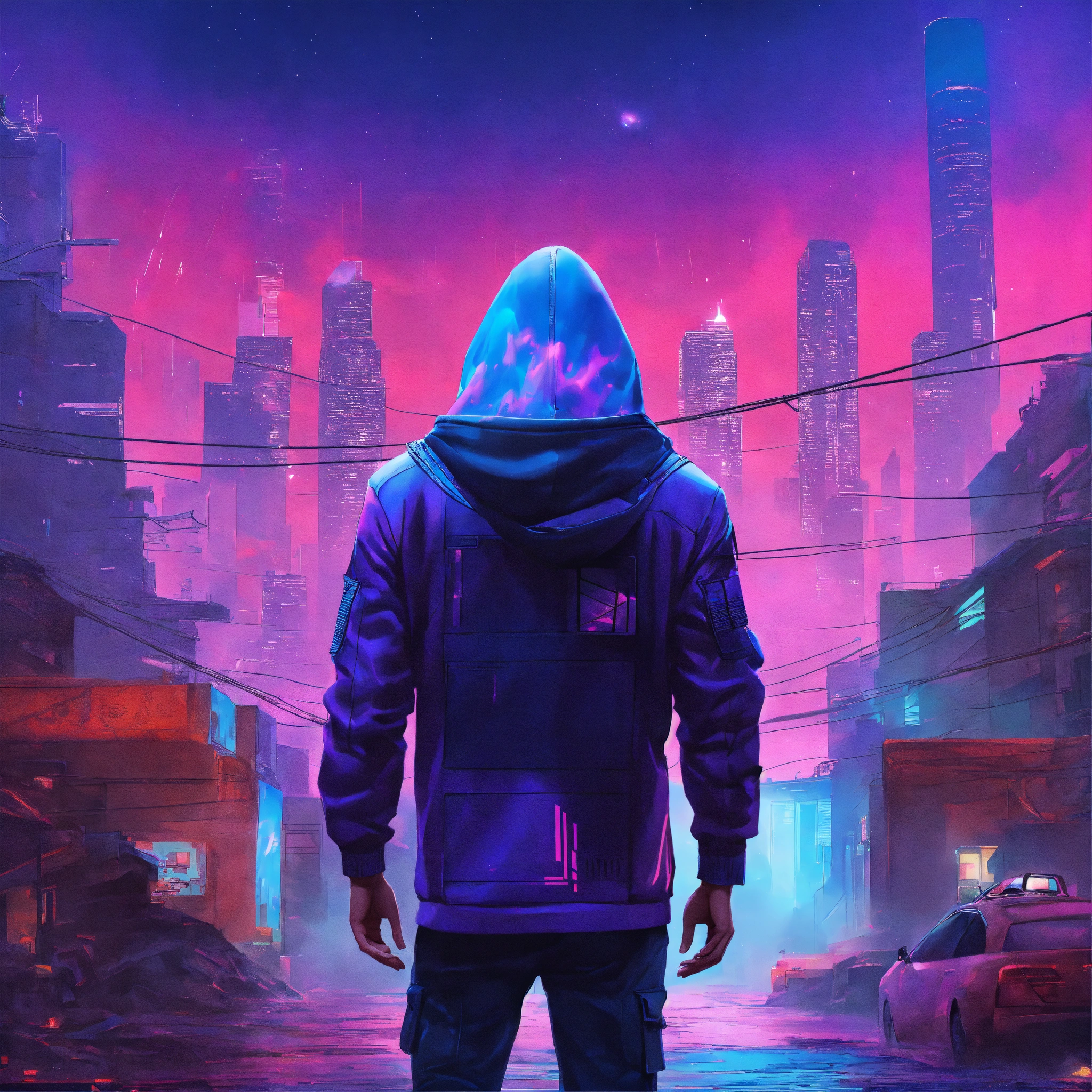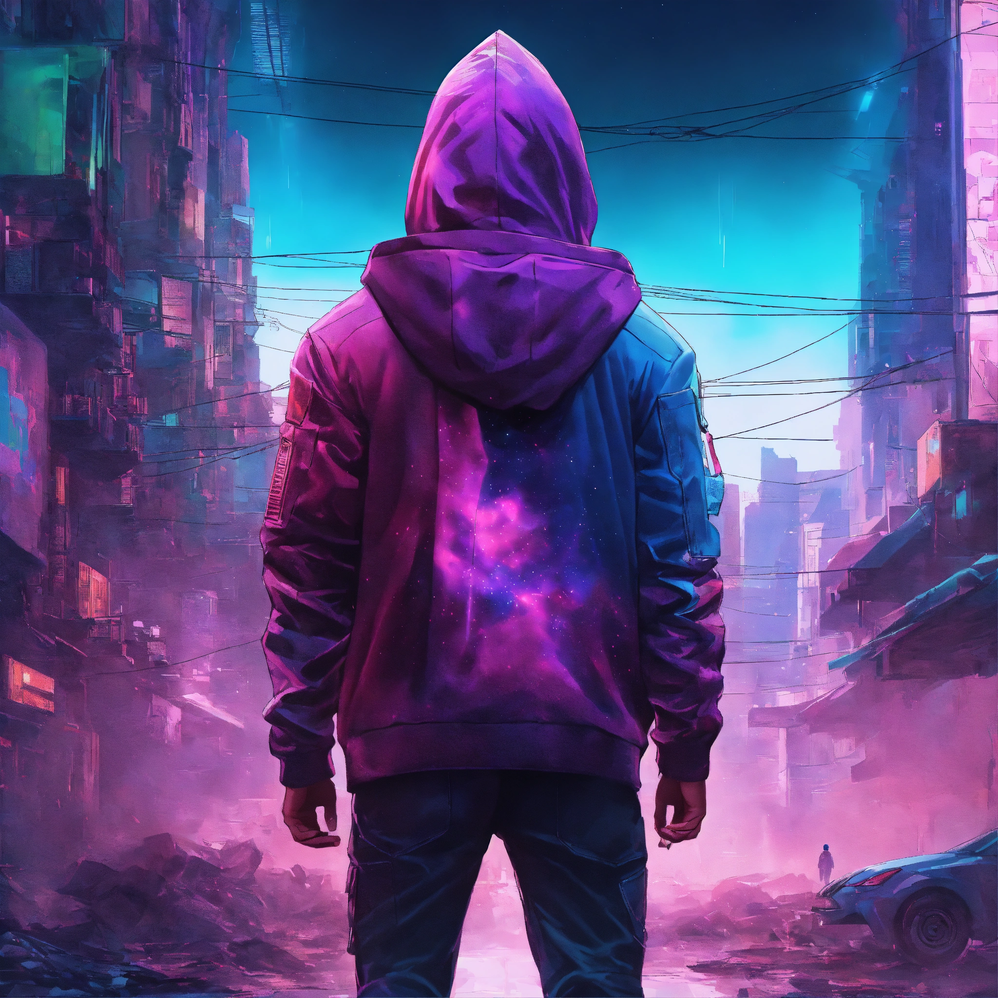 A man from behind, with a hood, quite thin but with a muscular back. a futuristic image that looks like a video game but is very realistic. purple, blue and pink colors. a glitch effect, like saturation above his brain. a fairly galactic universe, but buildings around it, a ghetto neighborhood.