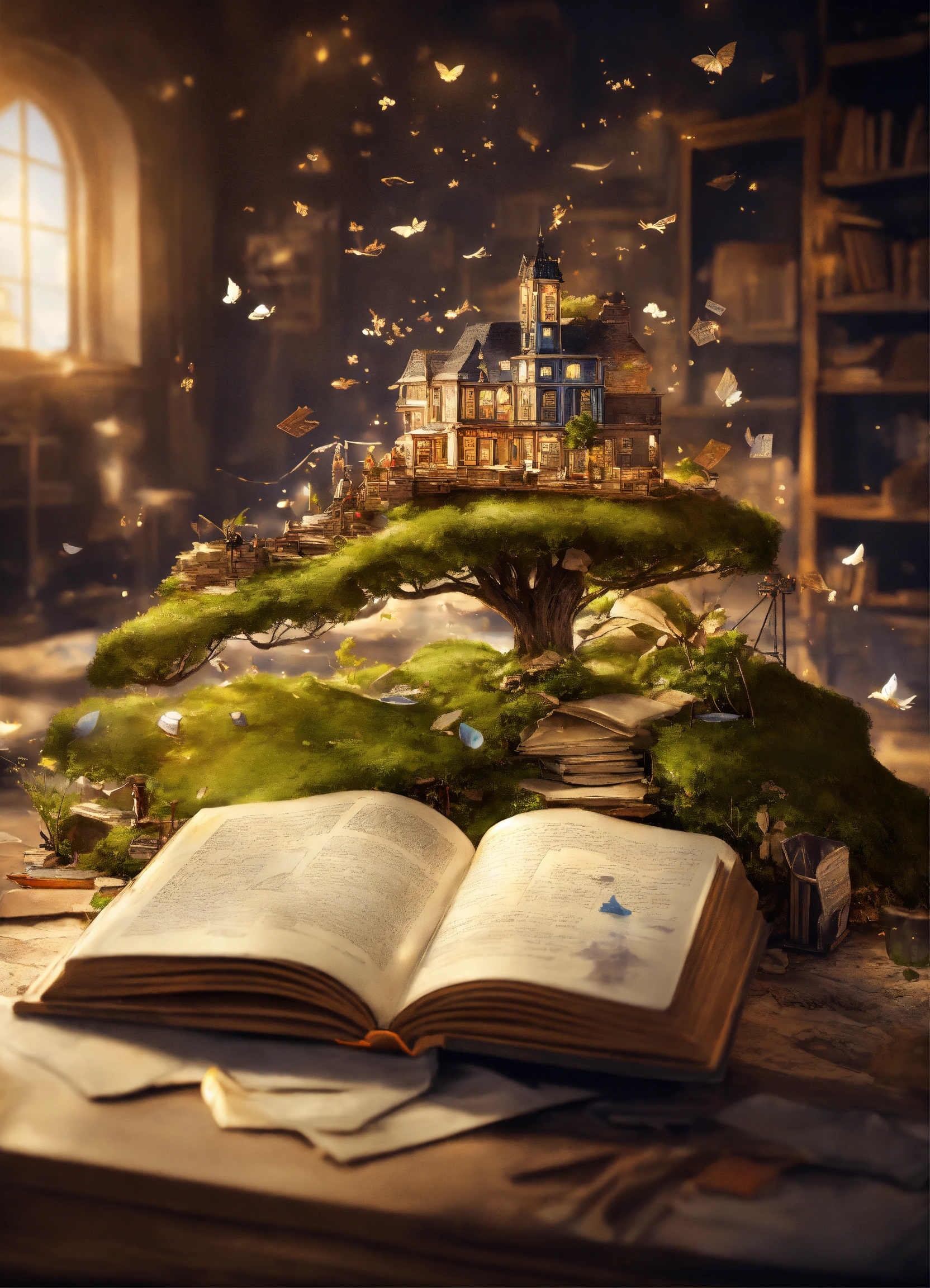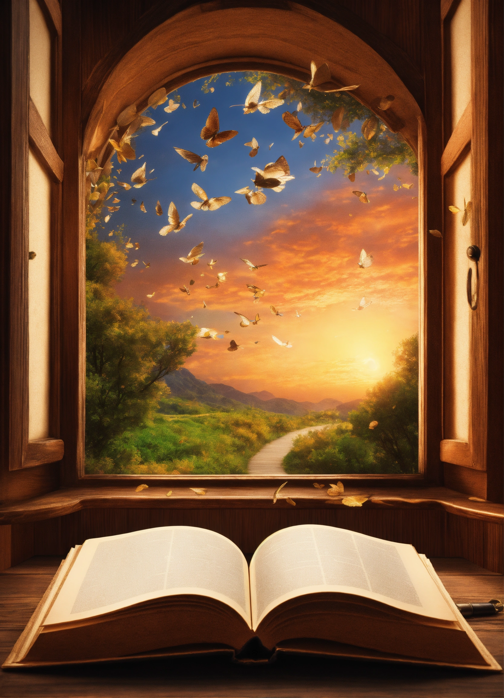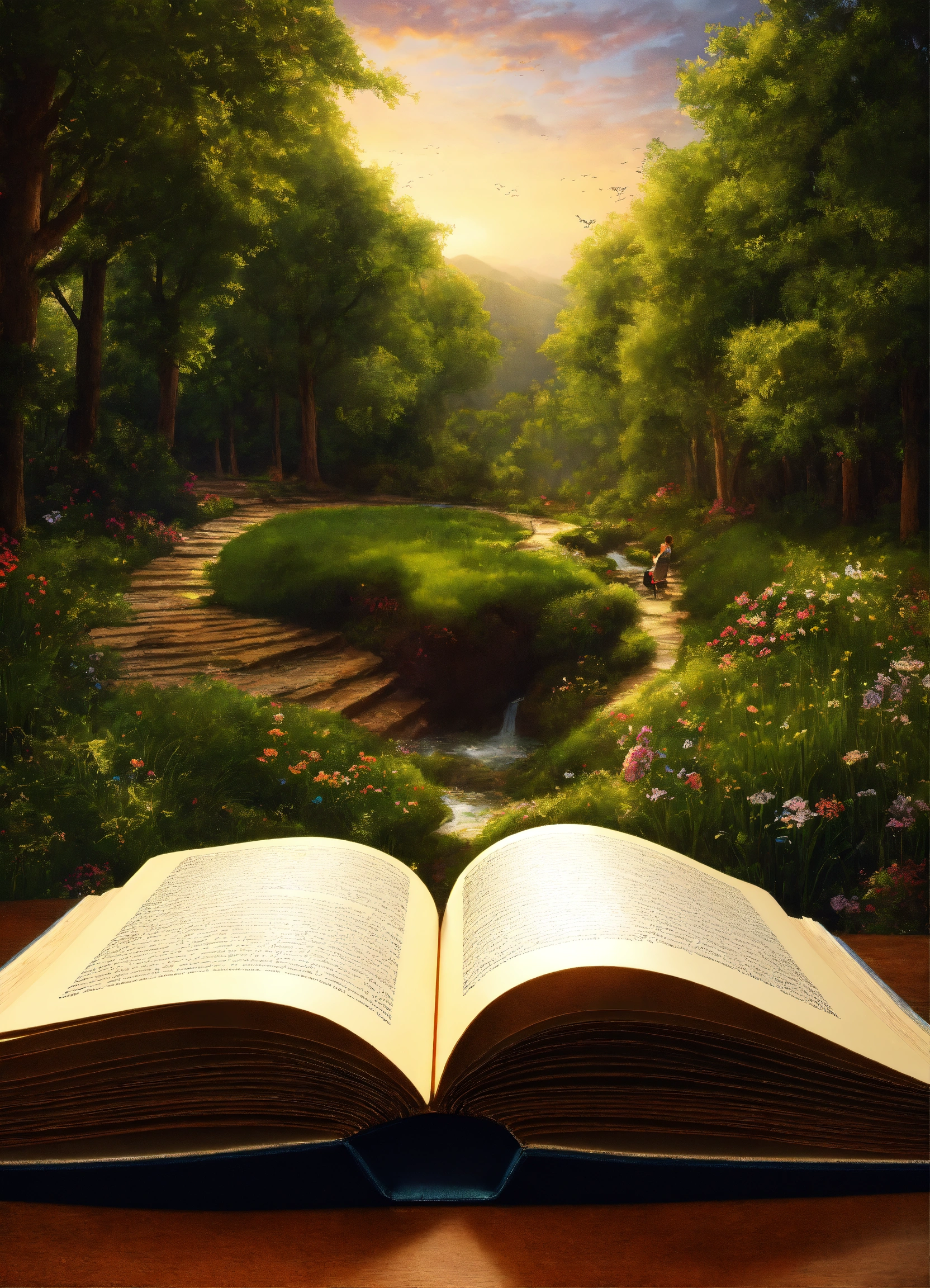 A realistic image of an open book where the pages are filled with scenes and moments, all penned by your thoughts and actions. this symbolizes your journey as the author of your own story.