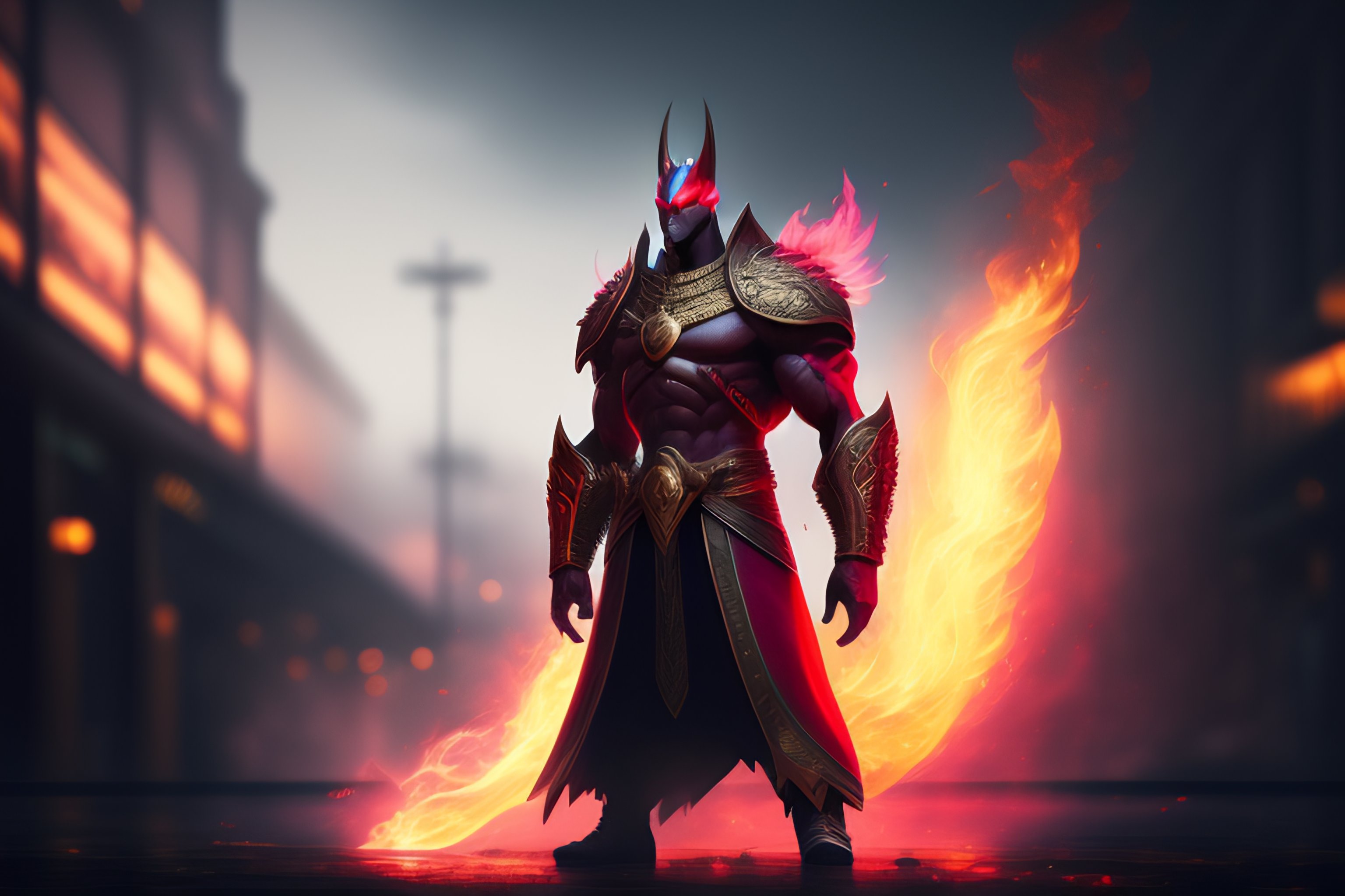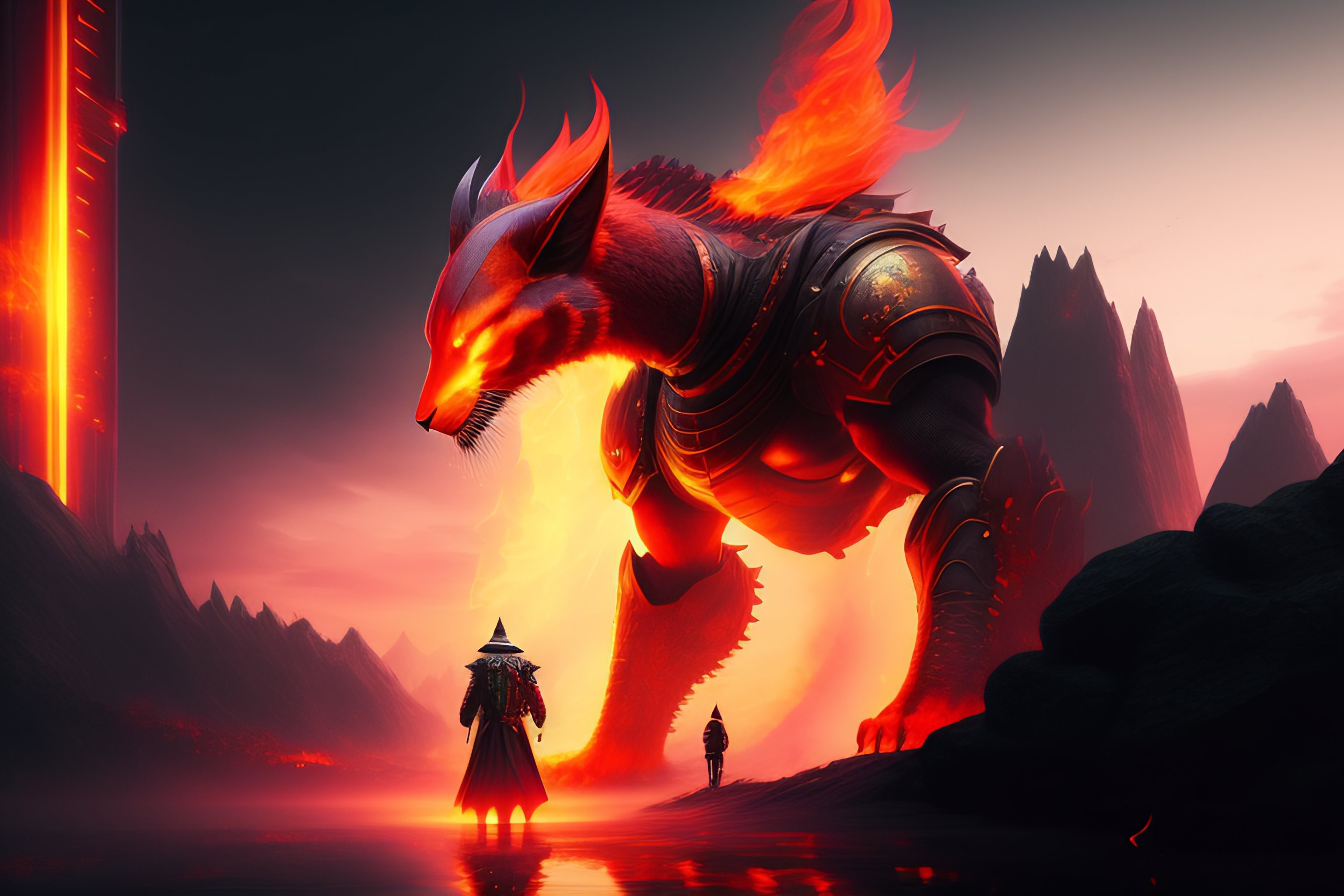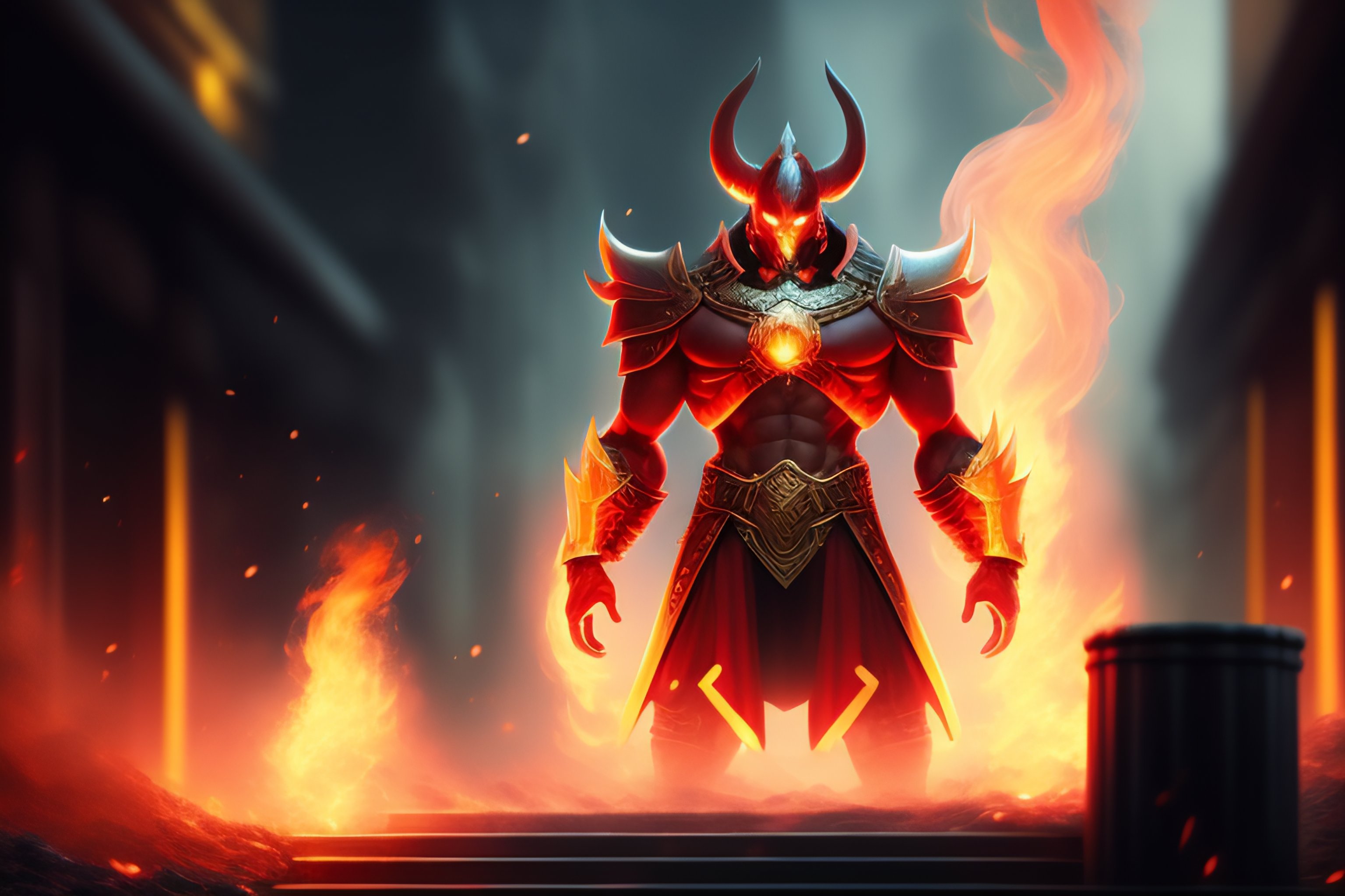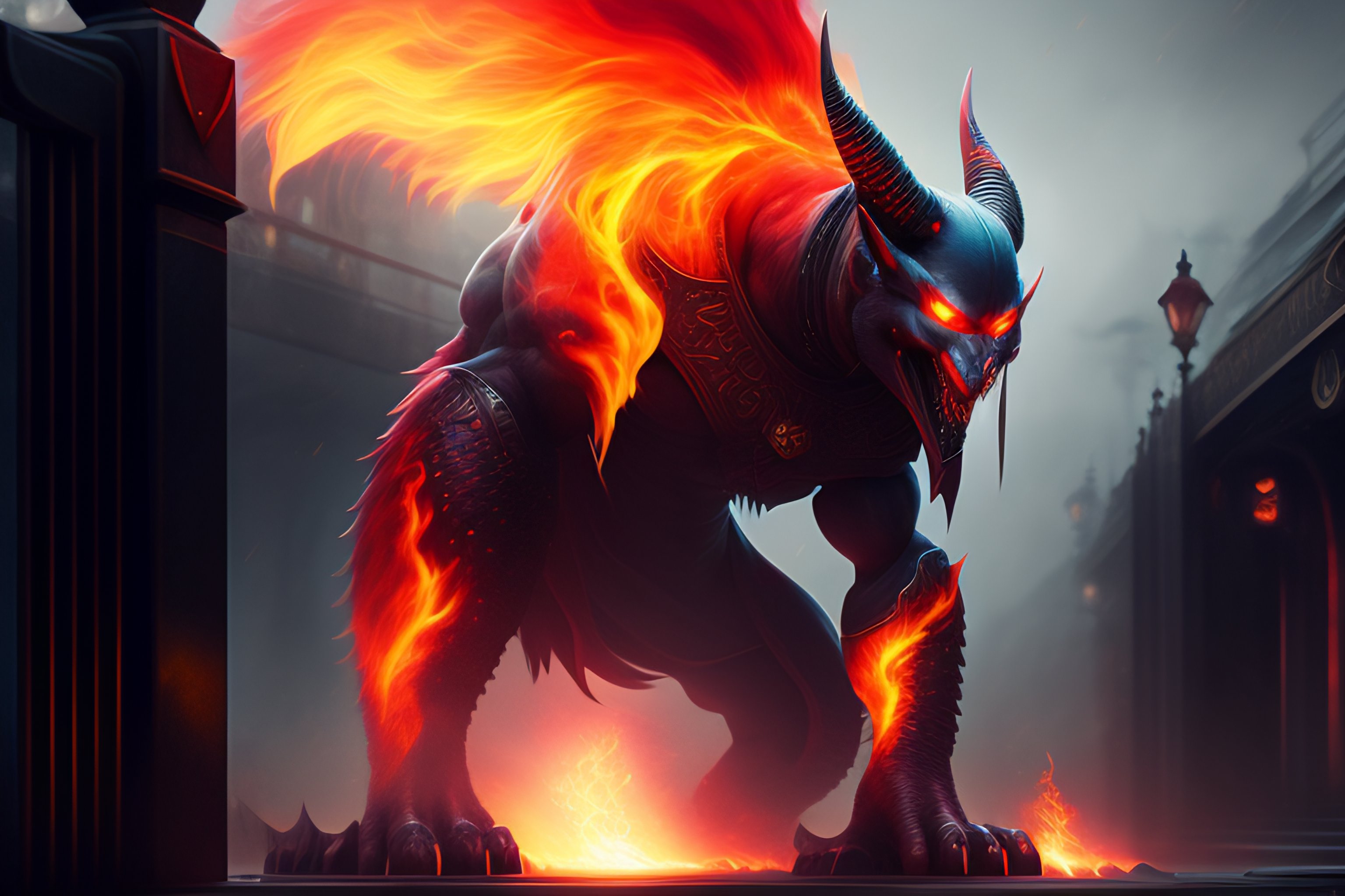 The digital concept art of a monster of fire standing outside the barrier