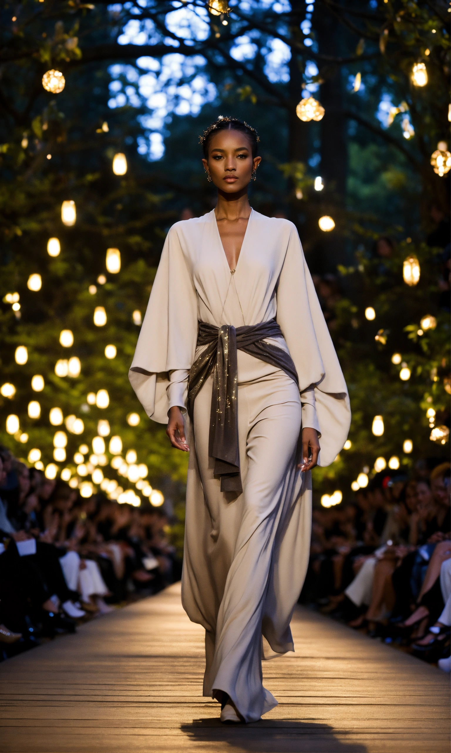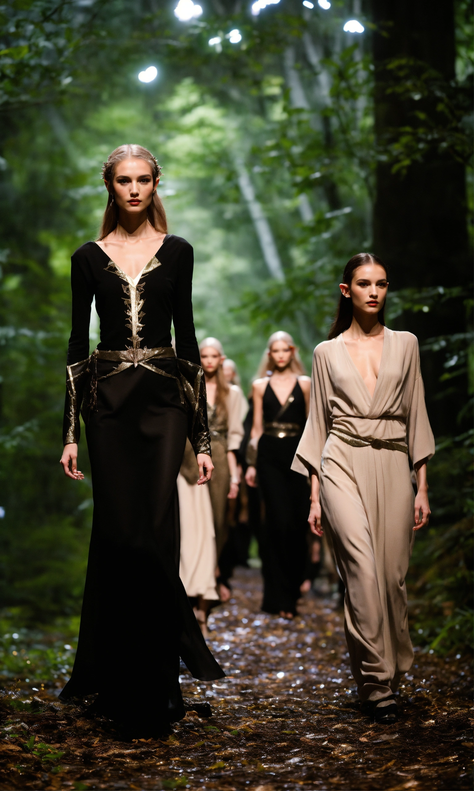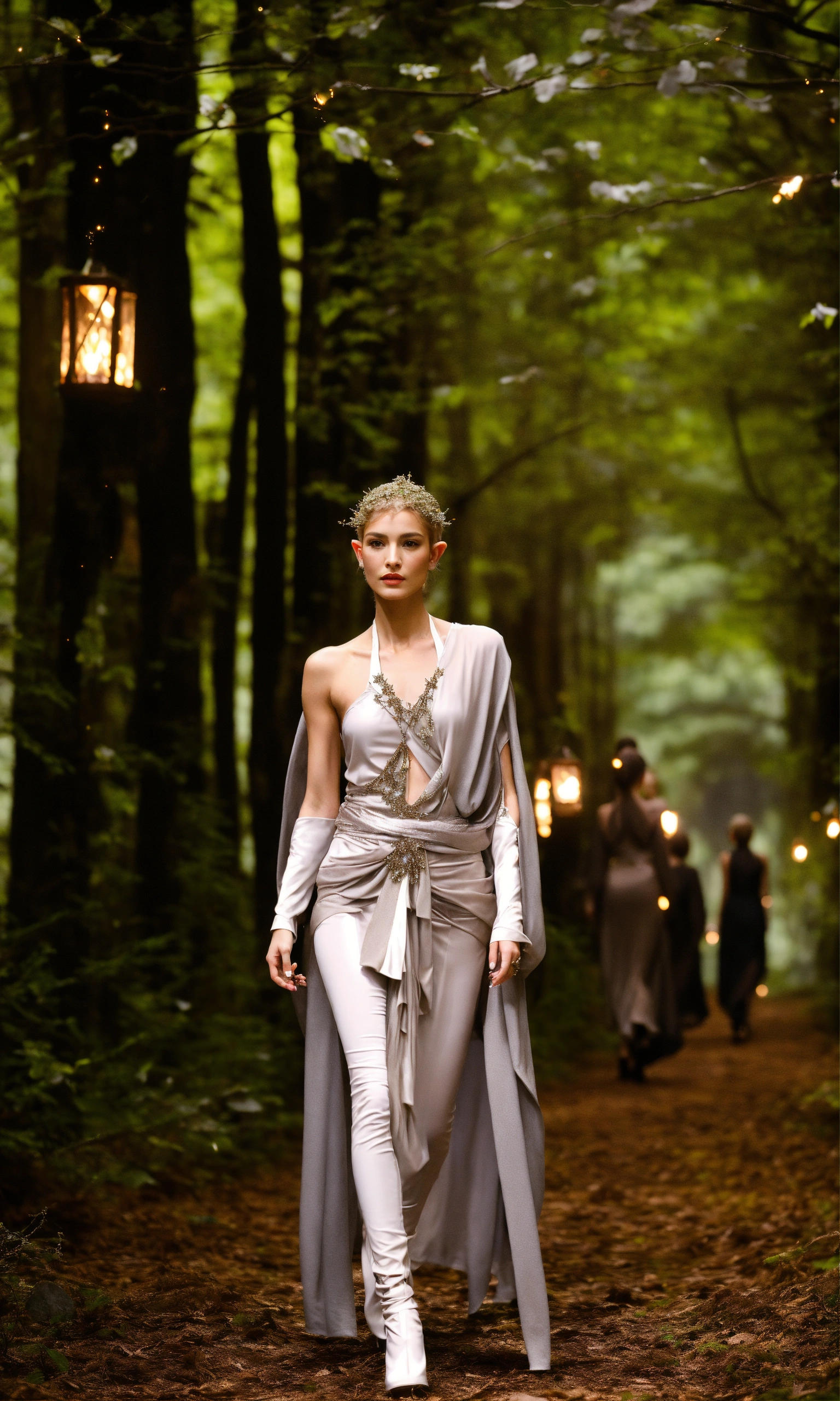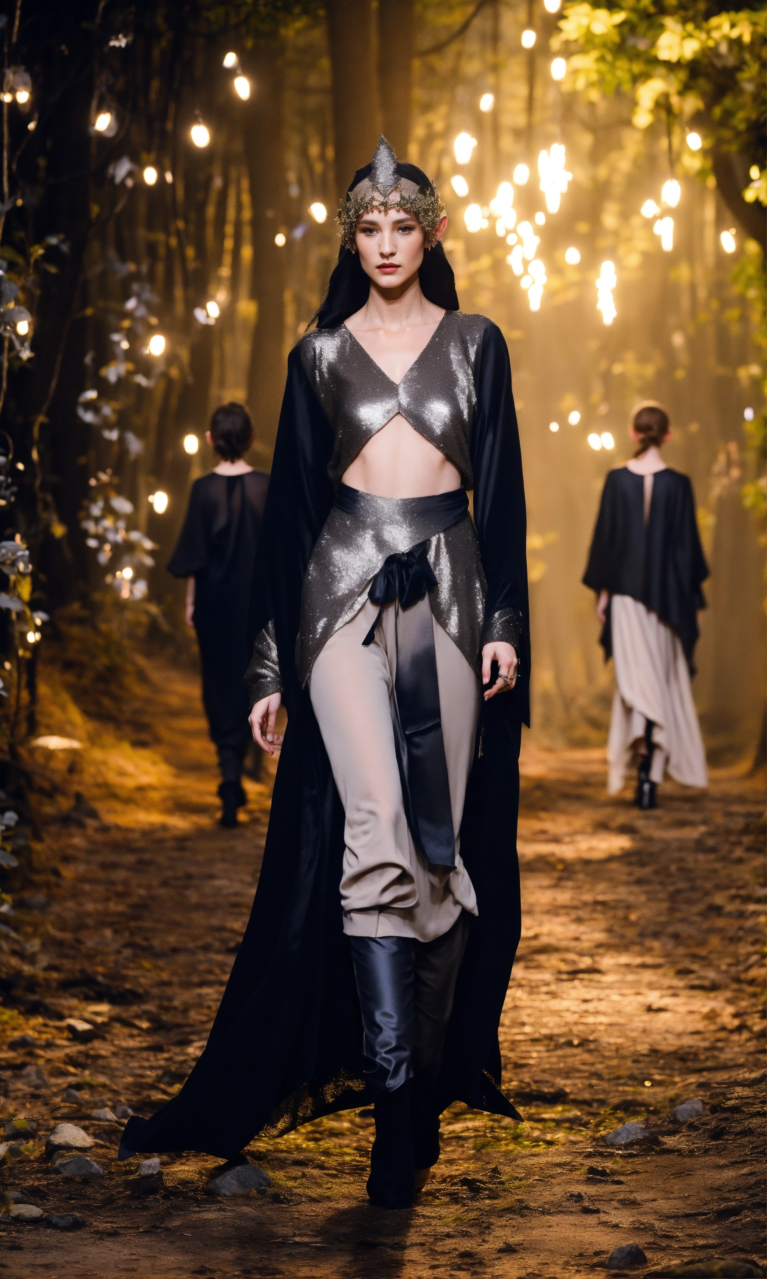 Lothlorien androgynous elves walking runway during elvin fashion week wearing dolman sleeve elvish donna karan fashion in black, white, grey, beige, stone, metallics, shimmer at an enchanted forest runway at starry nighttime, fireflies