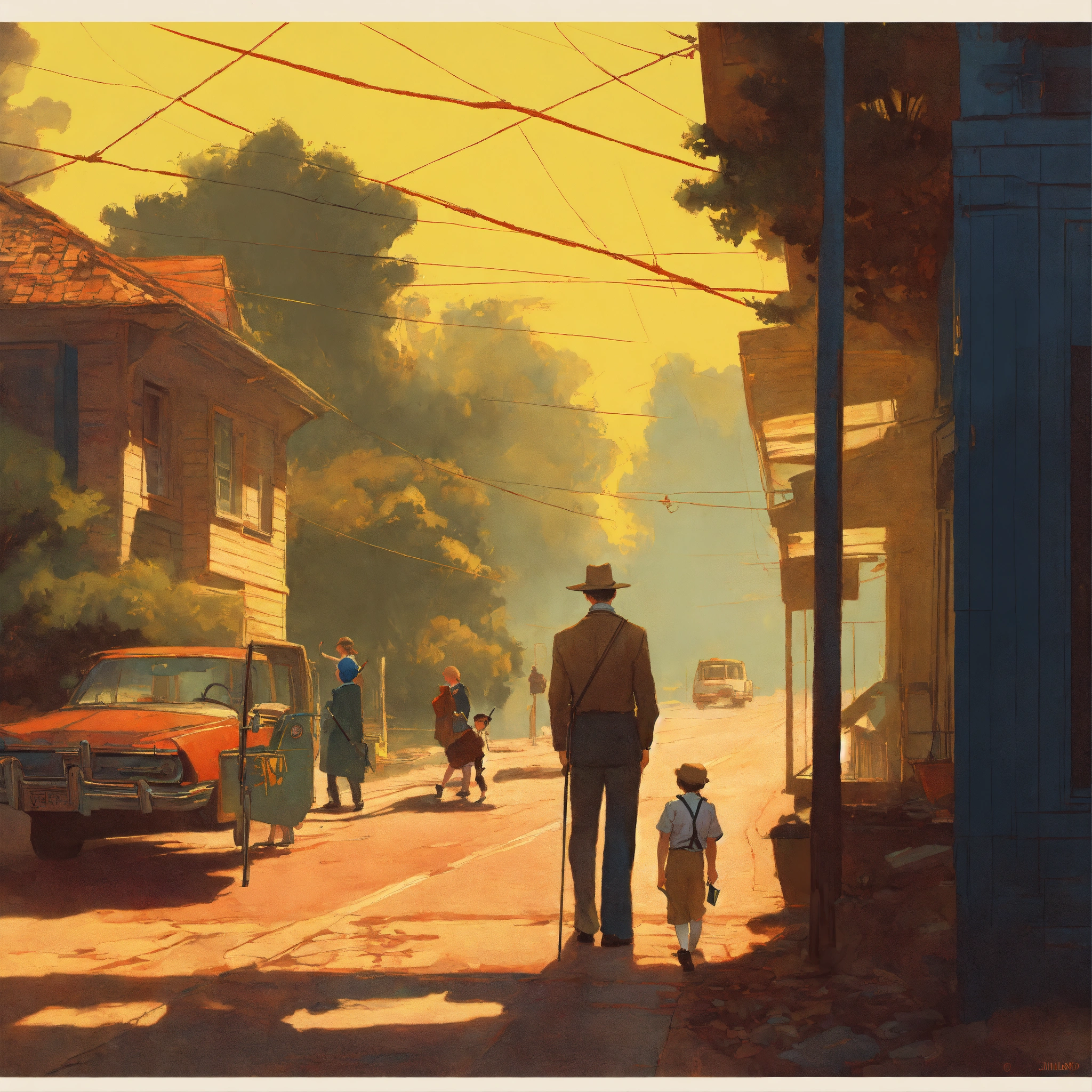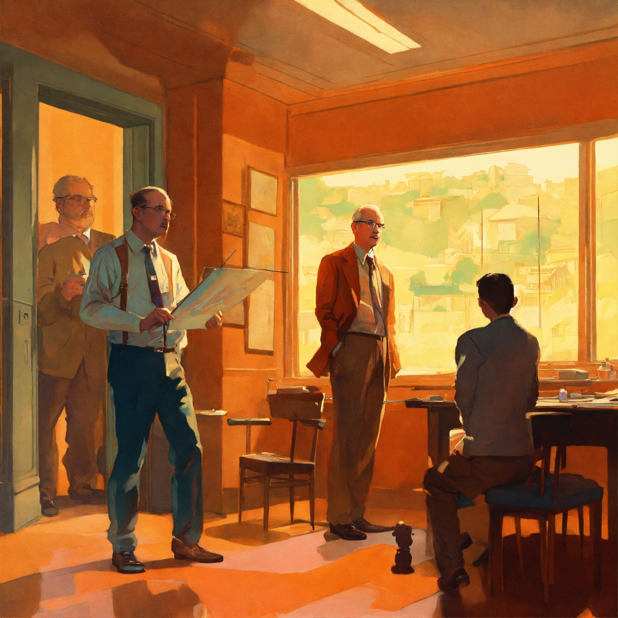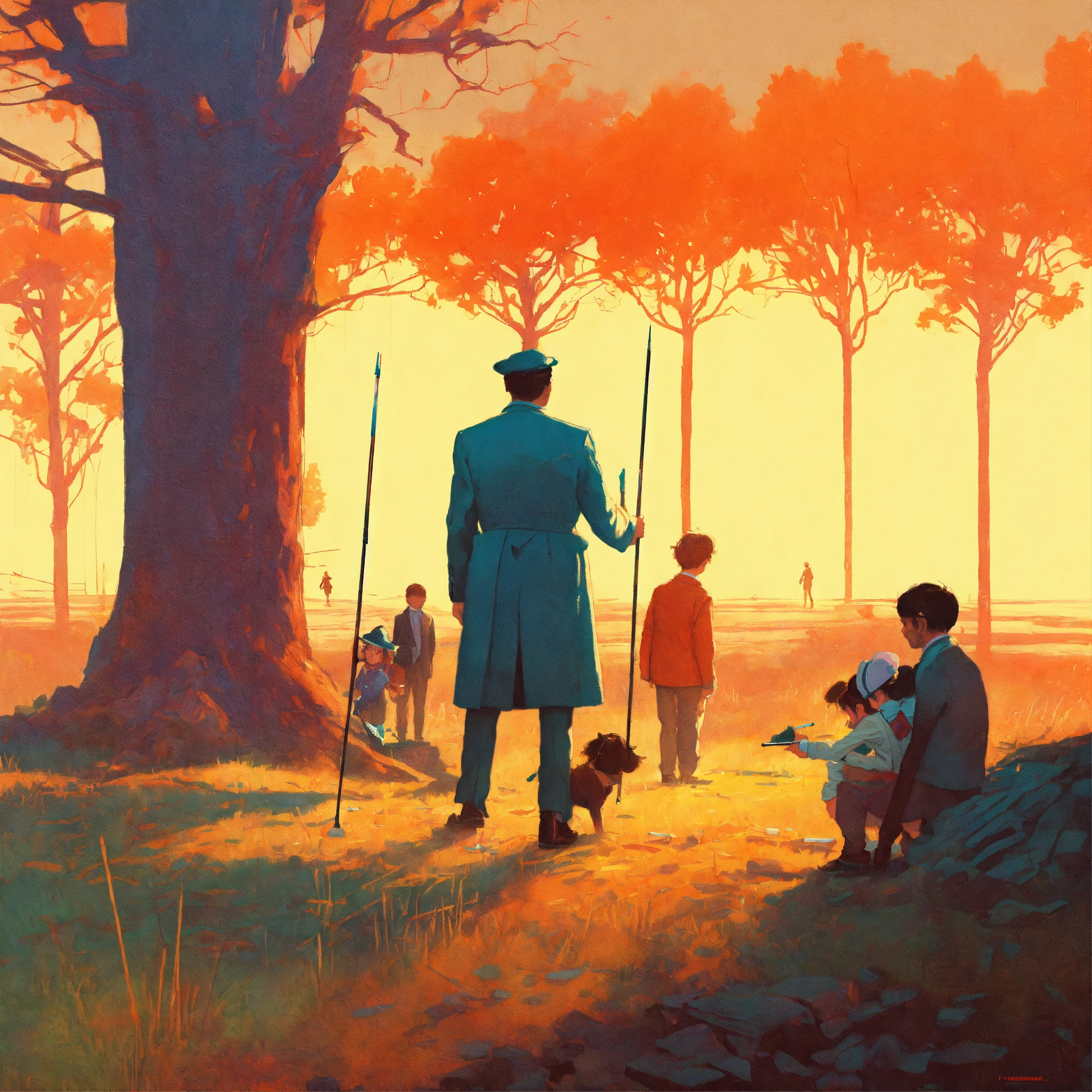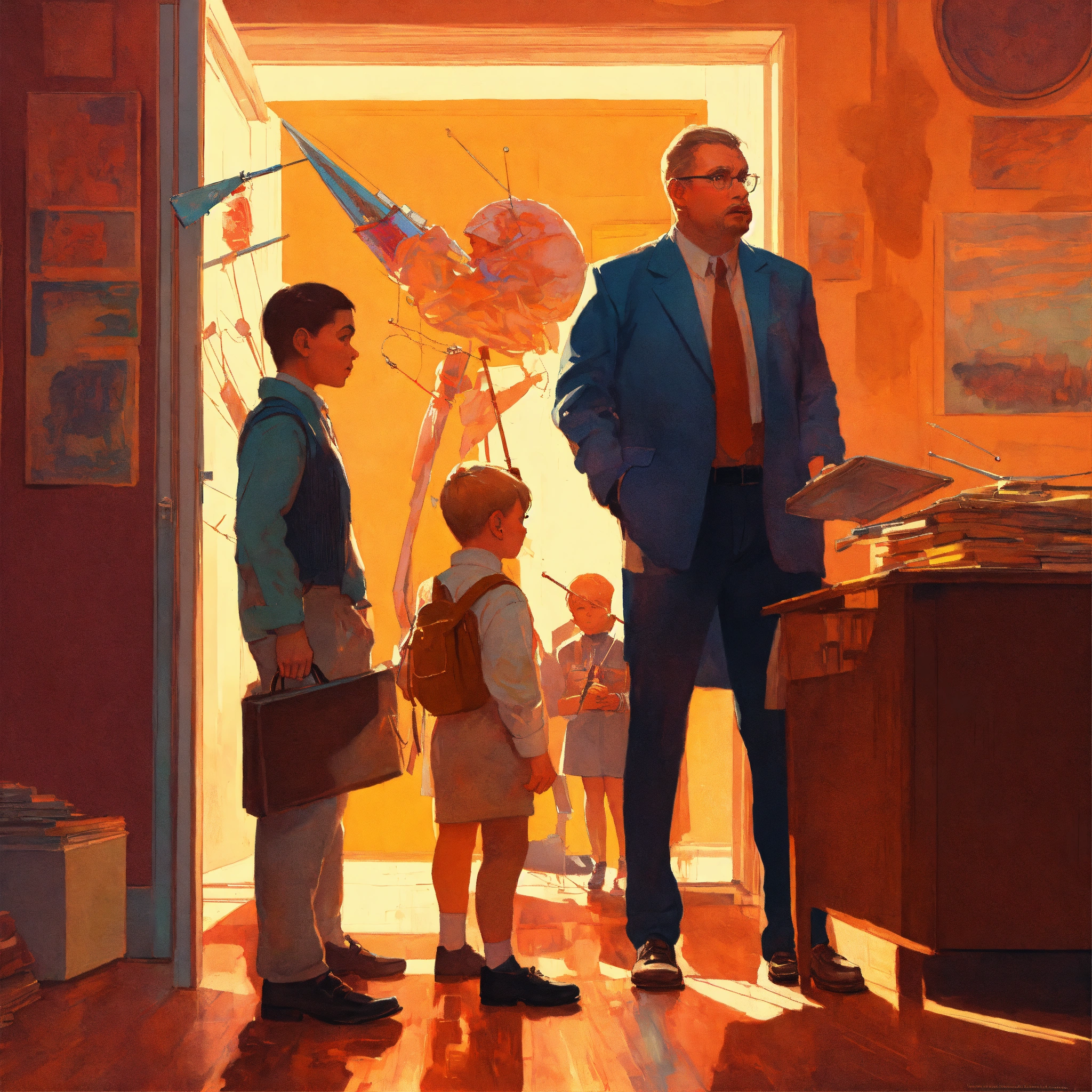 English teacher with a pointer and rods, frightened children nearby, in the style of francis bacon and syd mead and edward hopper and norman rockwell and beksinski, highly detailed, painted by james gilleard, surrealism, stanley artgerm, very coherent