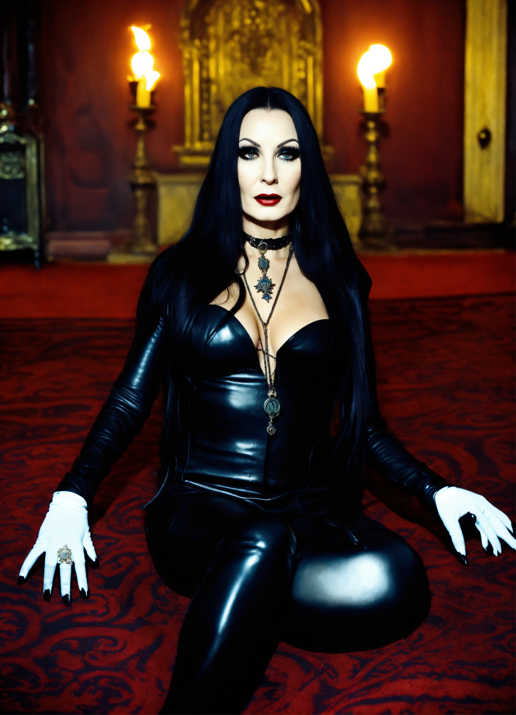 Extremely powerful very evil satanic goth hypnotist "morticia addams julie strain evilynn vamperilla ", wearing black leather outfit with boots & "entrancing jewelry" using a small pendant necklace to put you in a trance at your front door, her powerful eyes bring you to kneel, mindless & helpless, most powerful sorceress in existence, obey without question, she is extremely entrancing, she haunts your soul & dreams, gloves that hypnotize