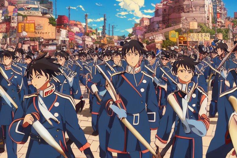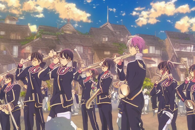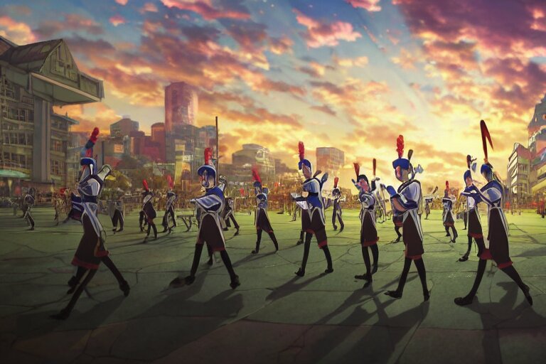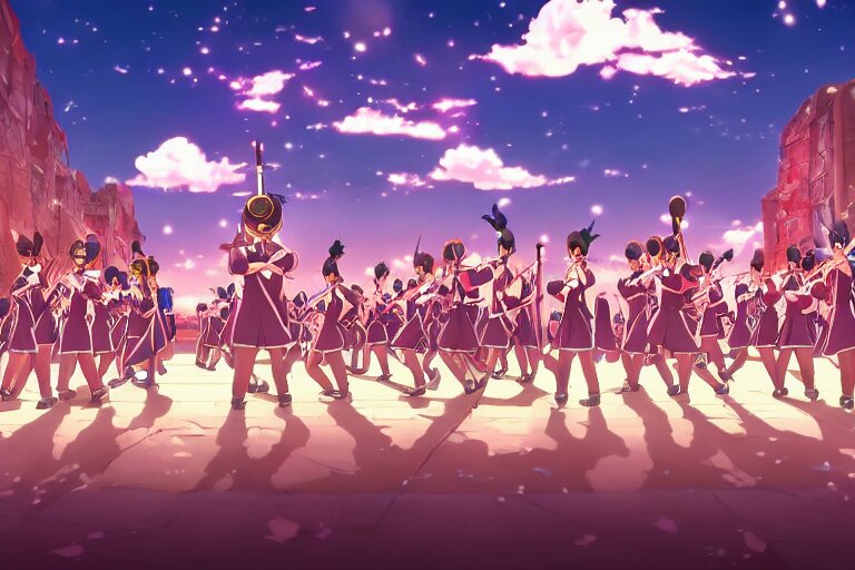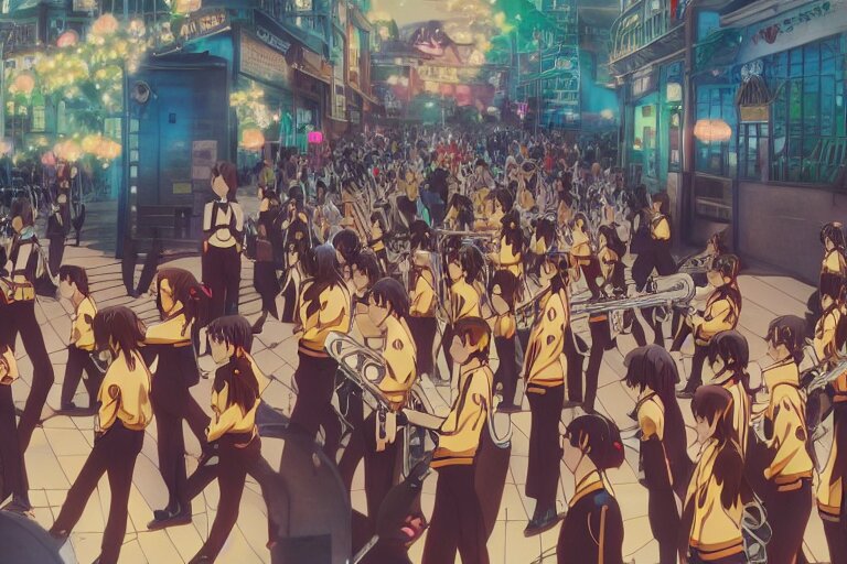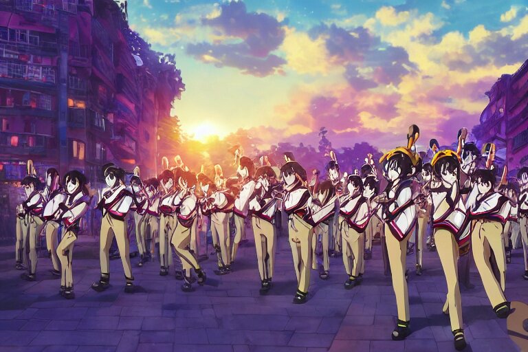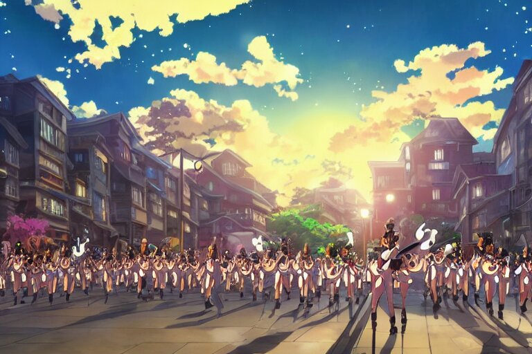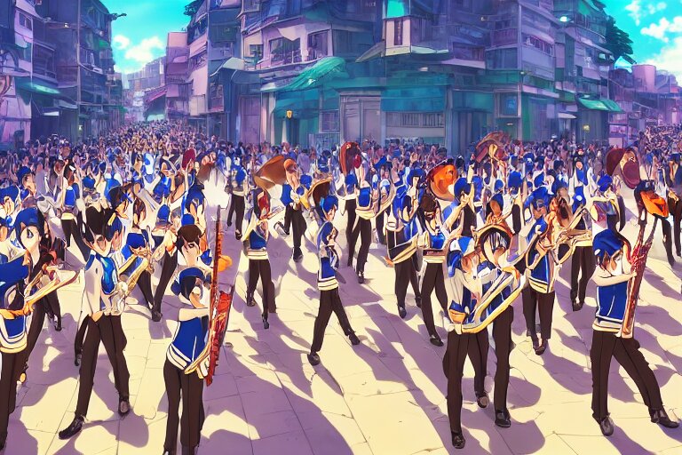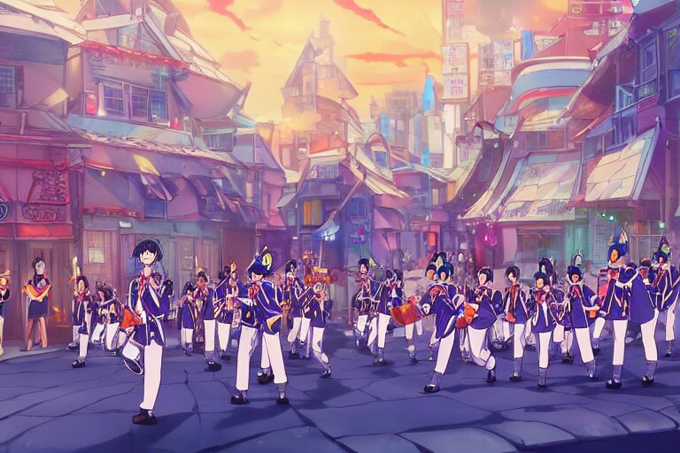 Anime key visual of a marching band in the middle of a fantasy city in the style of studio ghibli, moebius, makoto shinkai, dramatic volumetric lighting