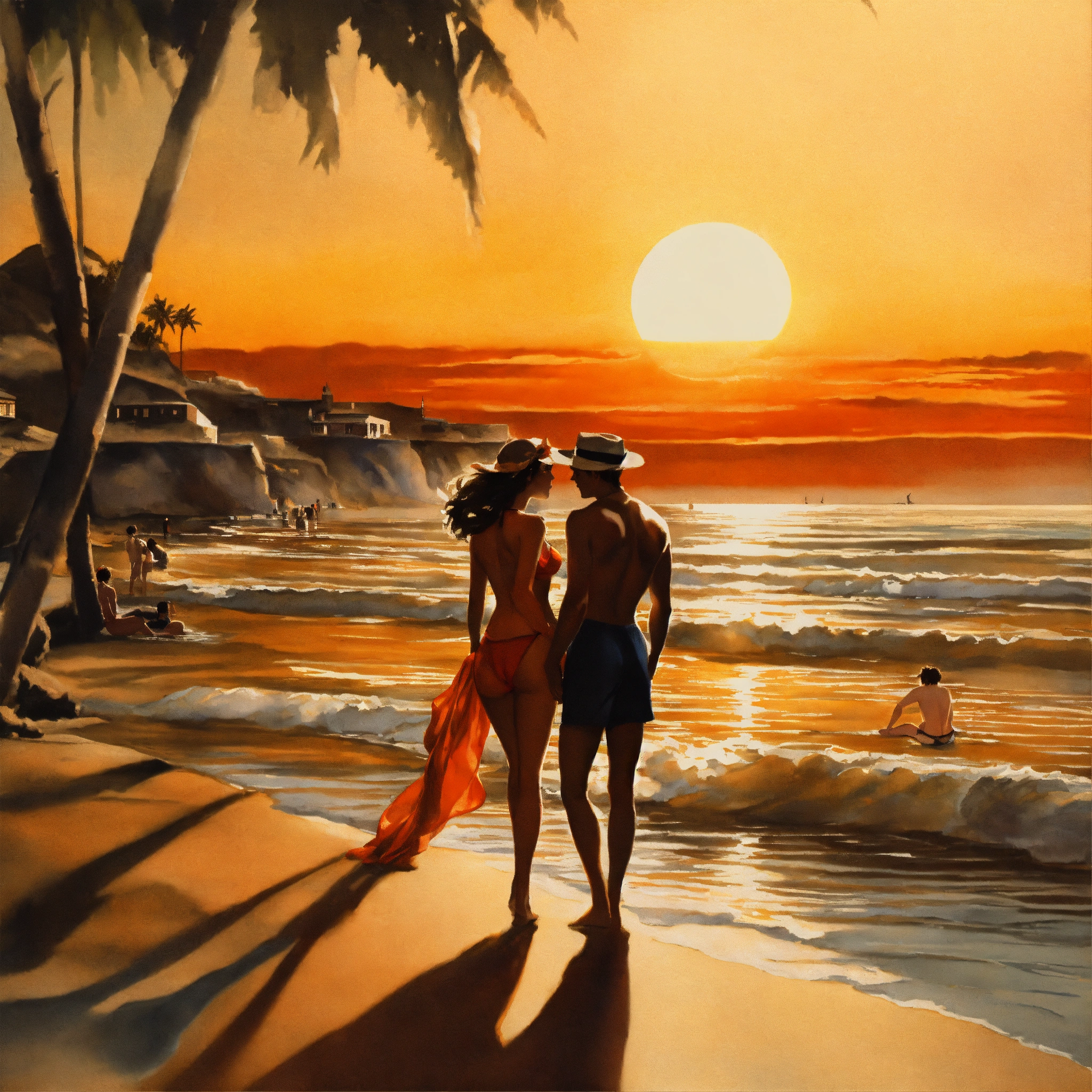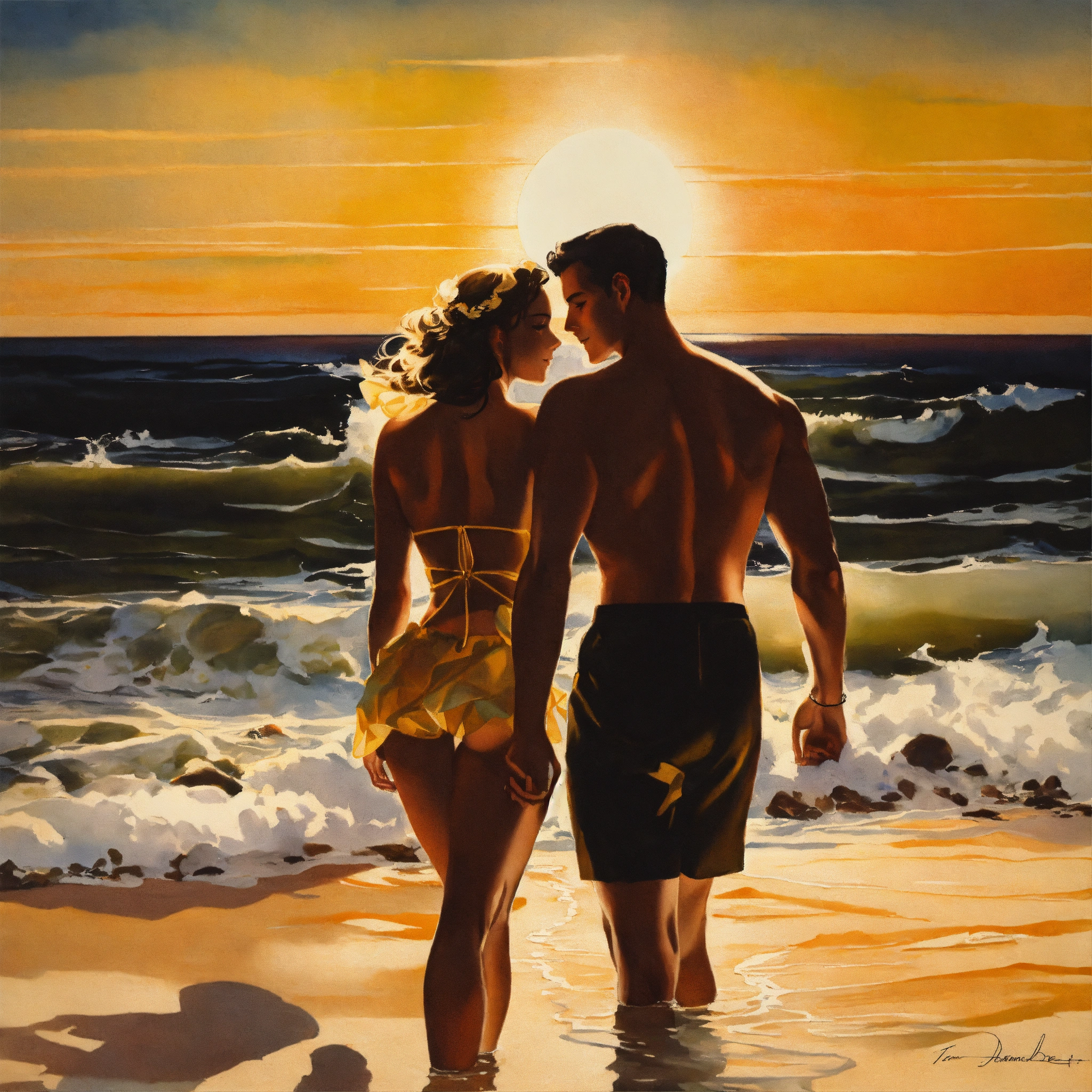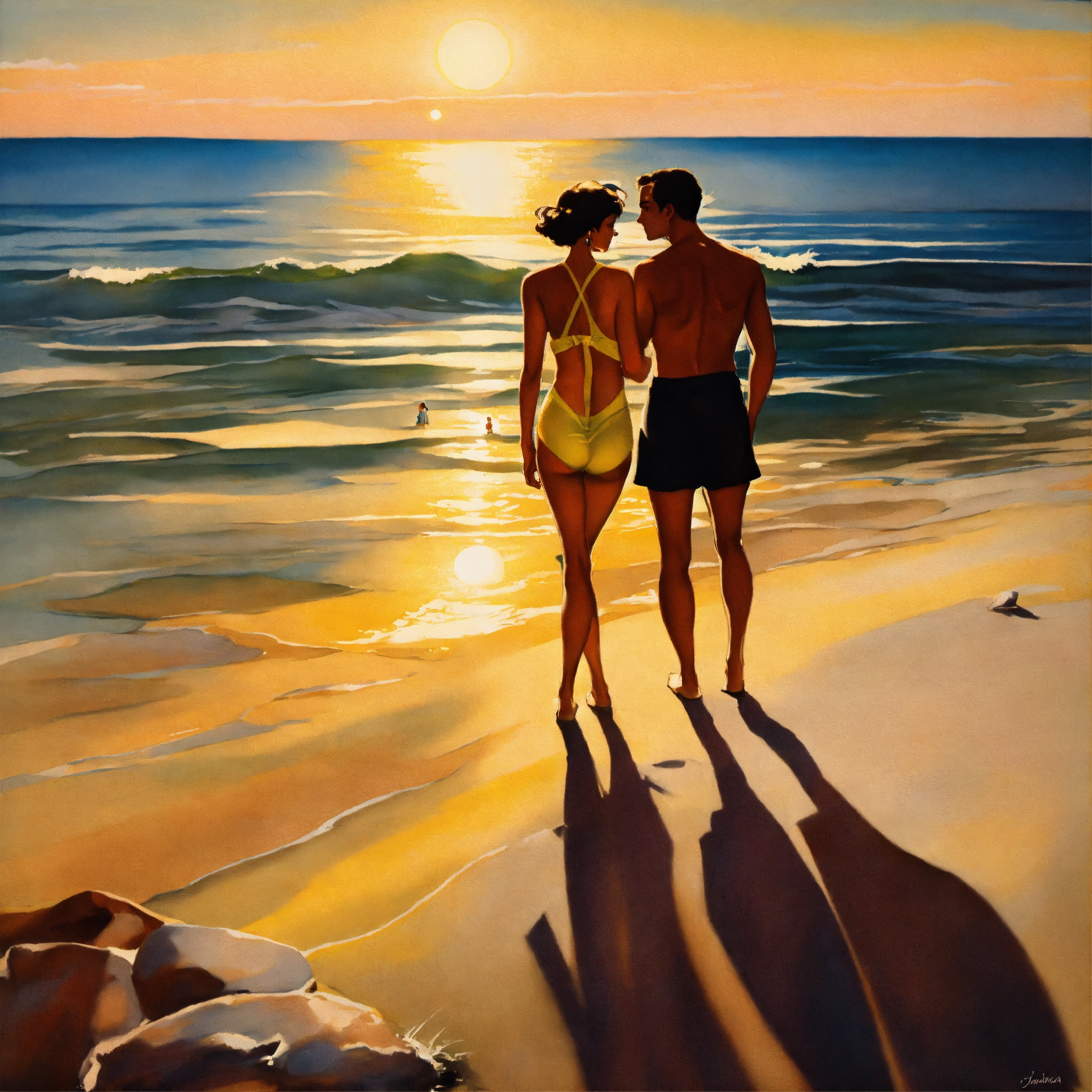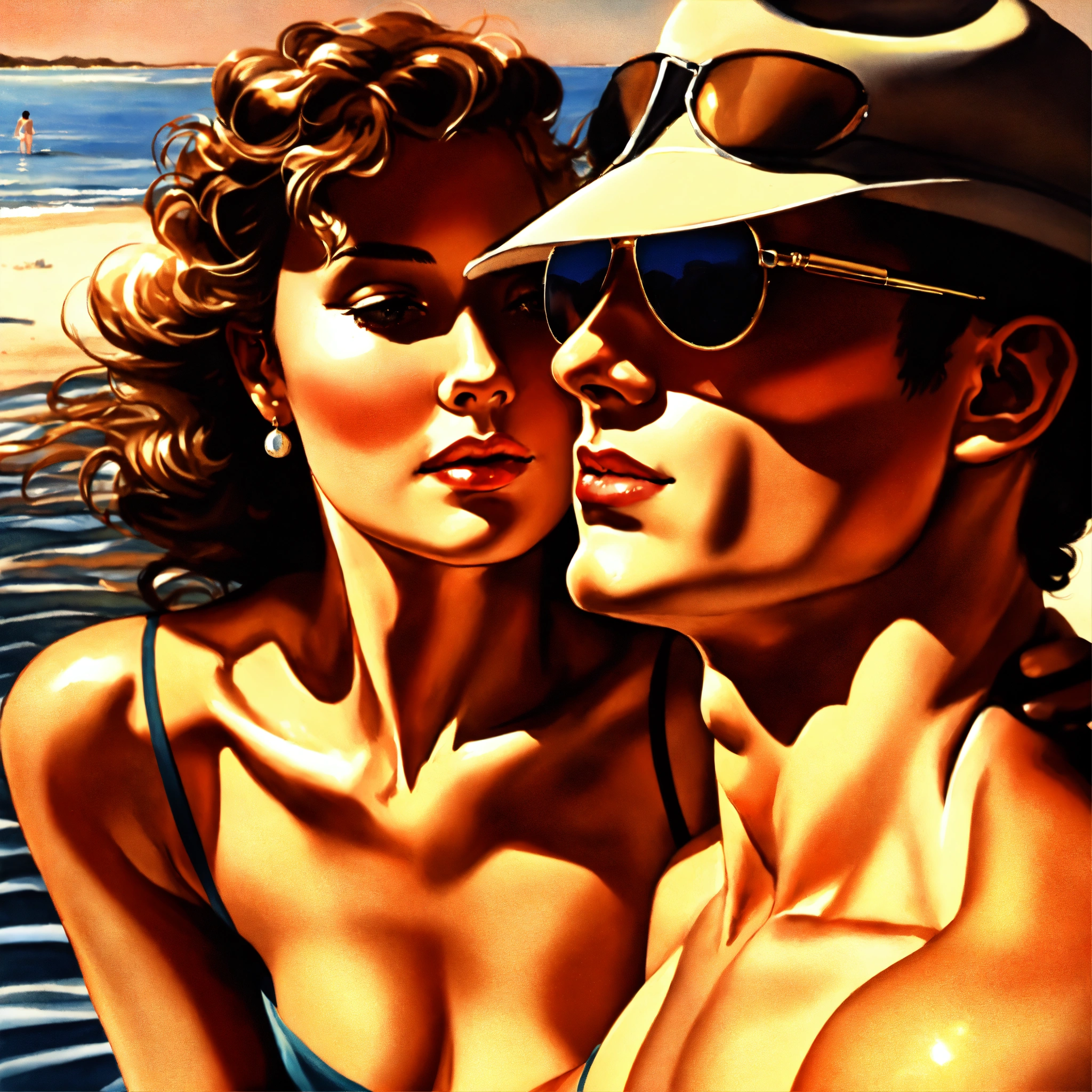 Pen and ink, illustrated by tamara de limpicka, a close up of loving couple in swim suits alone forever with blazzing sun. stunning color scheme, masterpiece.beach scene with loads of sun shadows and shades. tricks of the light