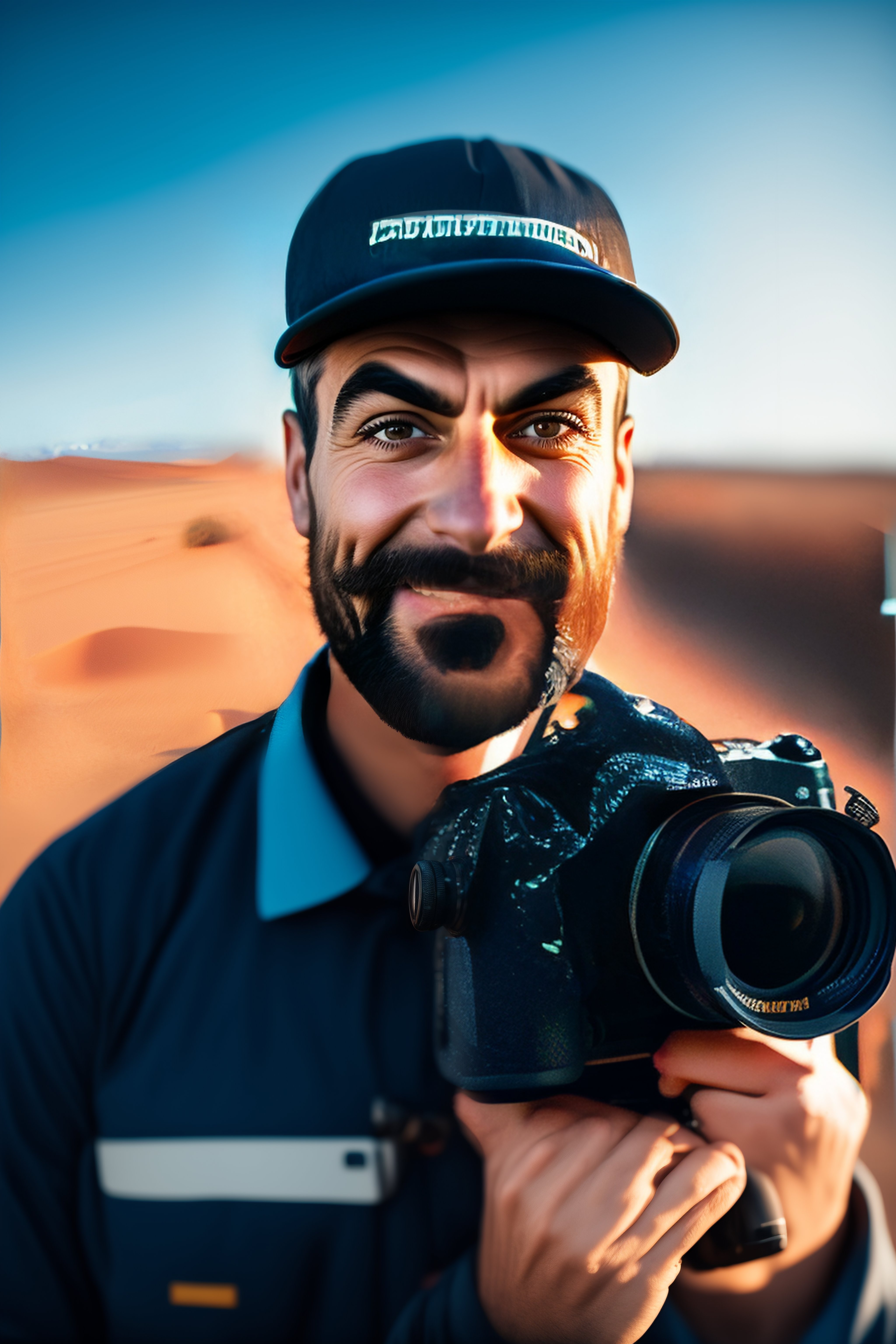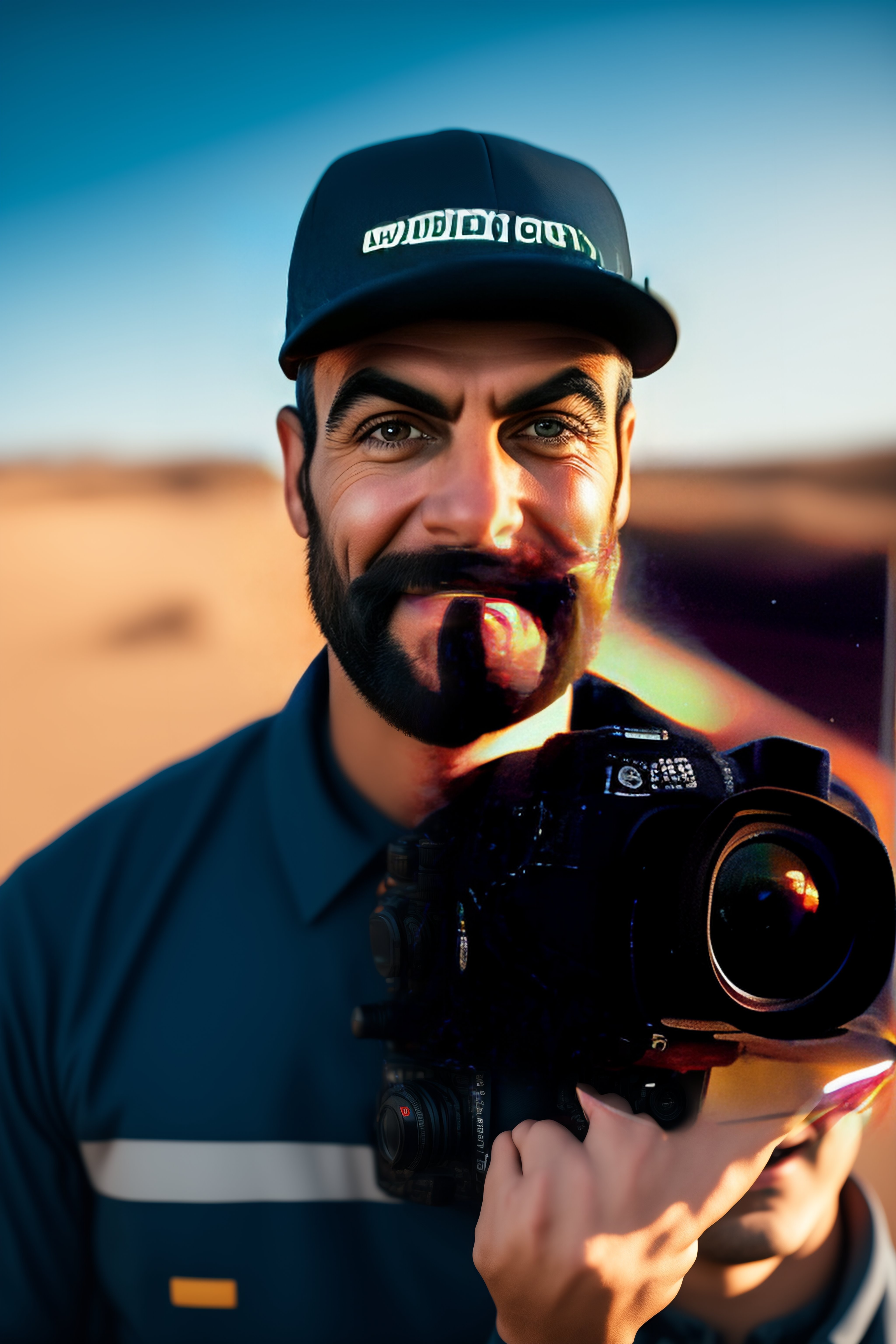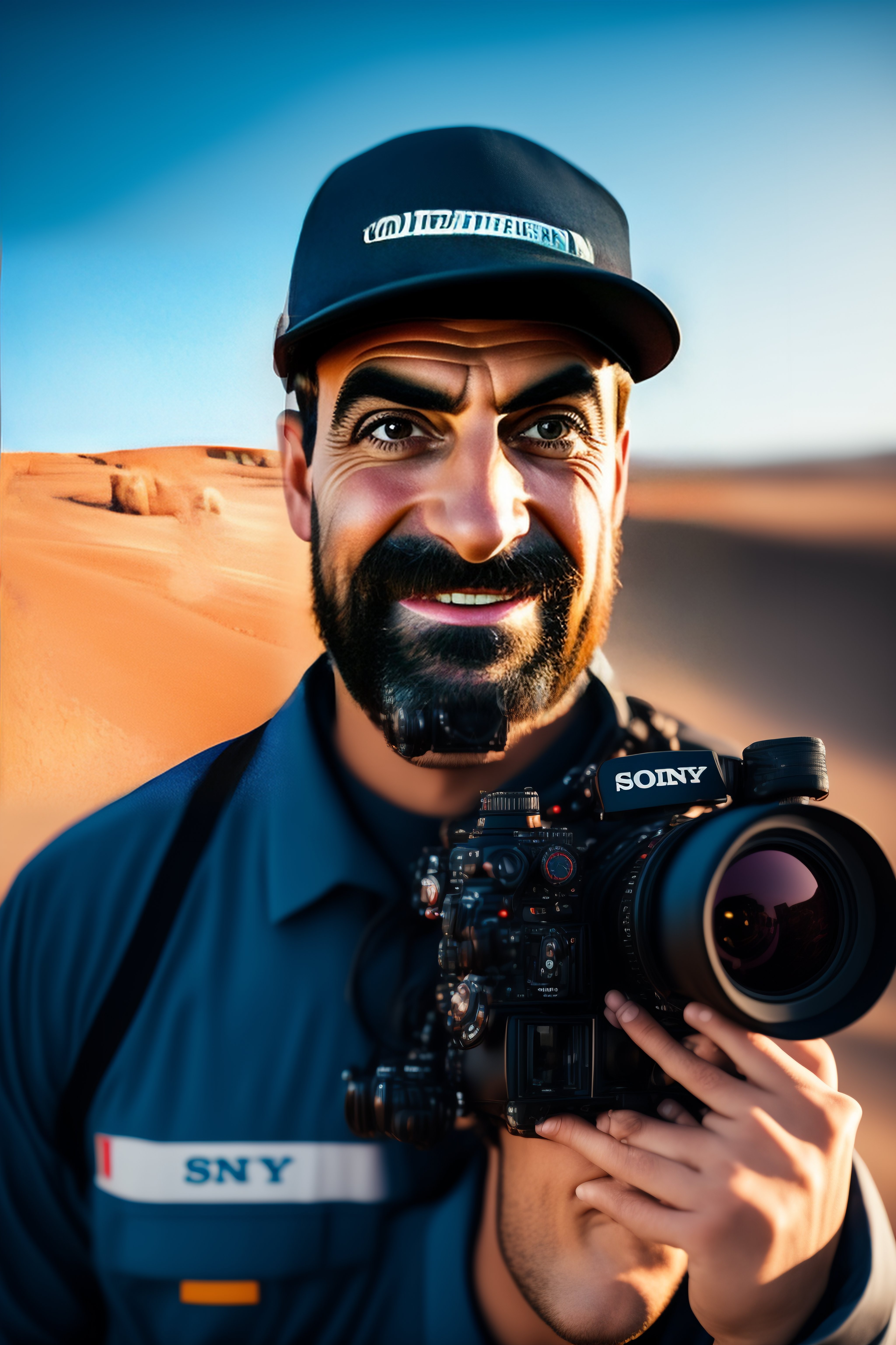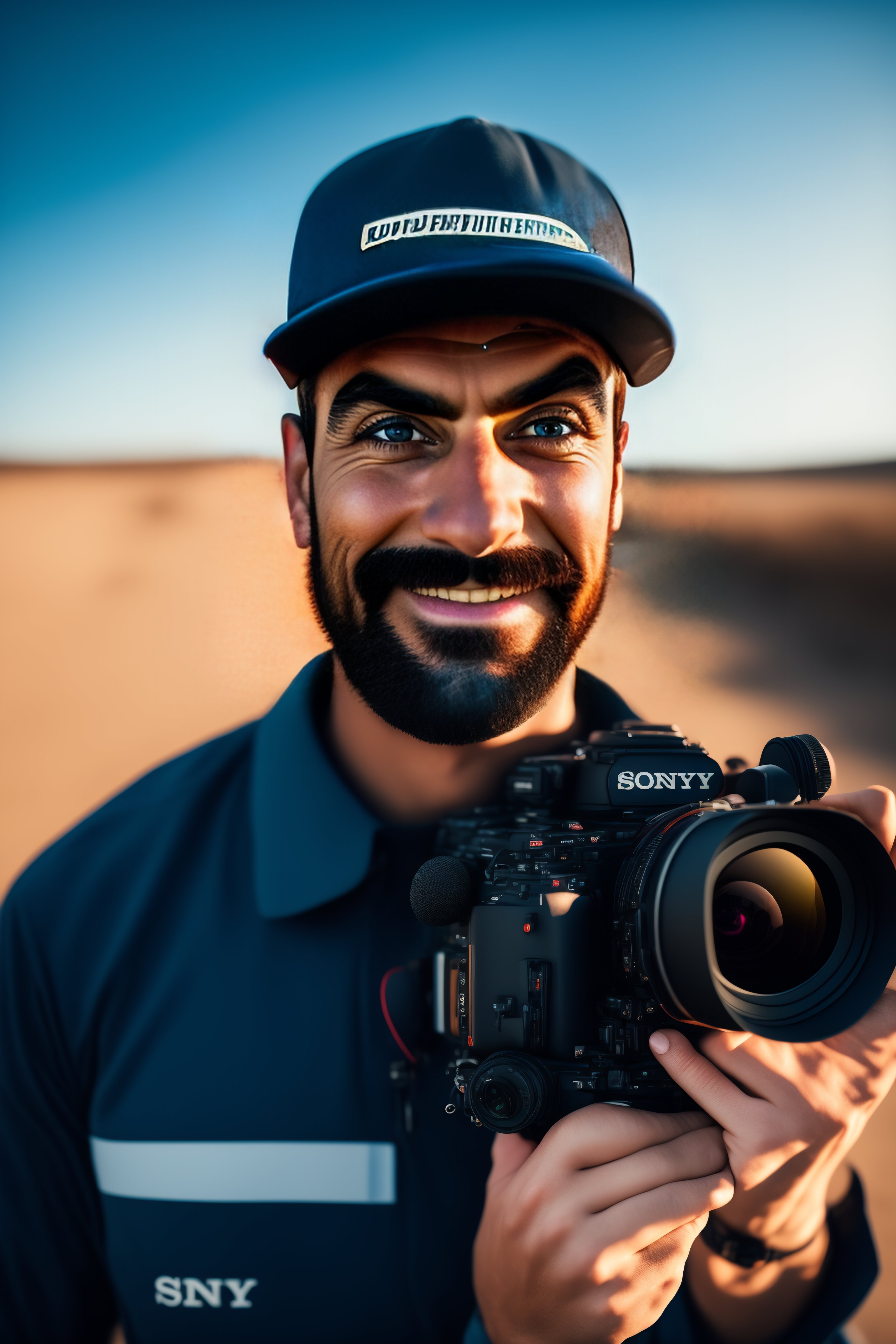 Create an image of a cameraman standing behind a video camera, with a questioning expression on his face. the cameraman should be a mix of mister bean and thomas the tank, and the image should be shot from the waist up. the professional video camera (sony fs7) should be slightly out of focus, while the cameraman should be sharp and clear. the cameraman should be peering over the top of the camera with a look of goofy confusion . he needs to wear a black working outfit