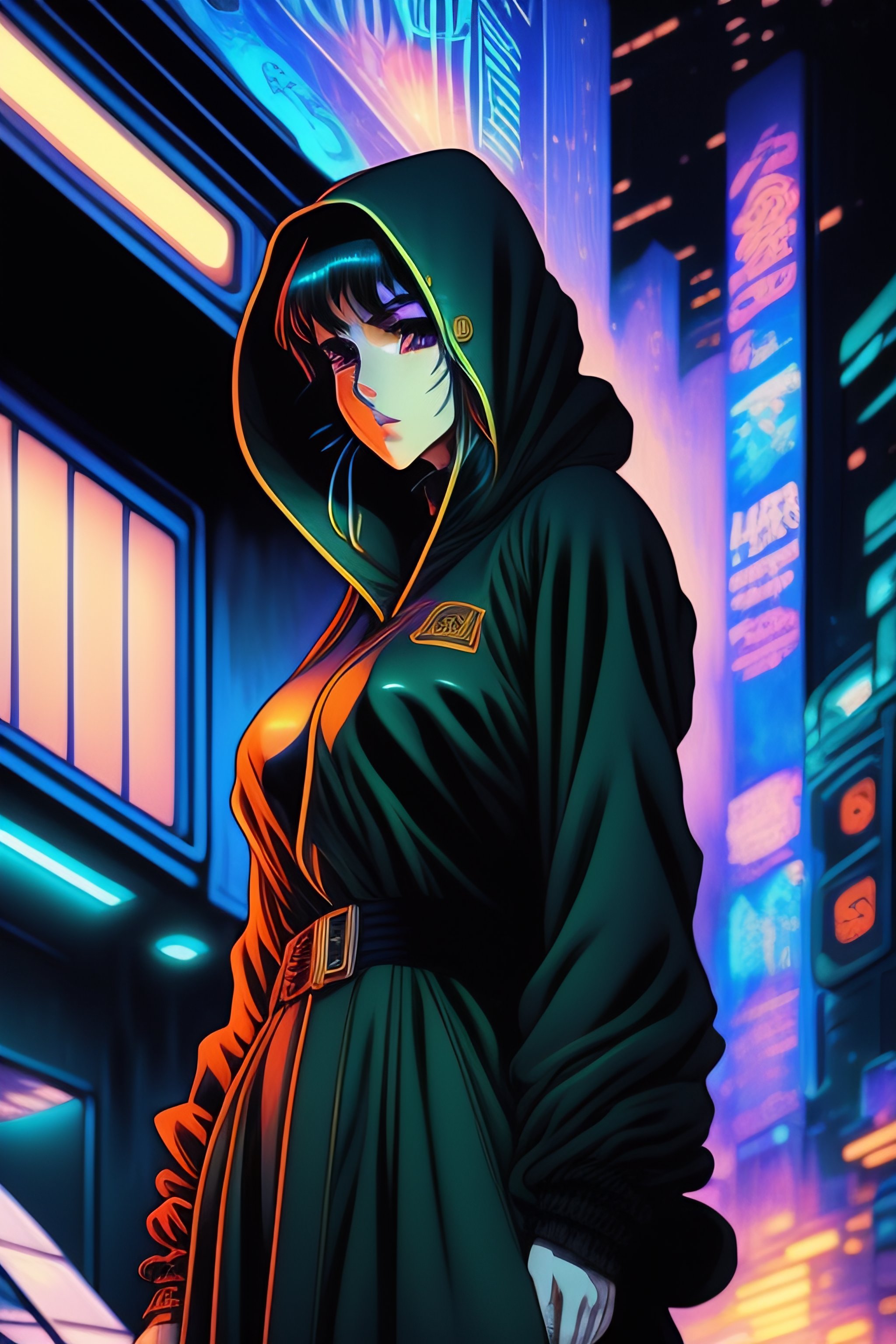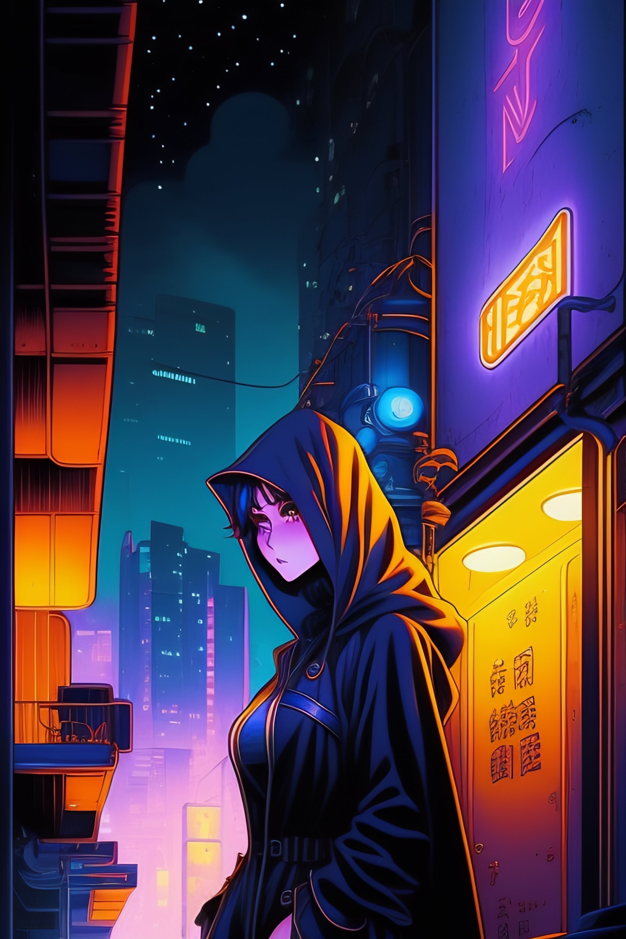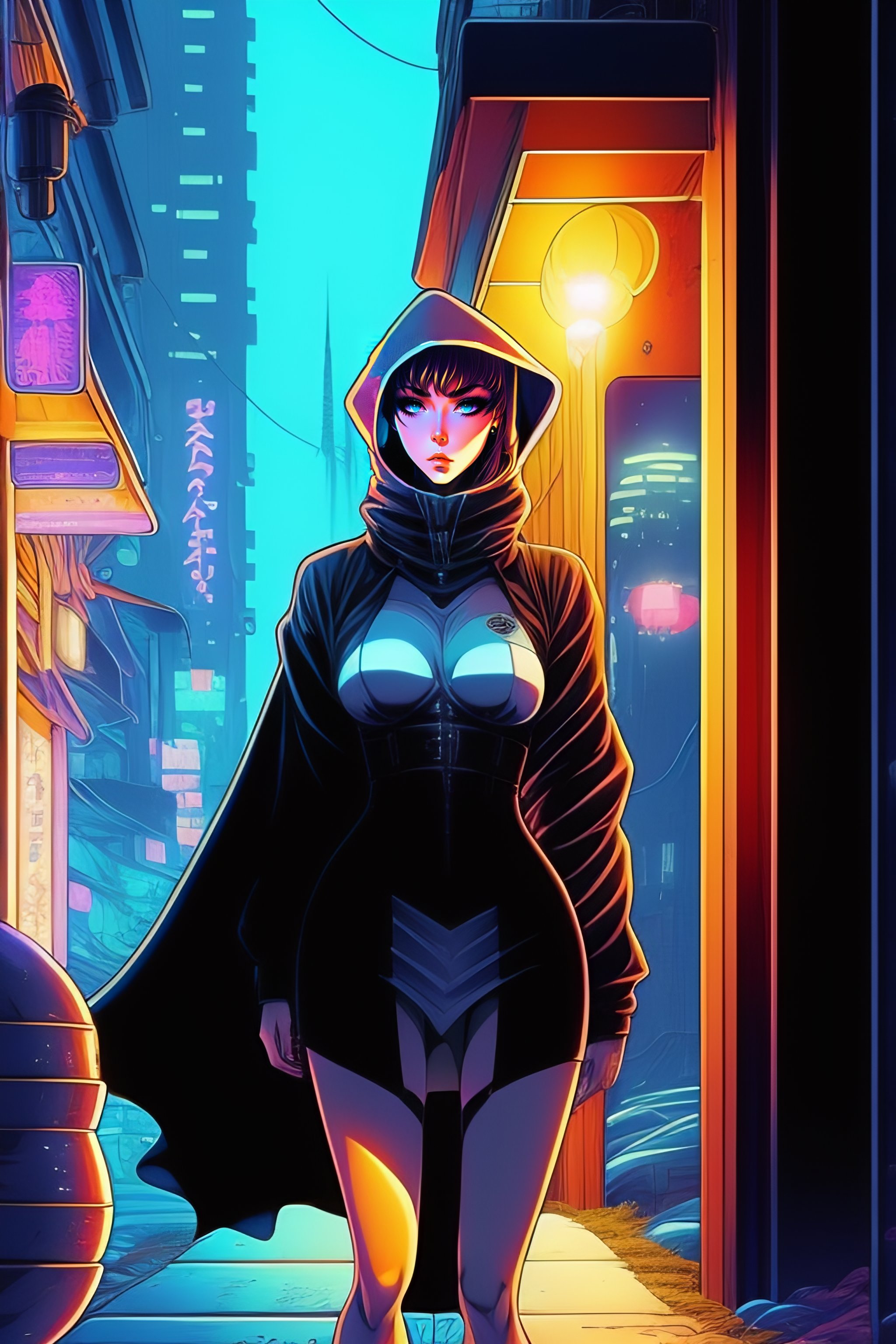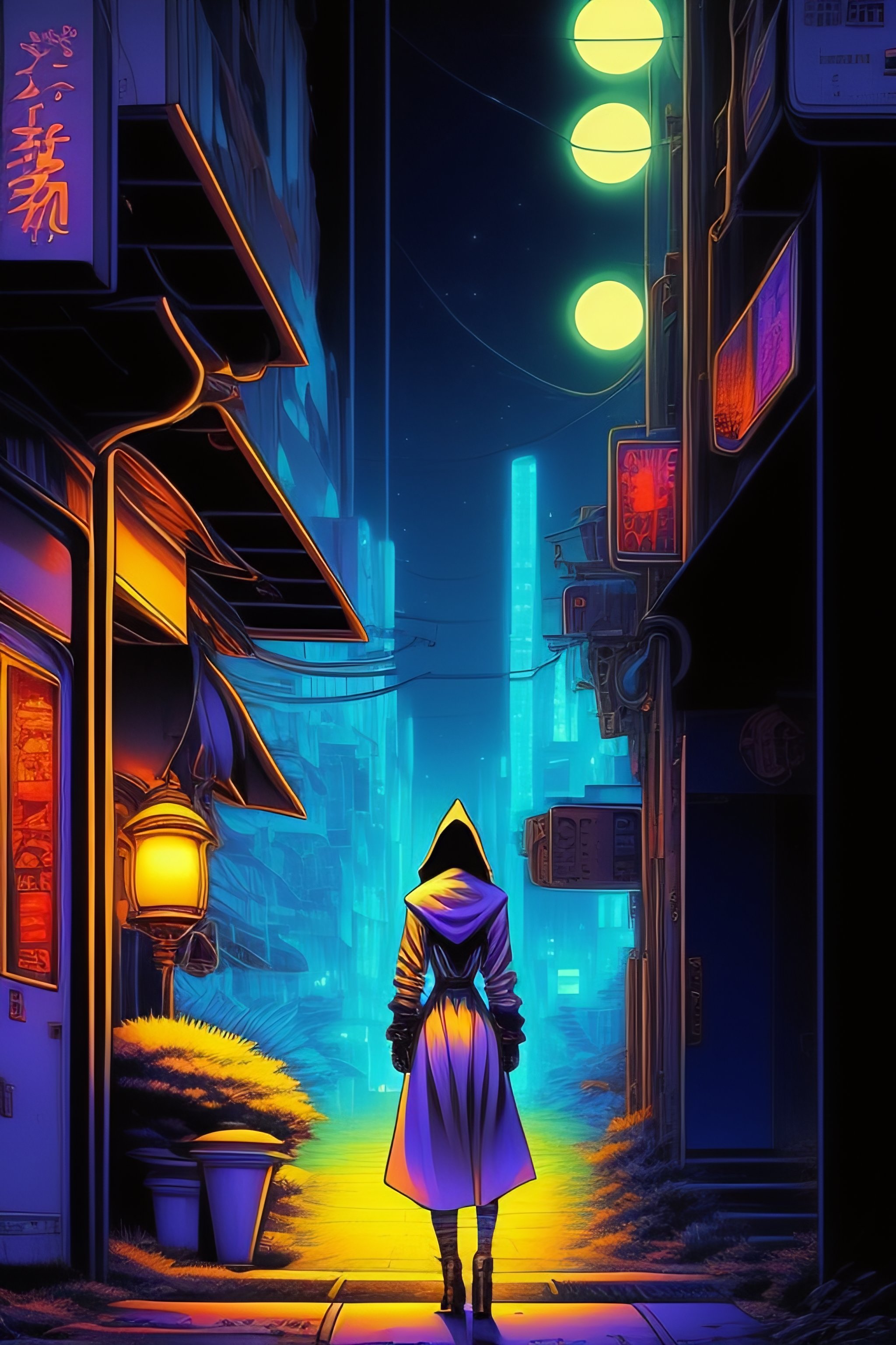 Vintage 90's anime style environmental wide shot of a sketchy alleyway at night; a woman wearing a hood; by hajime sorayama, greg tocchini, virgil finlay, sci-fi. line art. ciberpunk art.