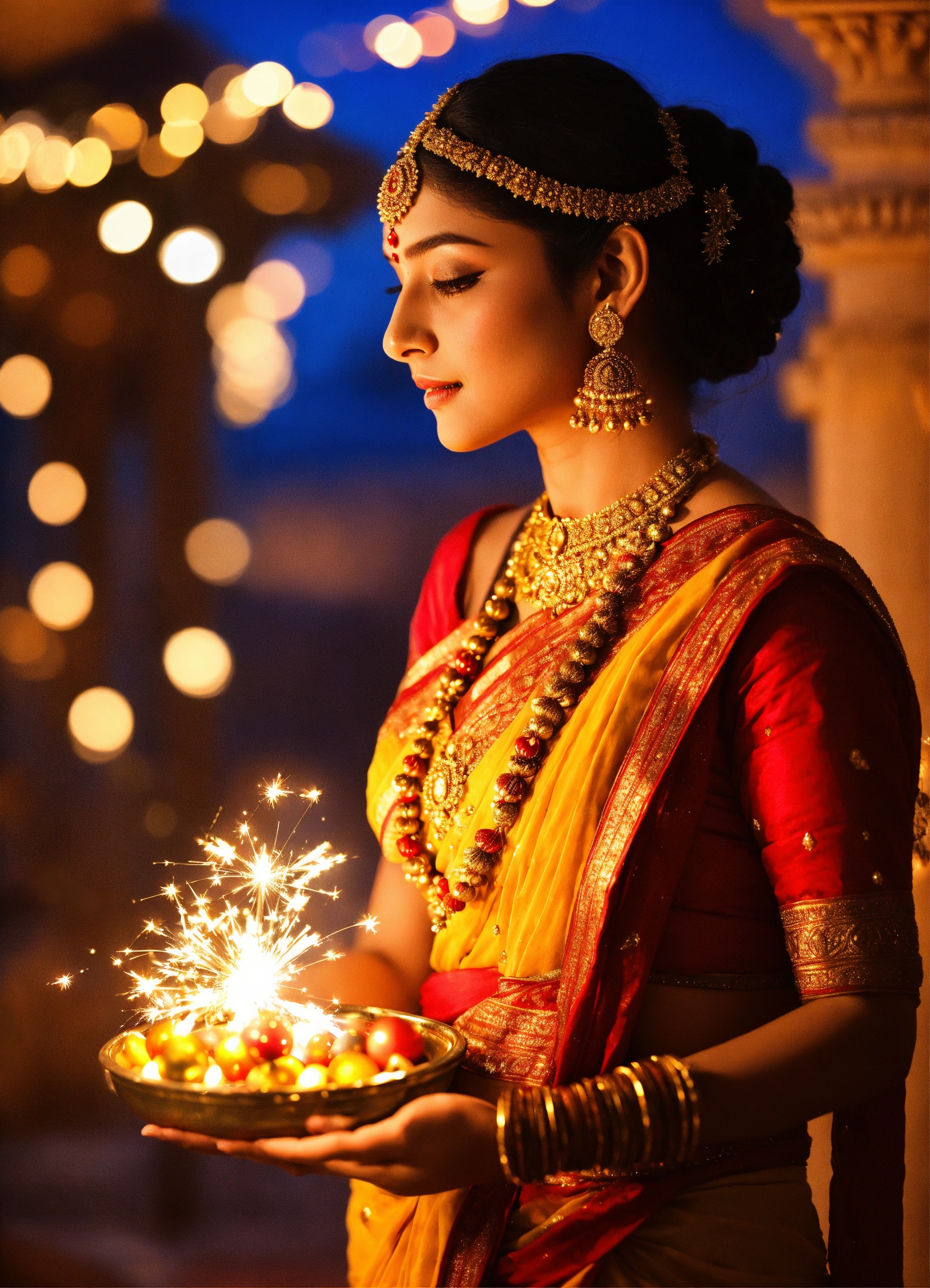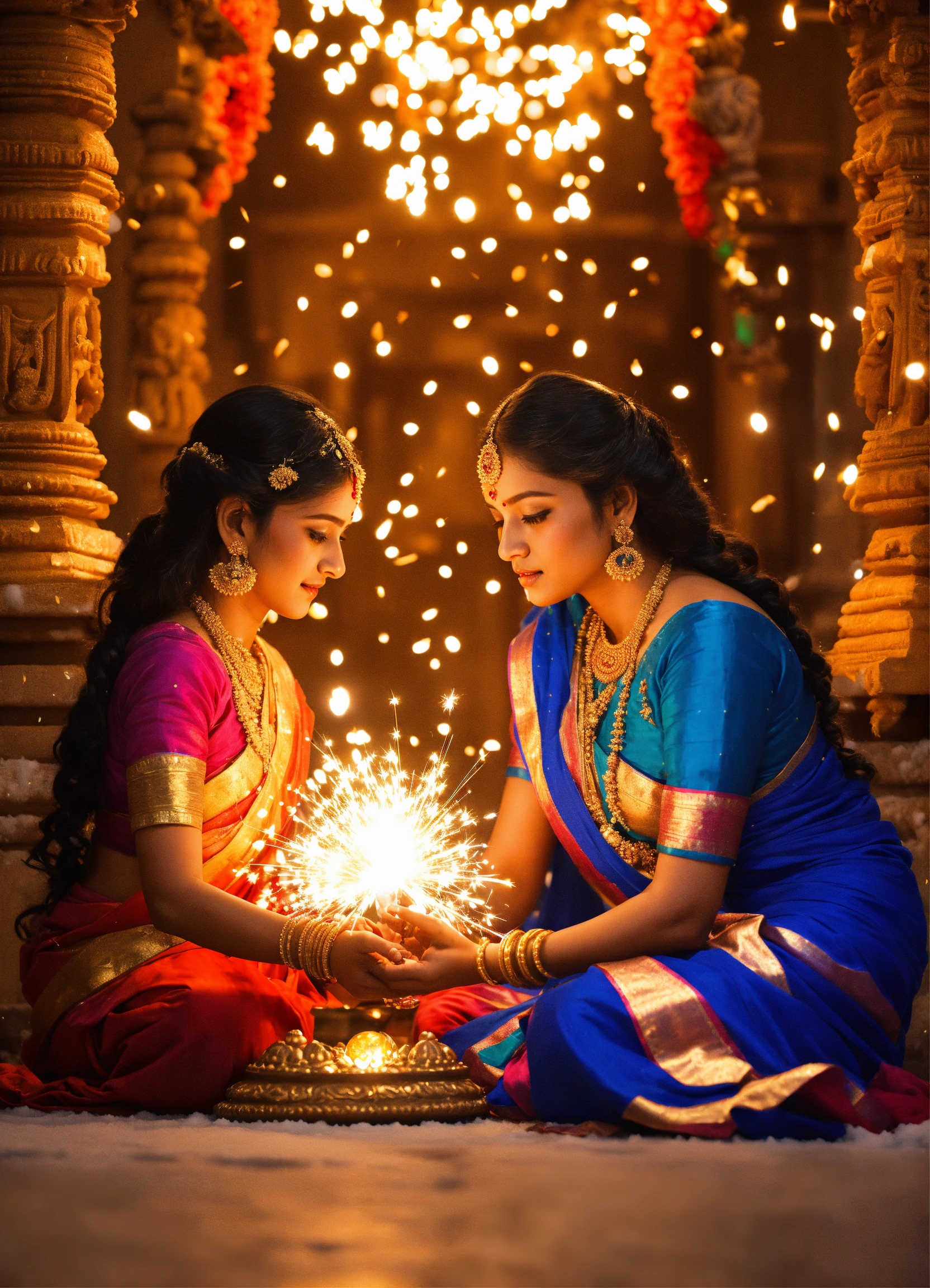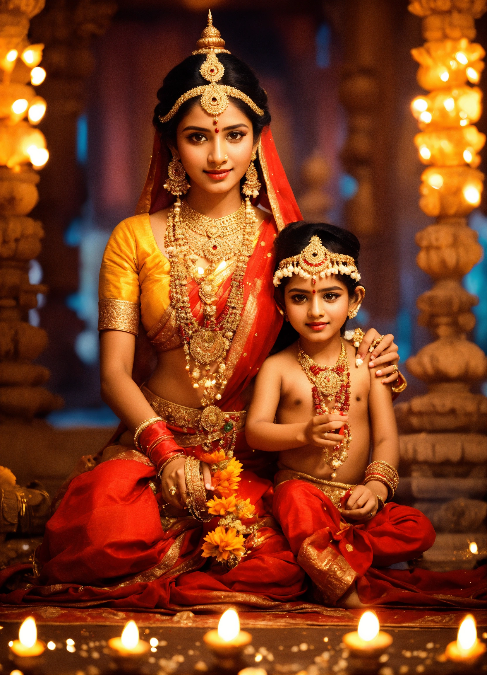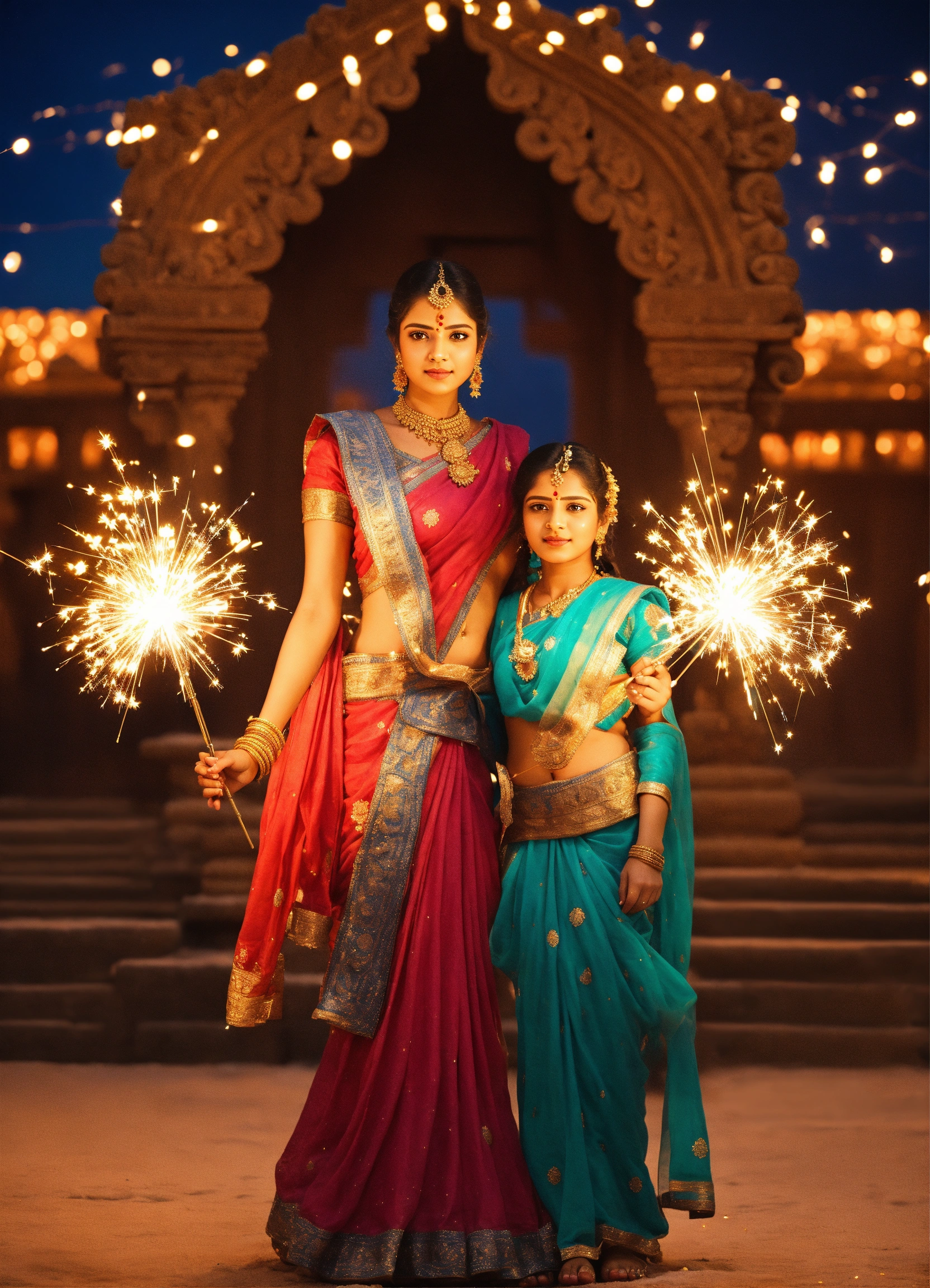 Diwali celebrations with sparklers. beautiful picture, ancient costume beauty, mother and child, the most beautiful cg, beautiful, beauty, beauty, lengyan, meticulous depicting, wearing ancient costumes, gorgeous dresses, dignified appearance, background ancient hindu temple temple temple in snow area, depict golden snow falling, detailed characterization, crystal, ball hair, delicate characterization eyes, whole body, high-definition, 16k, ornaments, highlight effects, full backlight, depth detailed characterization features stereo, detailed depict eyes, the accurate proportion, the size balance, perfect masterpiece.