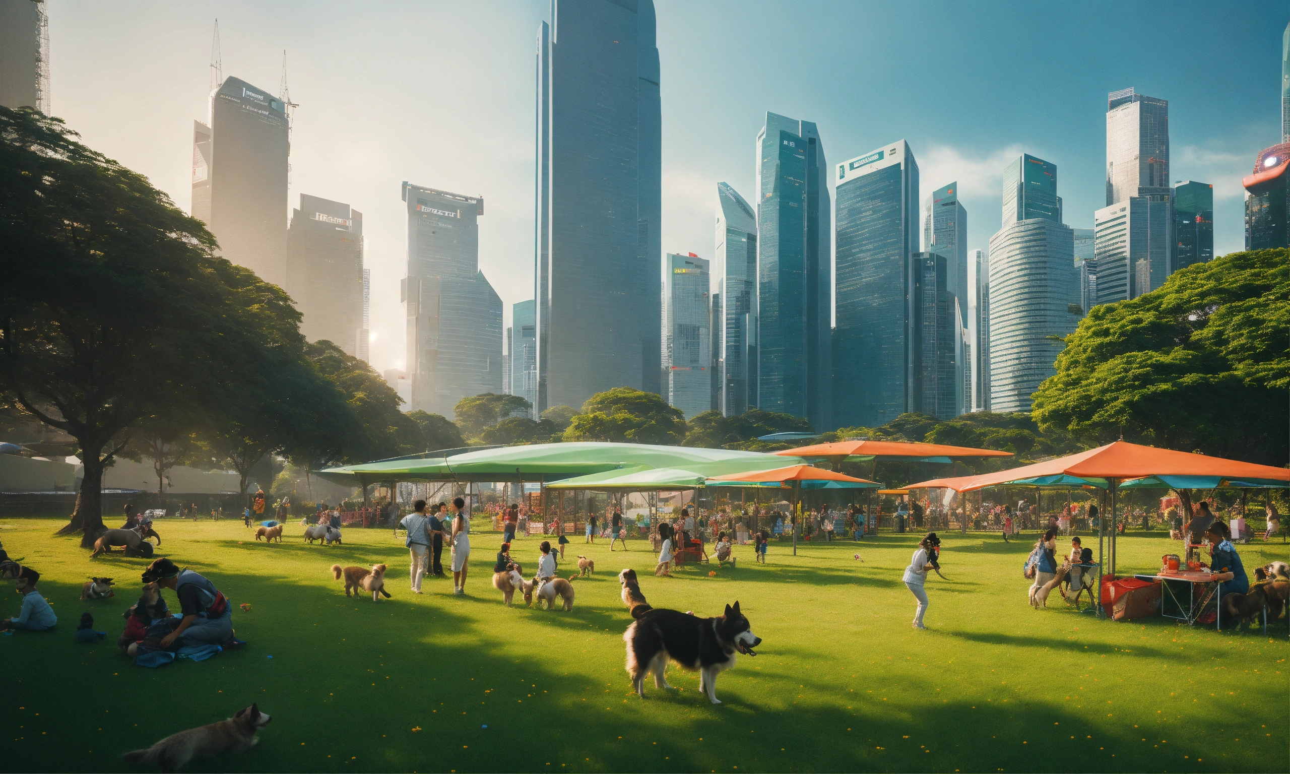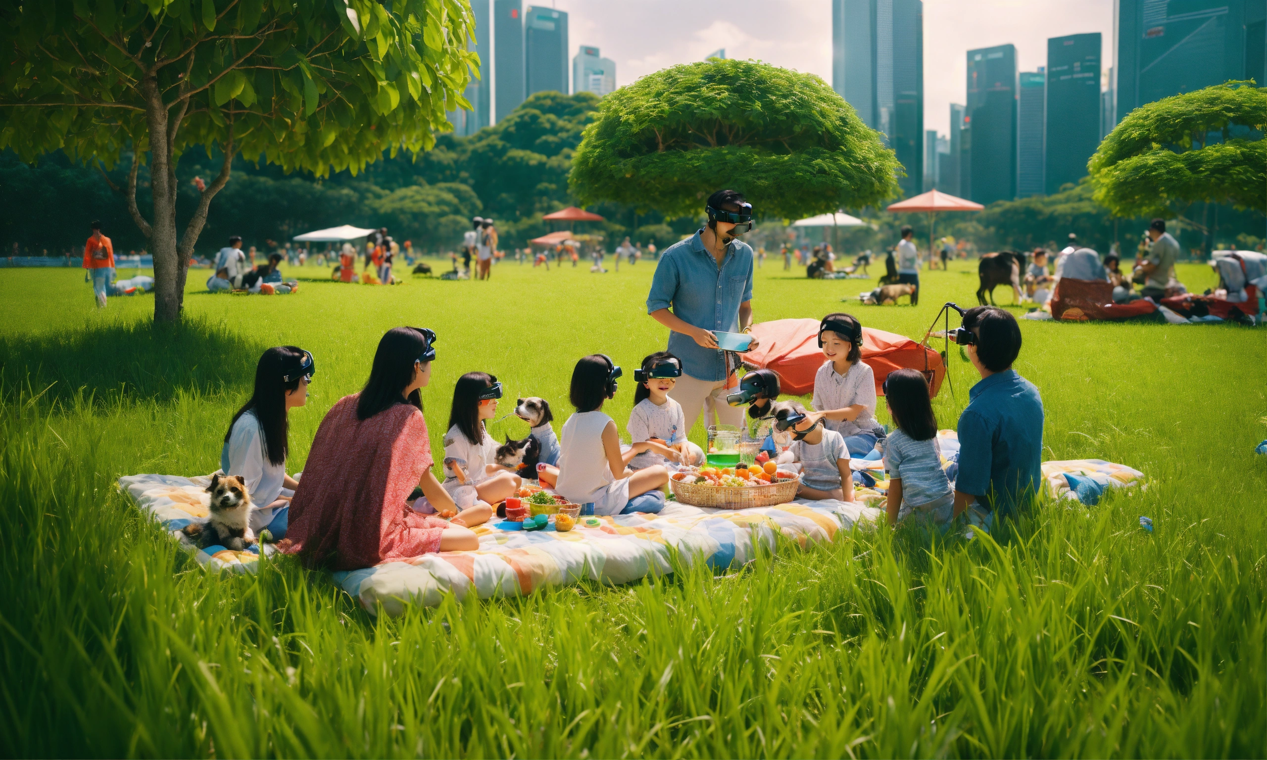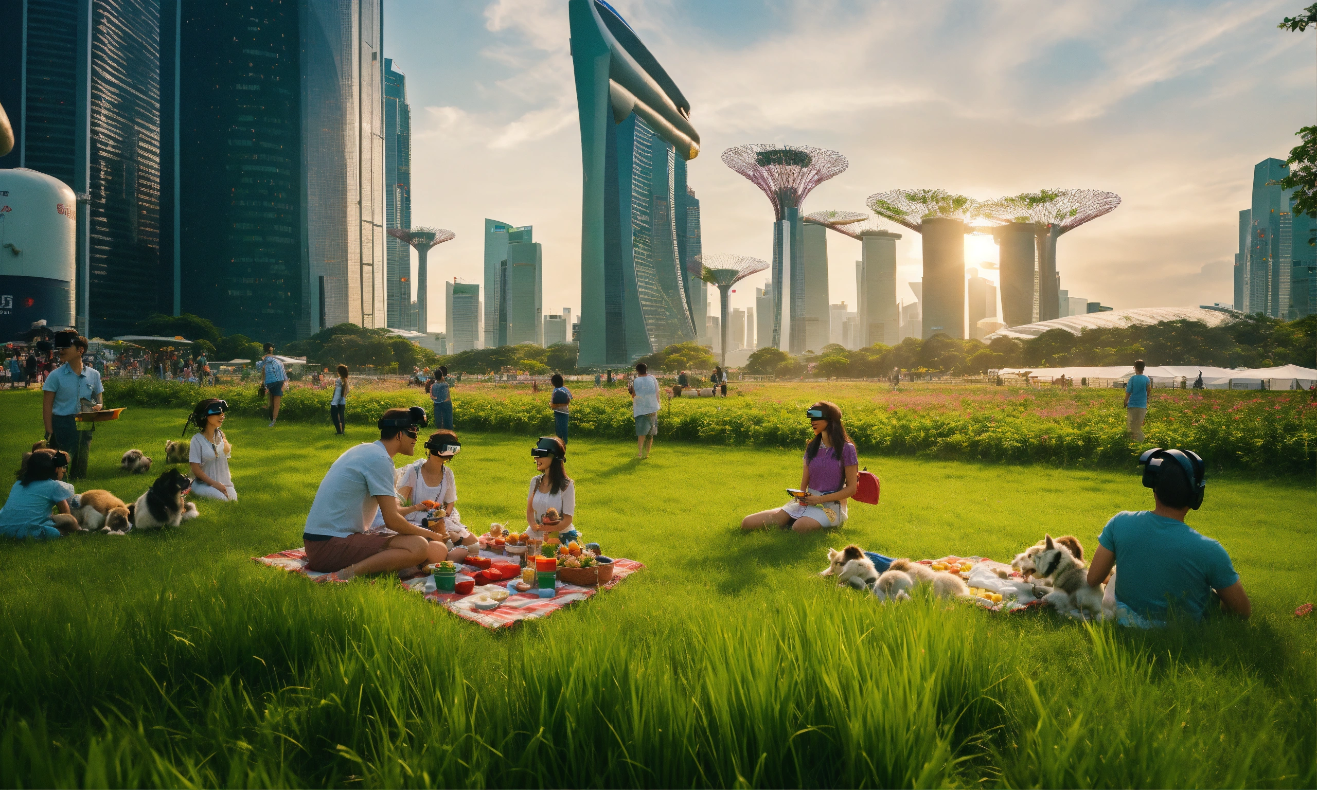 Midday, ultra-realistic, cinematic quality, wide-angle shot of a technologically advanced green field in singapore, high-tech picnic blankets with integrated touch screens, singapore's futuristic cityscape in the backdrop, few families subtly spread, enjoying their advanced surroundings, animals robotic dogs and birds interacting seamlessly in the field, carnival with floating rides and virtual reality booths to the side, modern nostalgia meets advanced futurism, vibrant, sunlit with dynamic tech-augmented shadows, 35mm camera for a cinematic depth, portra 200 film for natural, rich colors.