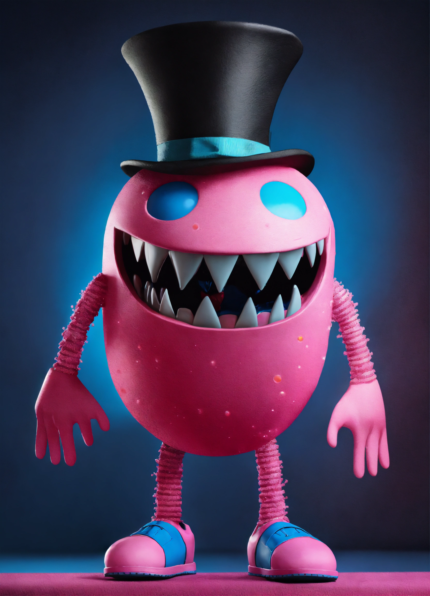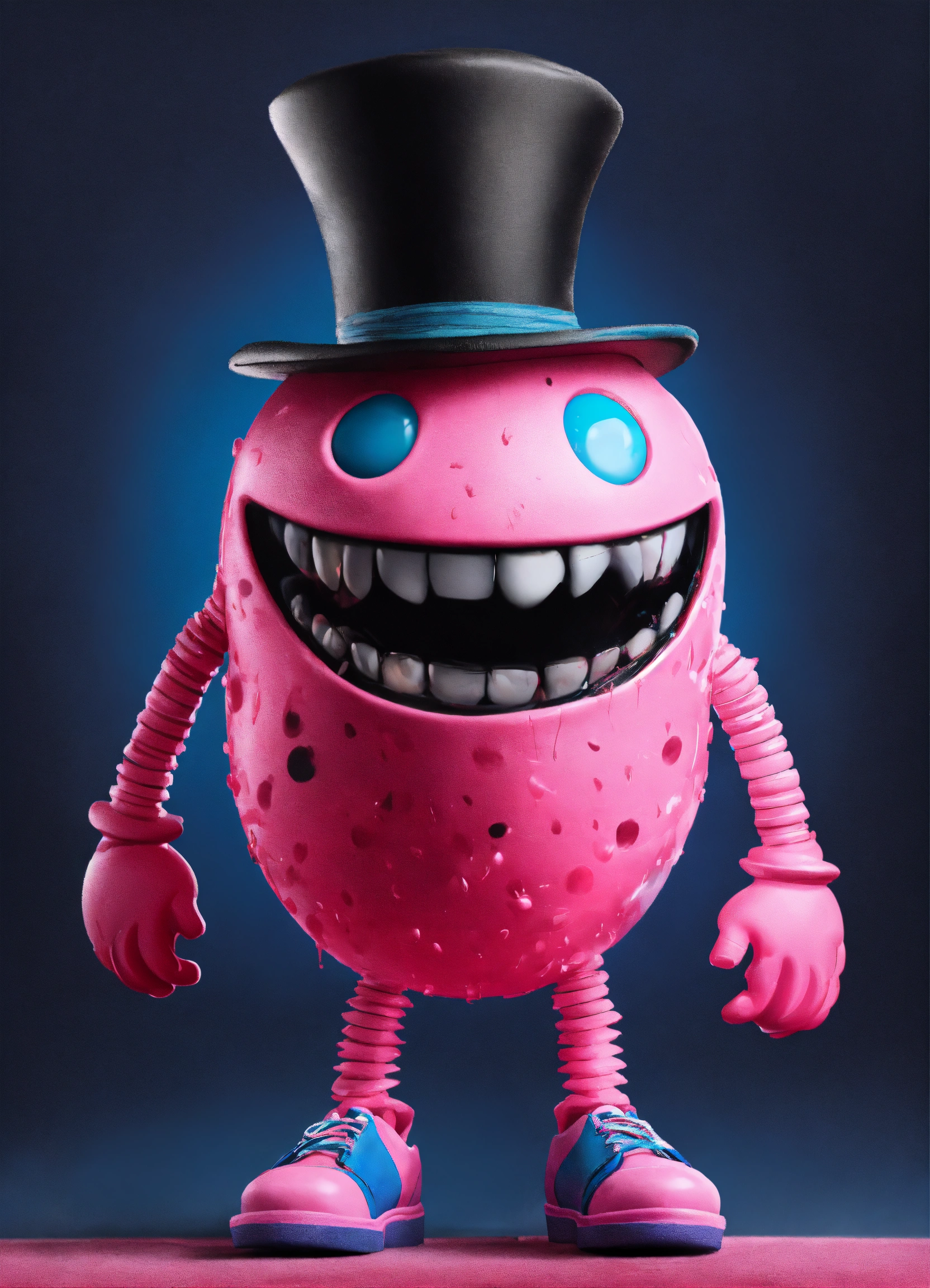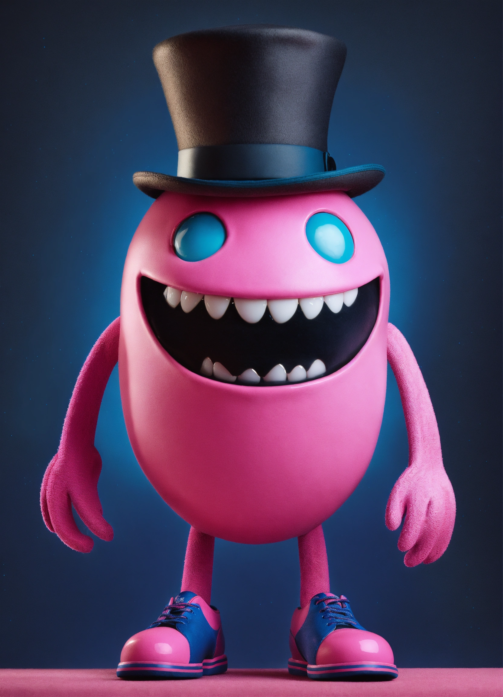 A pink ball with a big toothed grin, he has blue stick legs and blue shoes, he doesn't have a torso and his head is pink, he wears a black bowler hat his eyeballs are hazel colored