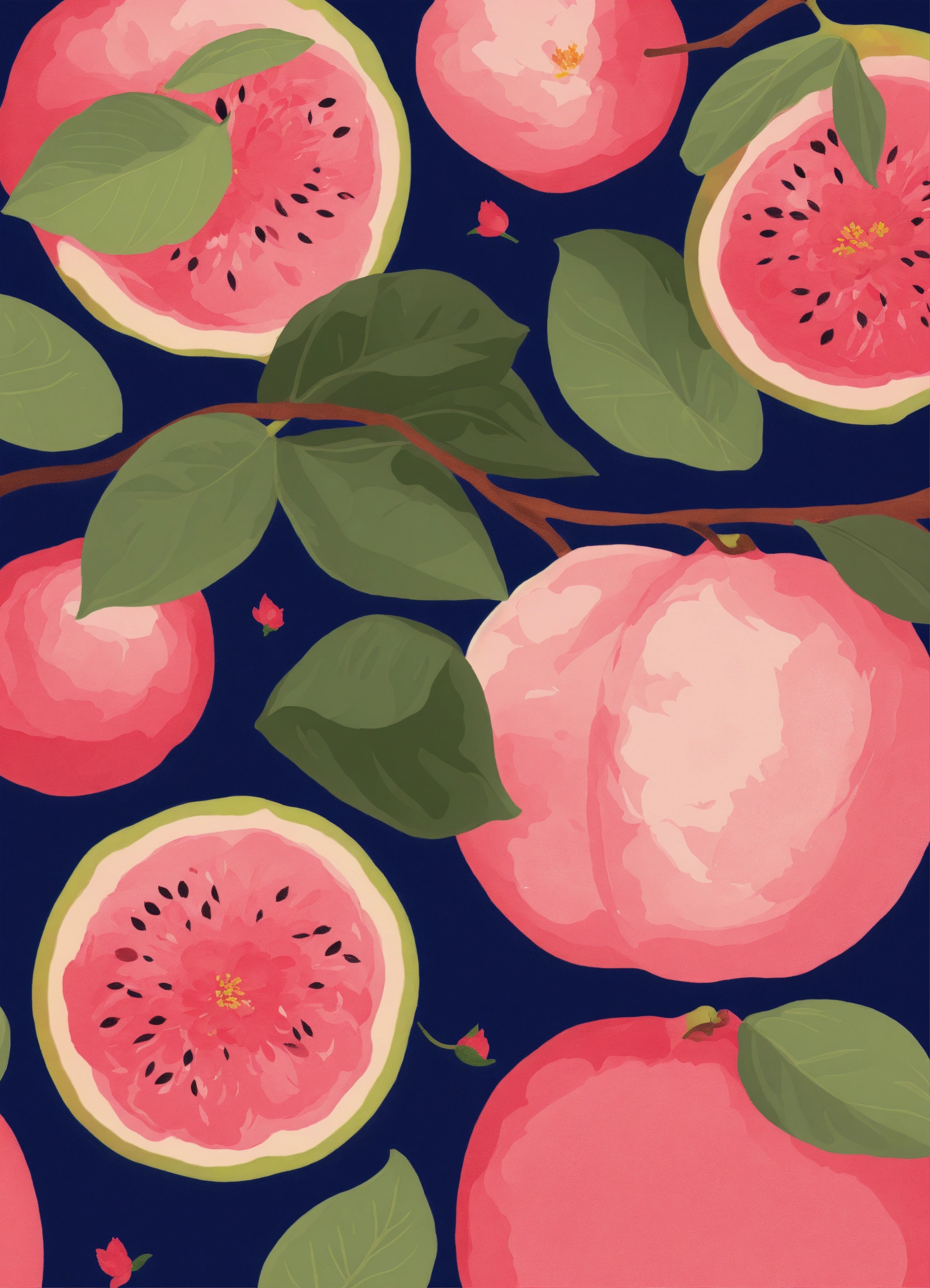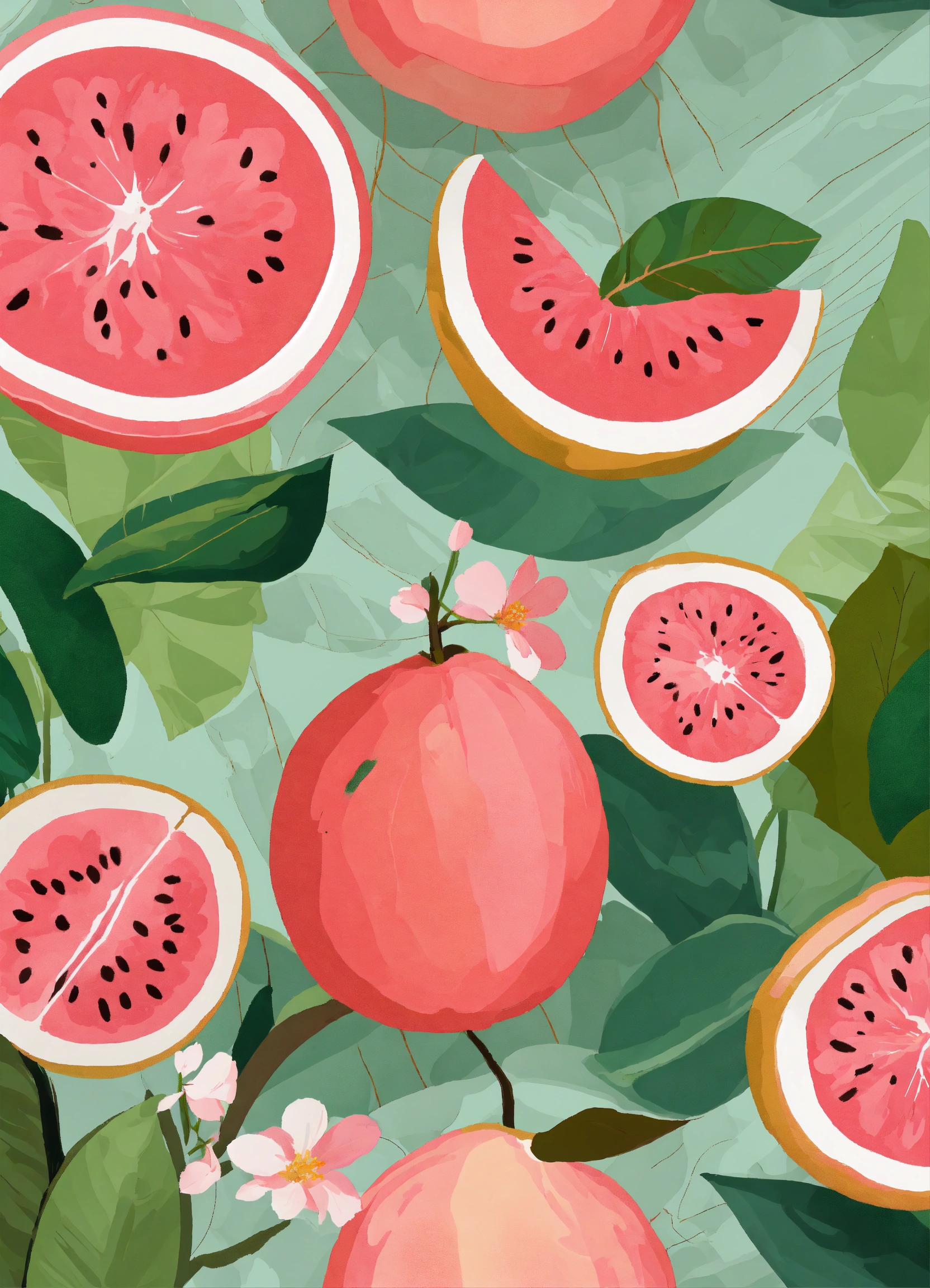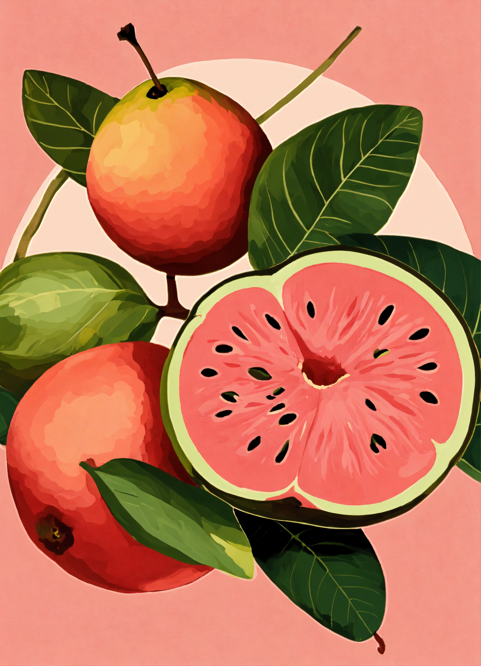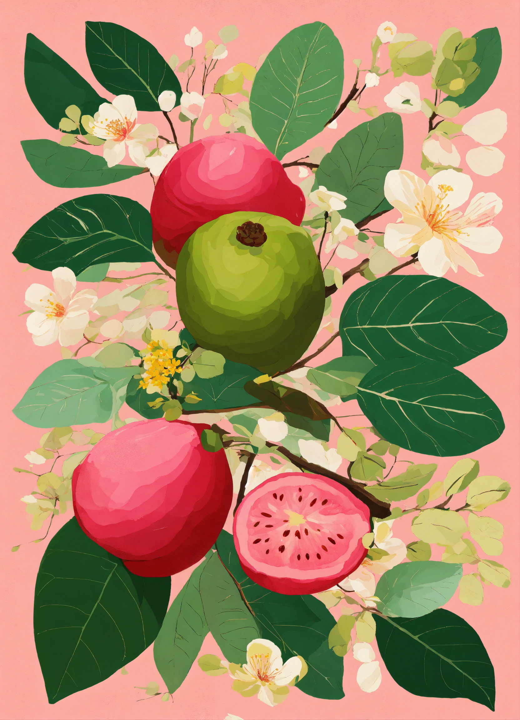The combinations of guava image merged beautifully with graphic and floral elements creates enhancing modern graphic art, digital art, hand painted, flat style
