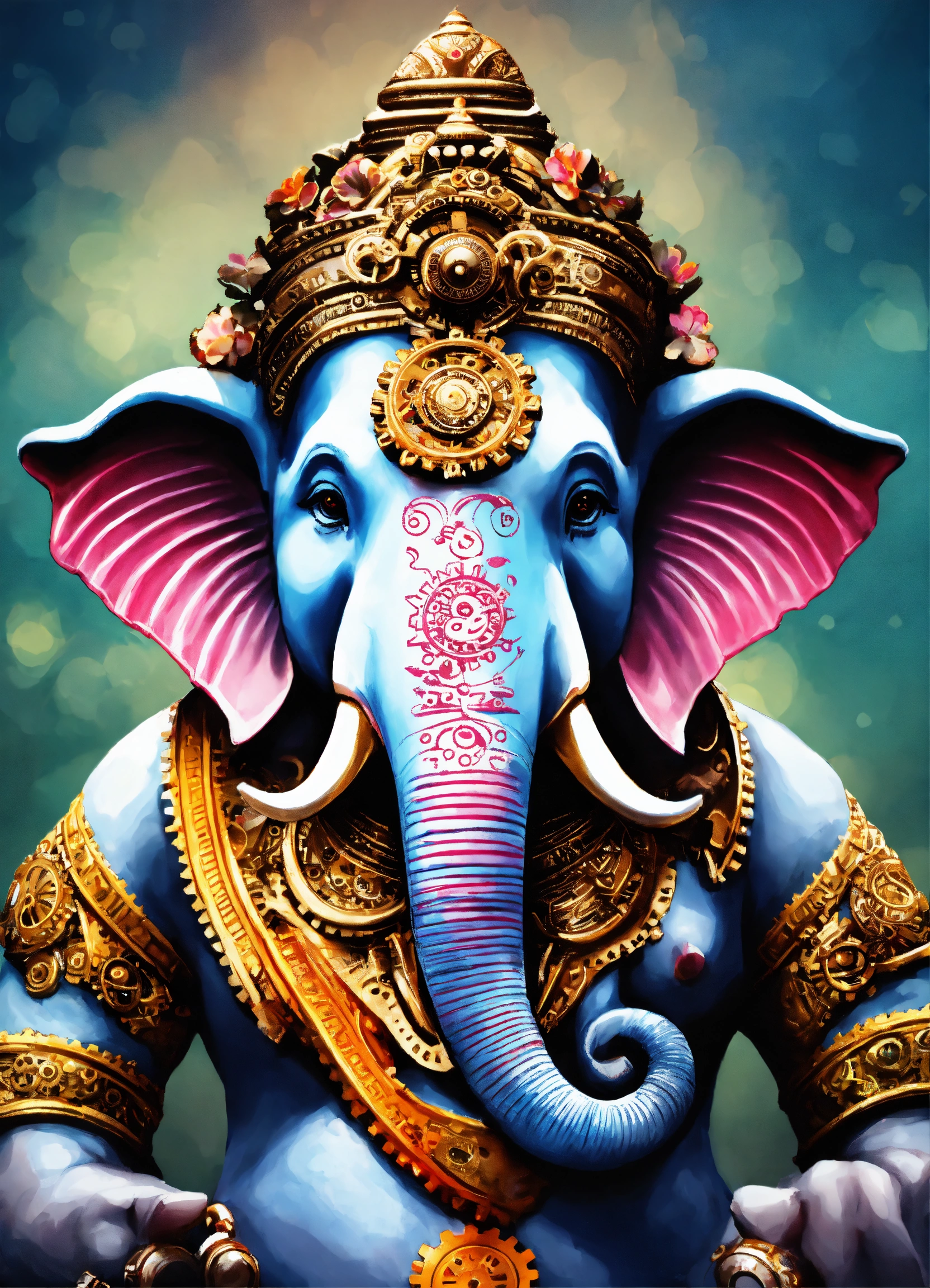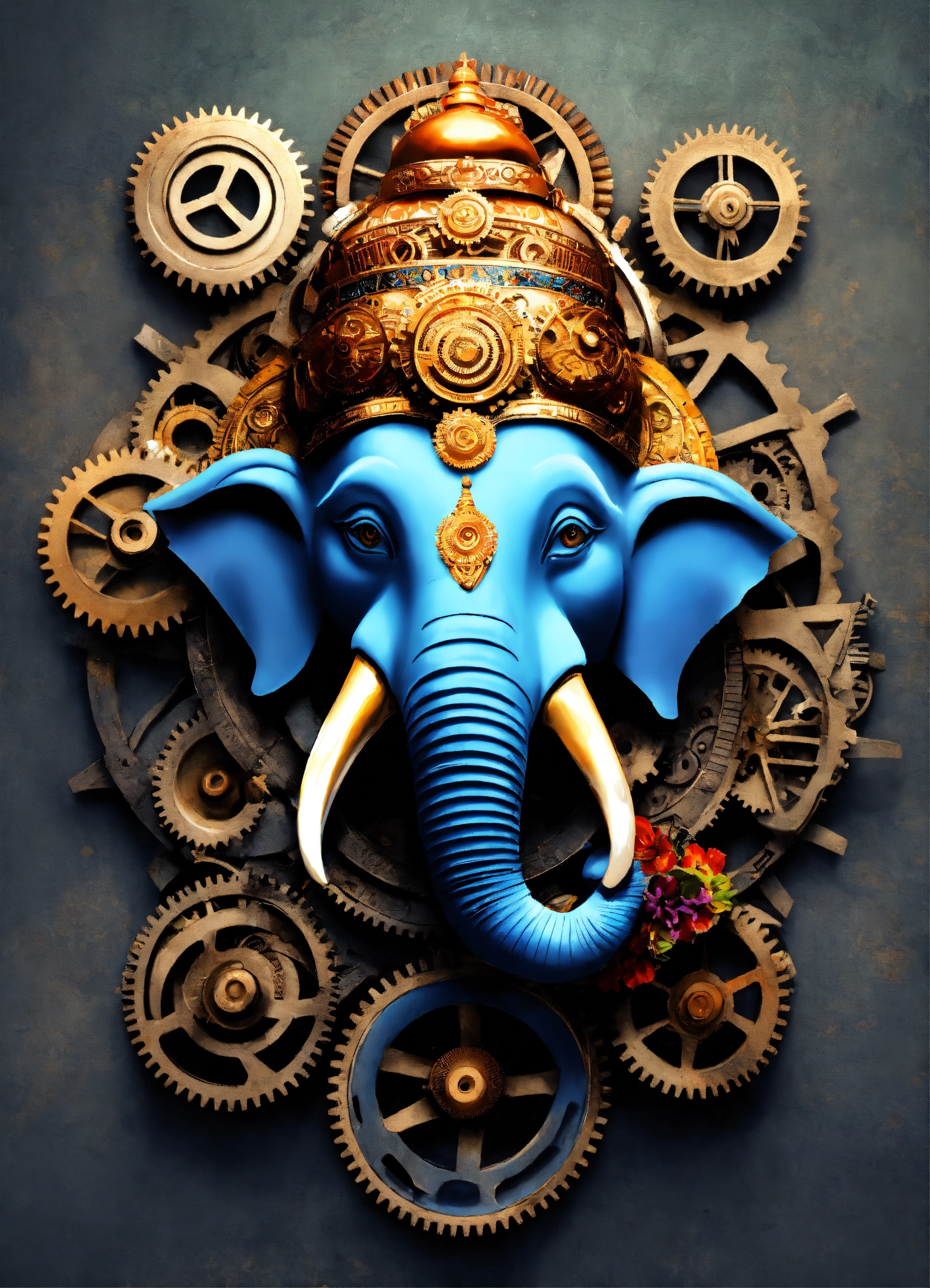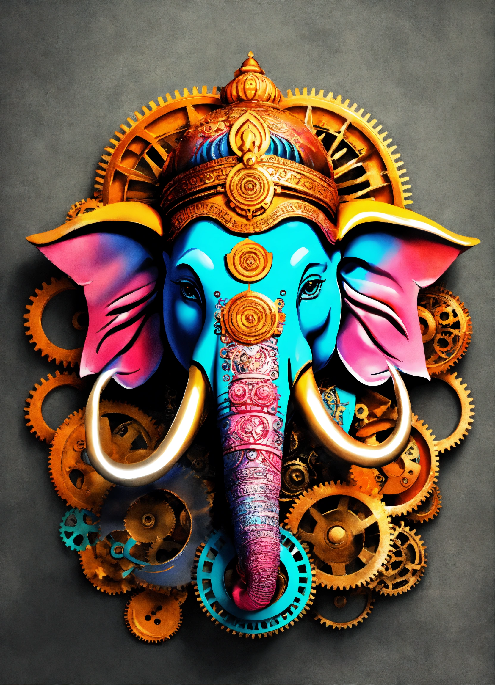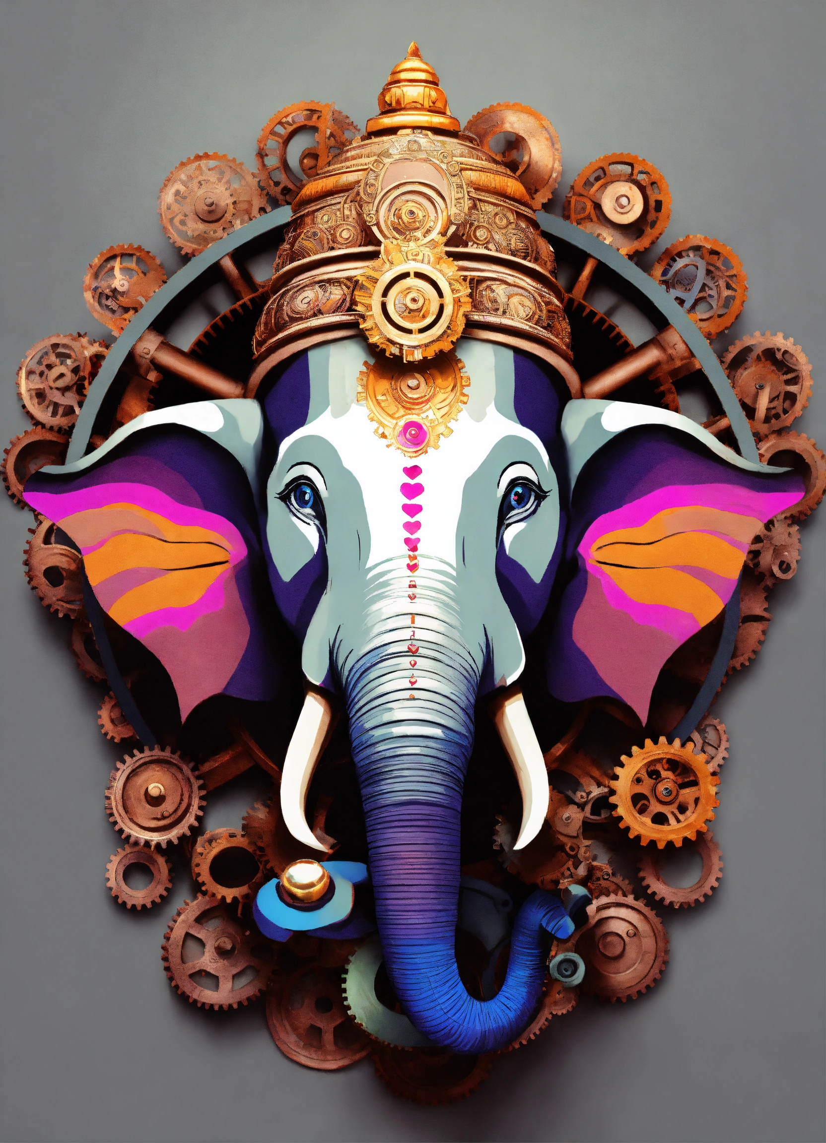 Ganesh head, romance, colorful, illustration, realistic, made all with grey colored gears inspired by ancient history.