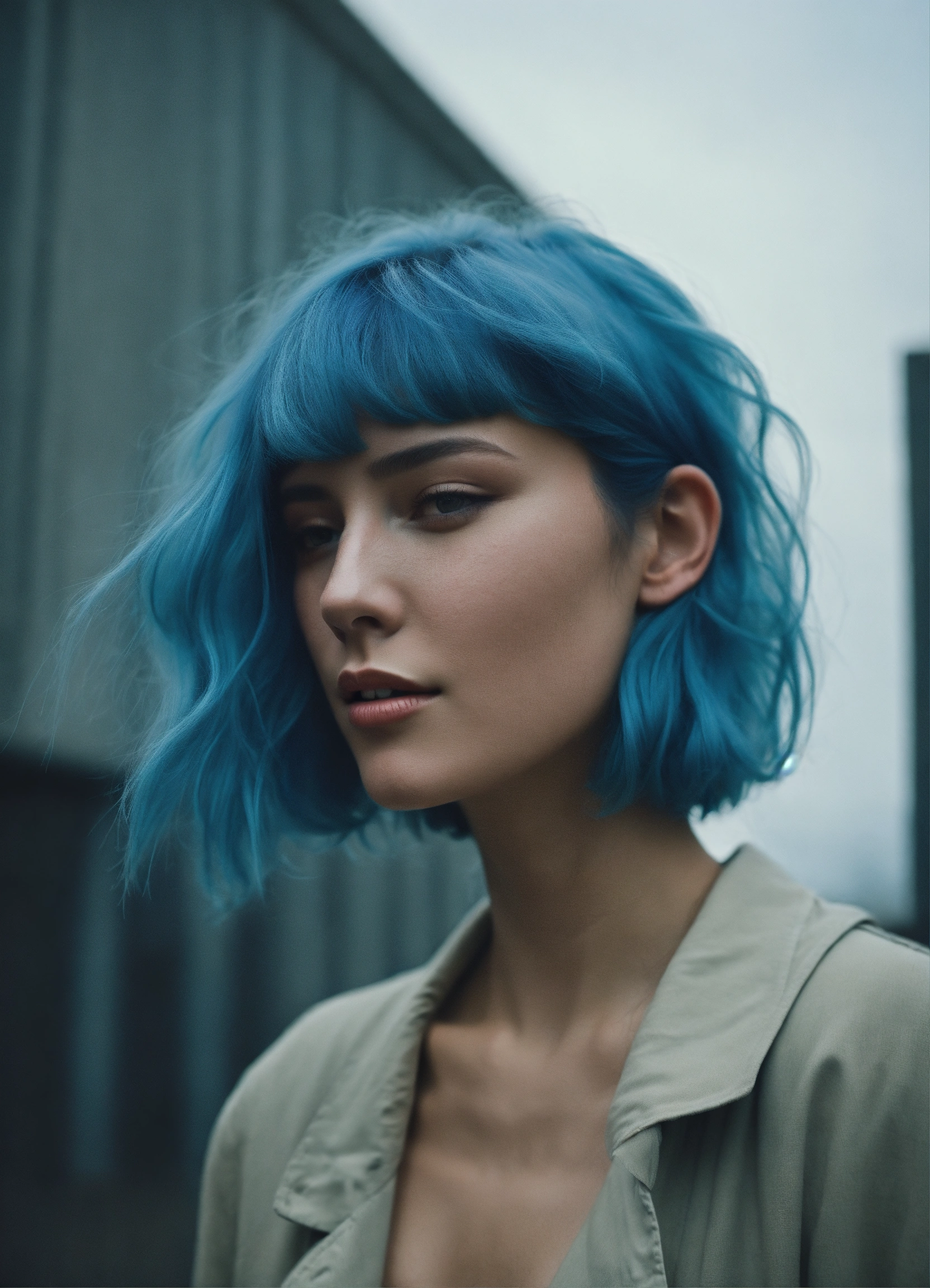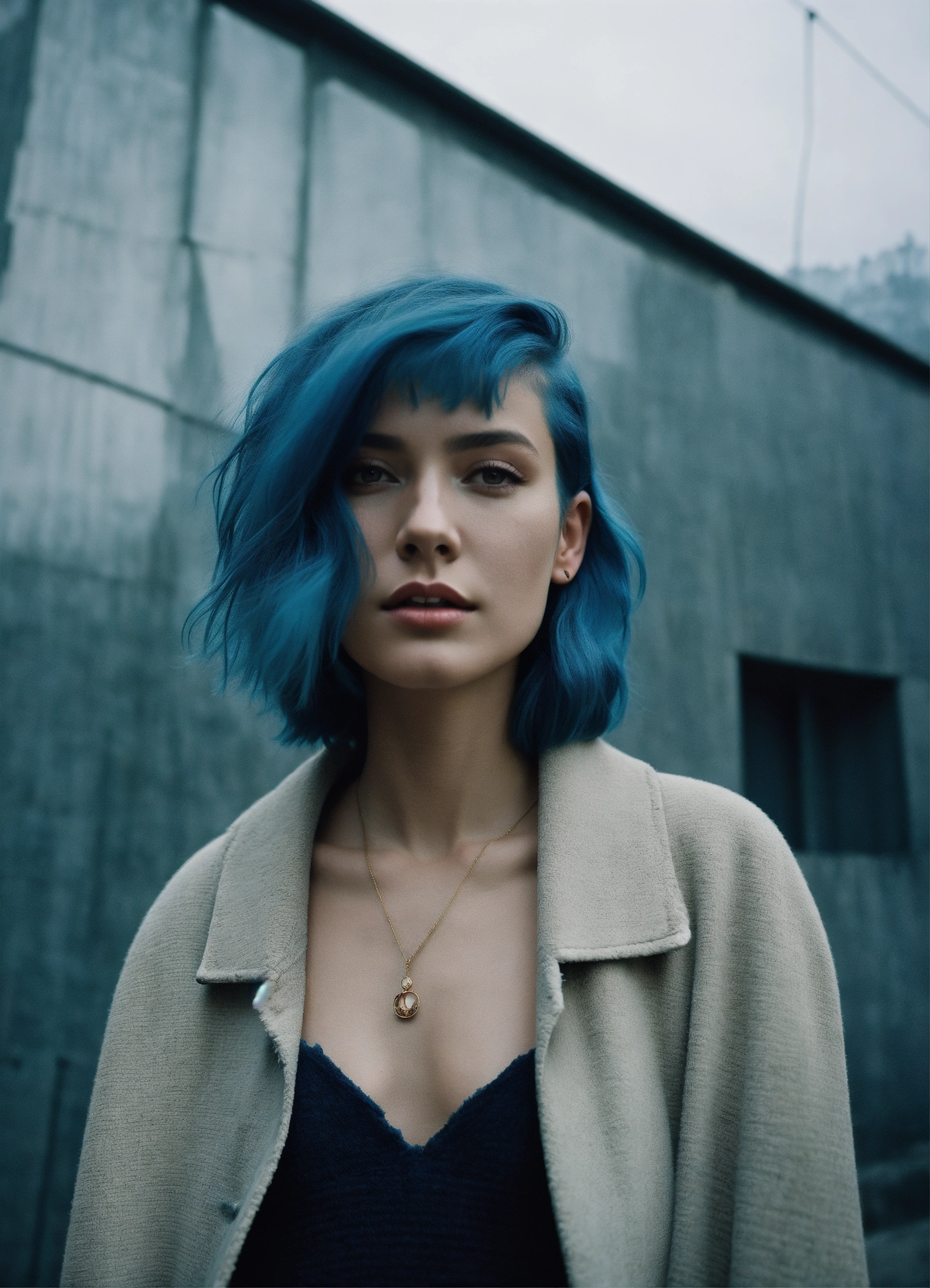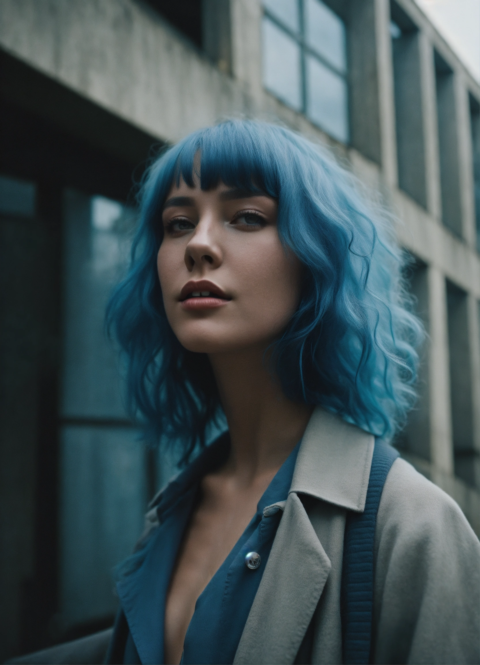 Portrait of beautiful fashion model with blue hair, ethereal dreamy foggy, photoshoot by annie leibovitz, editorial fashion magazine photoshoot, fashion poses, in front of brutalist building architecture. kinfolk magazine. film grain. a soft smile