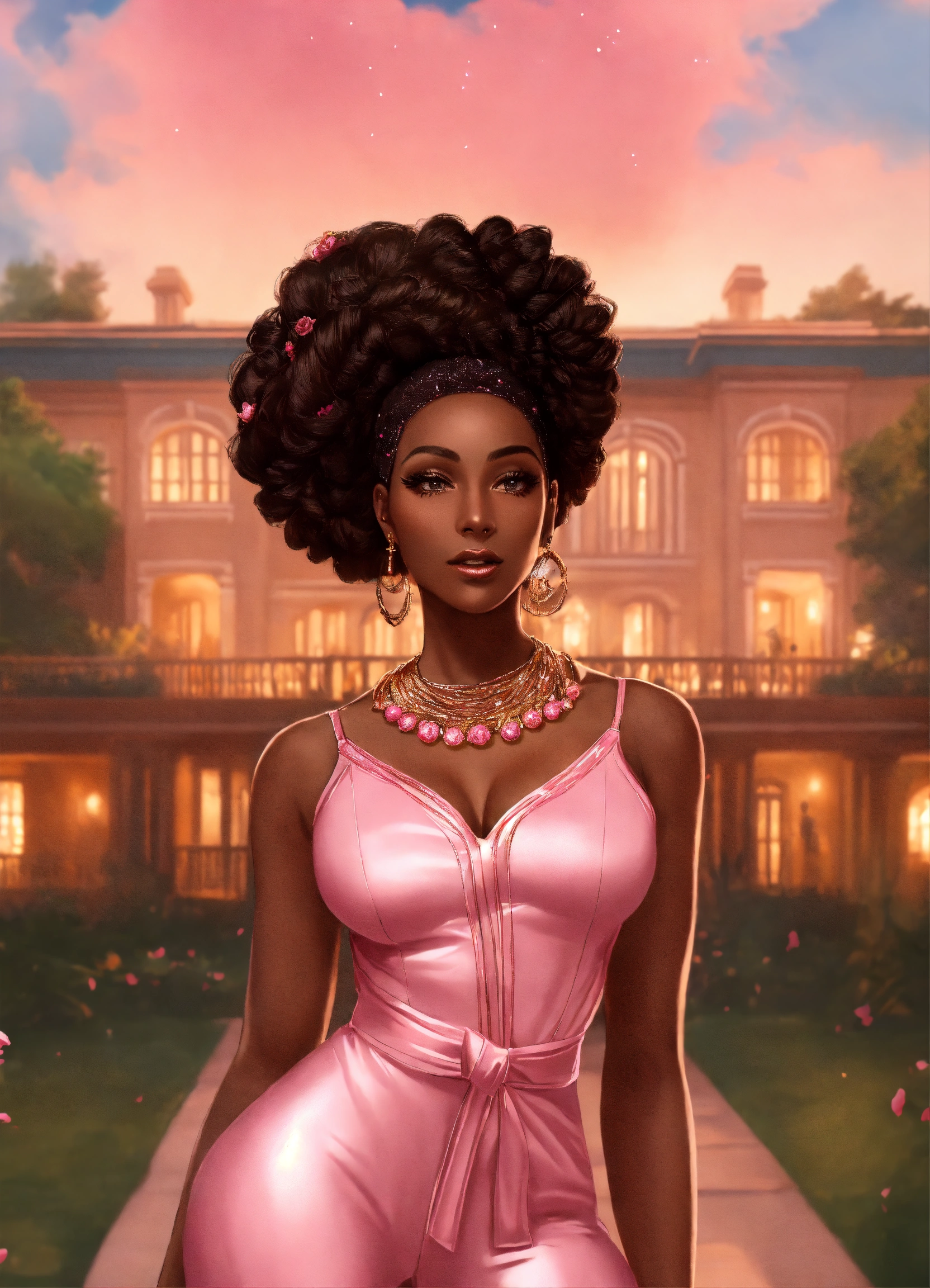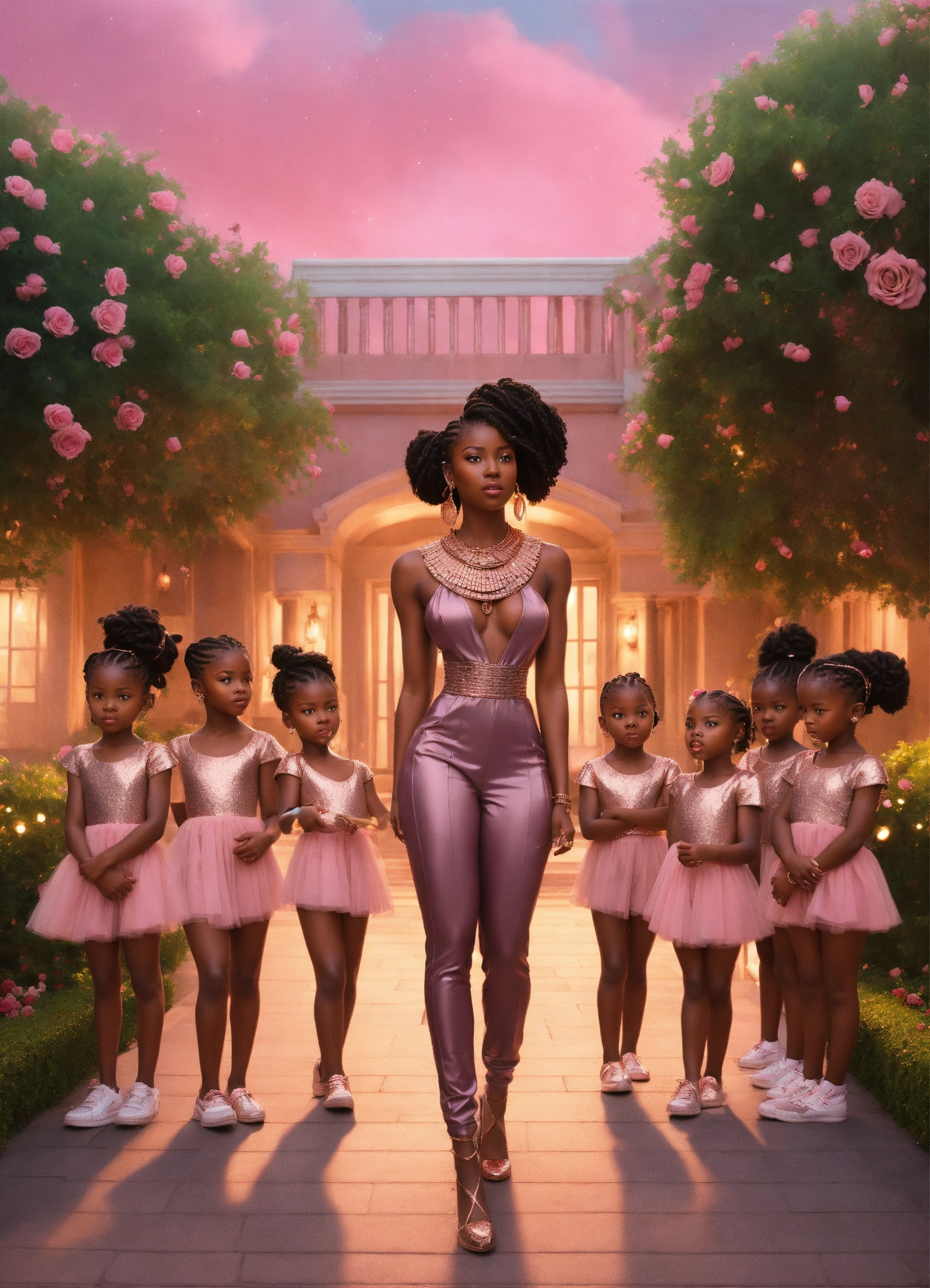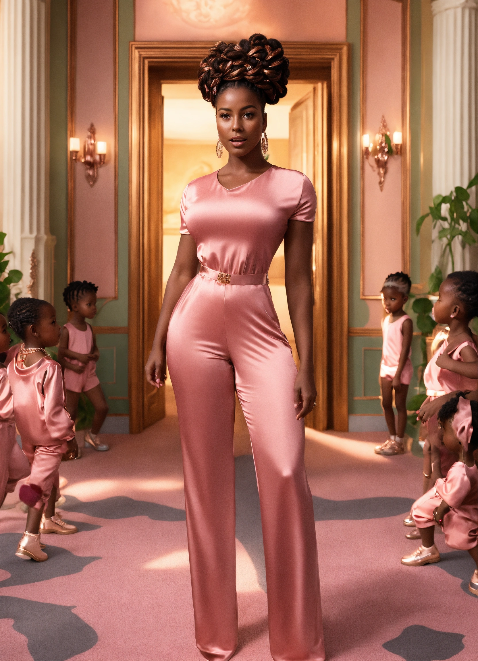 Full body incredibly insanely stunningly beautiful 35 year old dark skinned african american realistic cartoon woman with braided updo dressed in elegant jeweled jumpsuit gloriously standing in the a mansion looking powerful with ten little african children looking up to her for guidance with rose gold pink overtones realistic