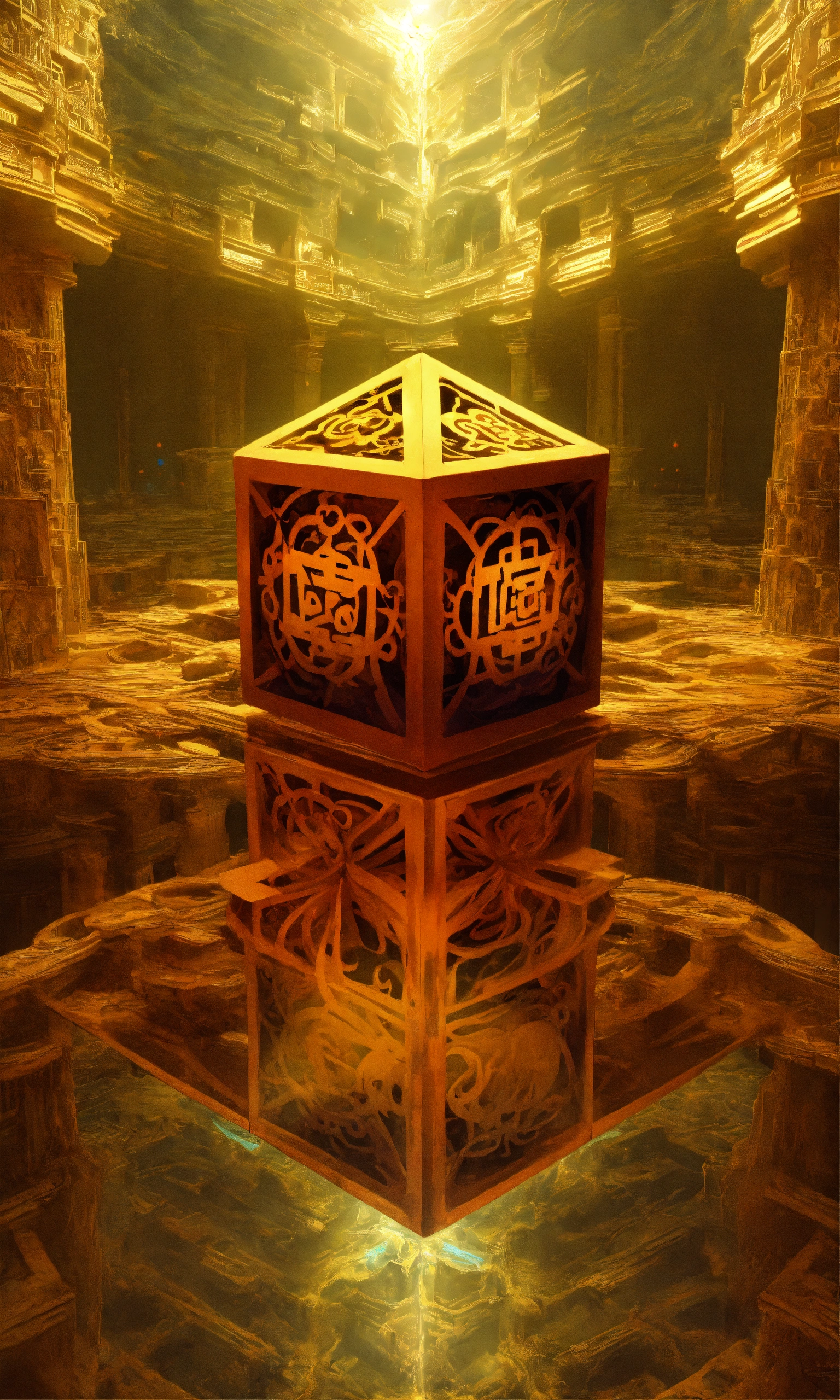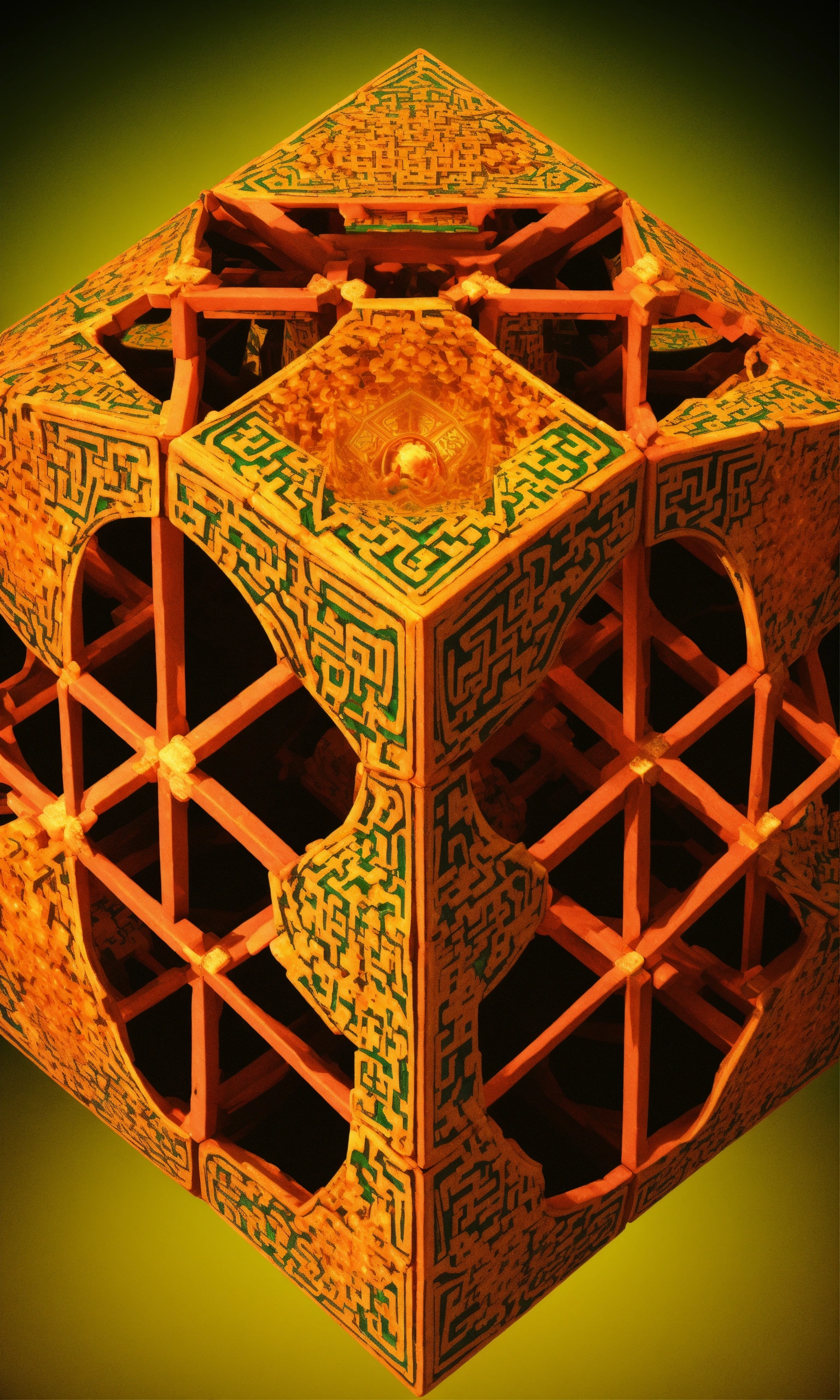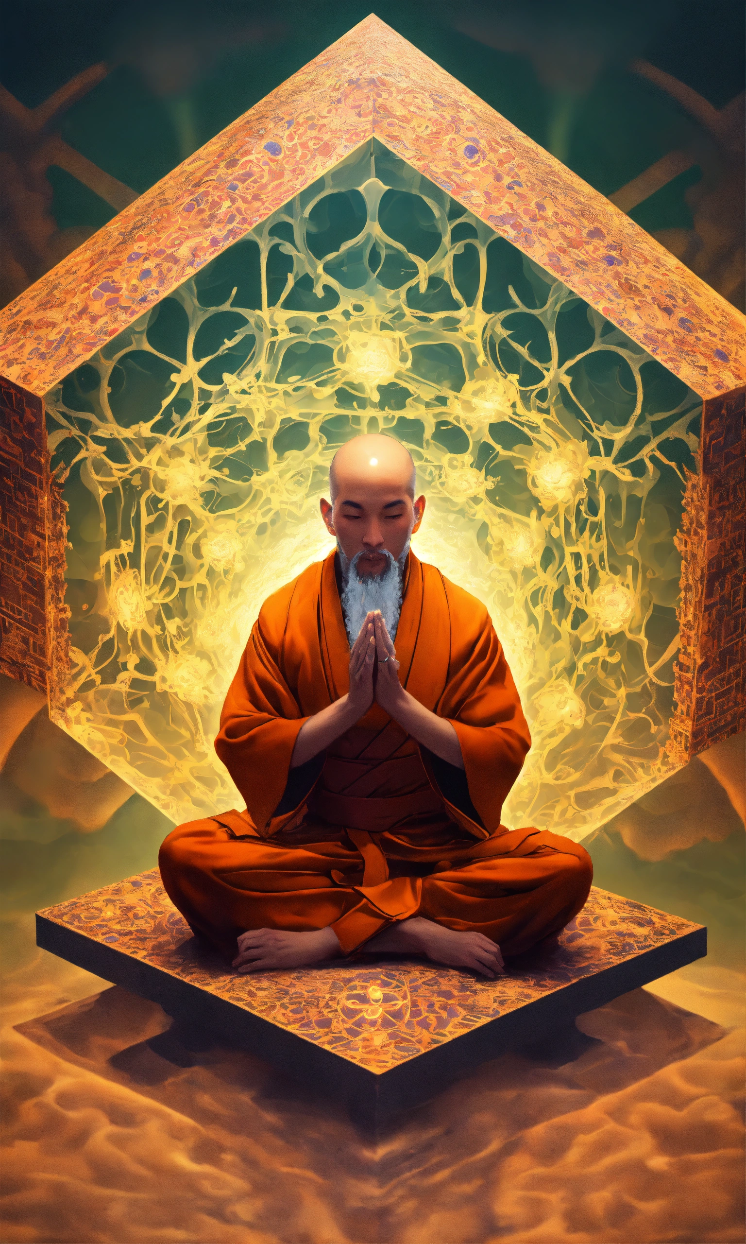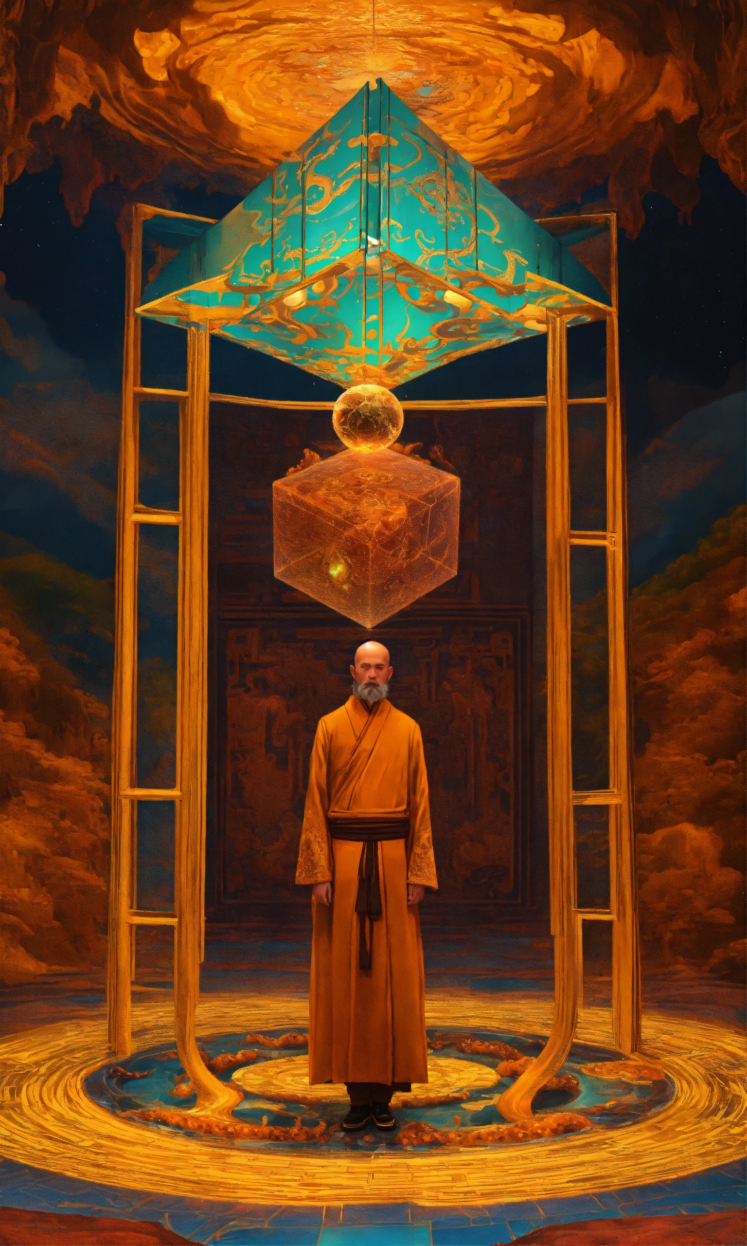 Taoist monk octopus tesseract body fractal three point perspective hypercube melting in each other