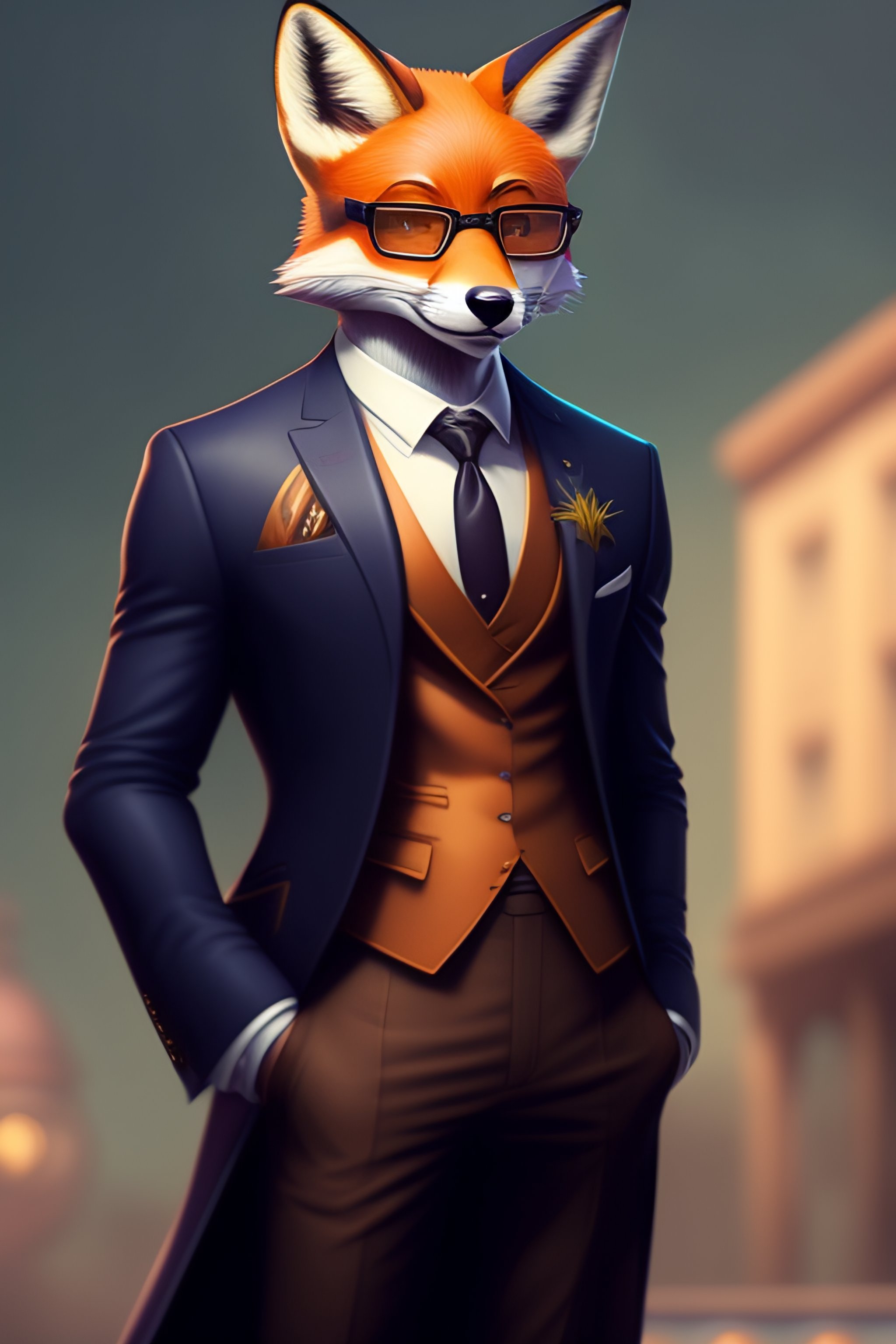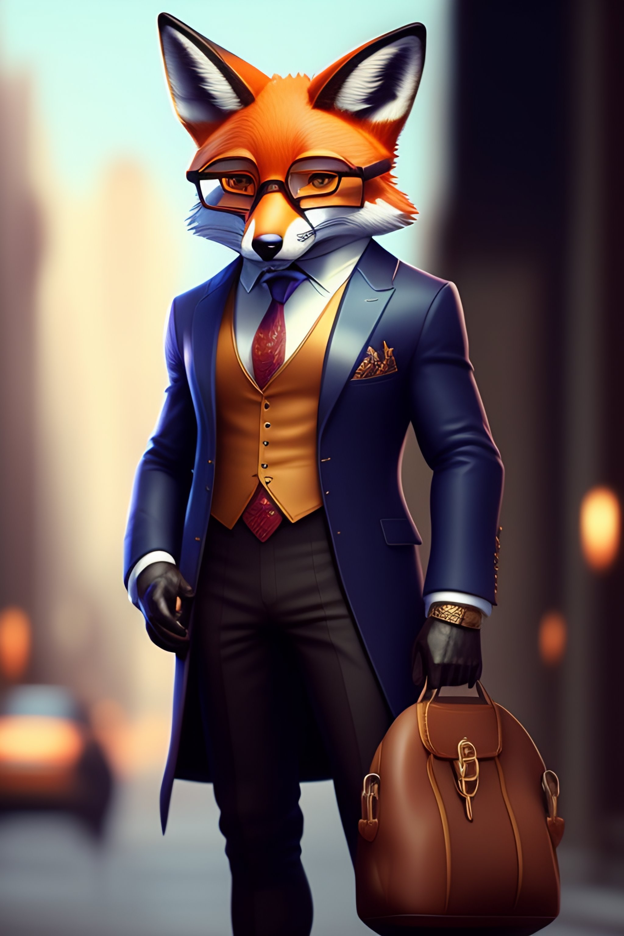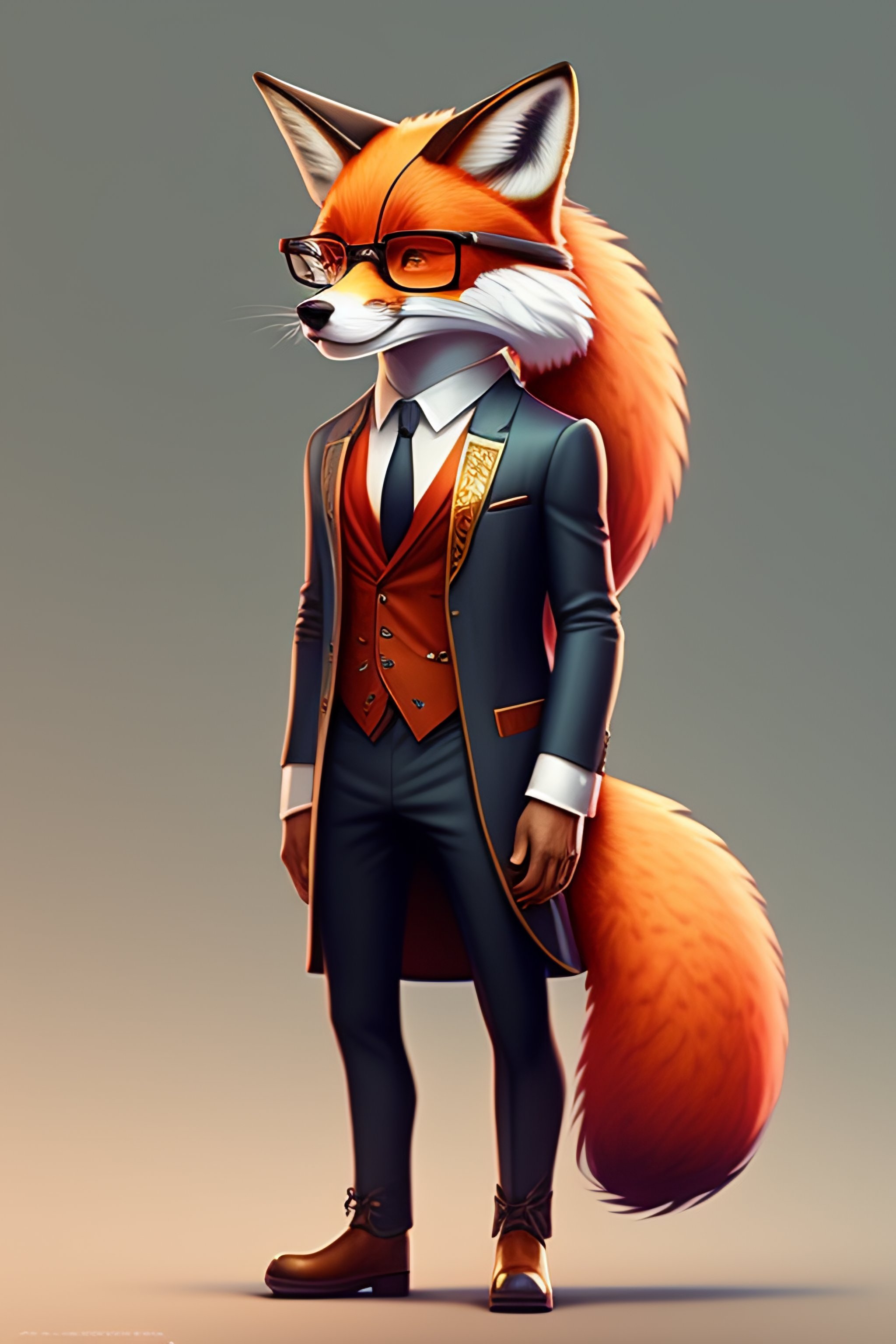 Anthro furry humanoid fox with glasses, three piece suit, checking watch, character concept design, painting, detailed, vivid, trending on artstation