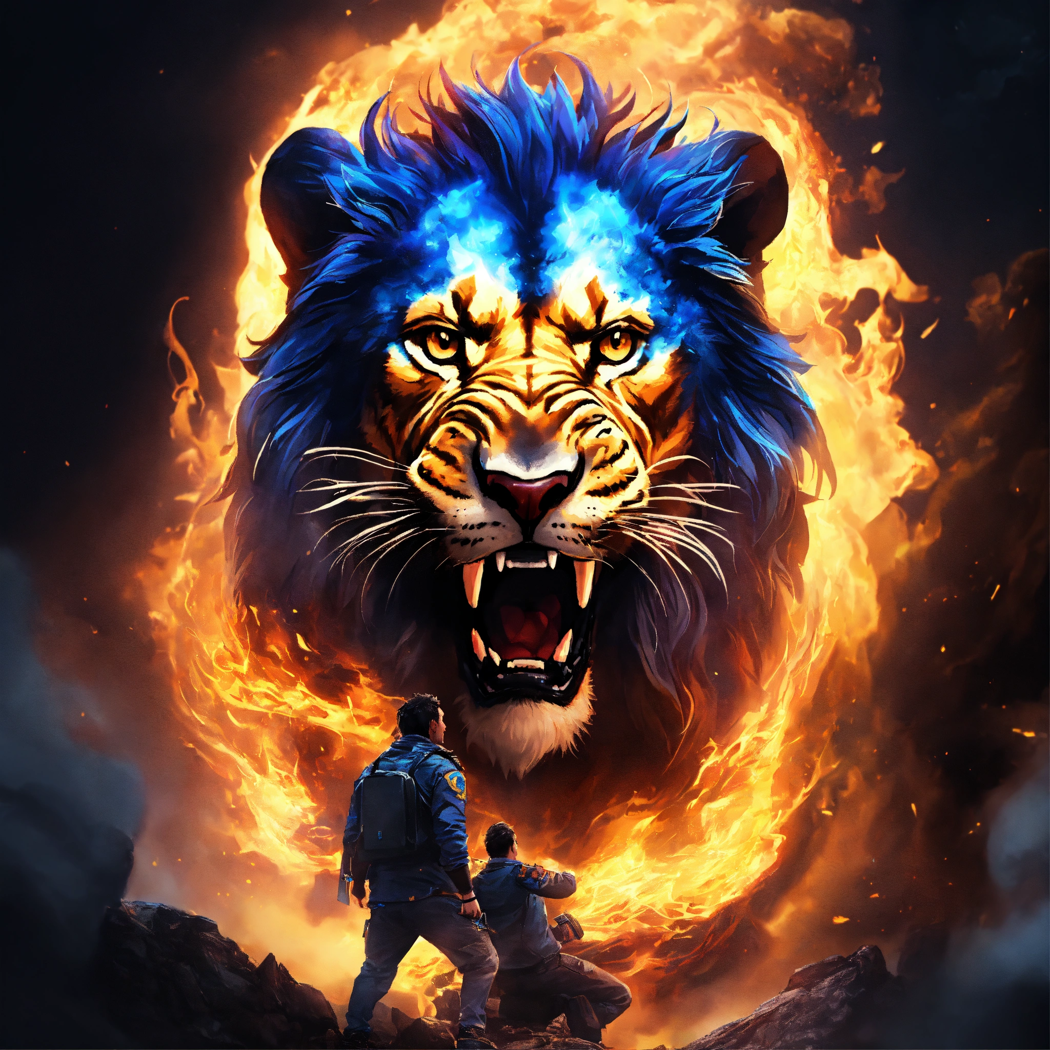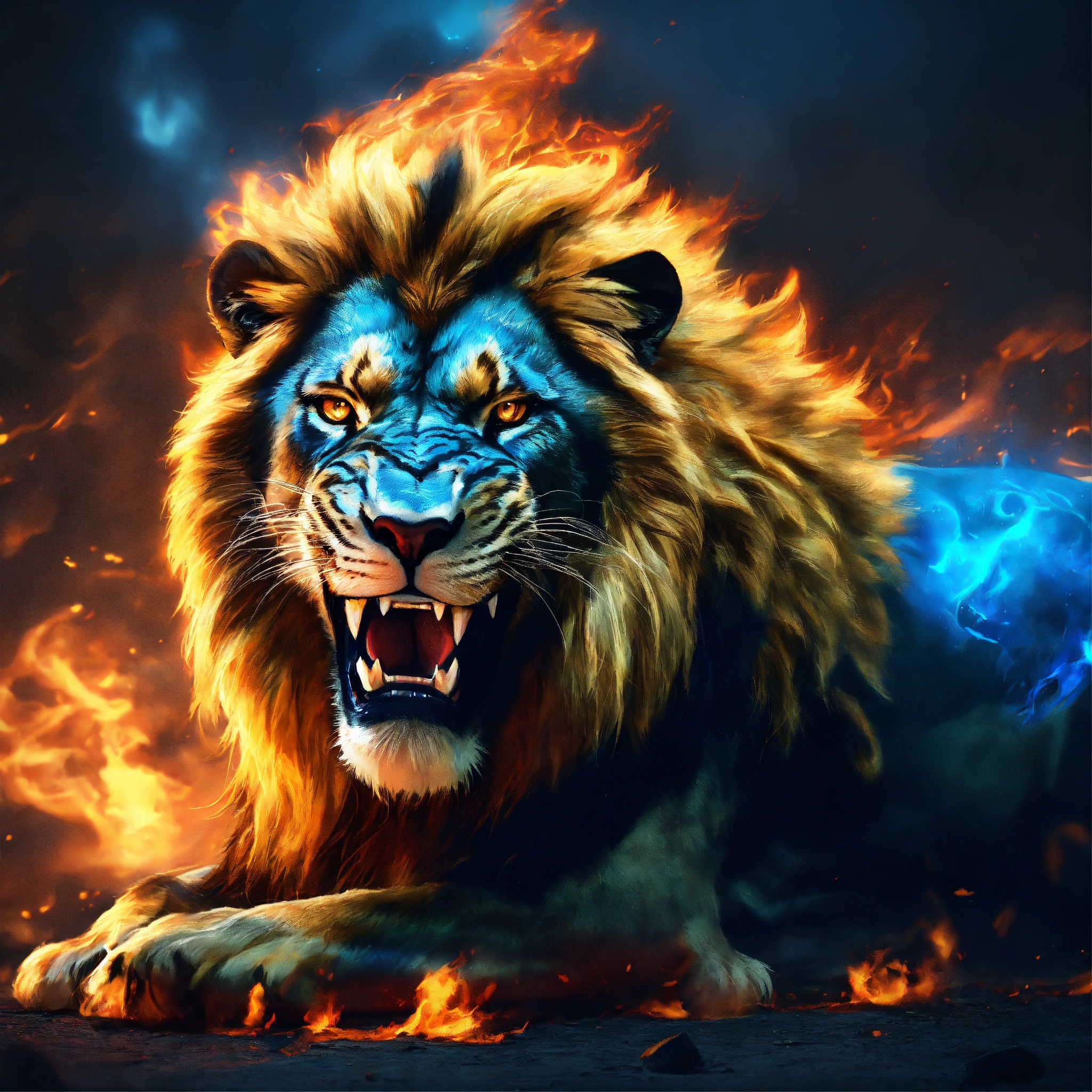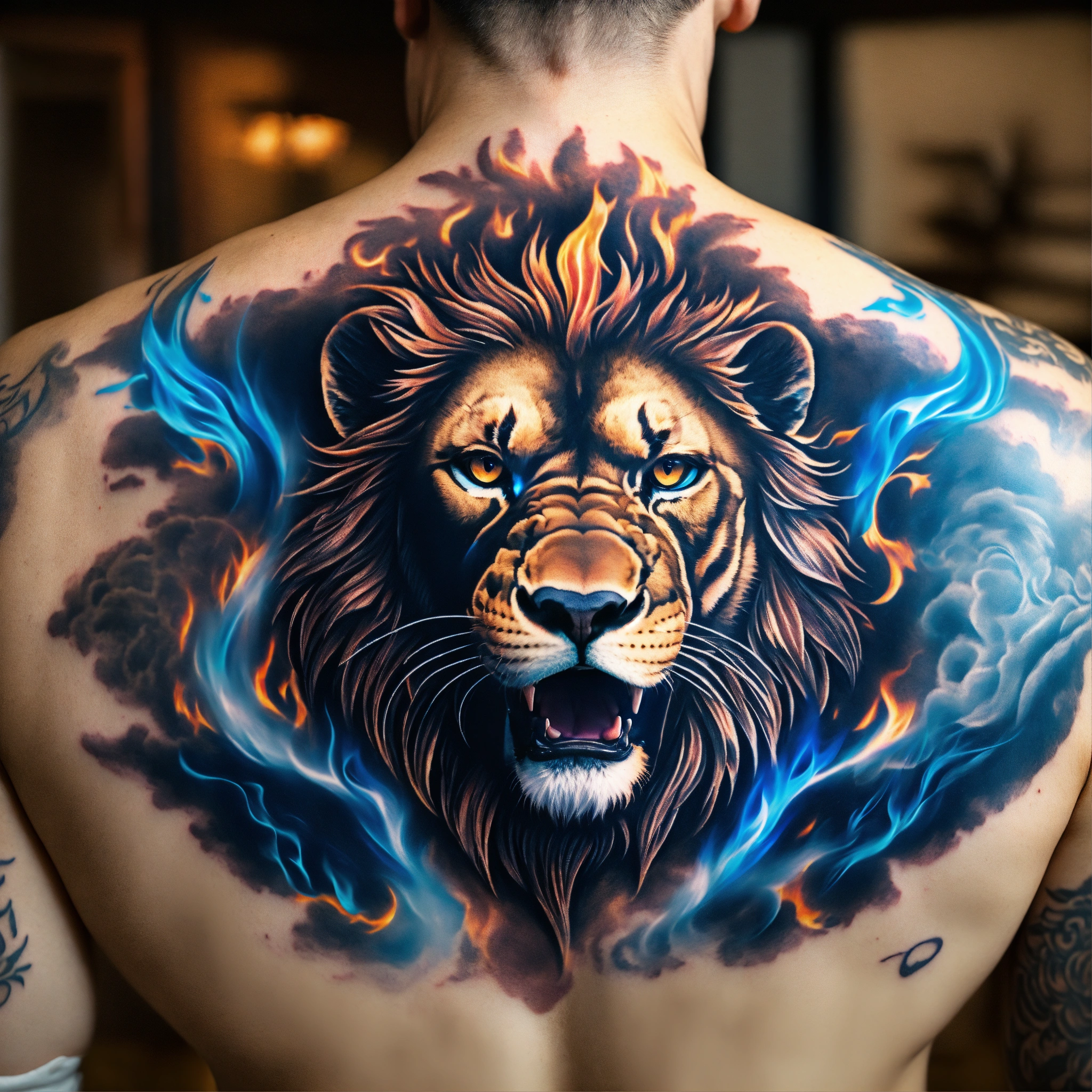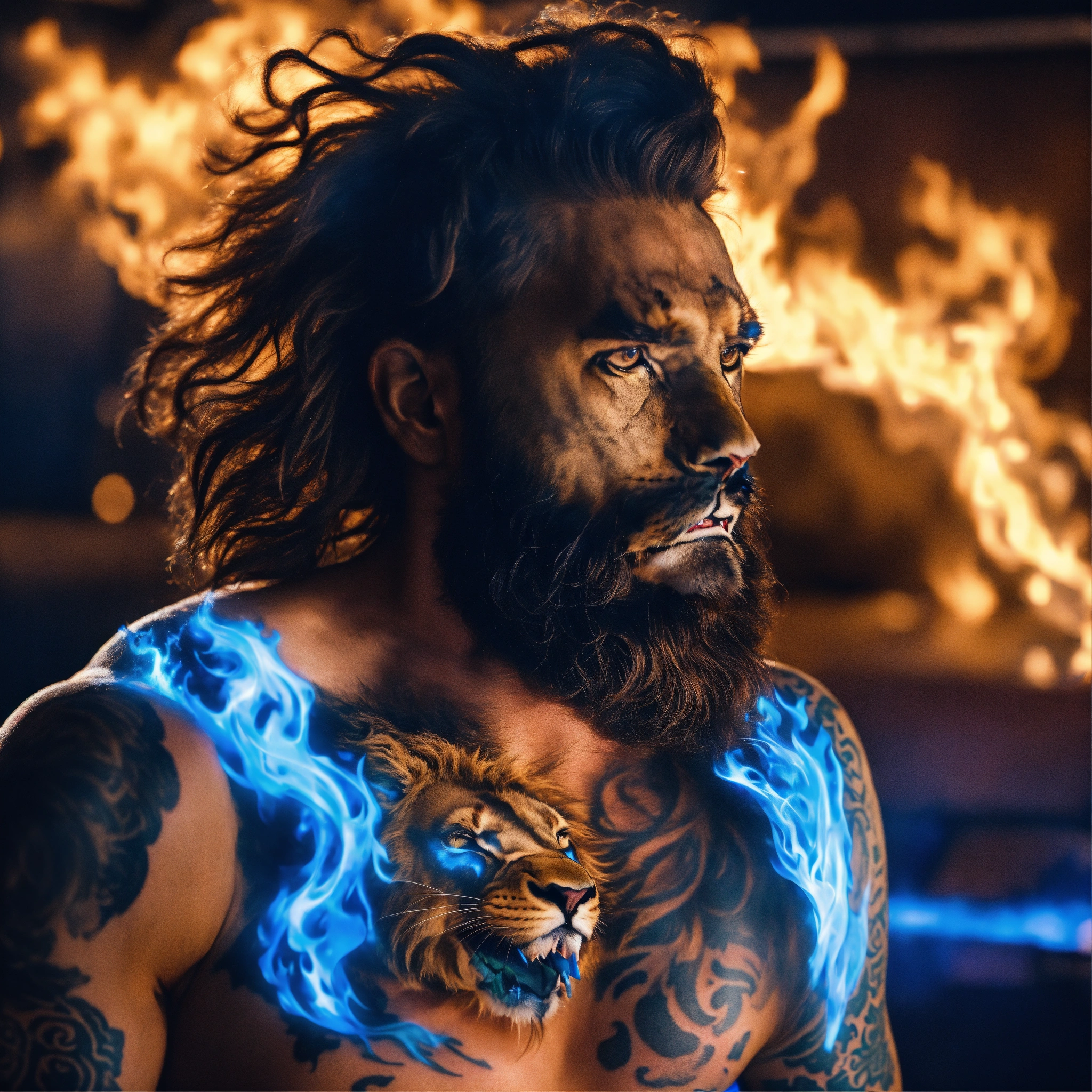 Man on his back with large tattoo of a snarling lion face and blue fire lighting around the tattoo, all in realistic 8k ultra ultra definition