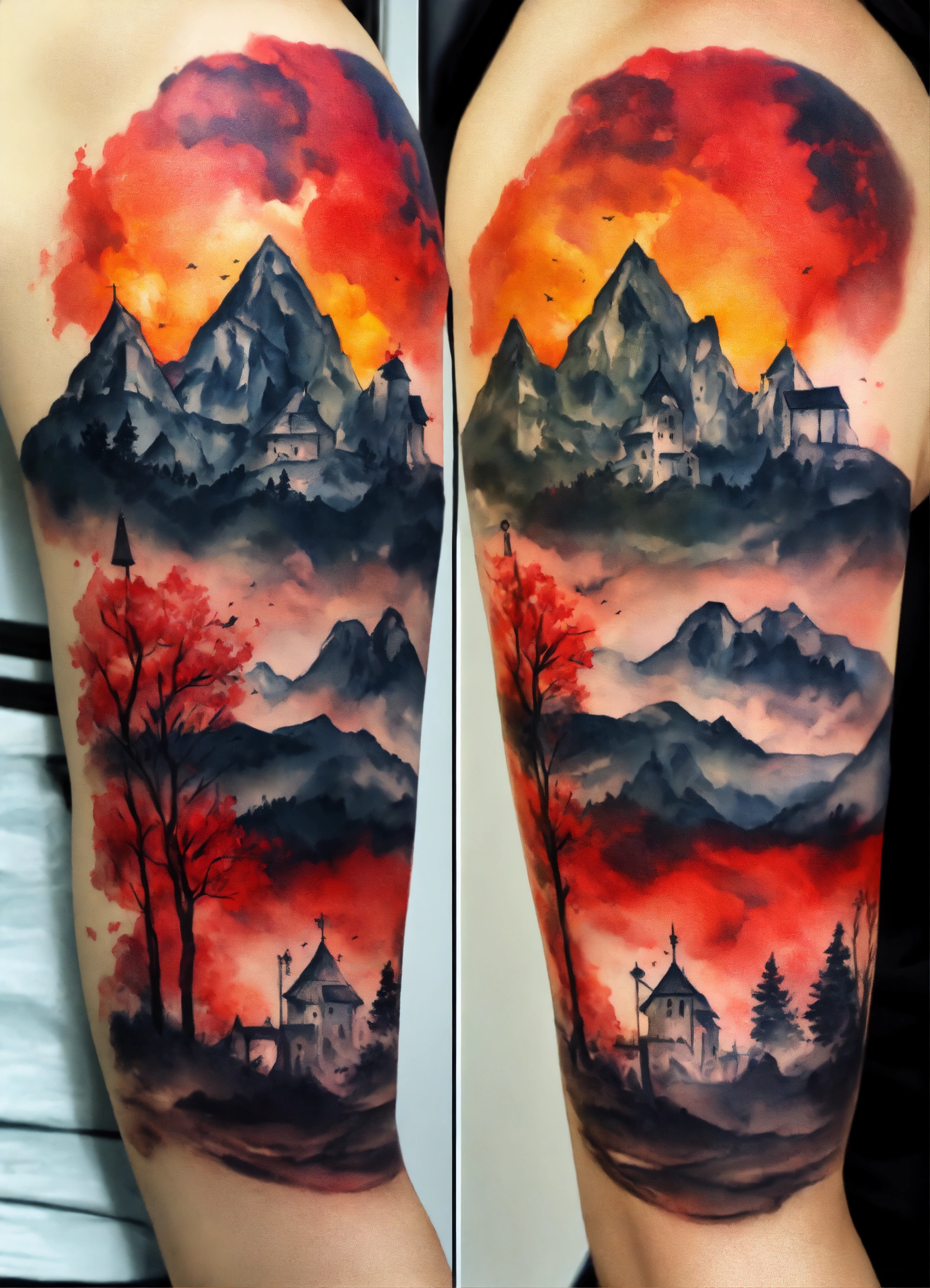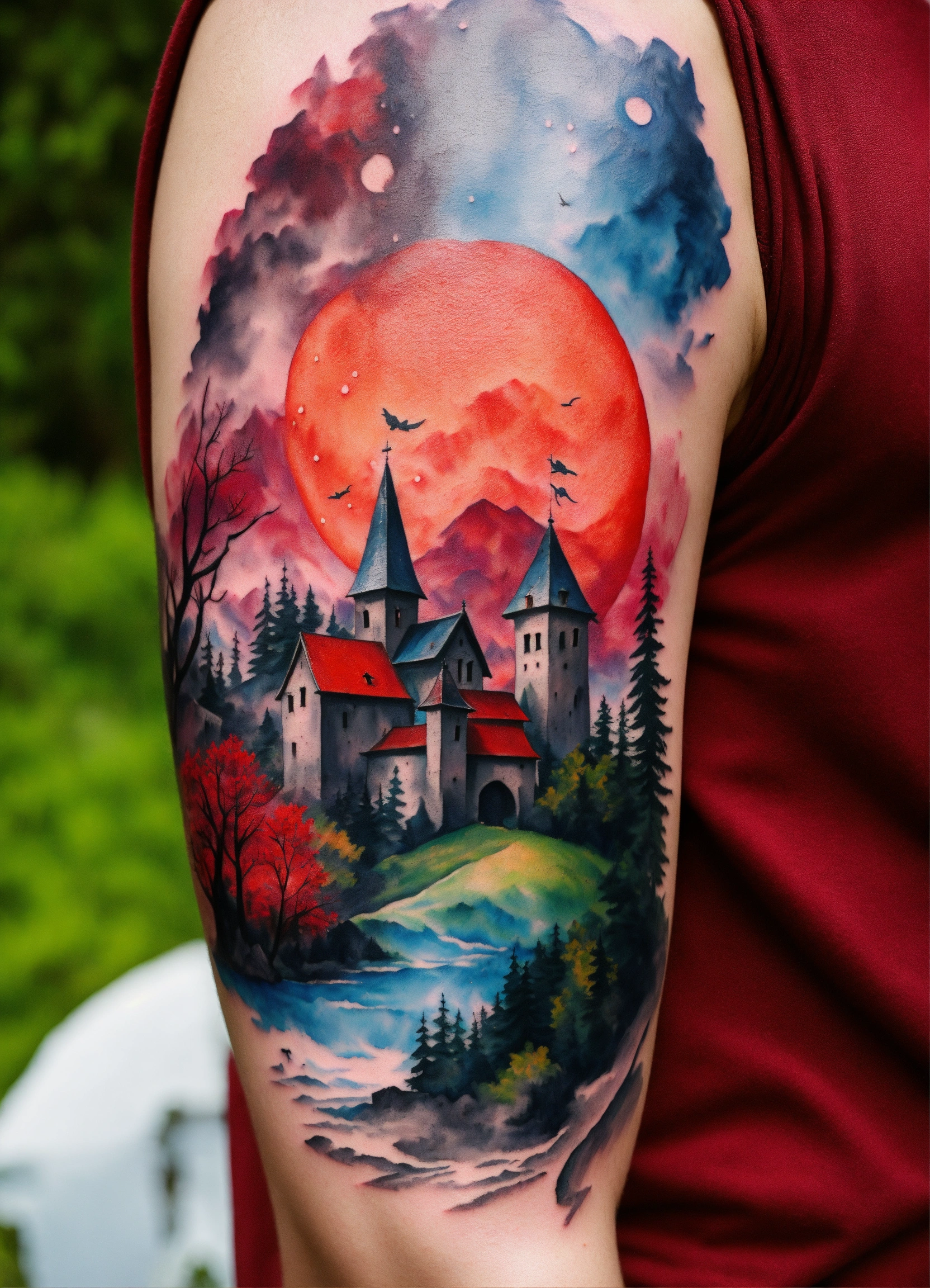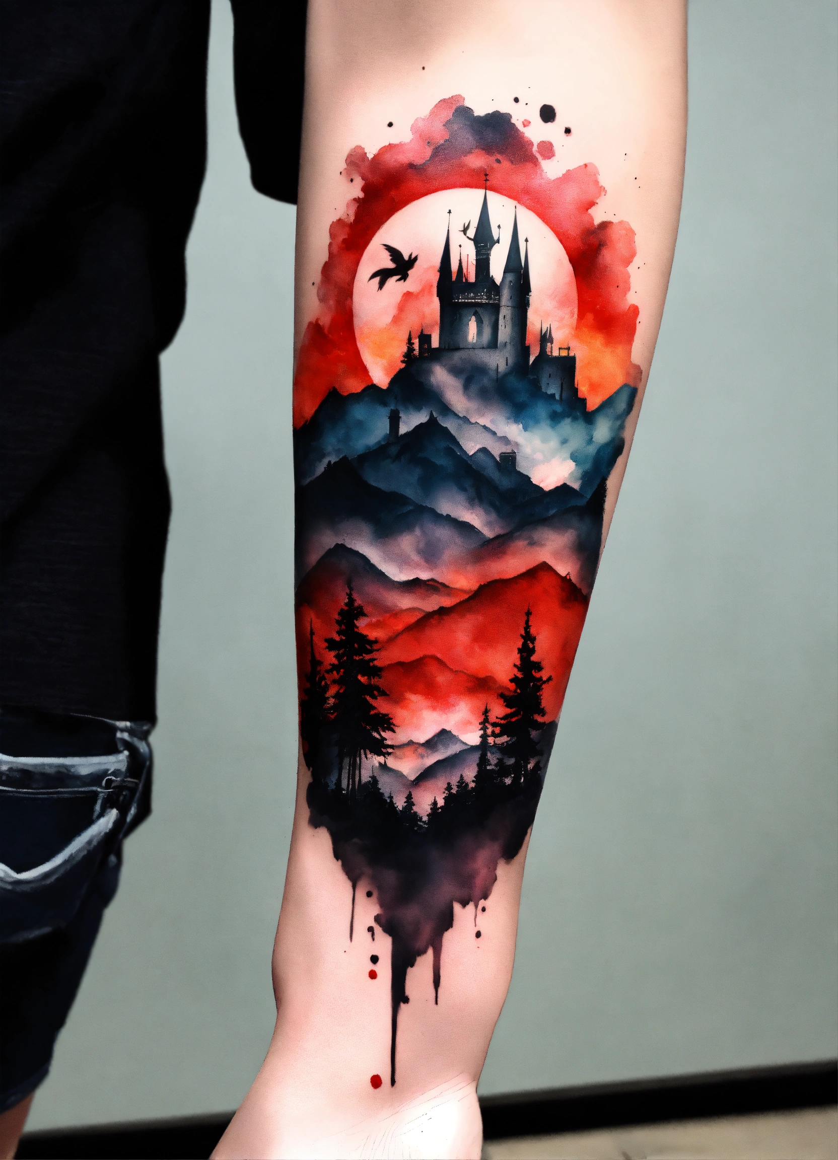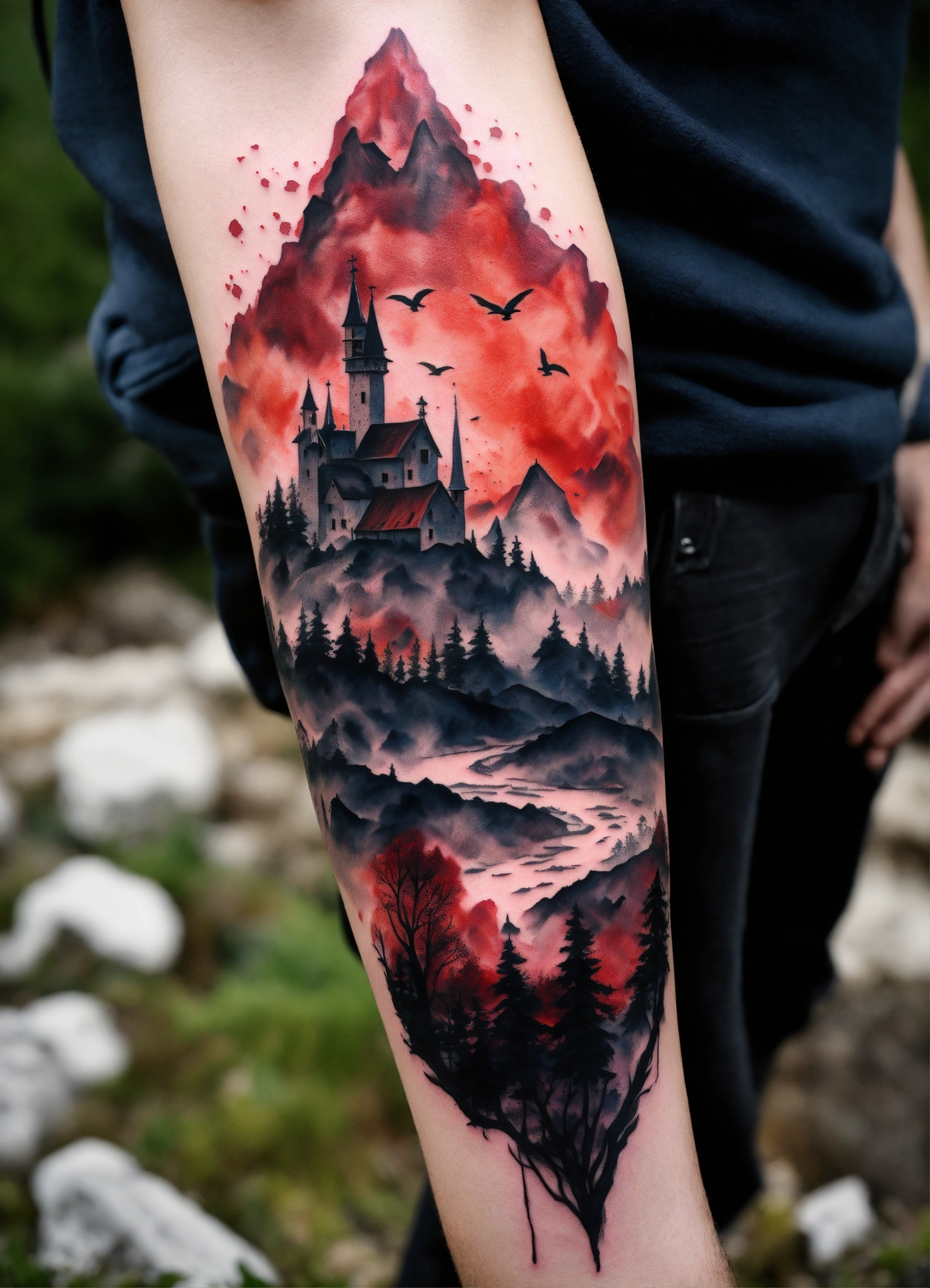 Tatoo estilo acuarela gotico para hombre colores negro y rojo magia, espartano estoico y cuervos, paisaje lejano con montañas y campo de batalla medieval