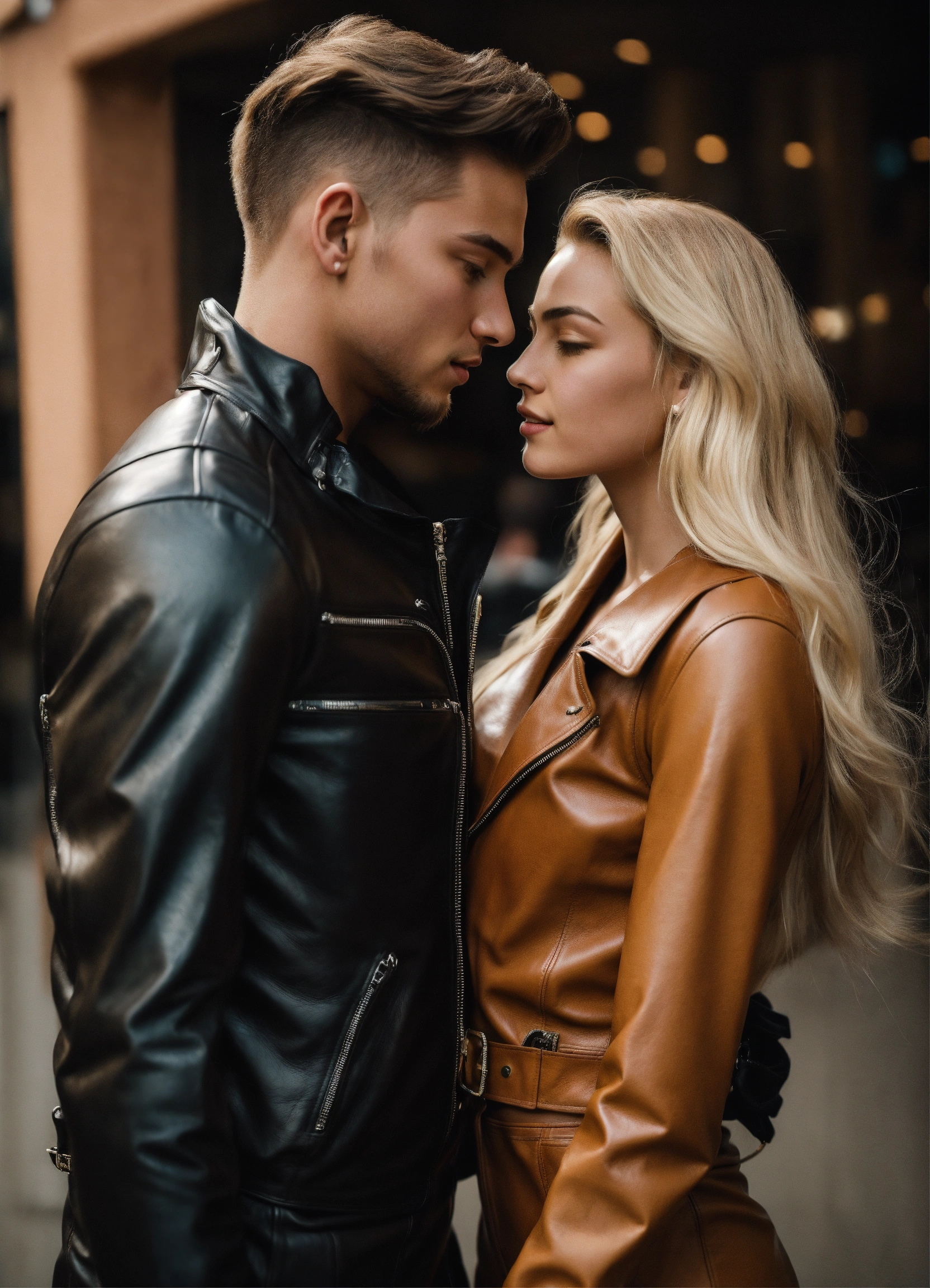Guy, tall athlete, brunette. the girl is very beautiful with gorgeous blonde hair. in leather suits of the future. they look at each other. love. they hug.