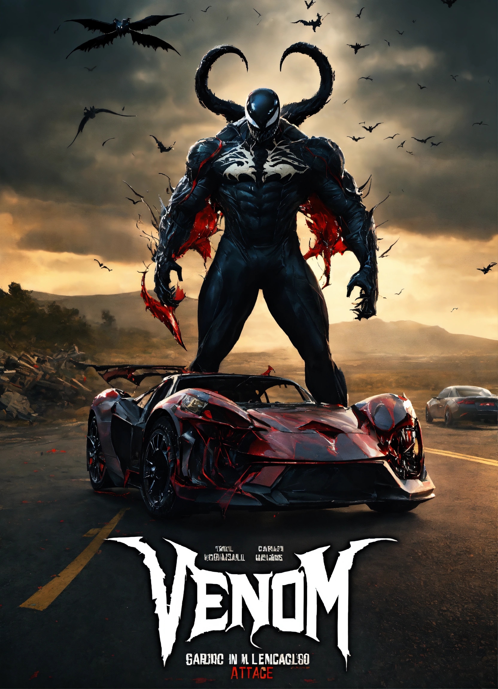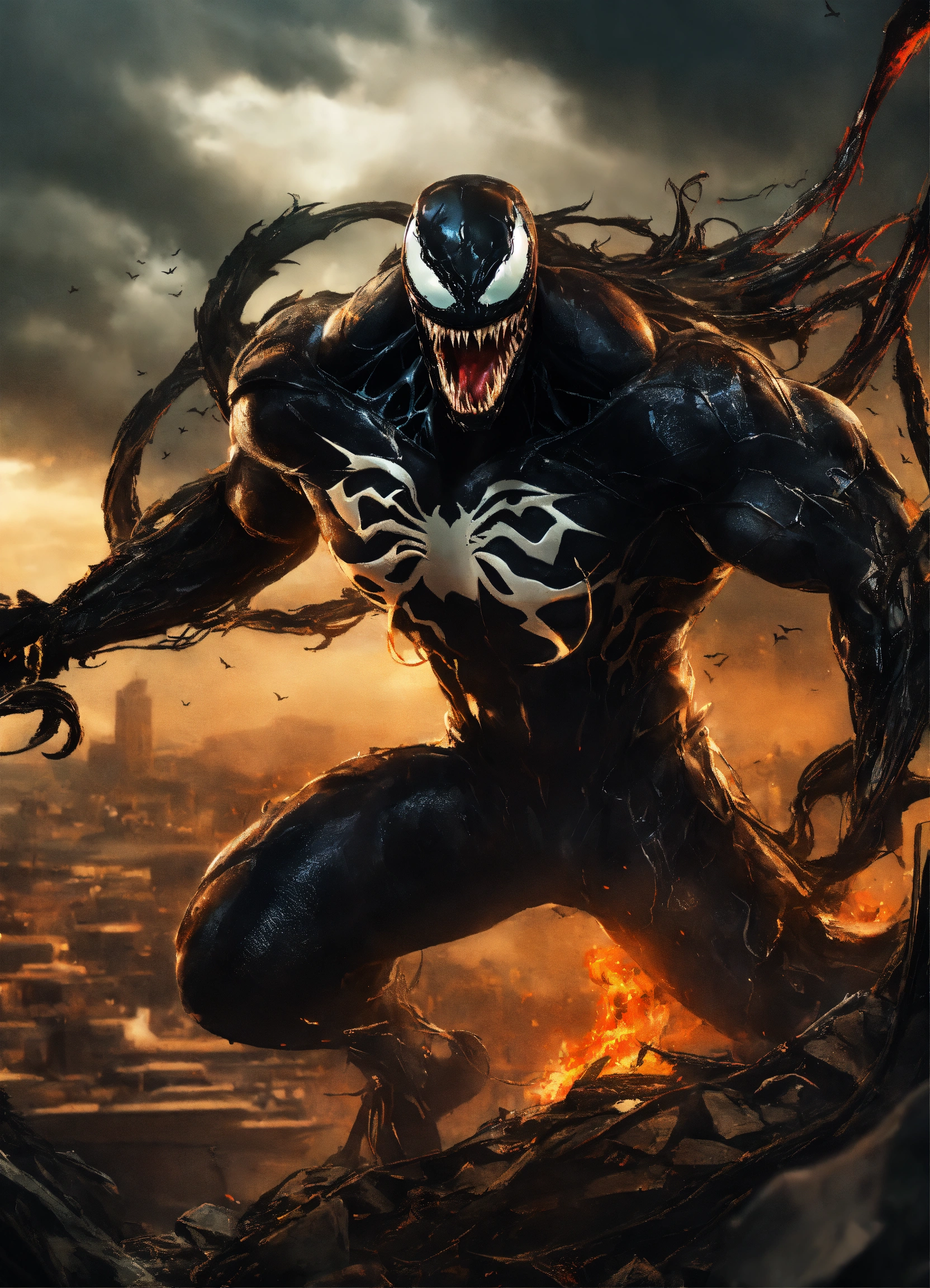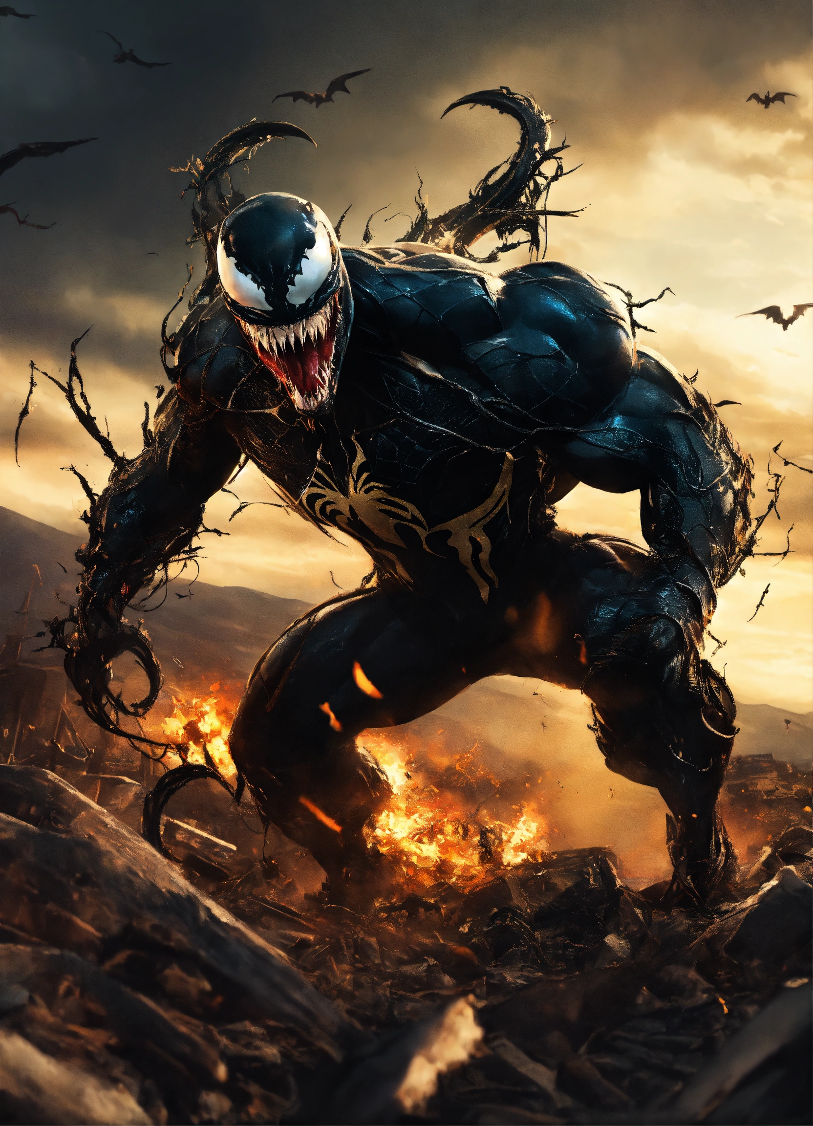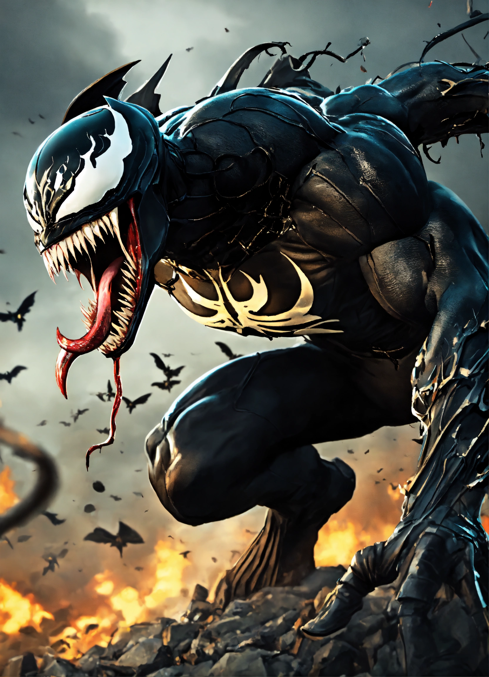 Venom, tipo murciélago con alas, garras afiladas, en posición de ataque, con un paisaje destruido, colmillos, hd 8k