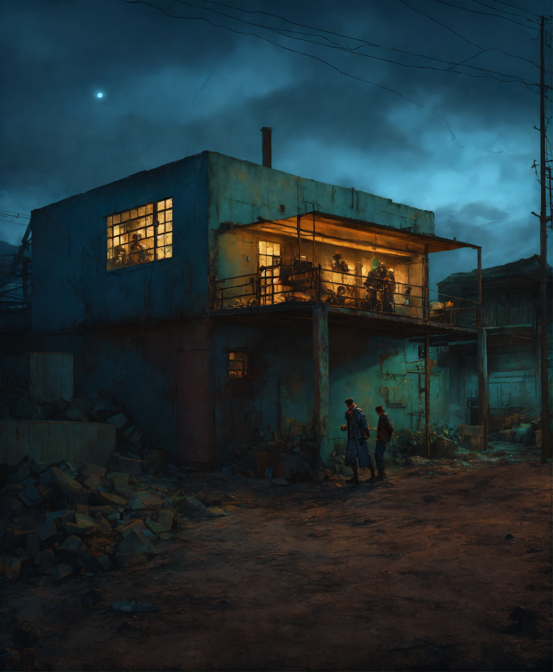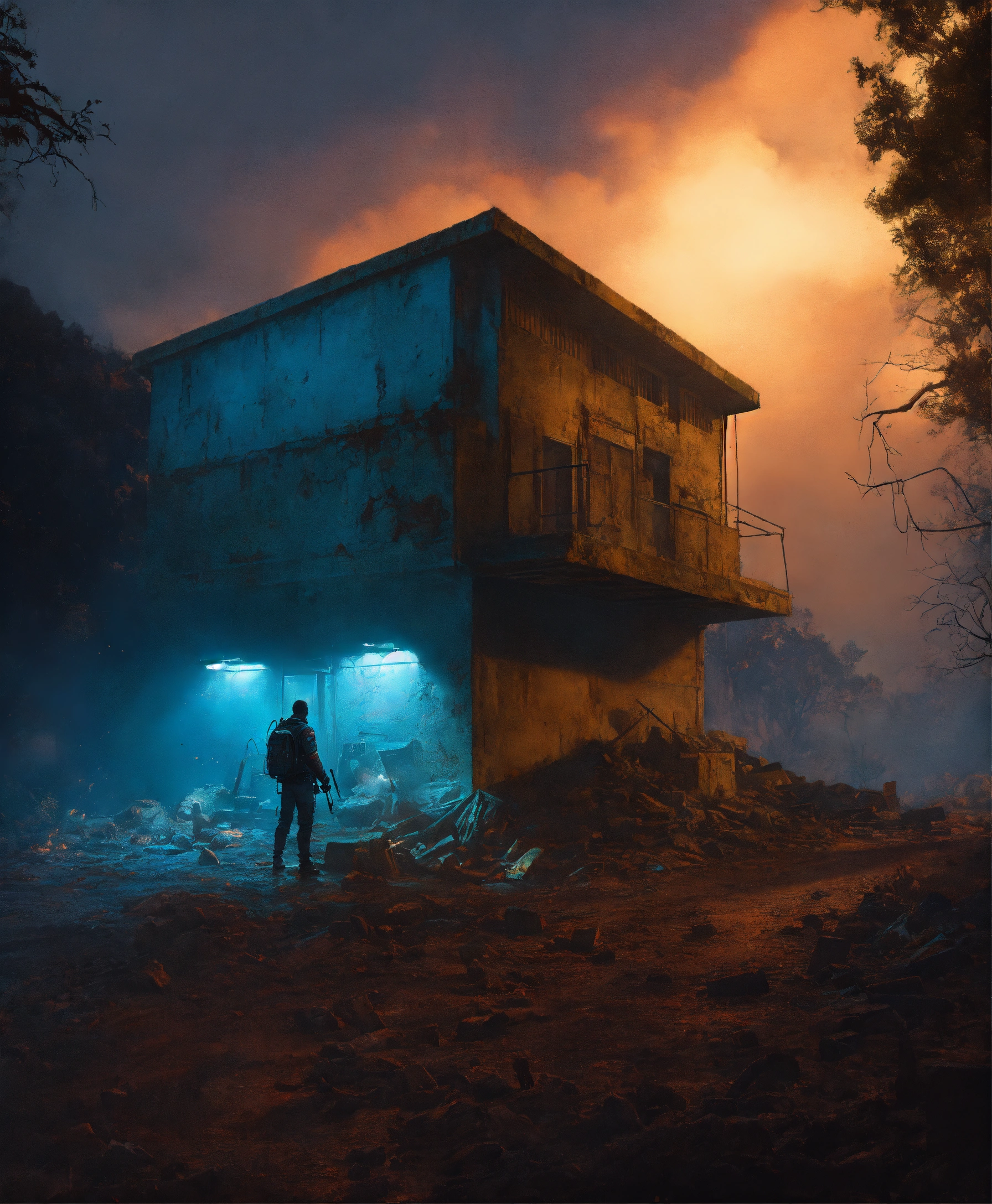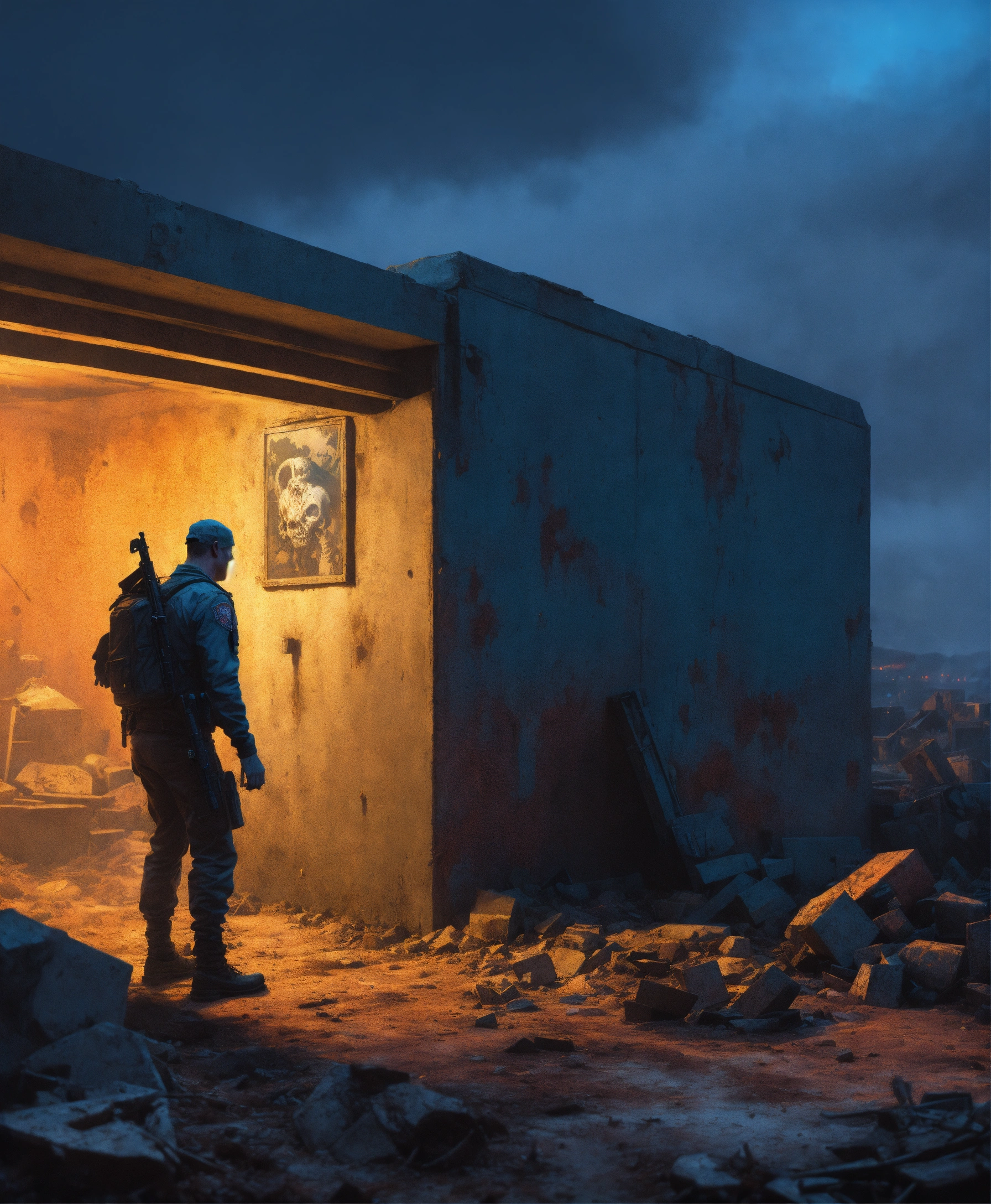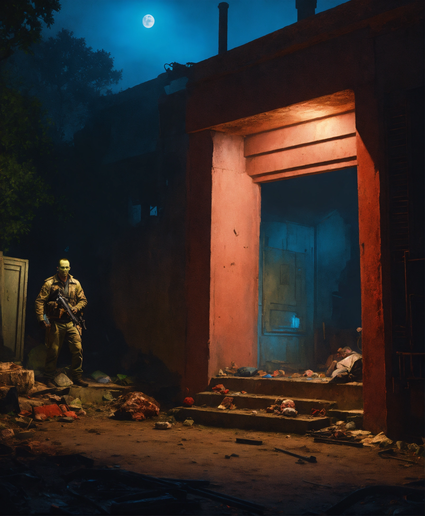 Hyperrealistic photo zombie bunker cinematic, greg rutkowski, james gurney, mignola, craig mullins, brom, night, blue shades color