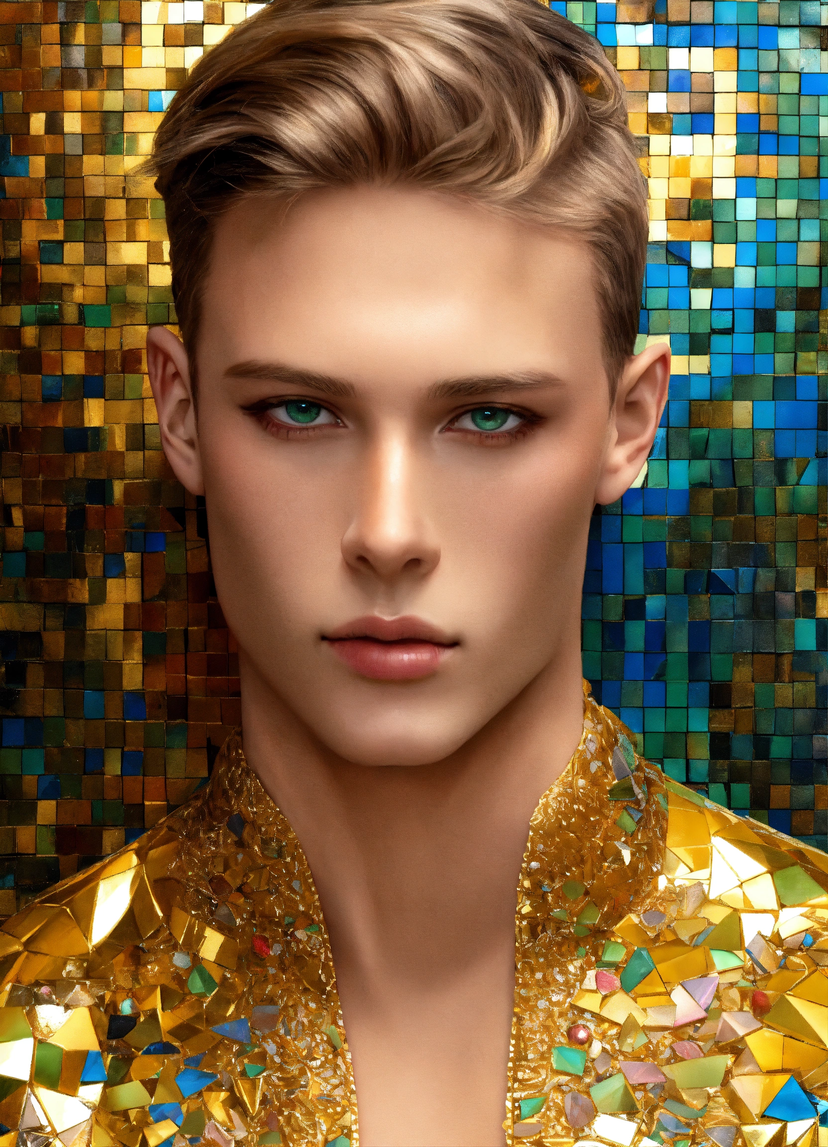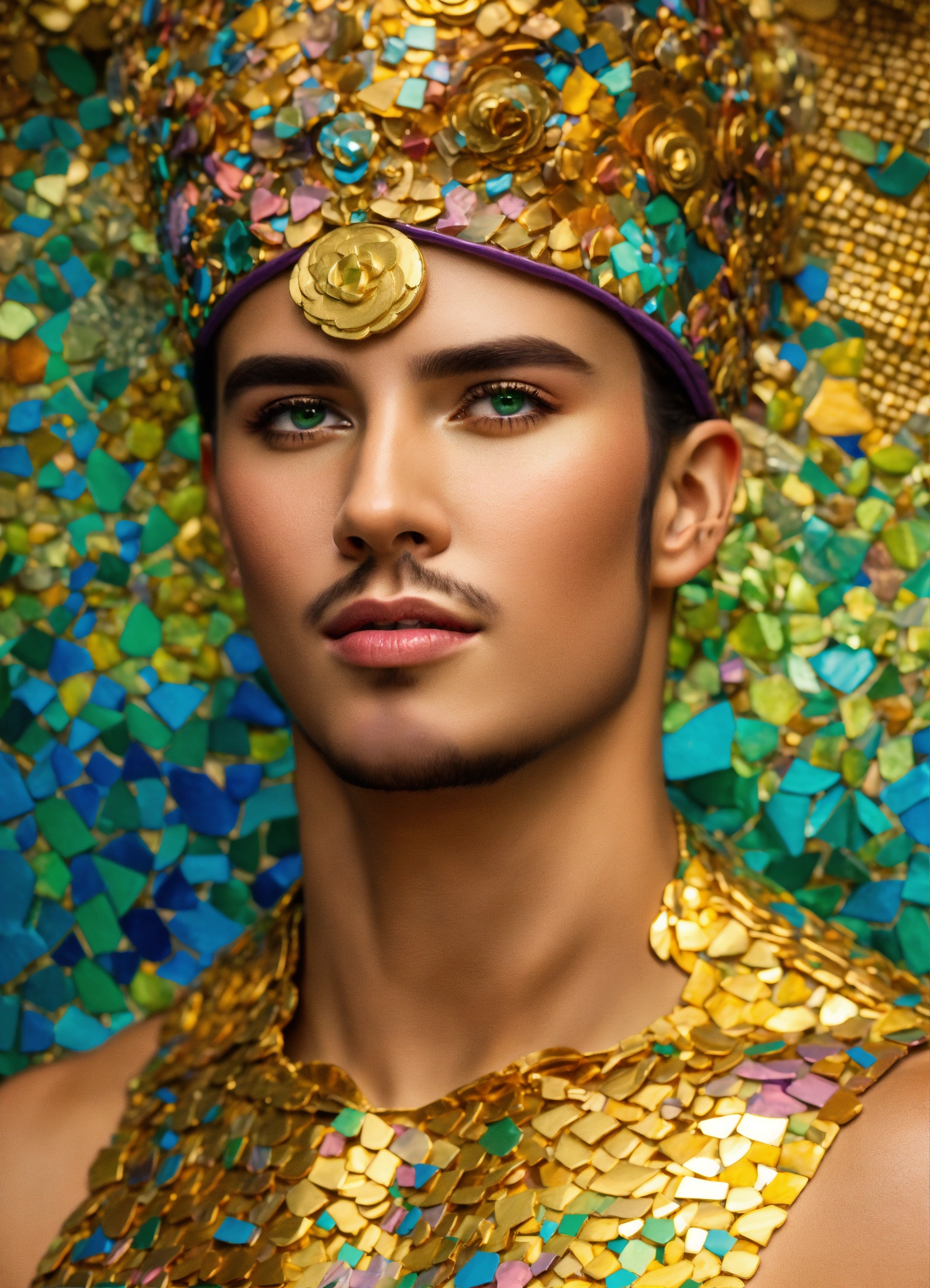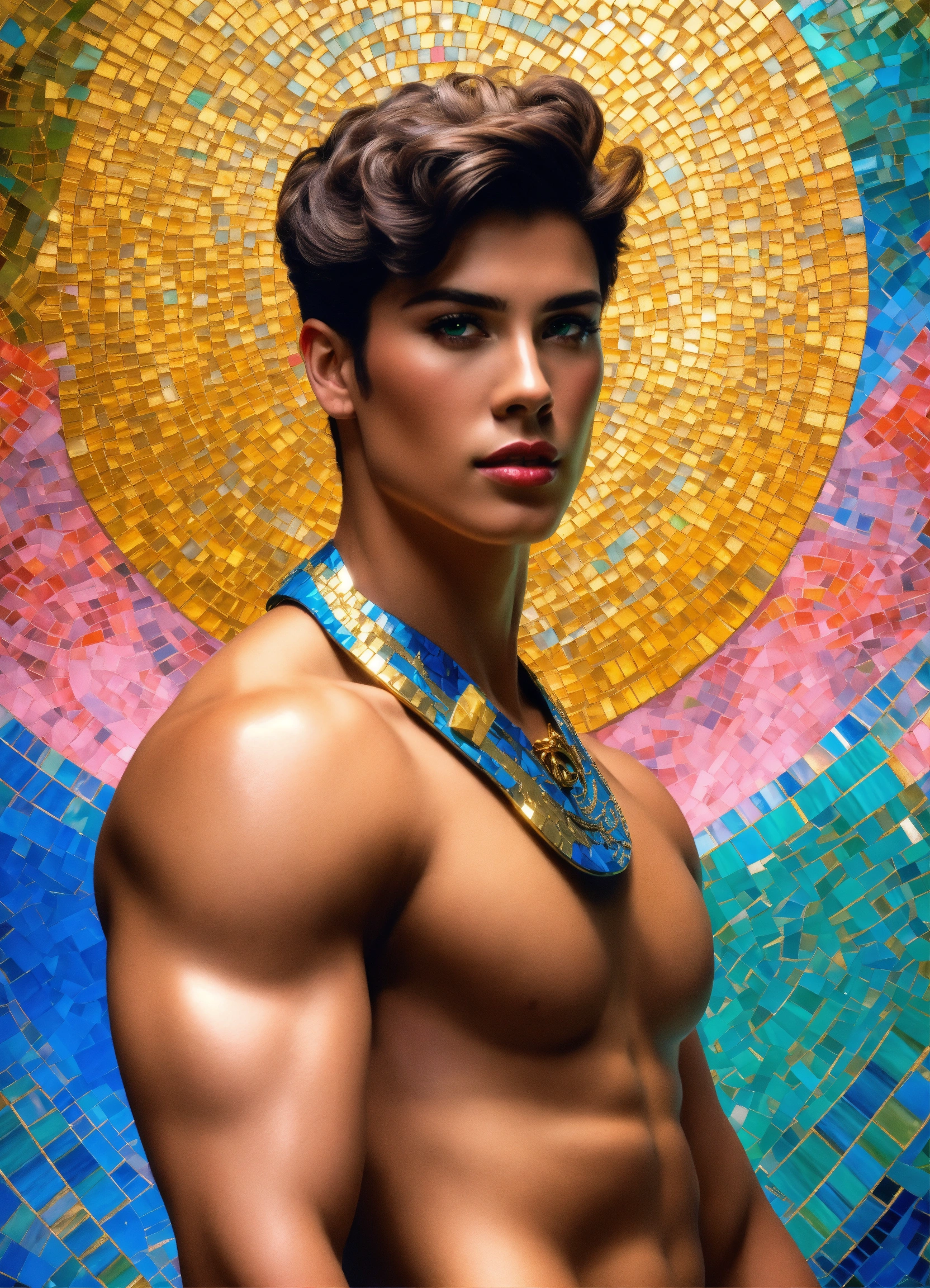 Handsome photogenic attractive male muscle model painted in gustav klimt style glamorous beautiful colourful dreamy awesome elegant elaborate complex detailed awesome gold blue pink green orange peridot lilac yellow magenta cyan gold silver copper fabulous 8k intricate brush work vivid bright vibrant colors 3d gold trim metallic 24k gold filigree background mosaic awesome rich haute couture sheen 8k glamorous filigree mosaic pearlized amazing elegant elaborate couture elaborate hair style contrast frosty brushed matte luminous gold yellow background vibrant pink silver green 8k 24k gold trim gold background asymetrical face awesome superb 8k sheen 3d klimt vibrant colors superb 24k gold highlights 8k mosaic pearlized gold background 3d bright colors gold trim awesome beautiful opulent elegant bold vivid colors 8k in focus, gustav klint style
