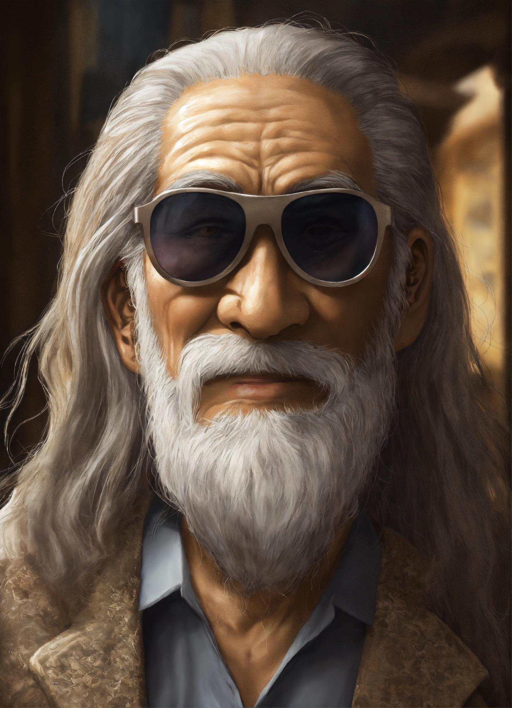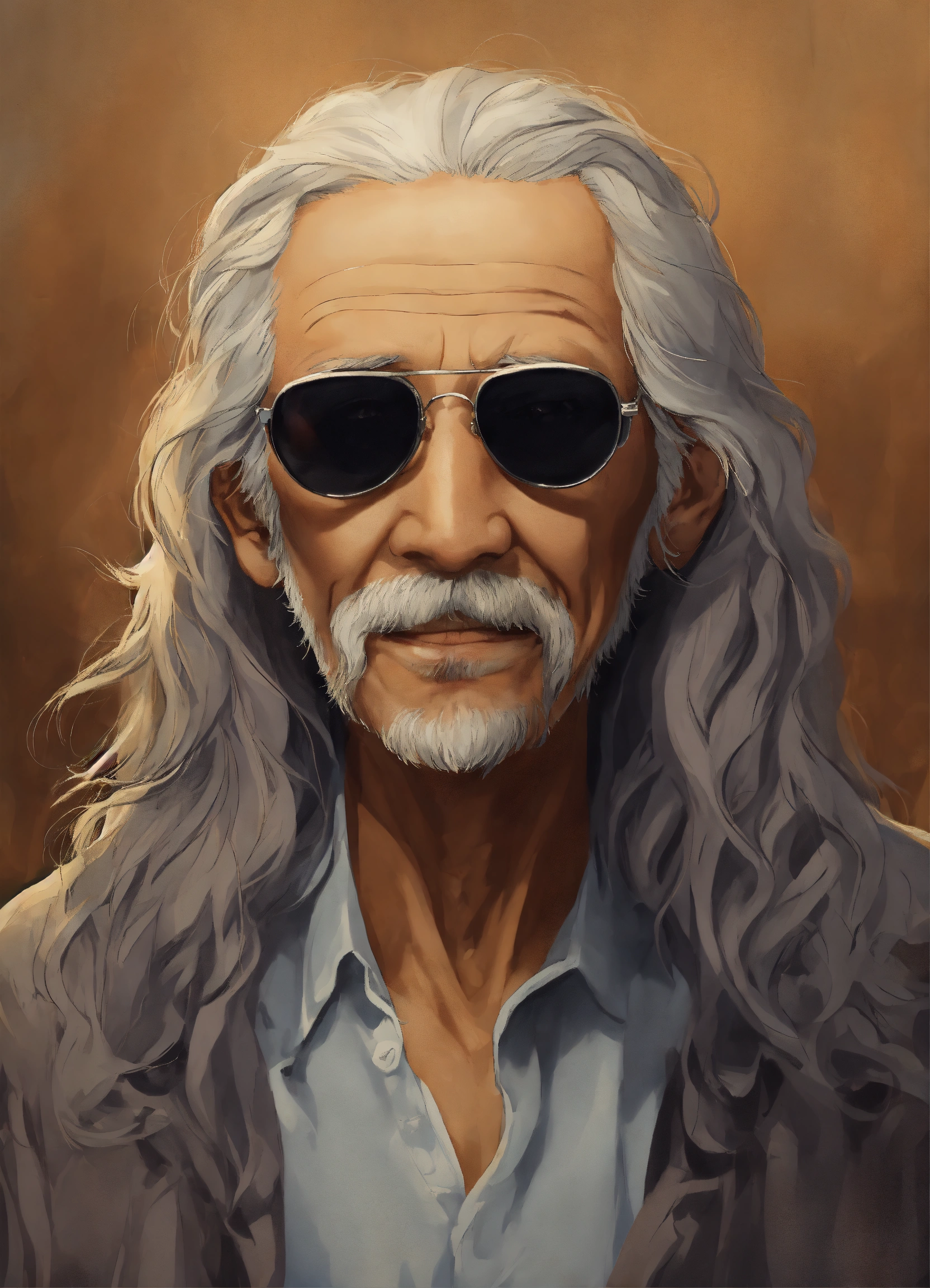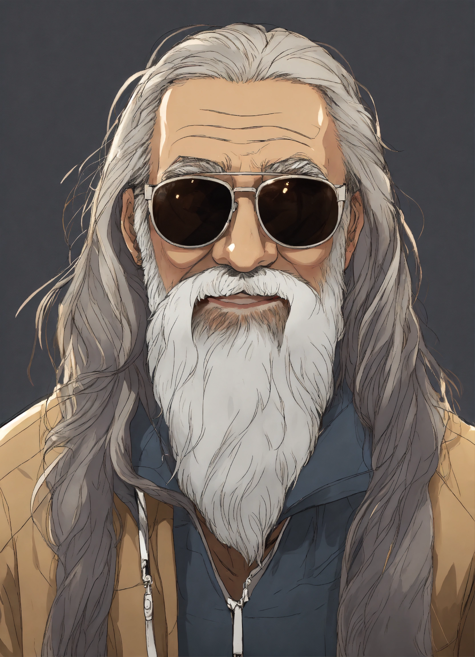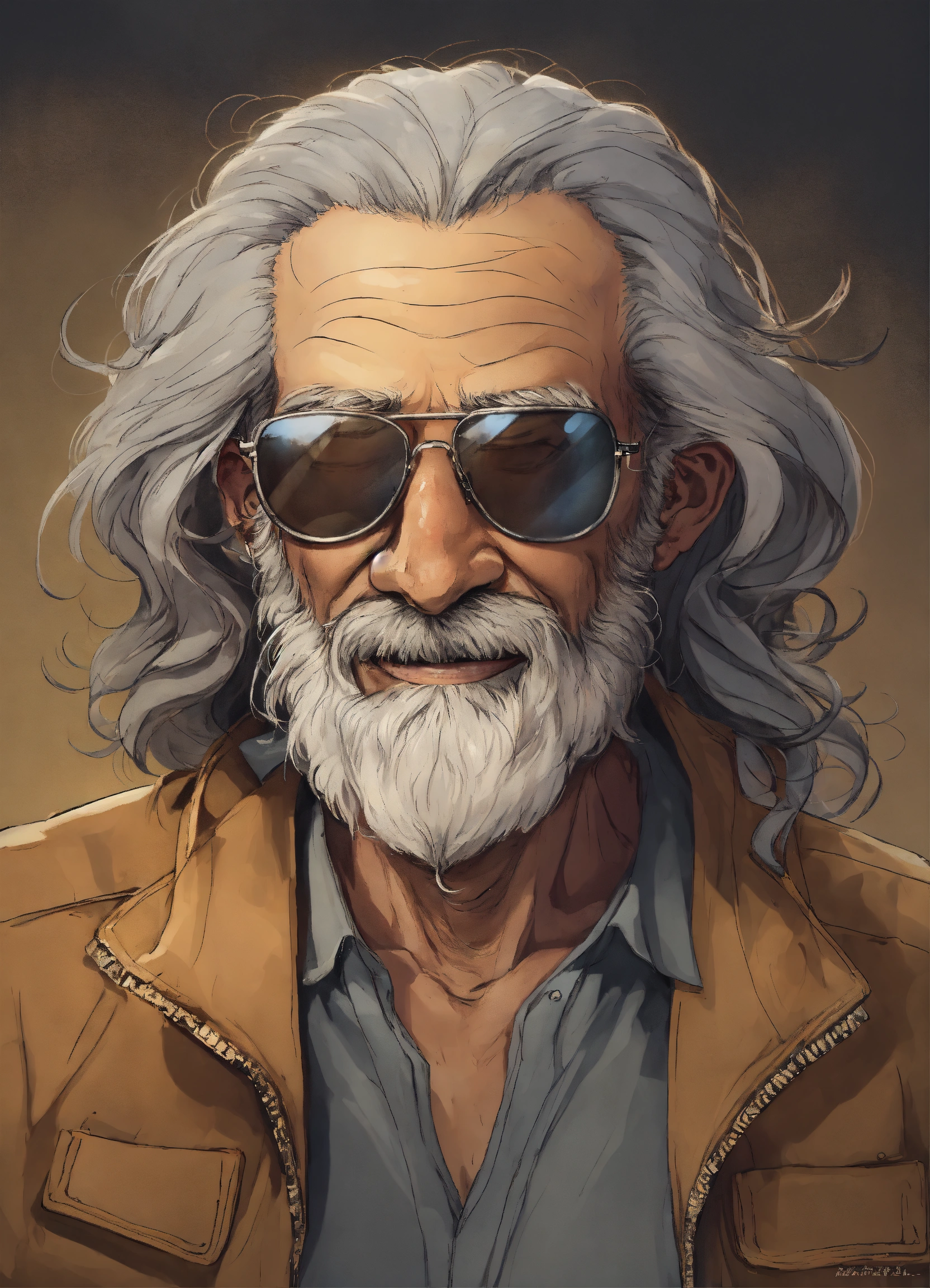 Cartoon an old man with long hair is wearing sunglasses, in the style of sherry akrami, teethcore, untrained, dark silver and light brown, sliman mansour, shinji aramaki, grandparentcore --ar 169