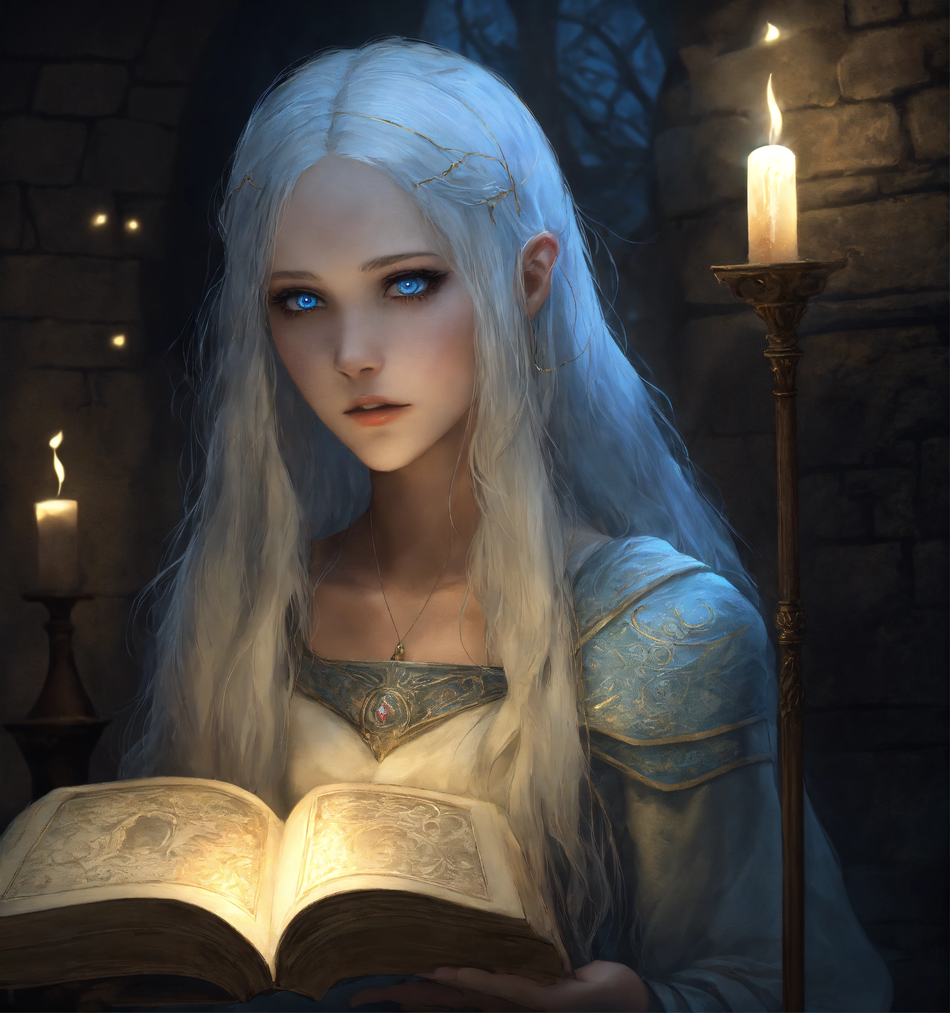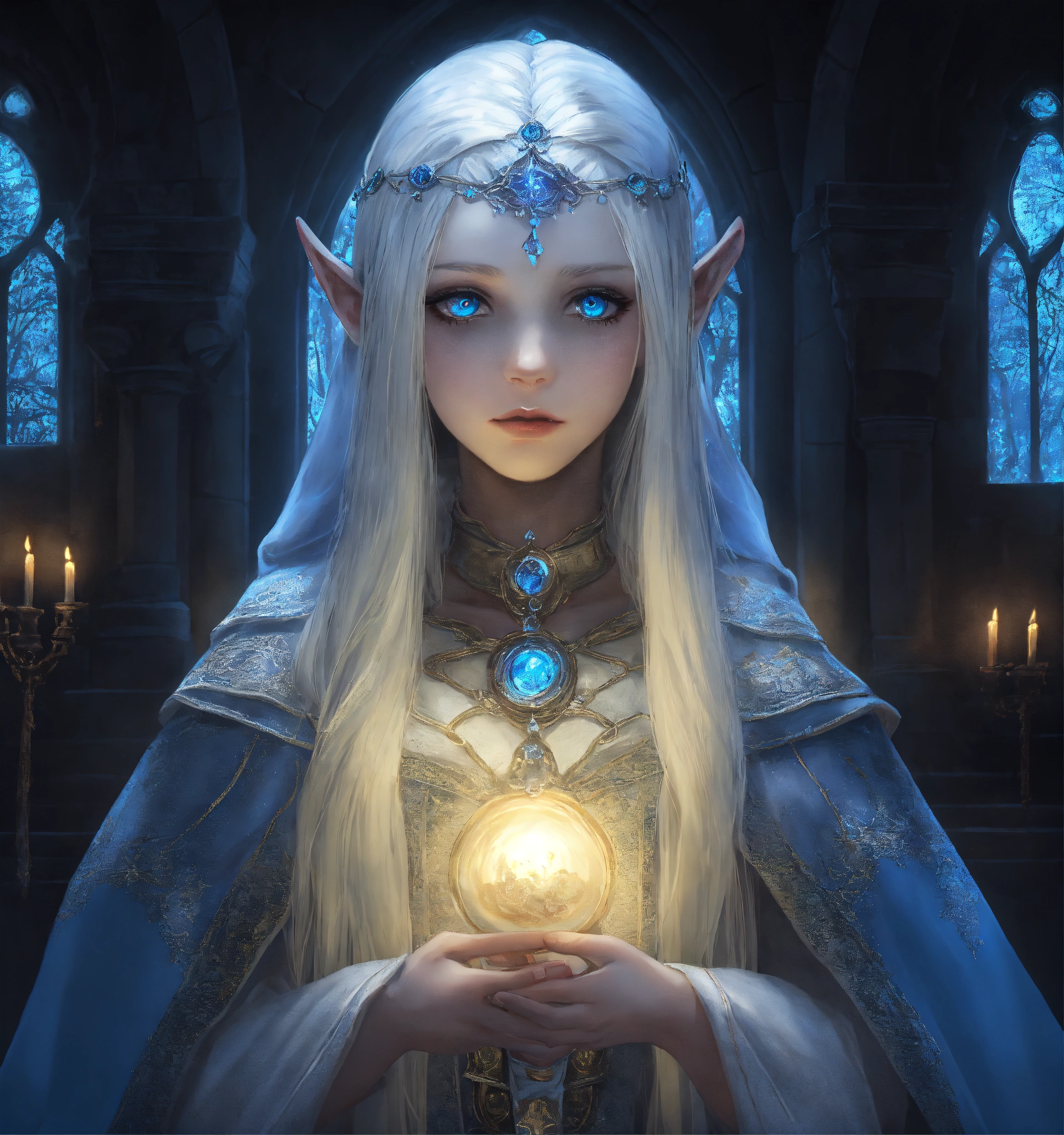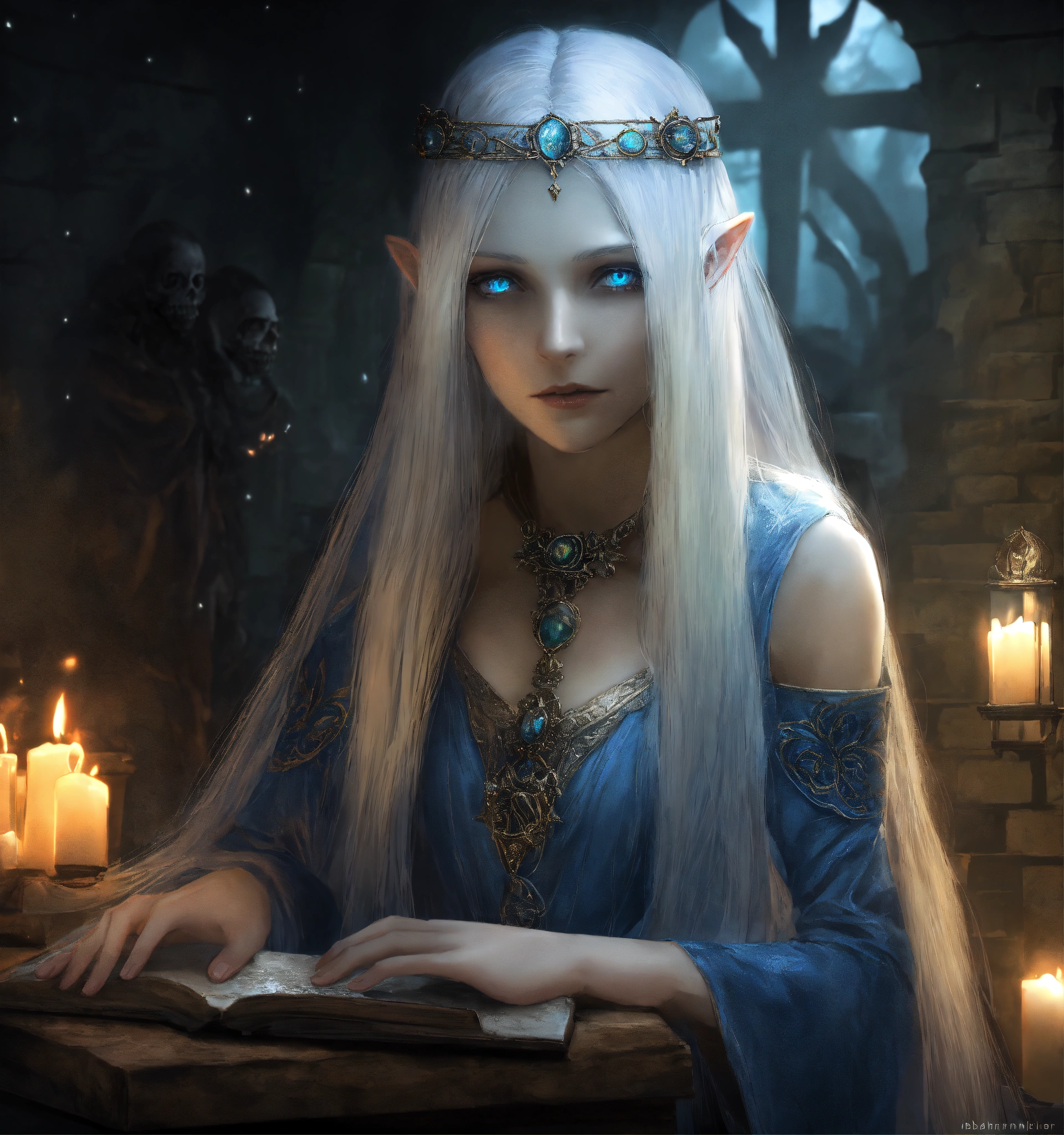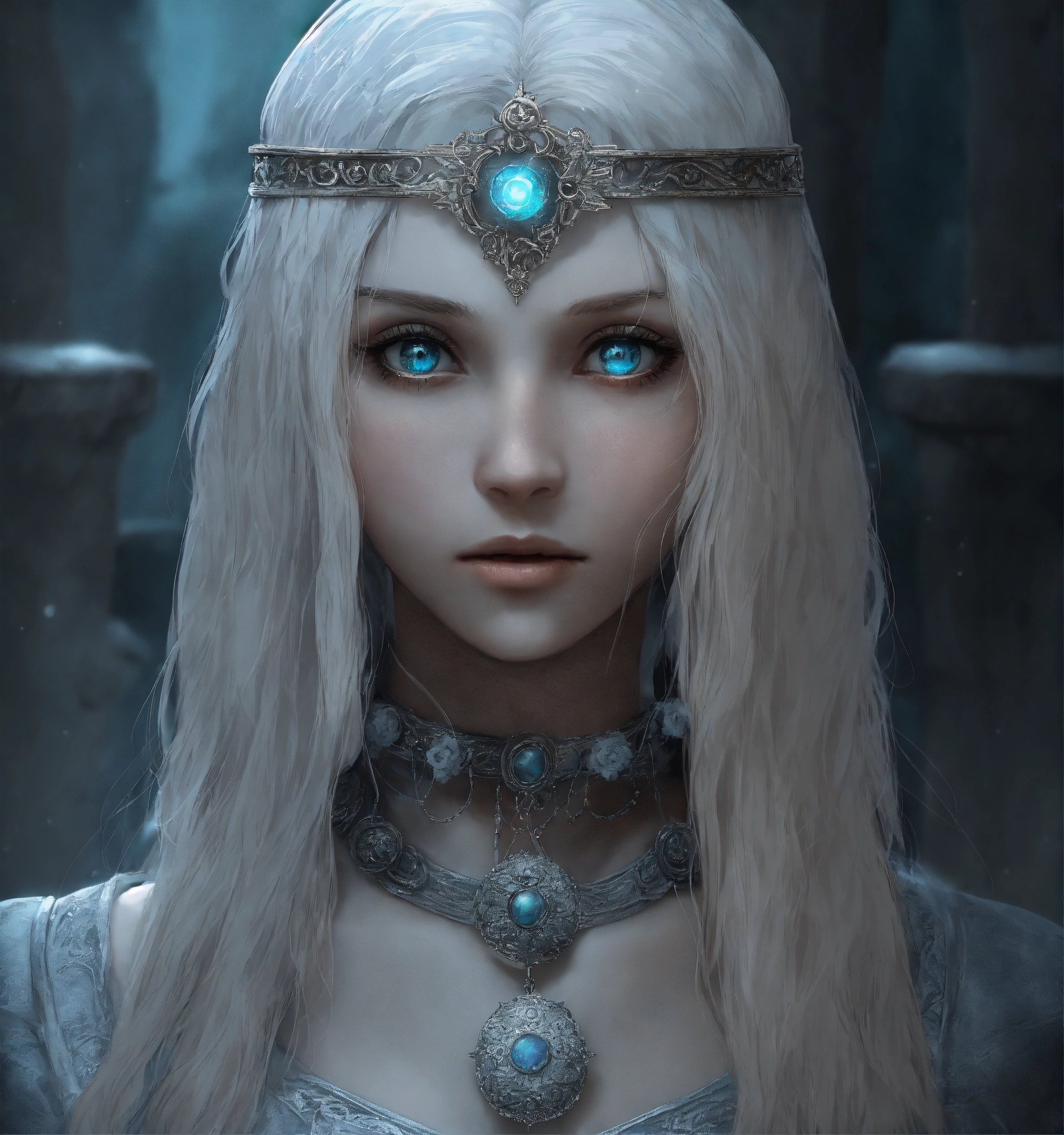 Female twelve year old child necromancer, sehr kindhaft, deadly pale, long silverwhite hair, very flat belly, extremely skinny, extremely slim body, very narrow face, alabaster skin, pale as a corpse, glowing blue eyes, innocent looking, in a gloomy crypt, kindlich, innocent, childlike, graceful, wispy, glowing blue eyes, ghostly, dead, undead, mysterious, dark, cold ambient lighting, extremely detailed, fantasy, medieval setting