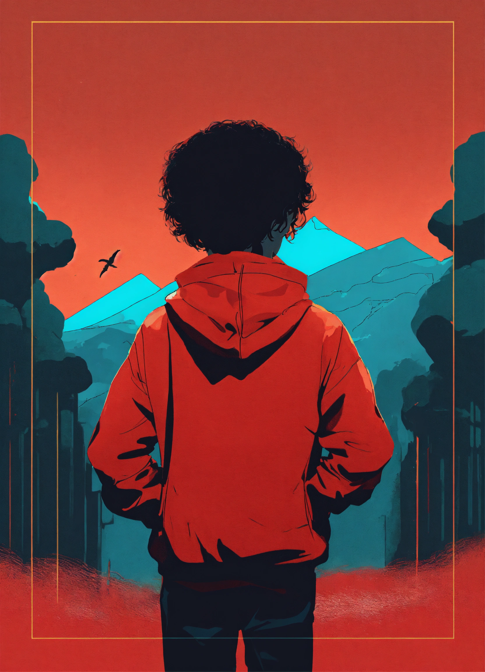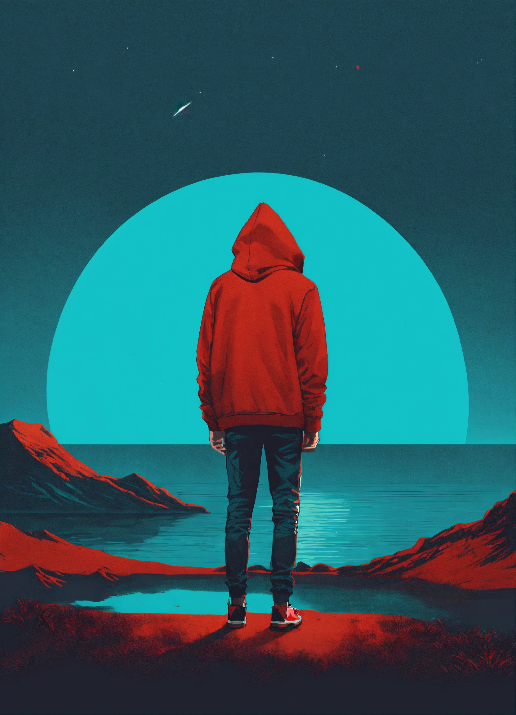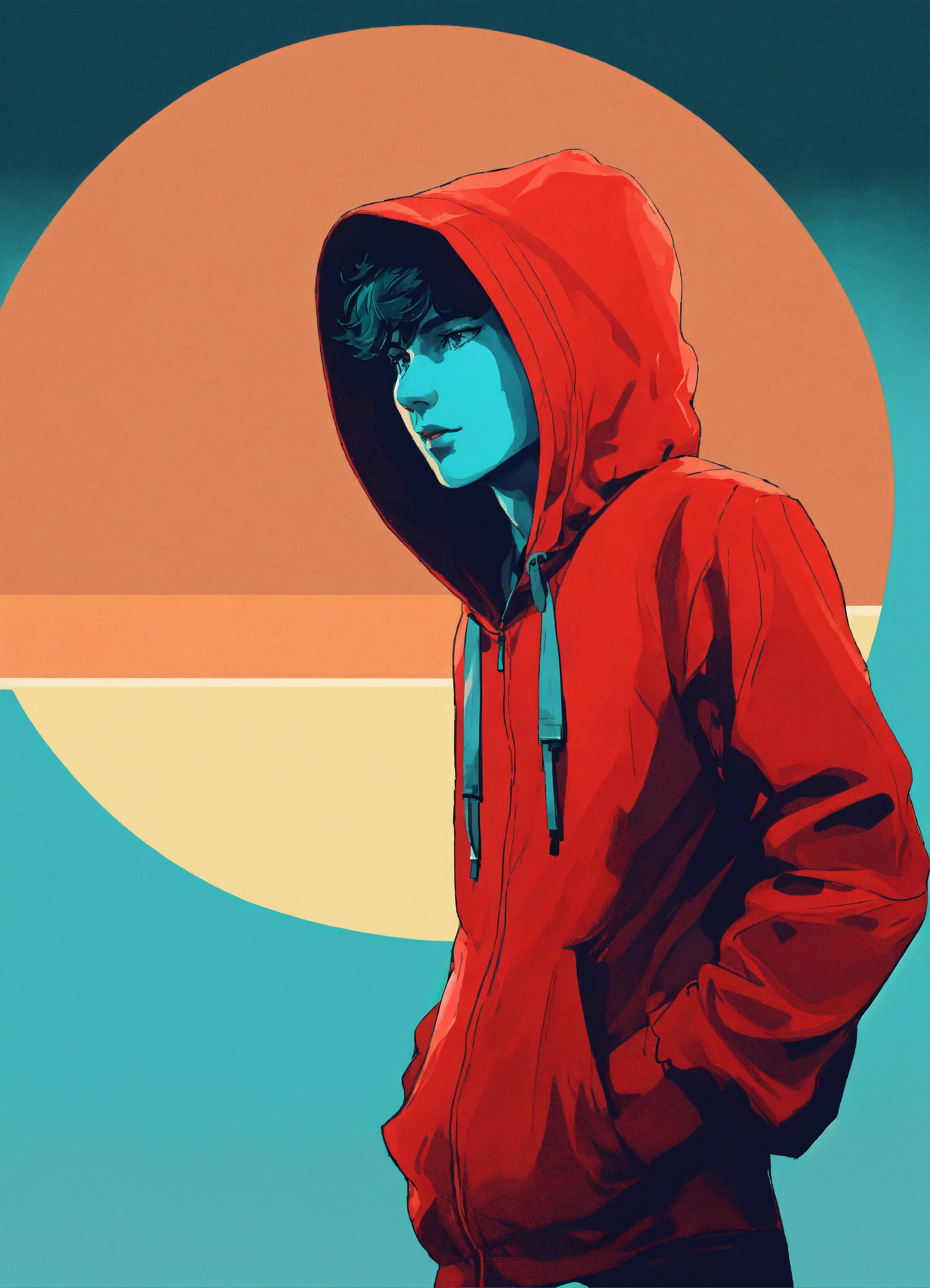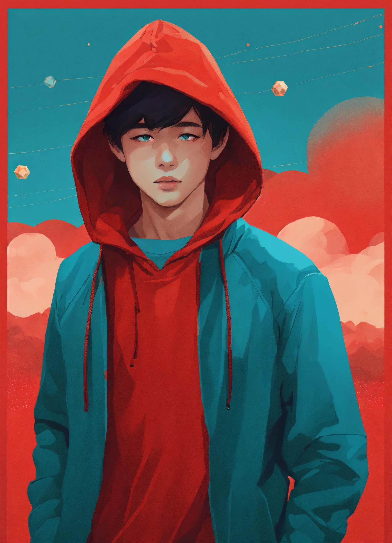 Illustration of a boy in red hoodie, minimalist, graphic design poster art, dark cyan and sky blue, honeycore