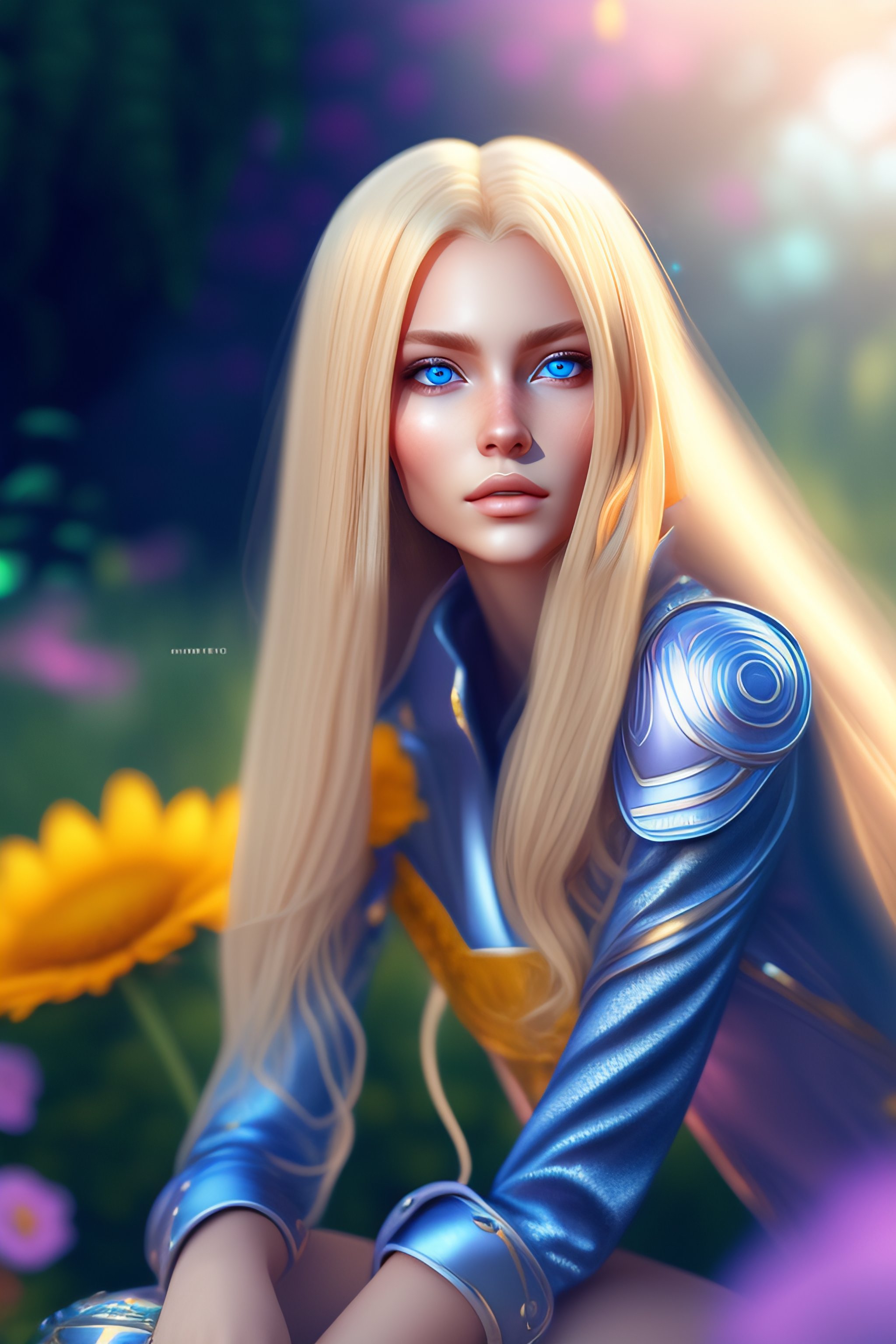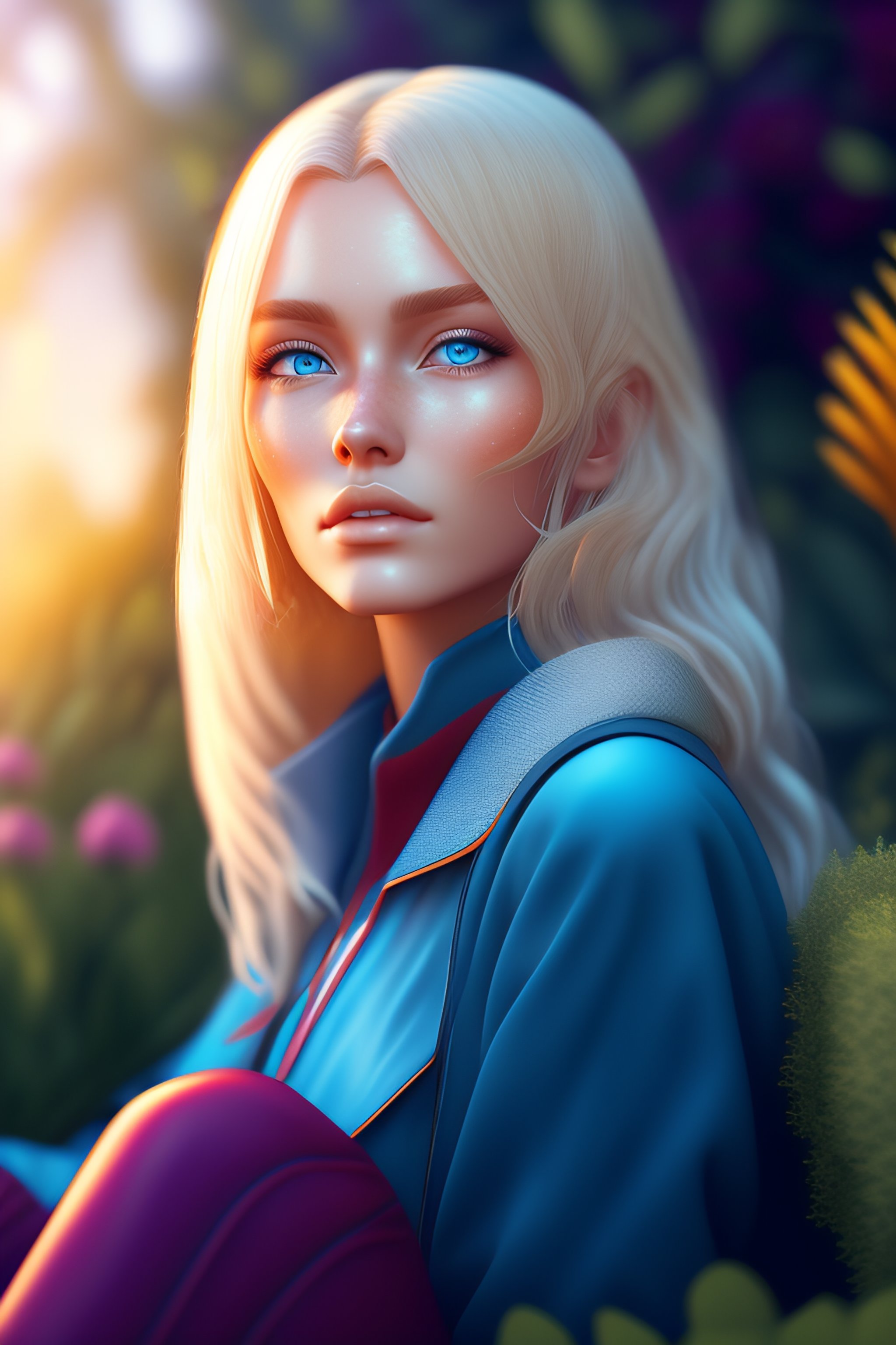 Blonde blue eyes alien girl sitting in the garden