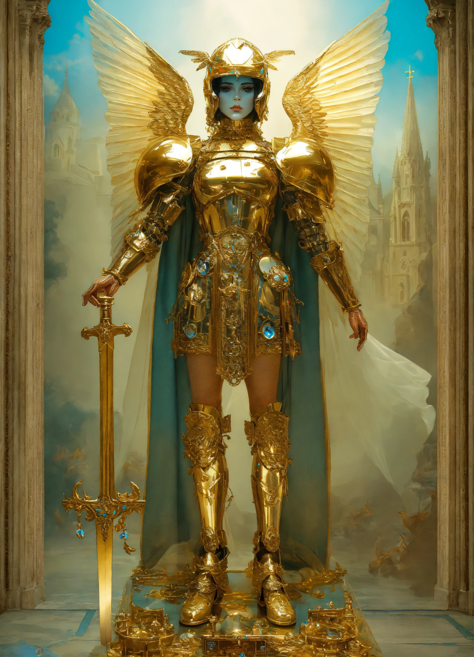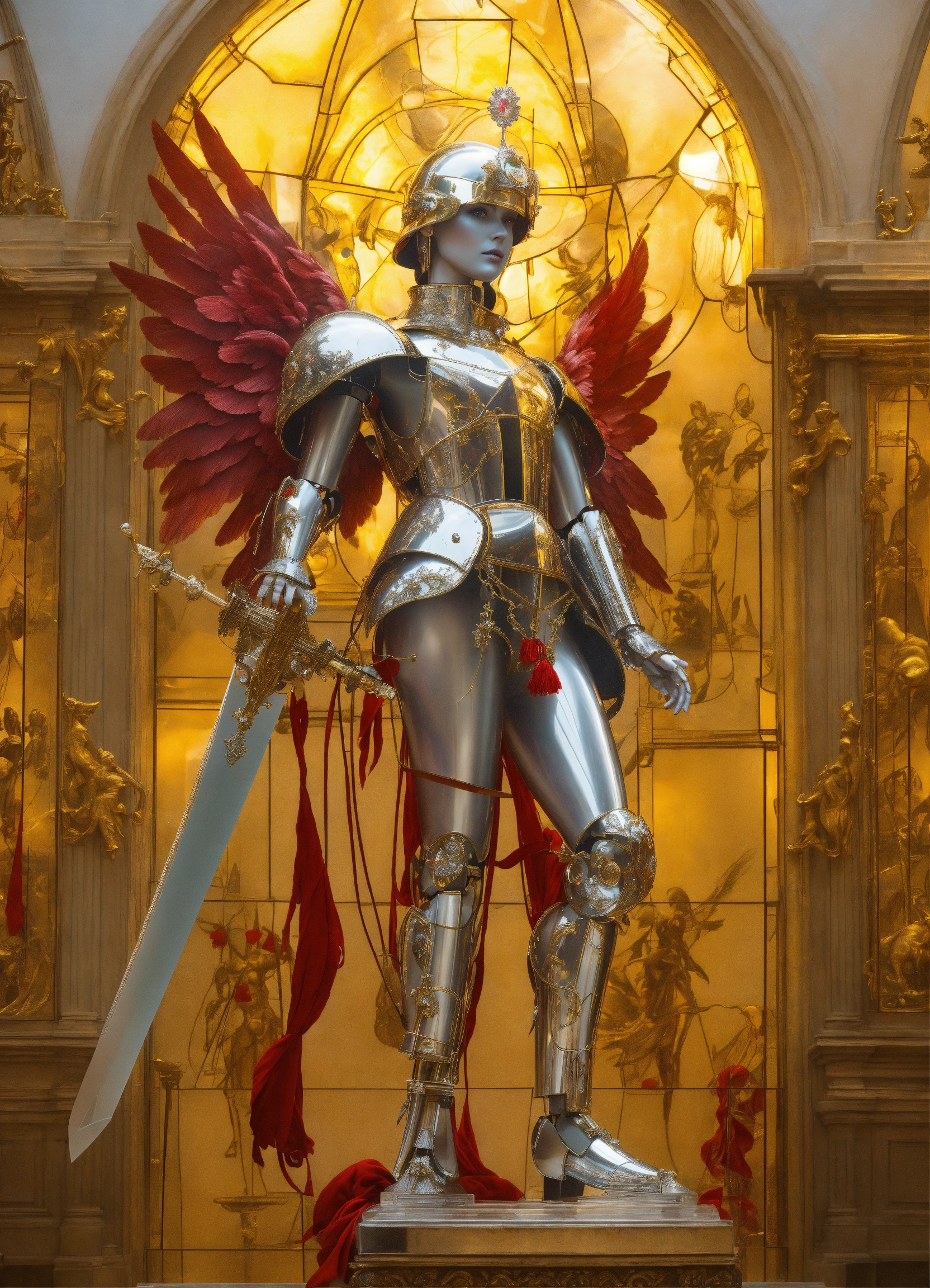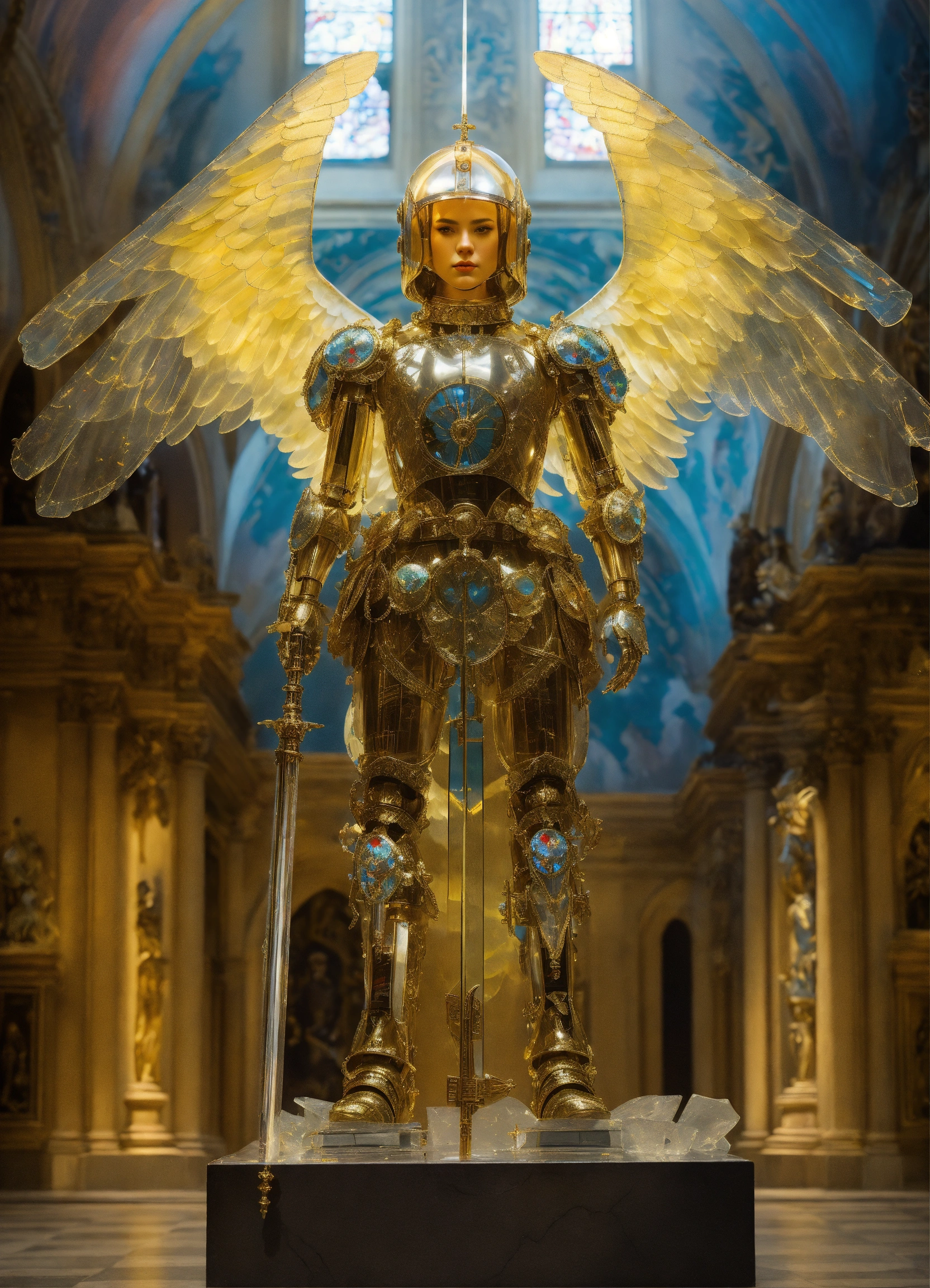 Portrait photography, a transparent plexiglass body humanoid robots, with helmet gemstones as an archangel st michel with his sword, constructed as 80 degree view, art by sergio lopez, natalie shau, james jean and salvador dali