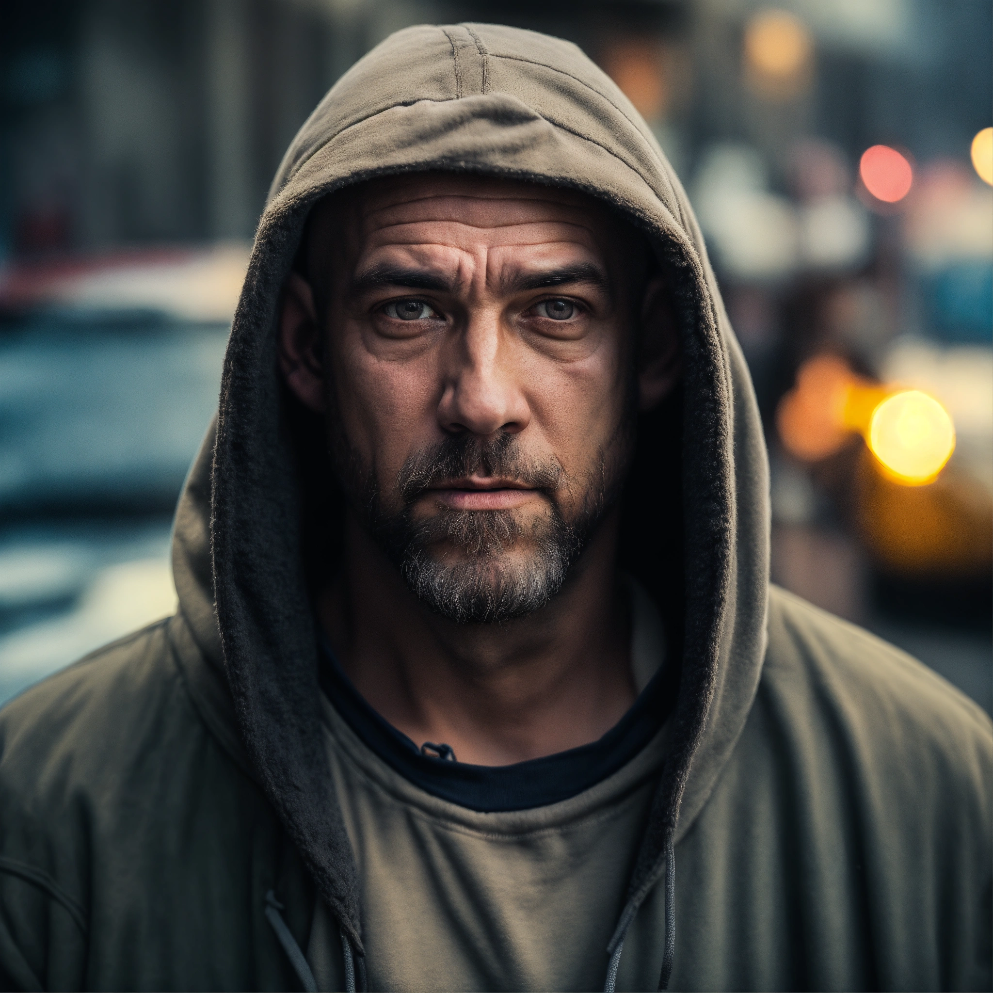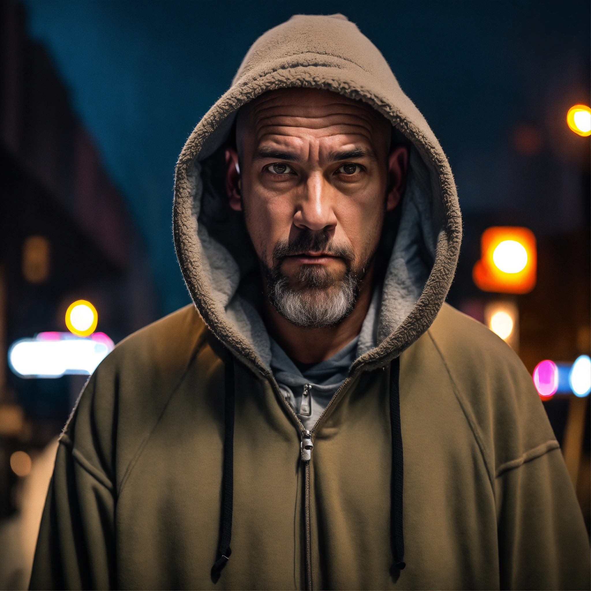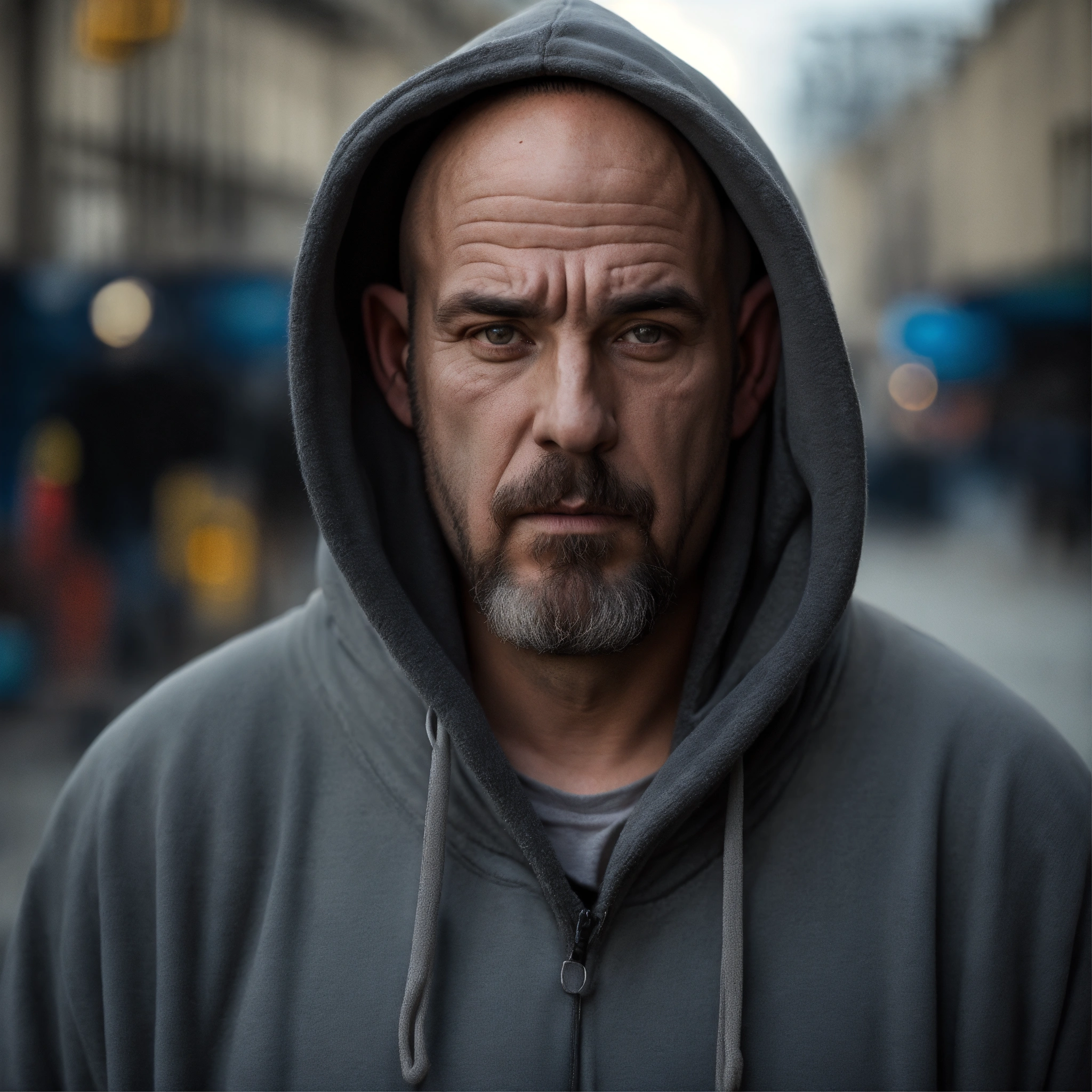 A homeless huge man with a huge lumpy bald head, a tiny goatee, protruding forehead, sunken light gray eyes, crooked mouth, large ears, wearing a hoodie up over his head, standing in the street