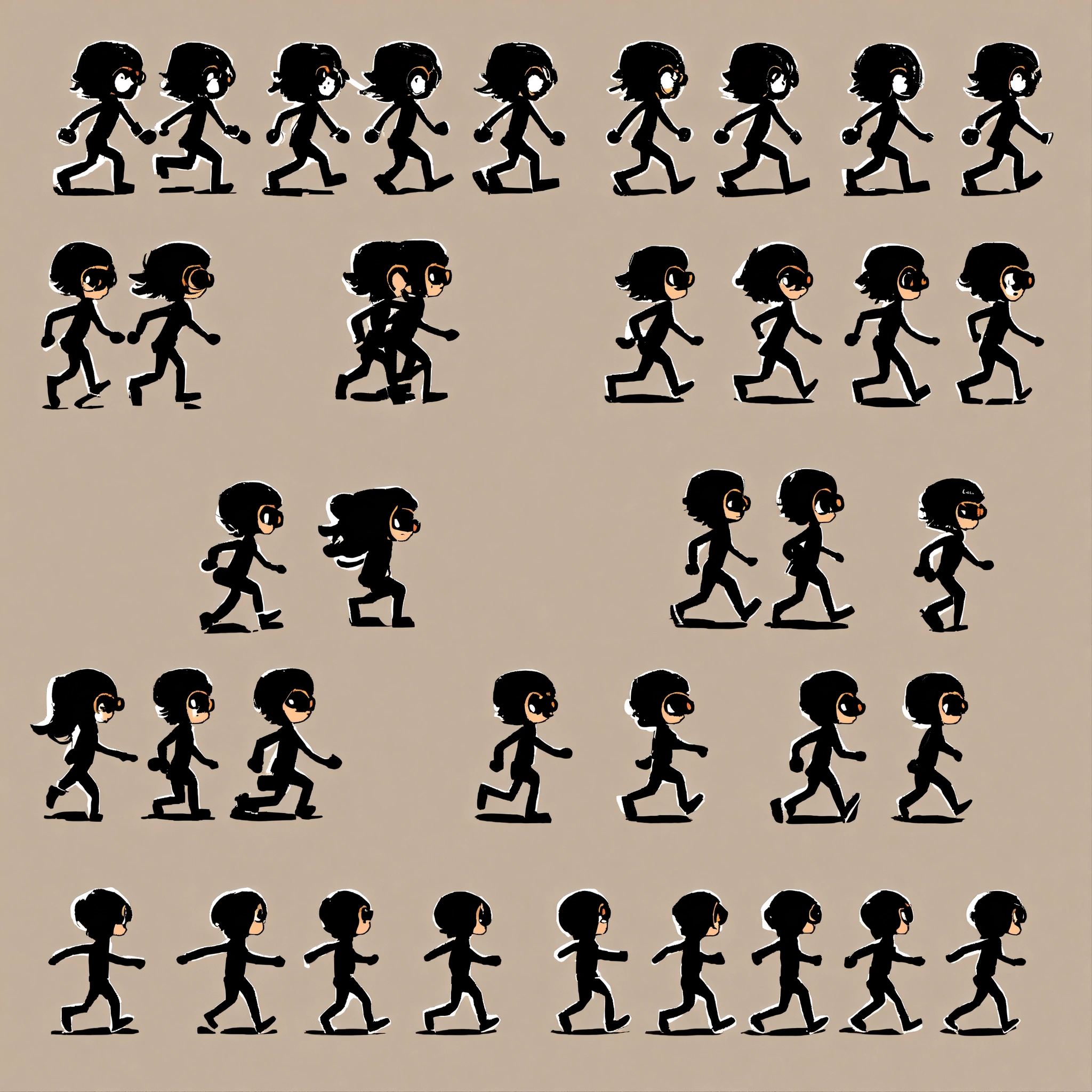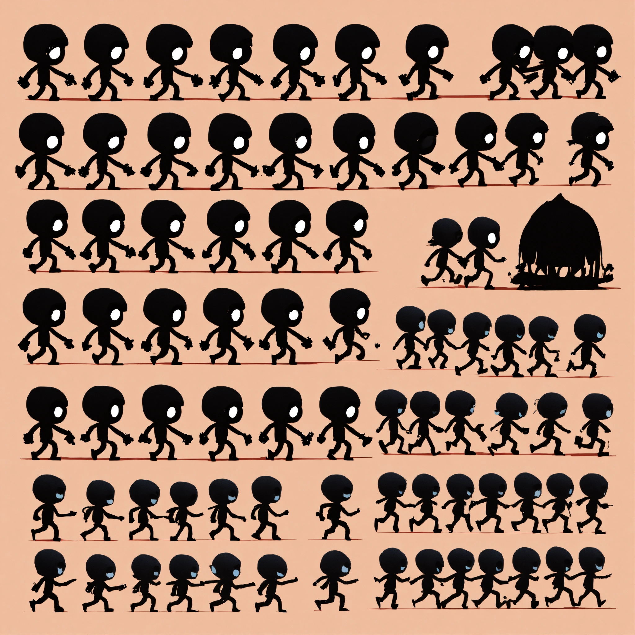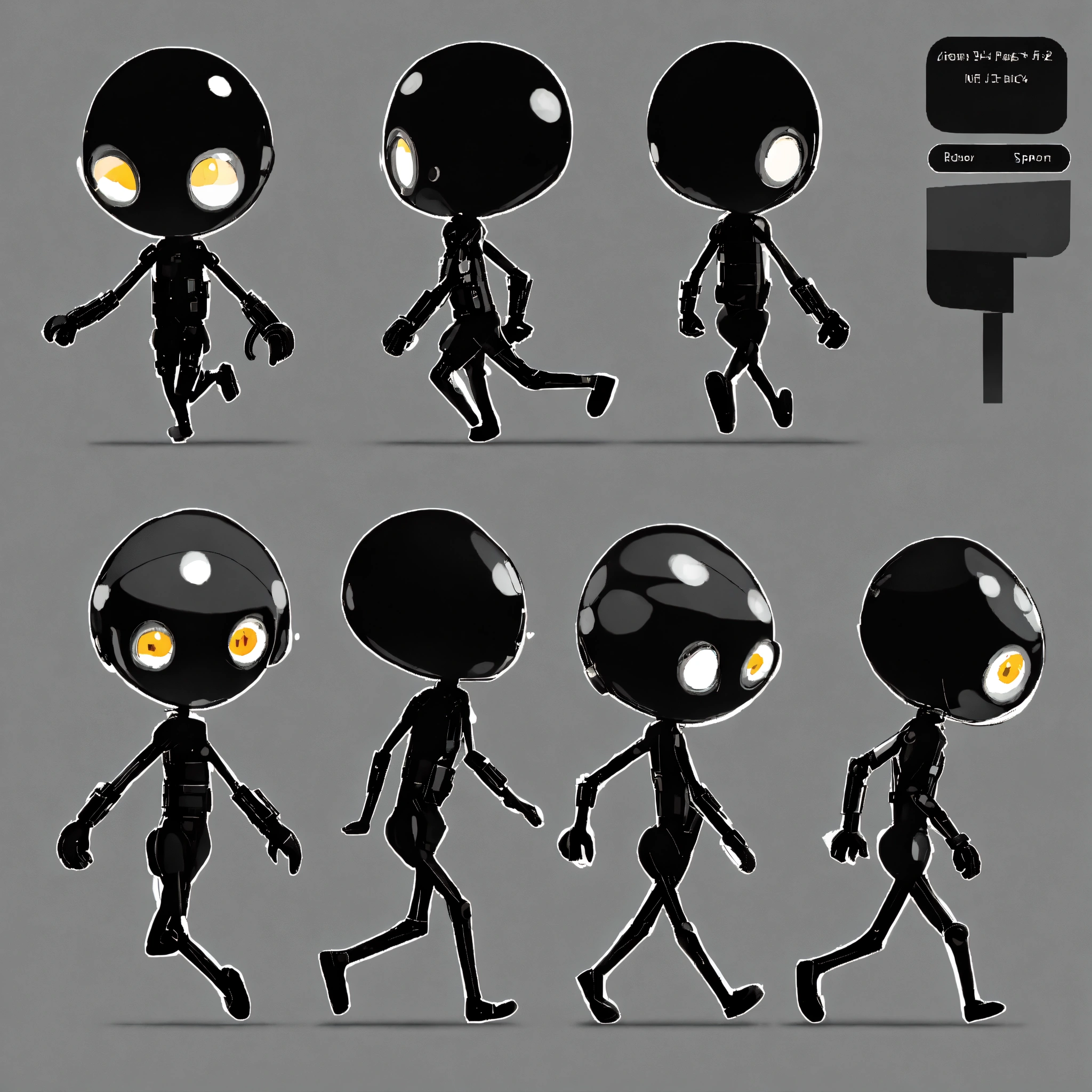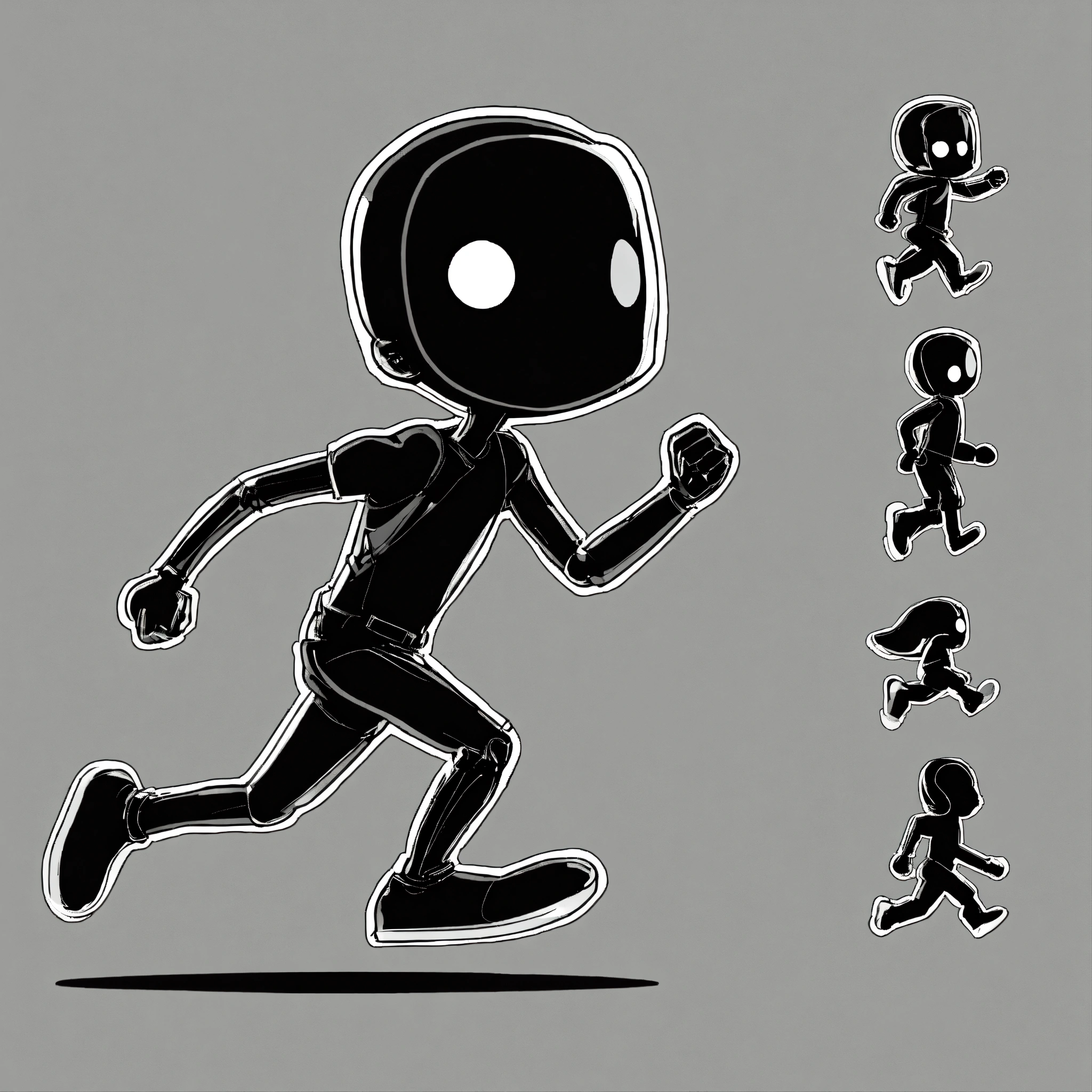 Stickman figure, for endless runner 2d game, big eyes, cute theme, mainly black color, right side view, transparent background, running animation spritesheet