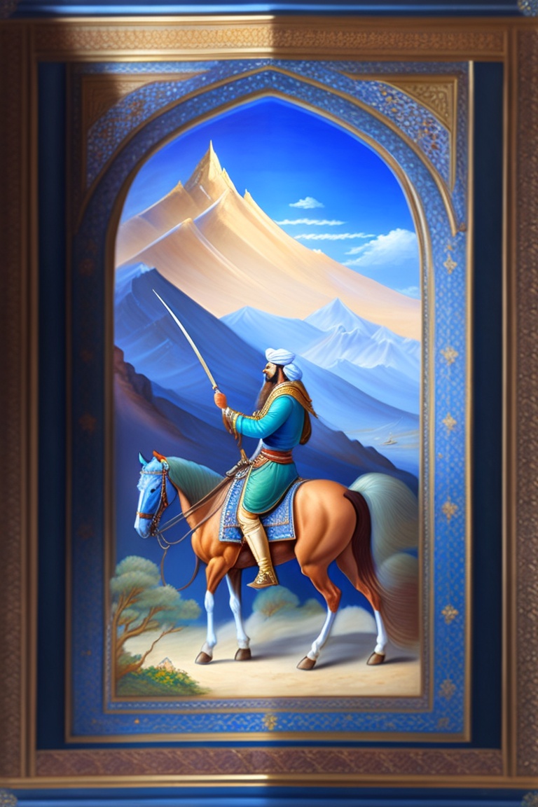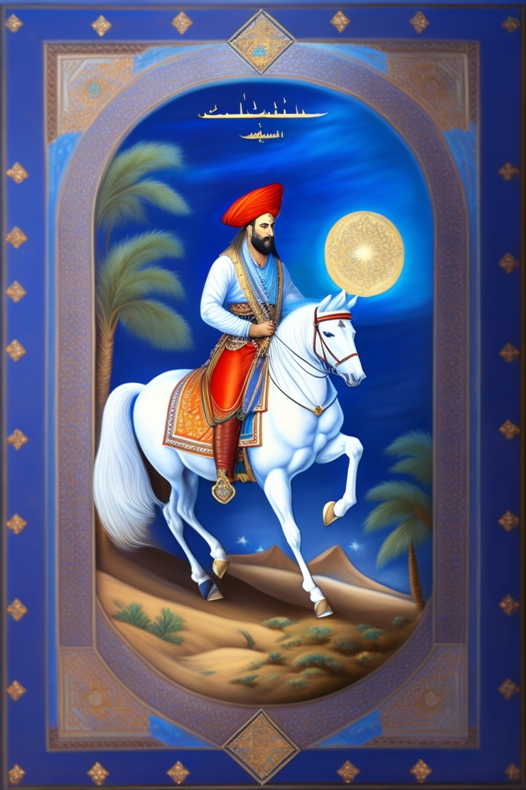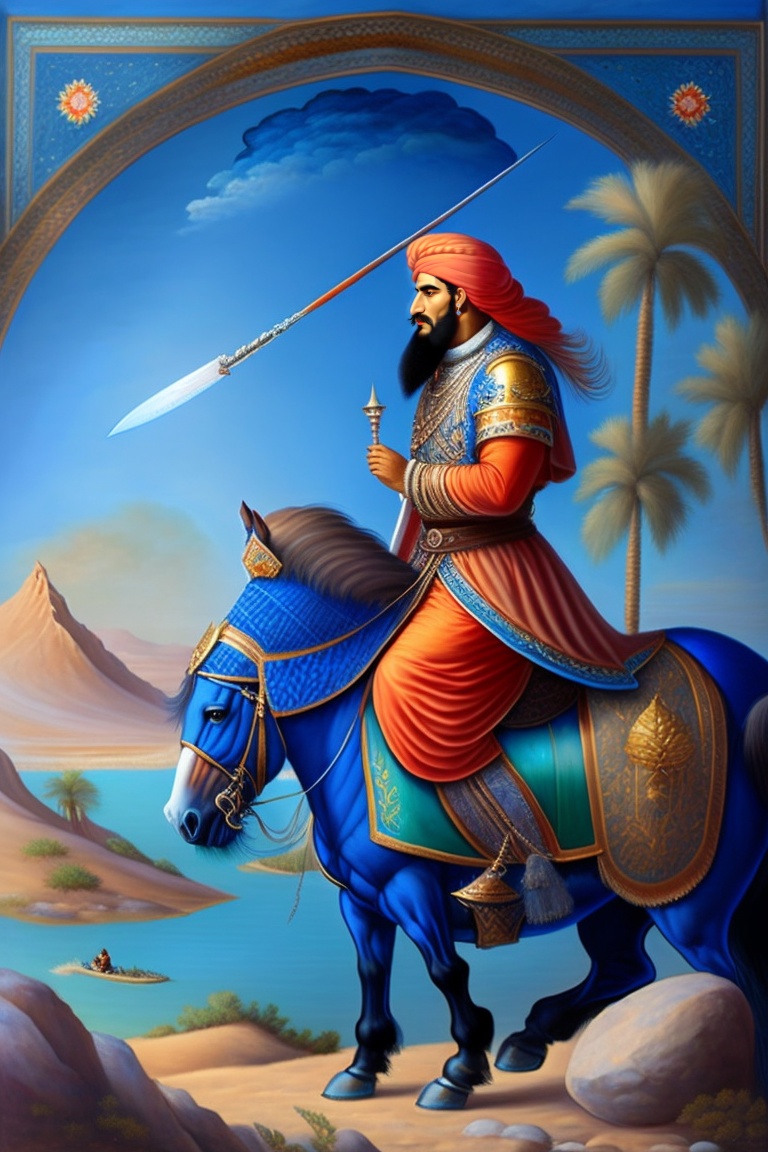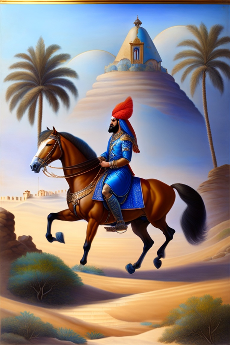 Kamāl ud-dīn behzād painting illustration, full character portrait of vizier, wearing a (tarpus:1.1), riding a horse, lion pouncing and biting the rear of the horse, few of palm trees in the background, vizier holding a knife over the lions head, mystic atmosphere, rocks in foreground and background, desert, blue sky, masterpiece, highres, trending on artstation, abdullah ibn al-fadl, reza abbasi, mir sayyid ali, matrakçı nasuh surname-i hümayun, hamse-i atai, ottoman miniature, persian miniature, mir emad hassani, ahmed karahisari, hâfiz osman, mir ali tabrizi, yaqut al-musta'simi, esmâ ibret hanim, mahmud celaleddin efendi, suyolcuzade mustafa eyyubi, yedikuleli seyyid 'abdullah efendi, abdul rahman hilmi, derviş ali, mehmed esad yesari, i̇smail zühdi efendi, egrikapili mehmed rasim efendi, by greg rutkowski, one thousand and one nights atmosphere, 8k, ultra high details