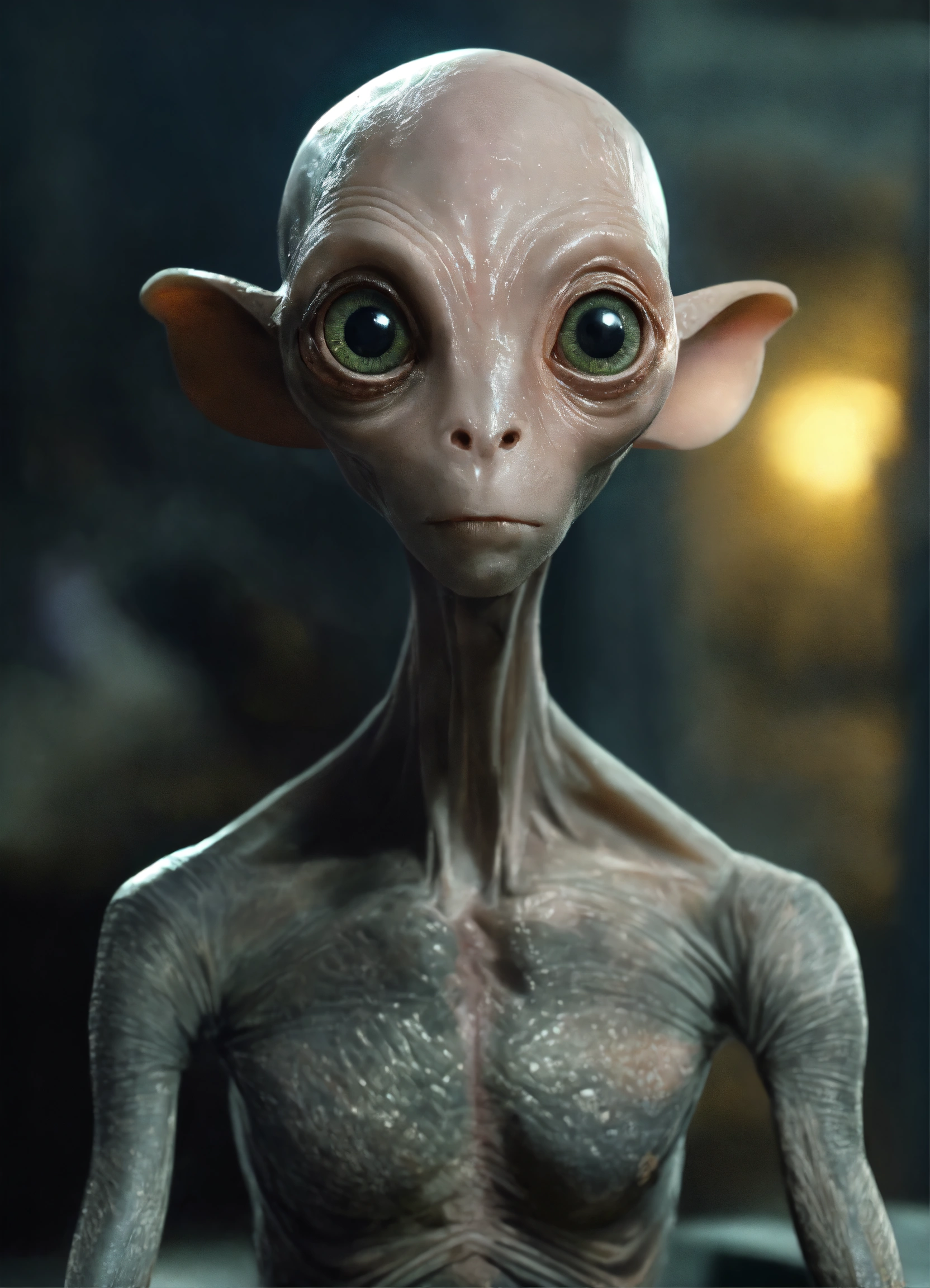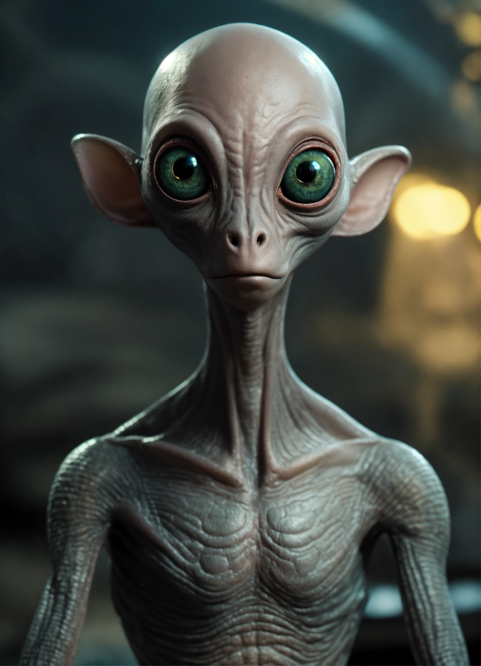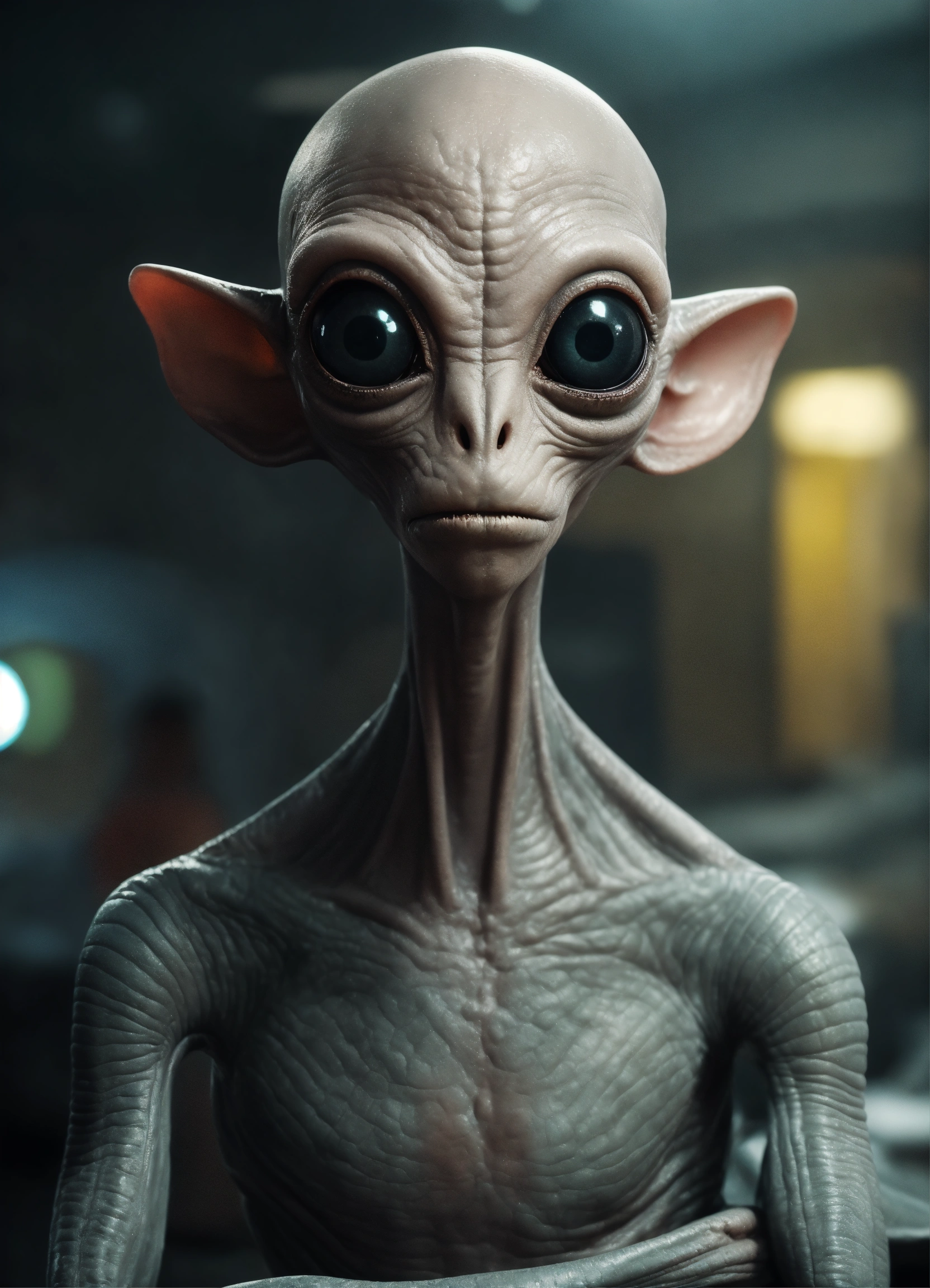 Gray alien creature with huge eyes, bald. instead of a nose there is a small gap, a mouth without lips. 3 fingers on each hand