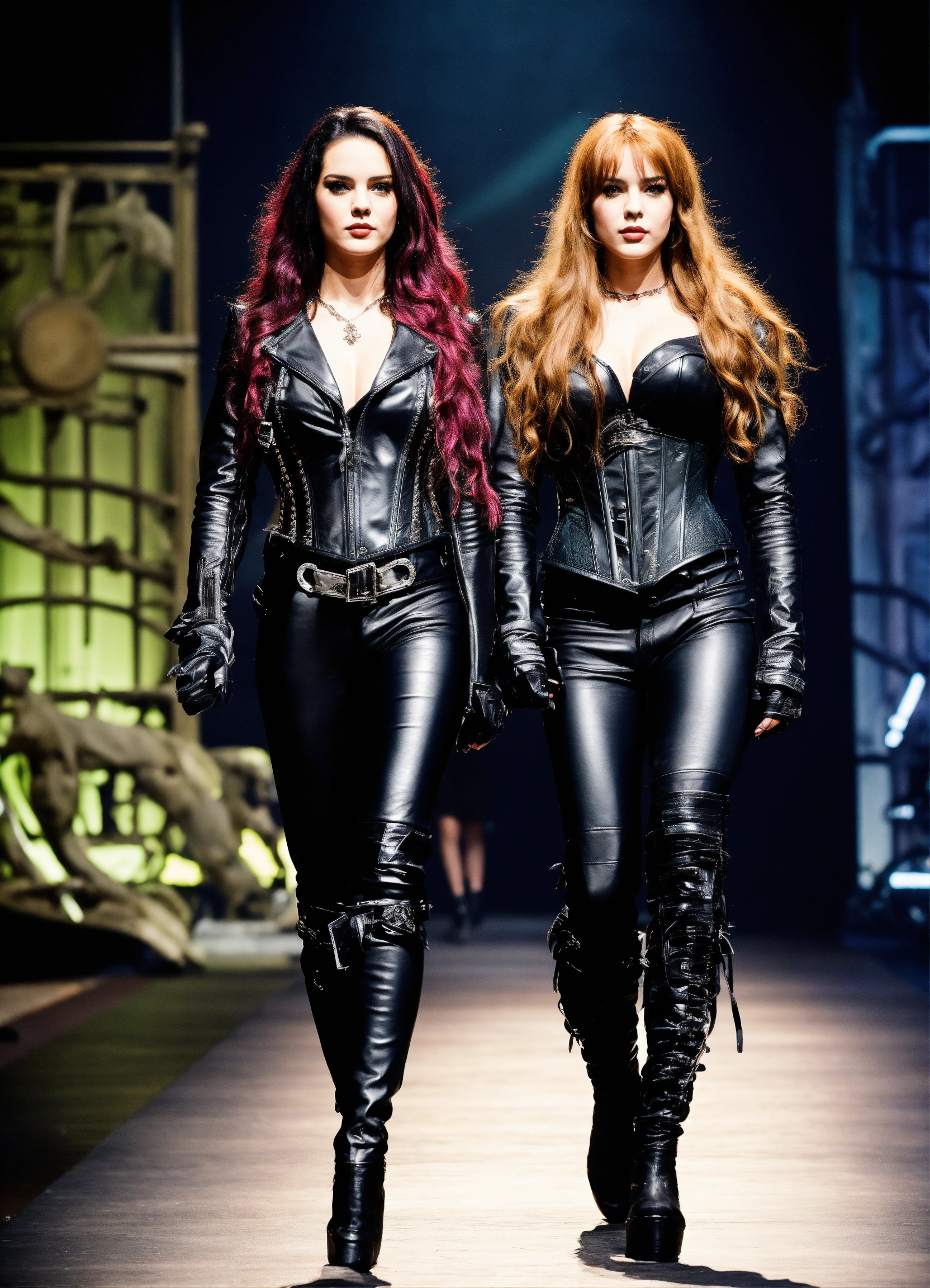 A real photo of two 25 year old heavy metal women, with very long hair, wearing black leather jacket, pants, corset and gloves. walking on the cat walk fachion show full body