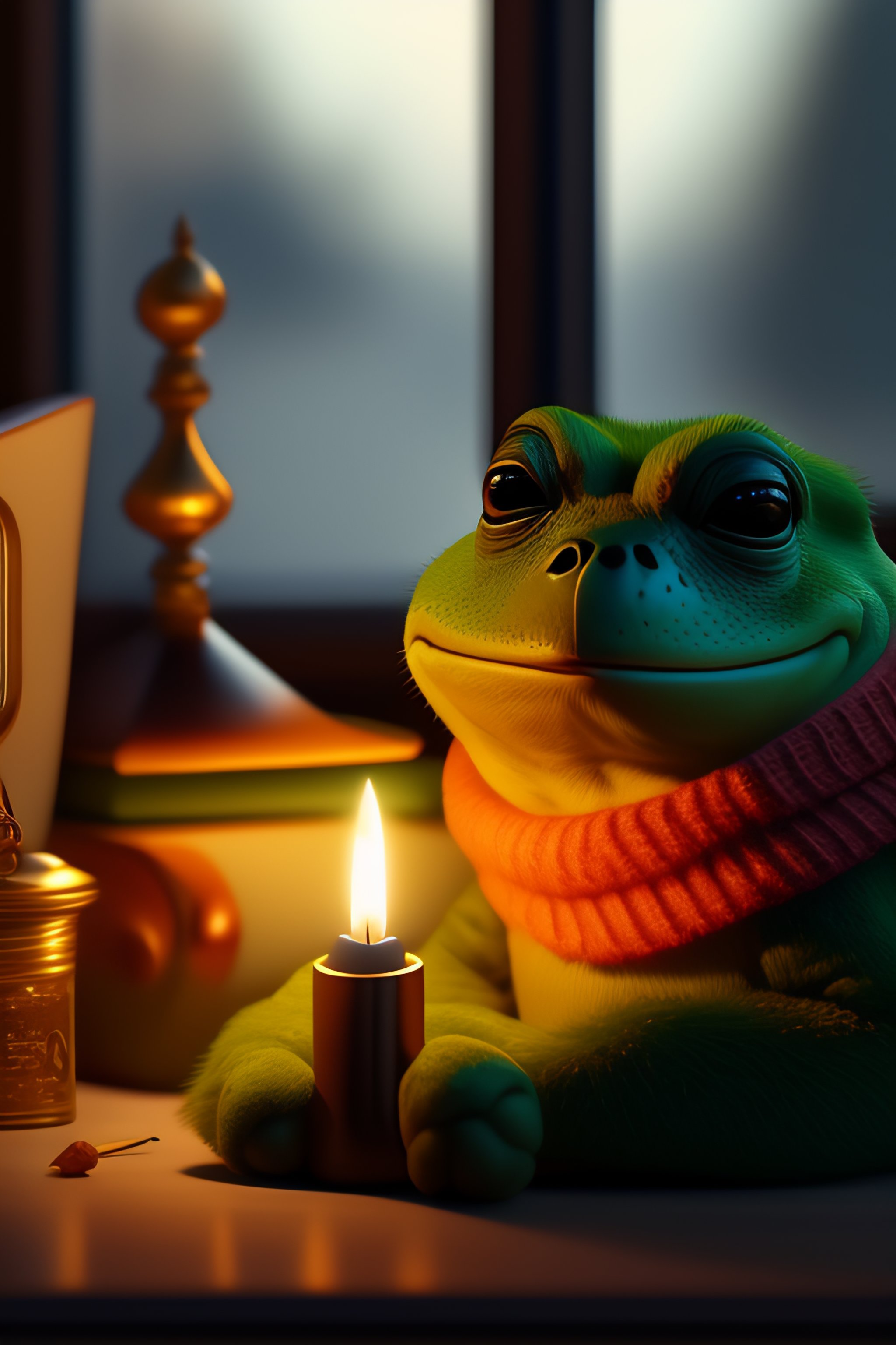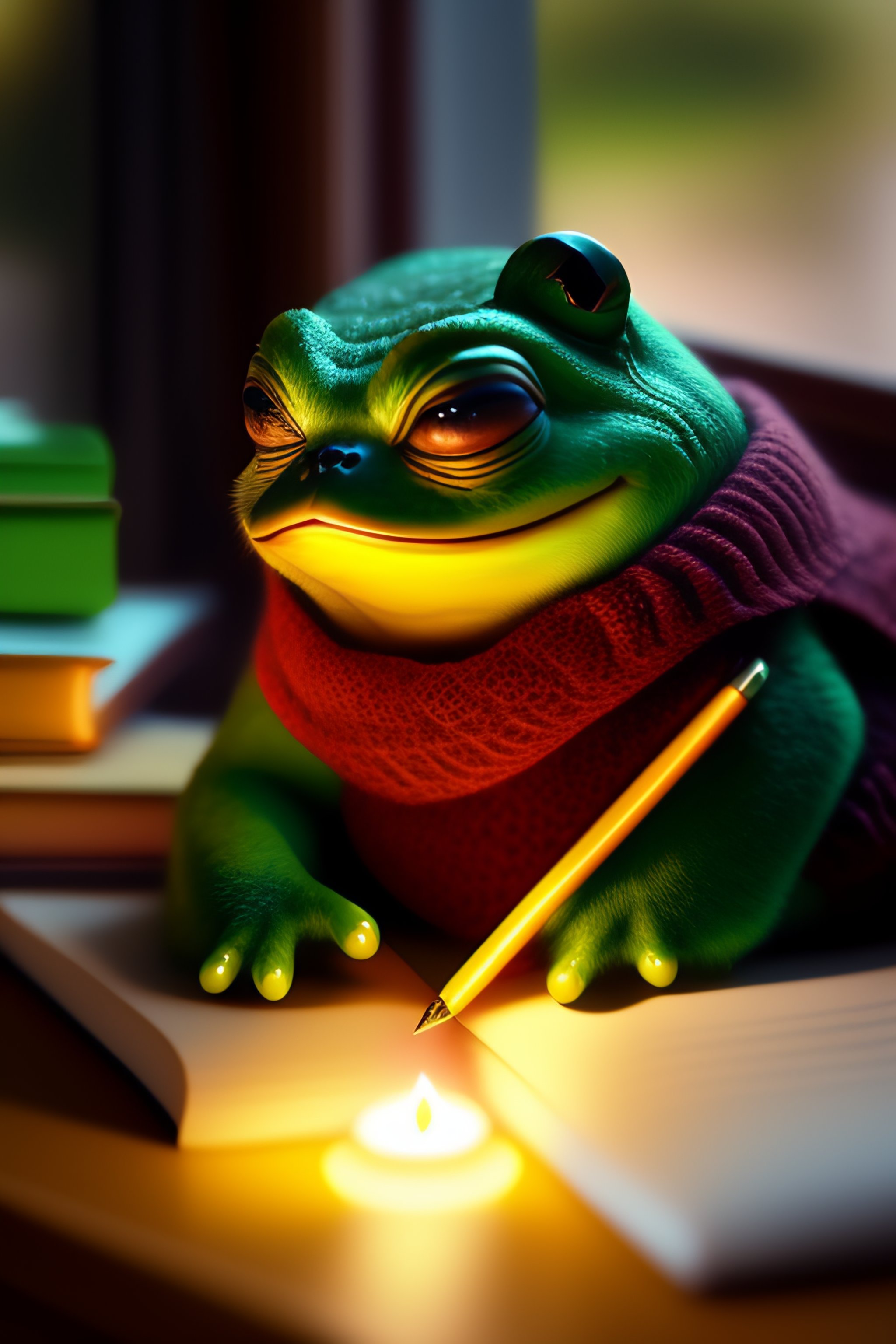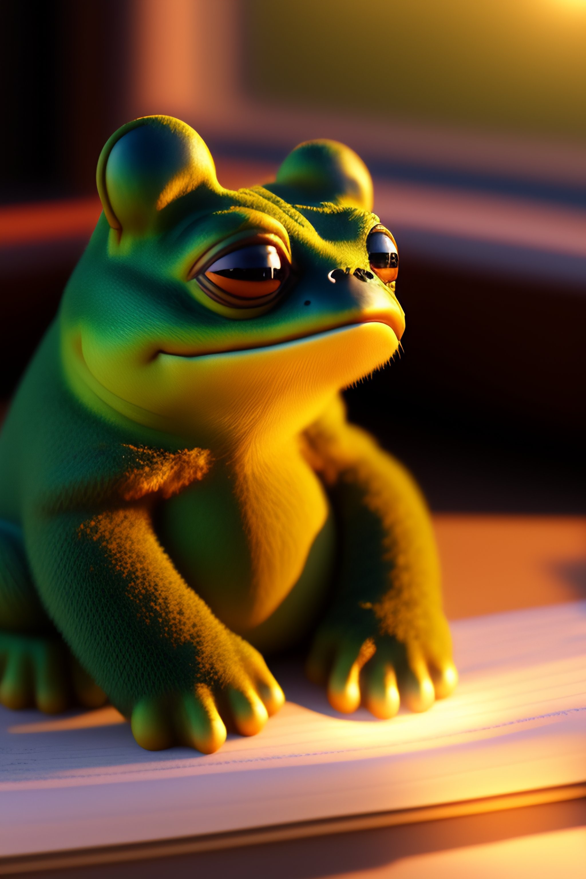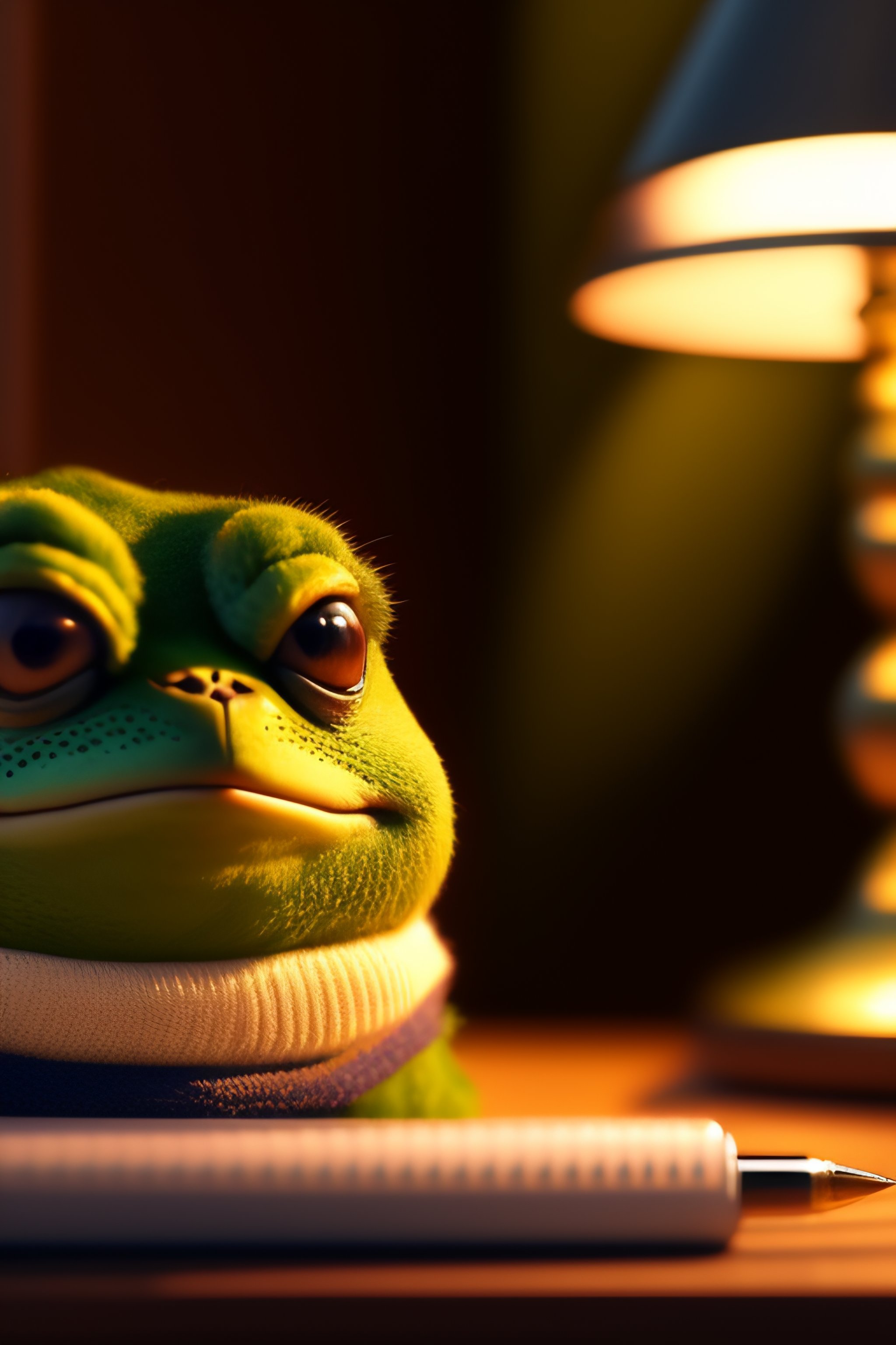 An exhausted pepe the frog commiting tax fraud, paperwork, writing pen, desk, cozy, night- key lighting, soft lights, foggy, by steve hanks, by lisa yuskavage, by serov valentin, by tarkovsky, 8 k render, detailed, cute cartoon style, very cute face