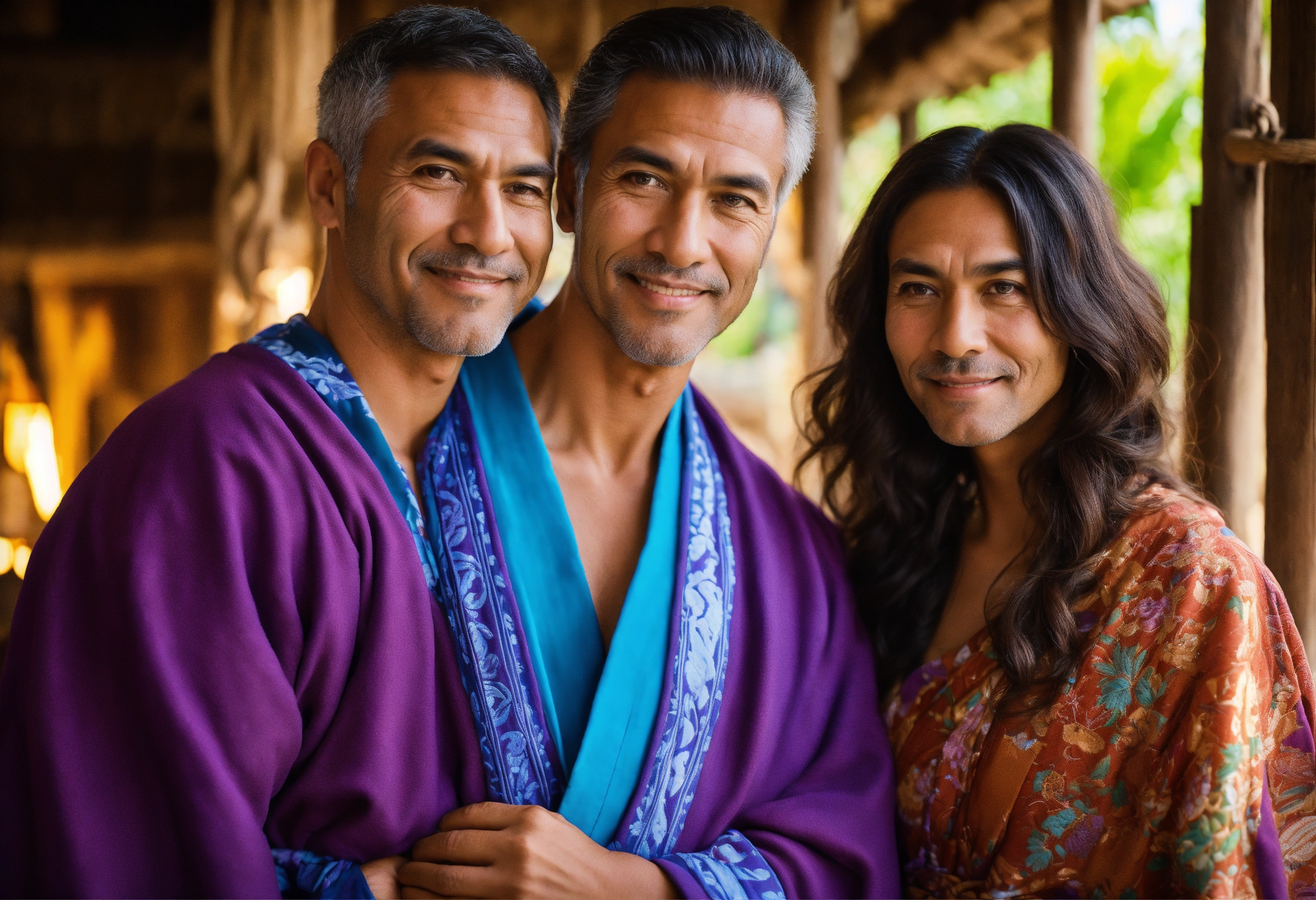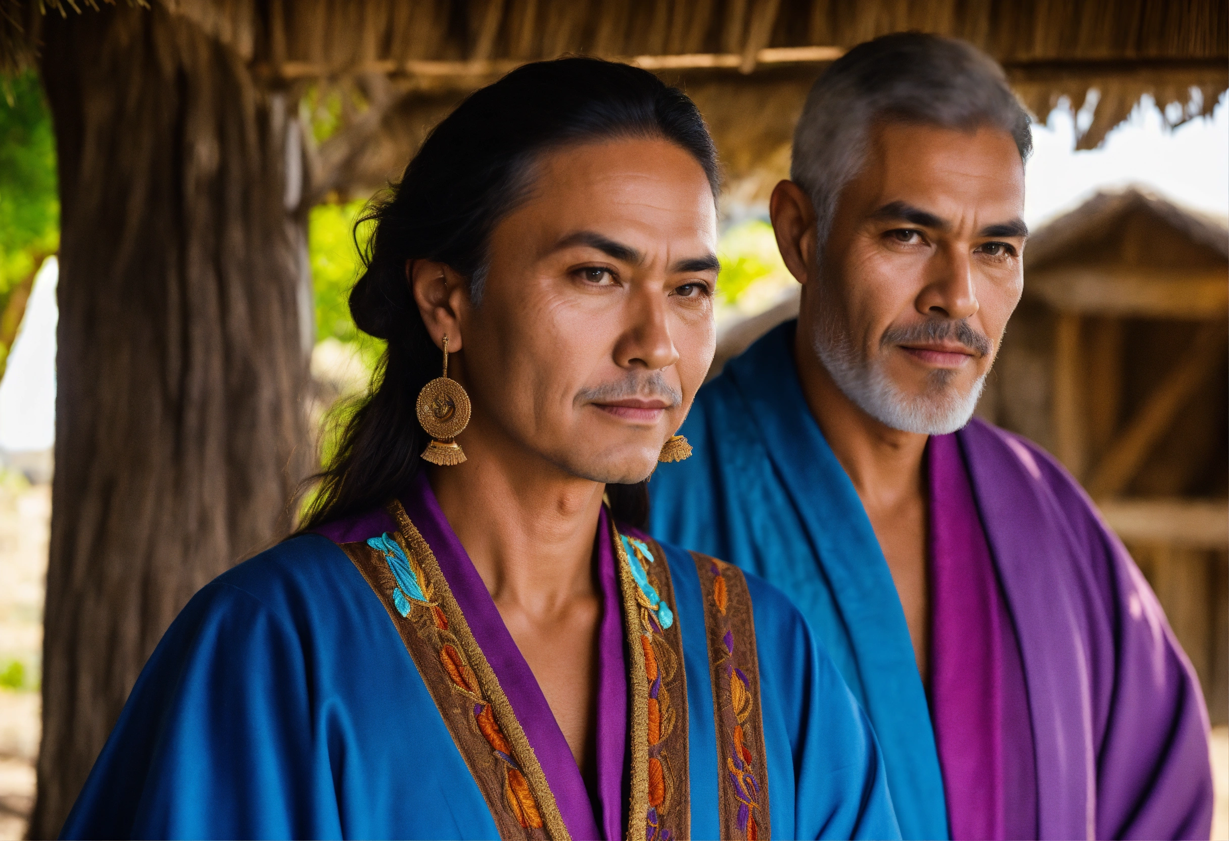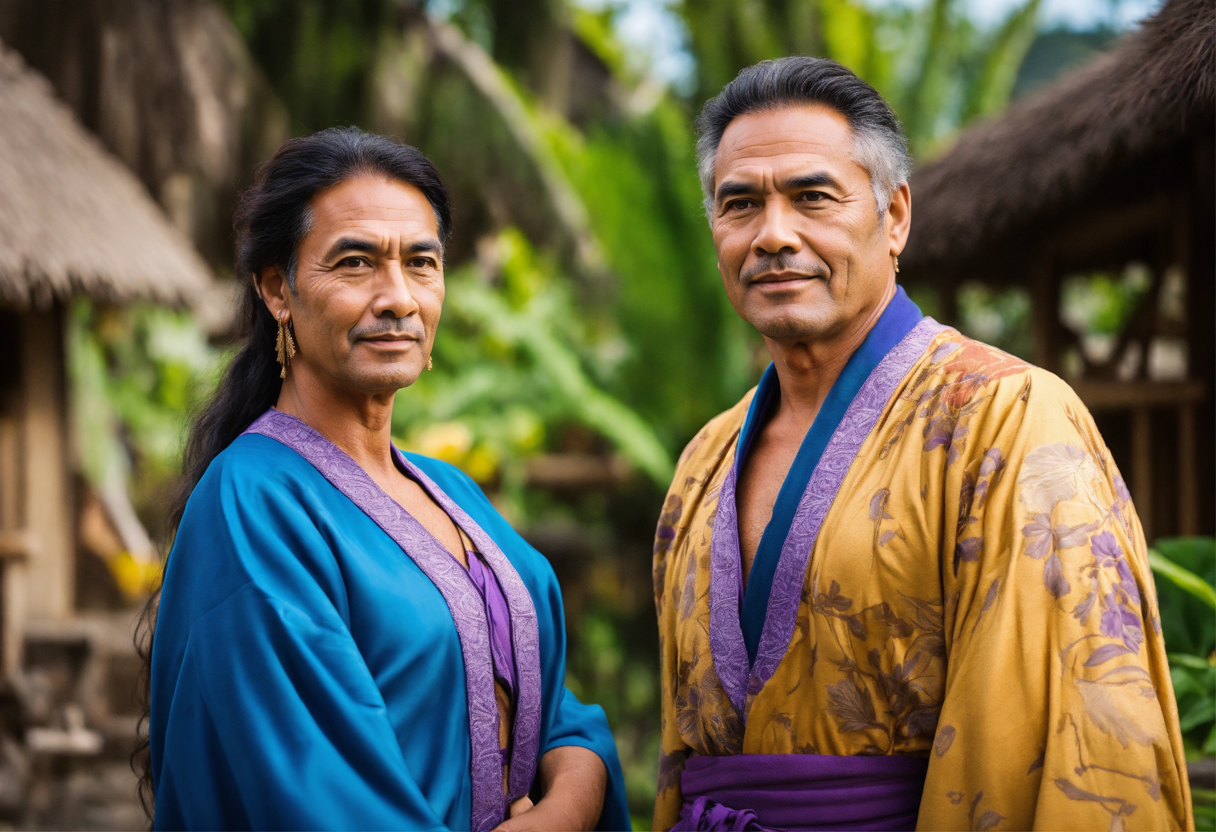 Middle age man and woman, pleasant looking, long face, polynesian, formally dressed man in blue robe, woman in purple robe, beautiful village.