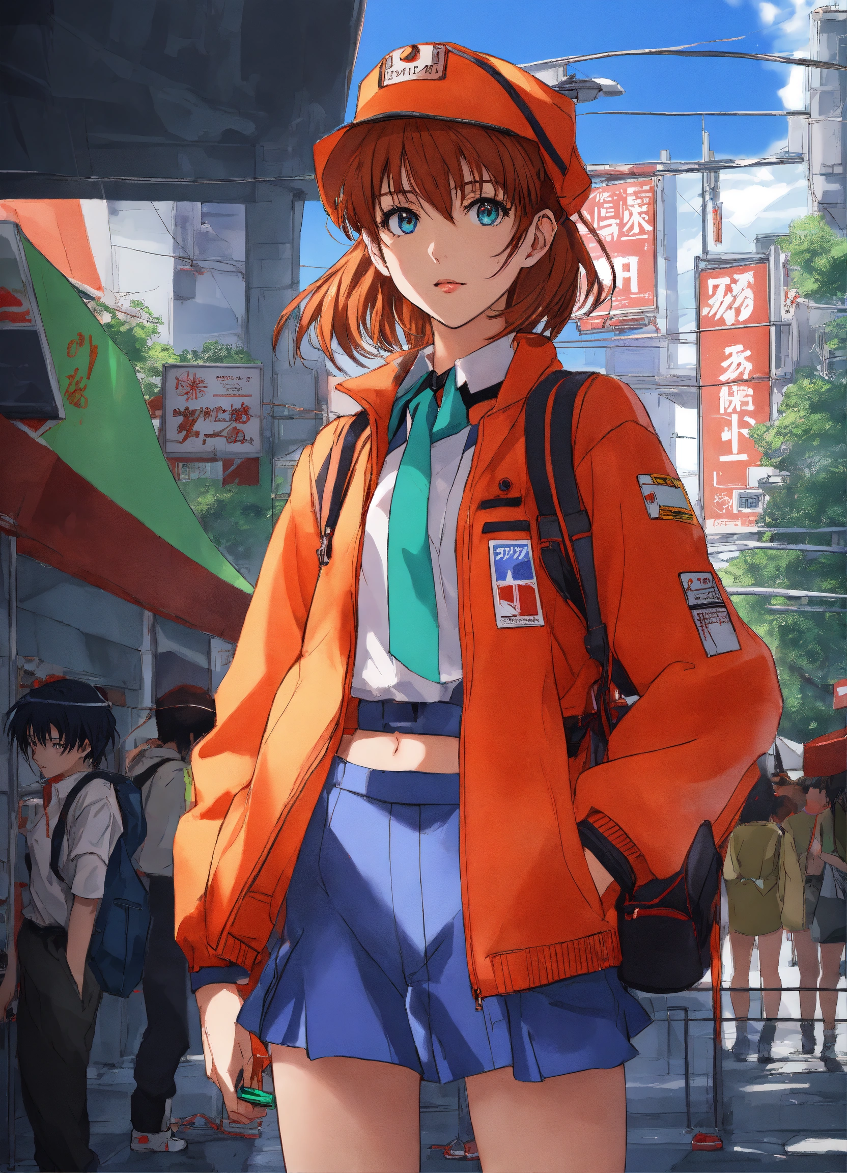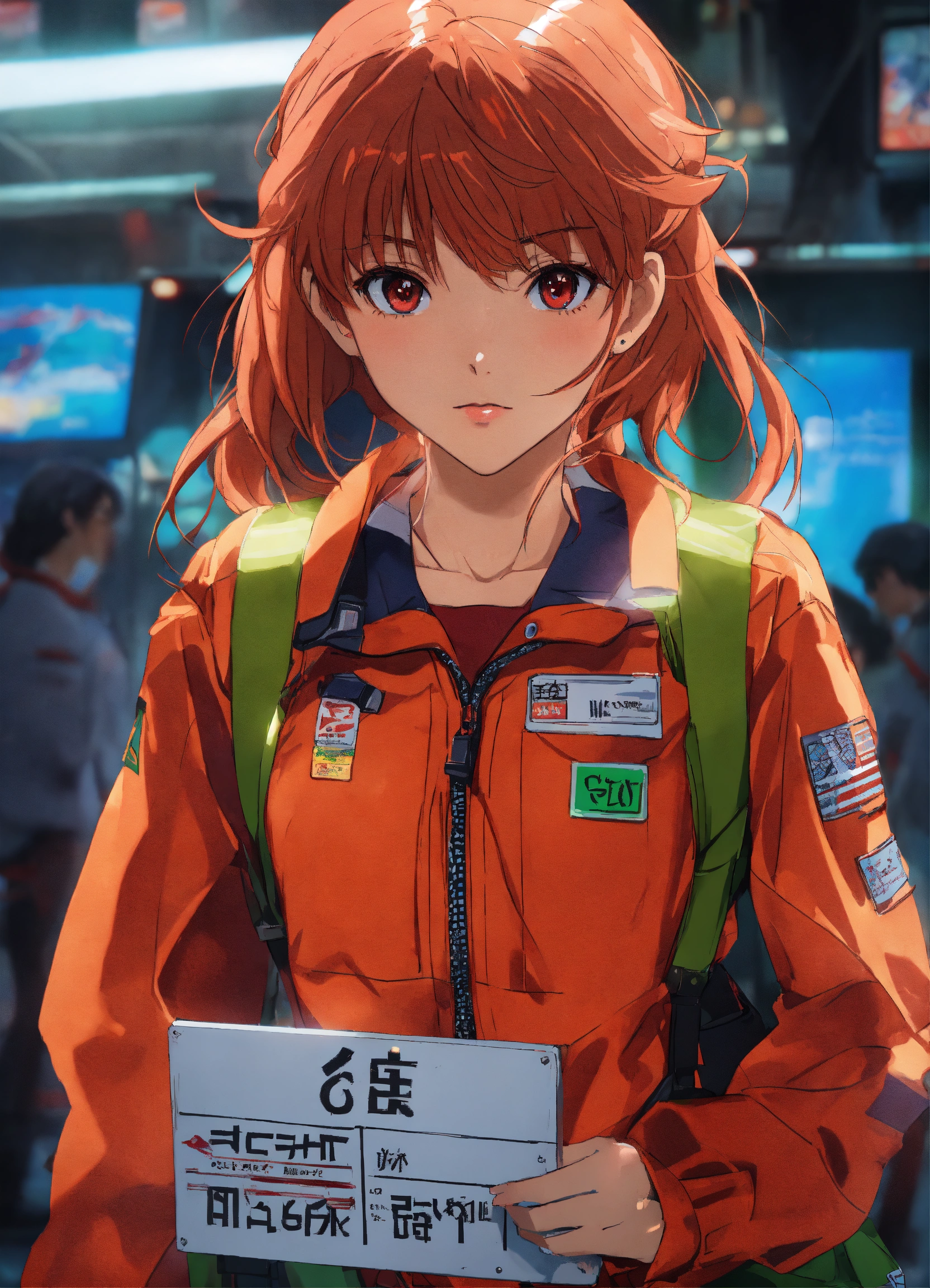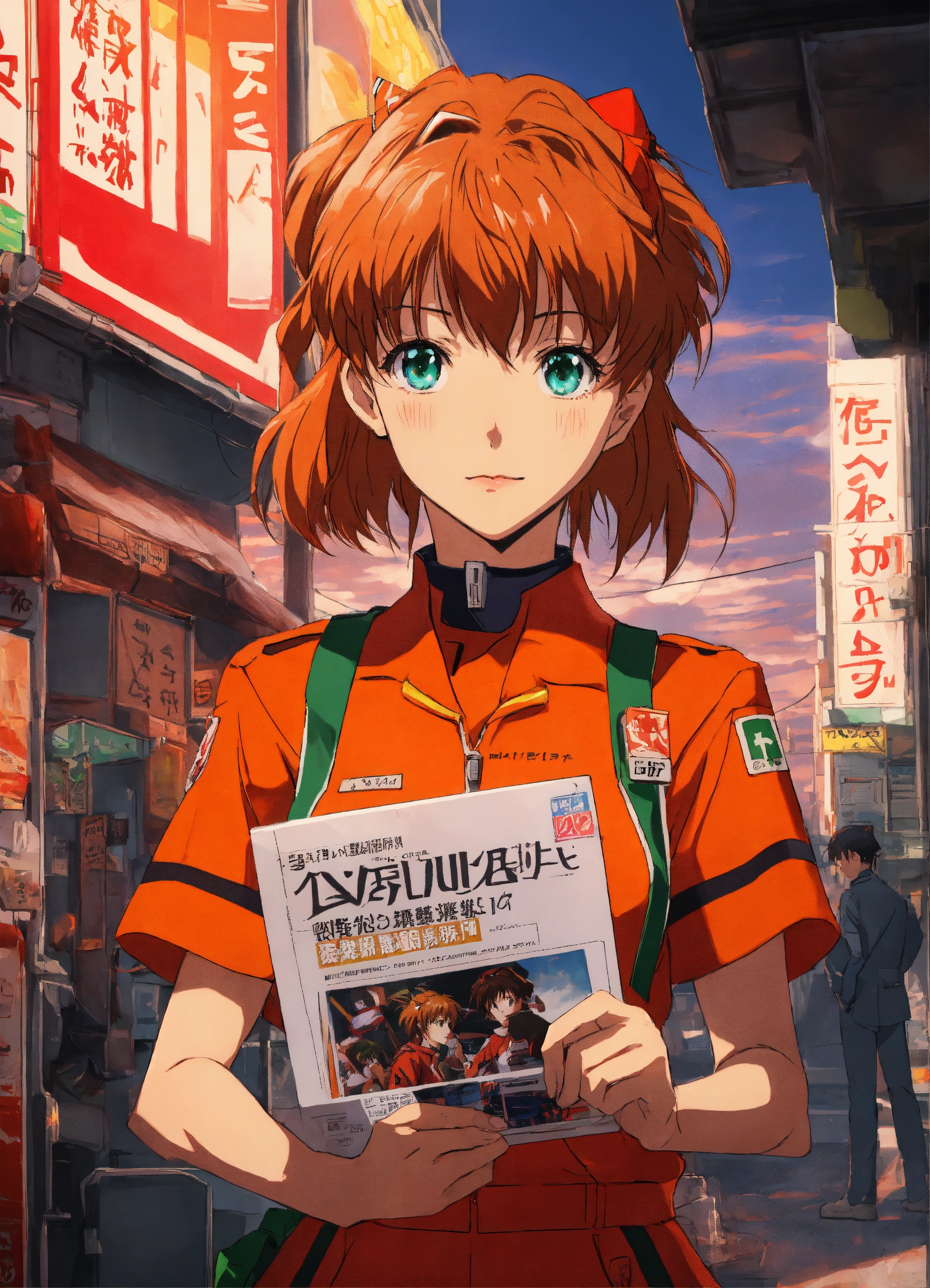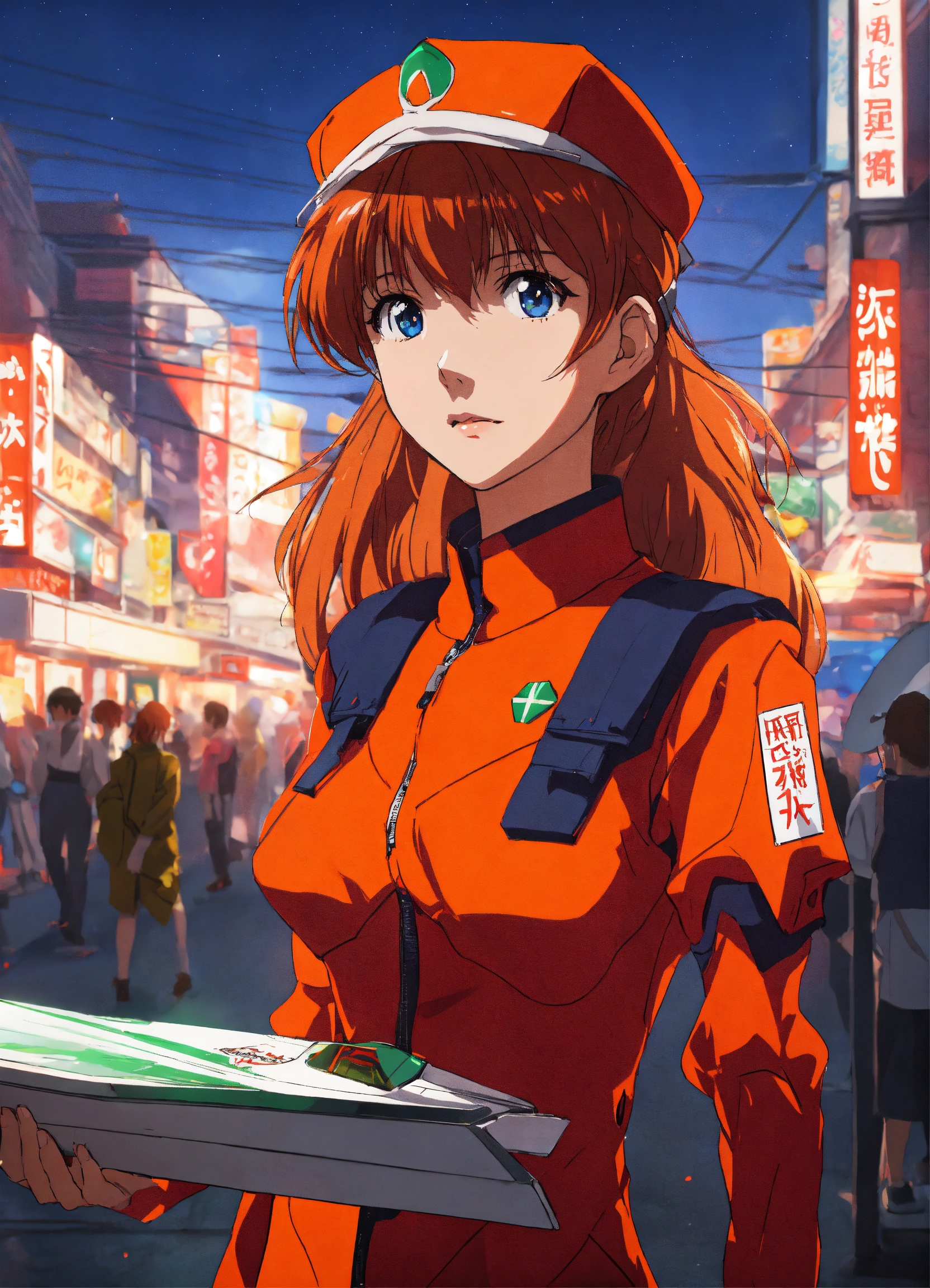 Anime art of asuka from neon genesis evangelion, young girl, beautiful, detailed scene, holding a signboard, stunning details, trending on artstation, ray-traced environment, vintage 80’s anime artwork, unreal engine render