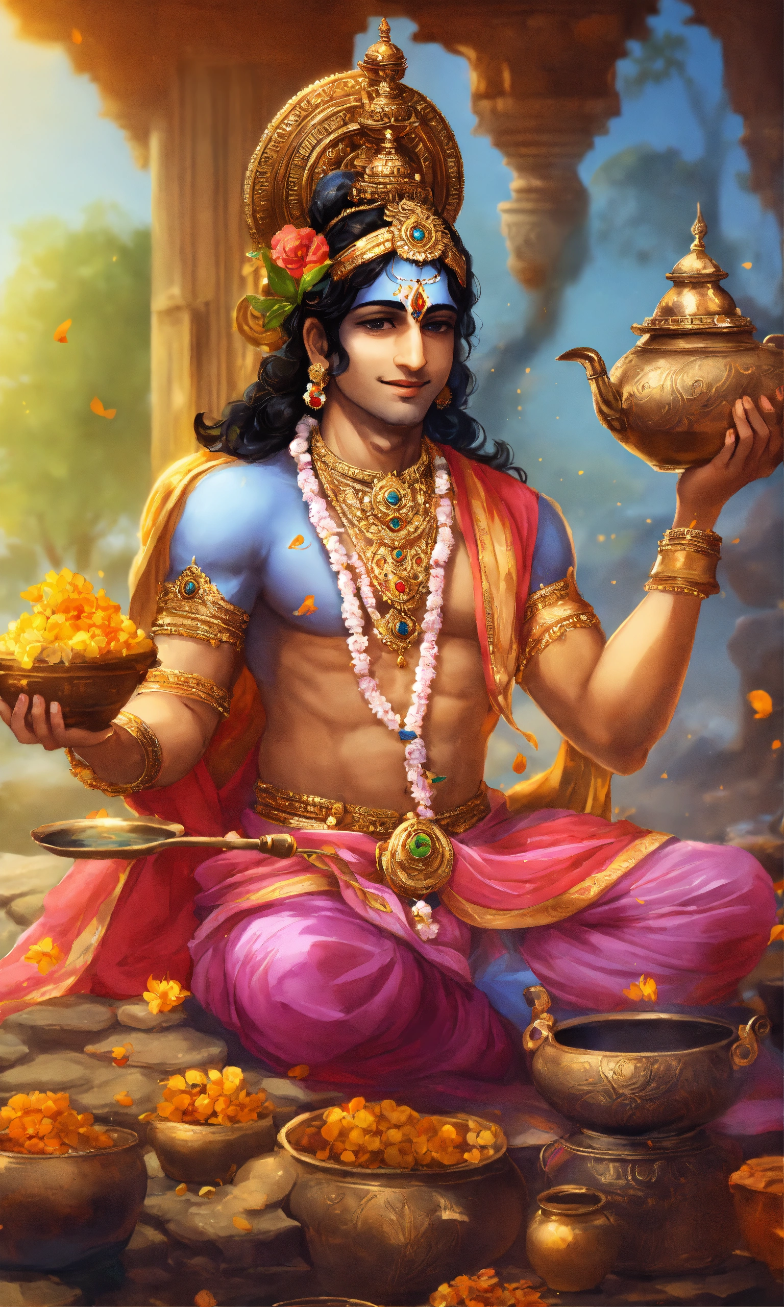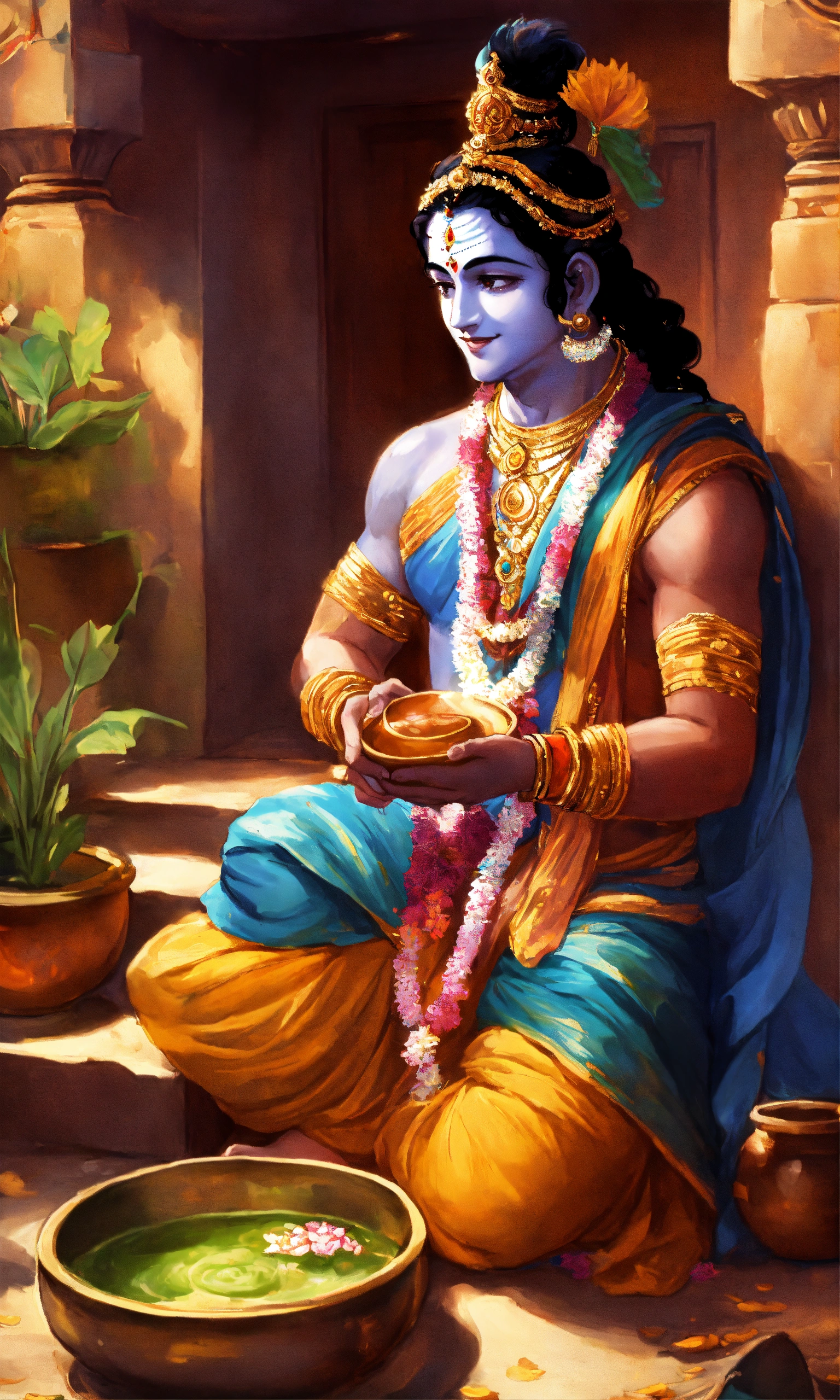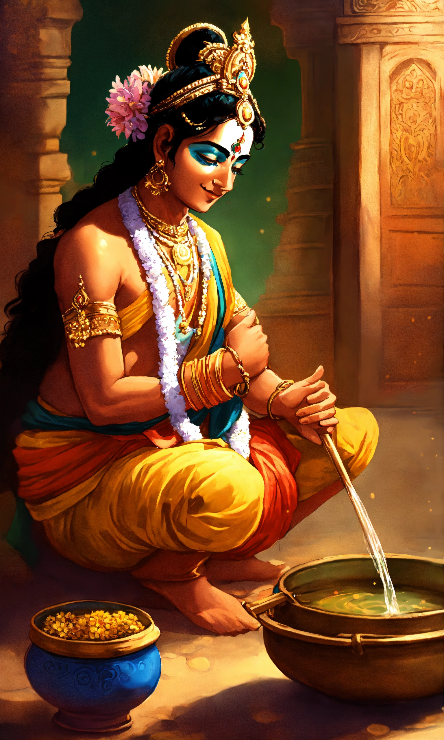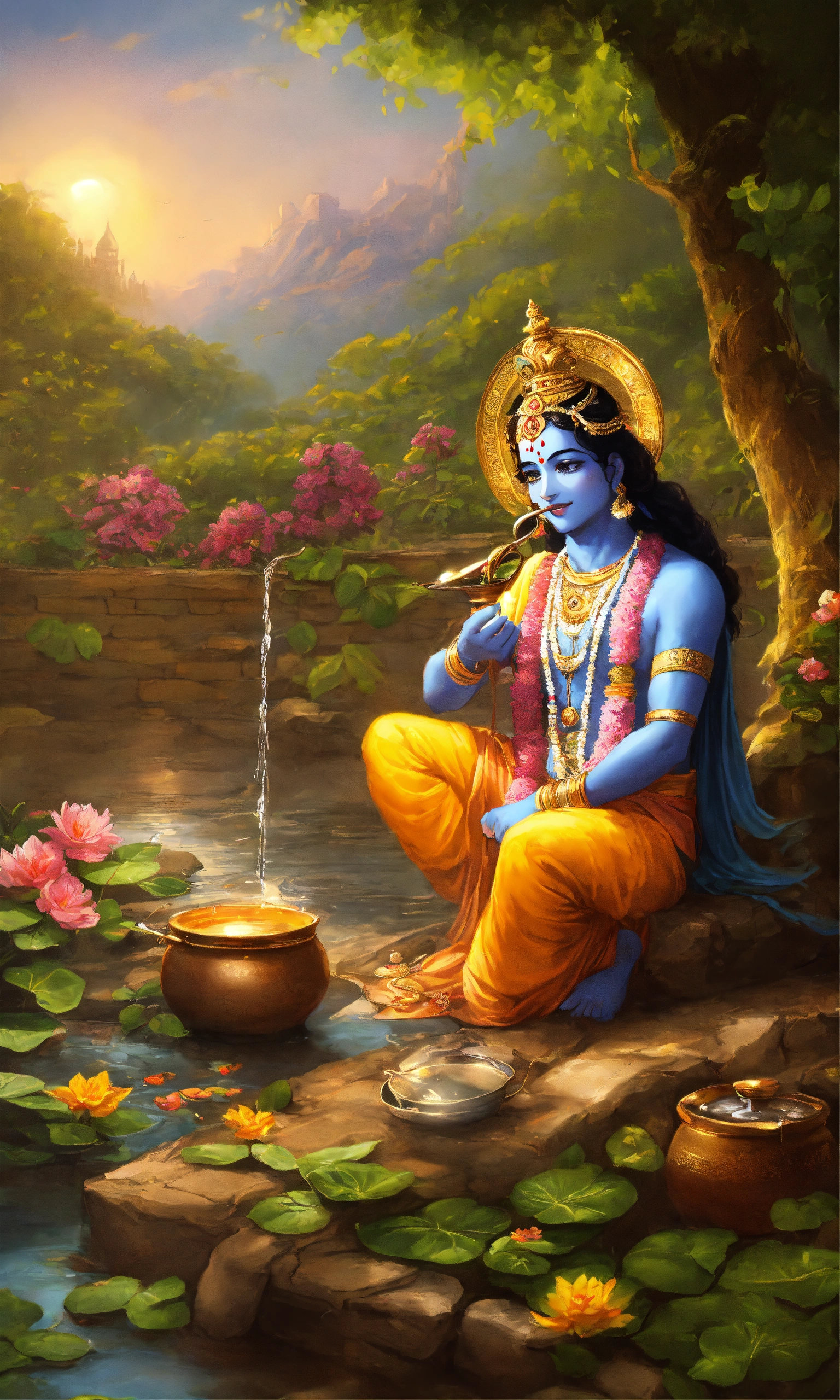 Krishna, with his charming personality, soon had the women laughing and sharing stories as they worked. he effortlessly filled their pots with water, making their task much easier. in doing so, he imparted wisdom and guidance, teaching them about the importance of community, compassion, and selfless service.