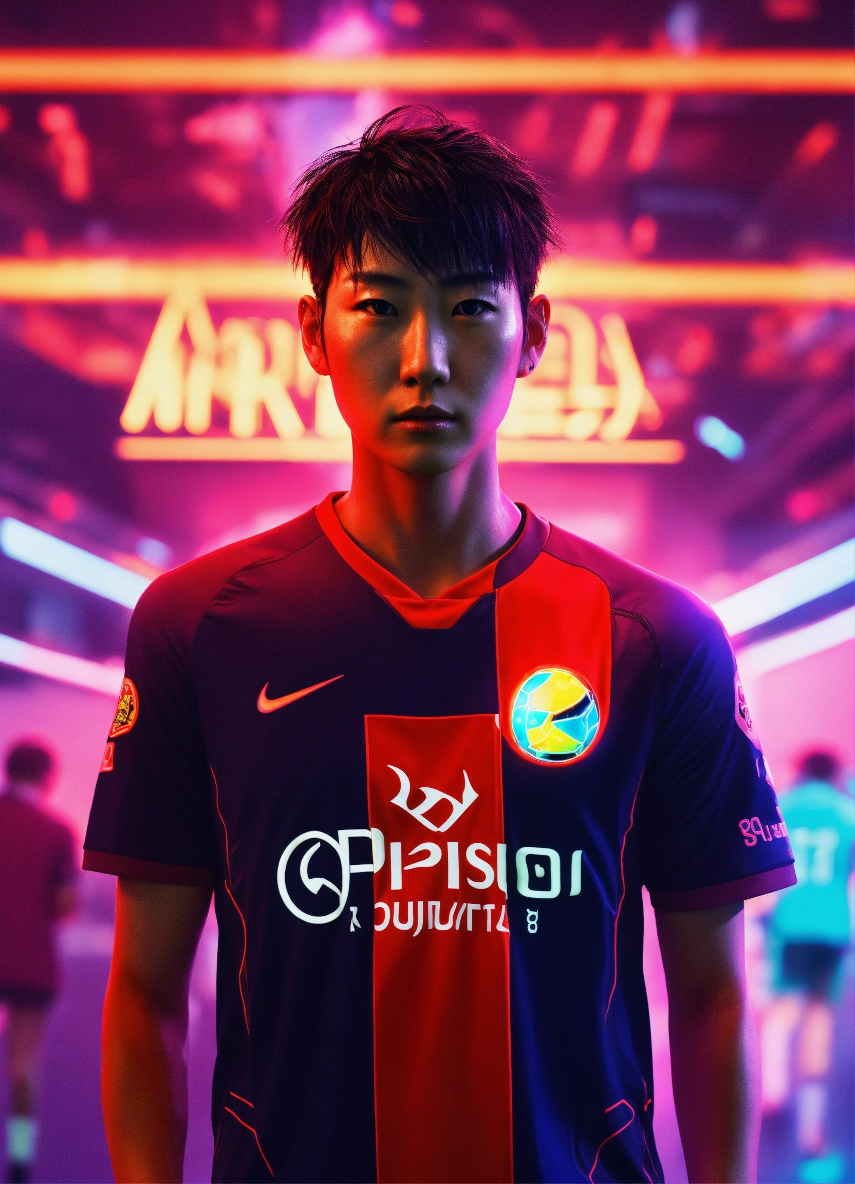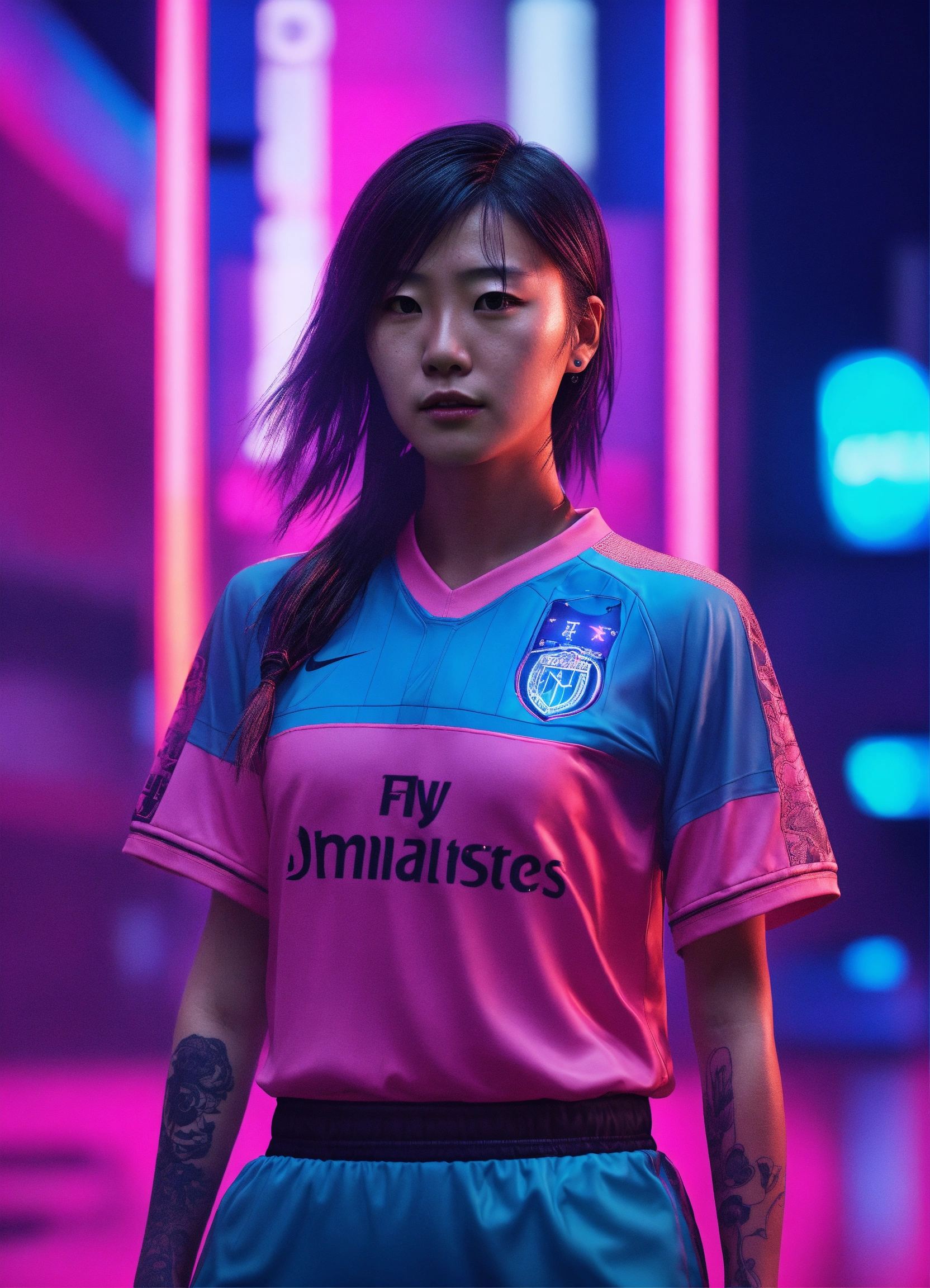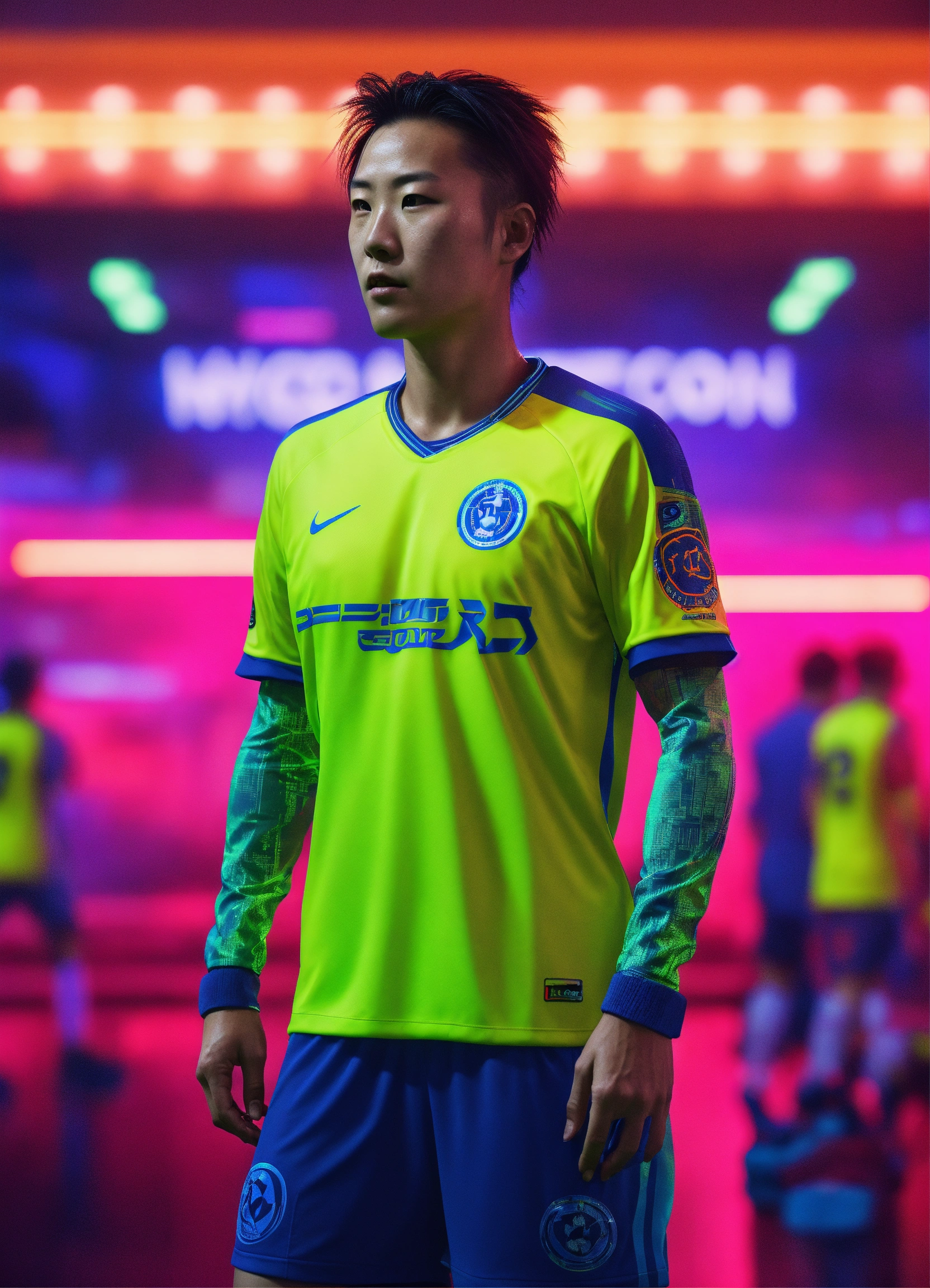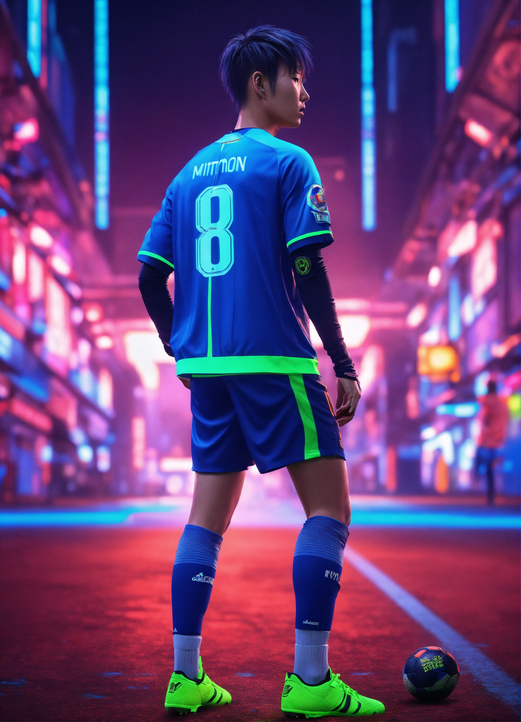 Kaoru mitoma, a soccer player from brighton, cyberpunk style, 8k, hyper realistic, neon lights, full body, hyper-detailed, volumetric lighting