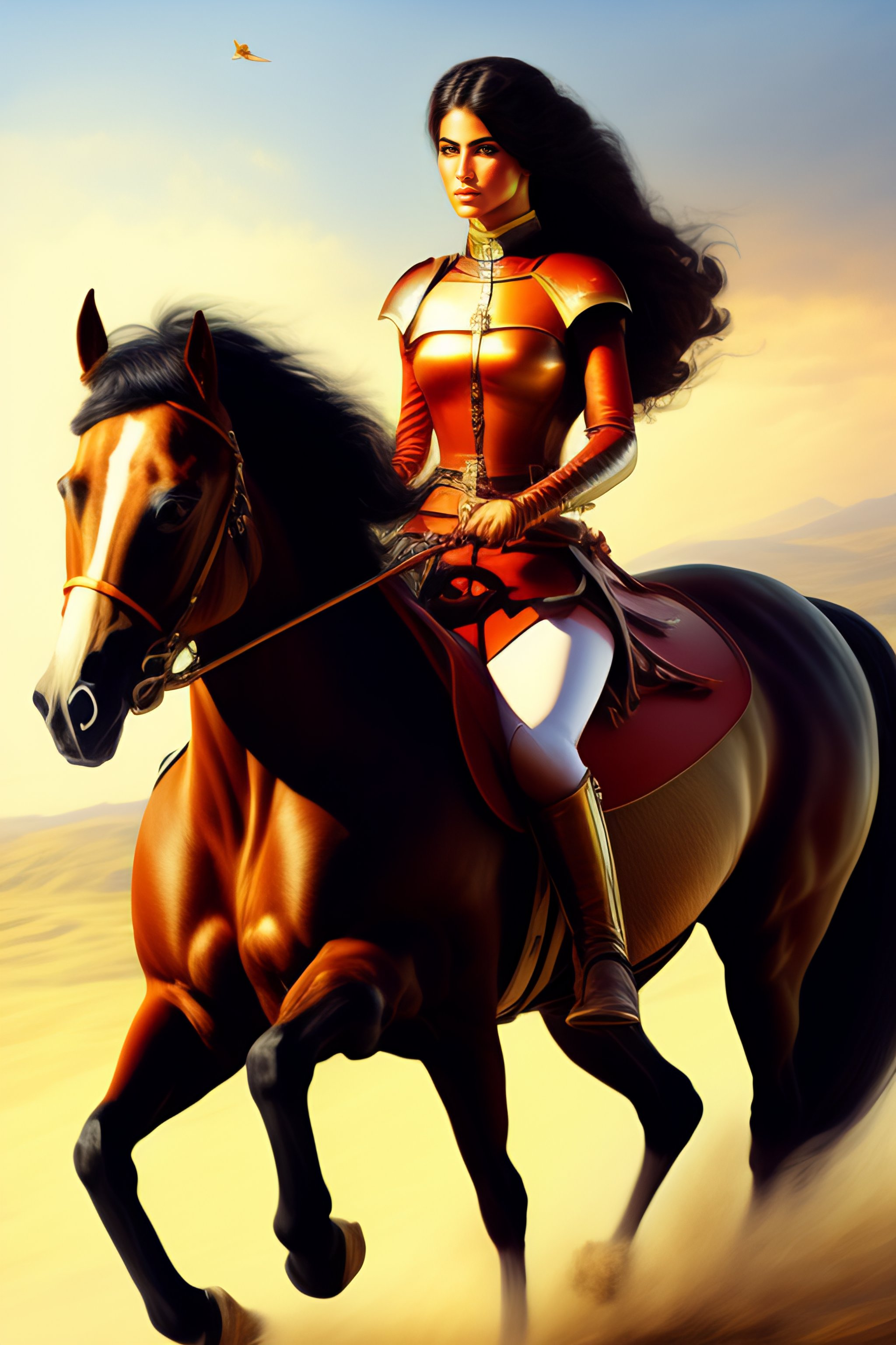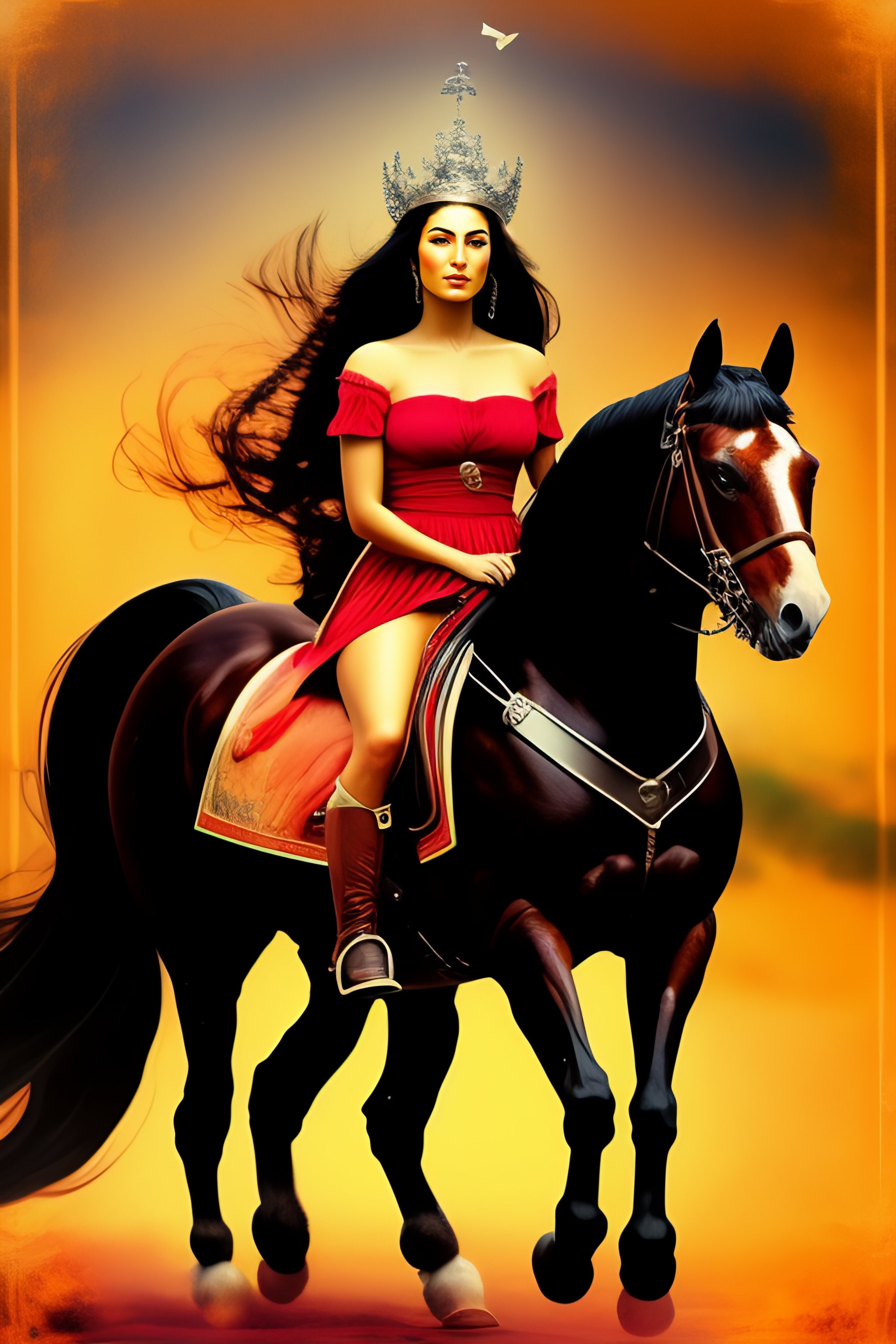 Persian fighter woman, persepolis, straight and long hair, riding a horse, persian beautiful face, power, determination, leading people, freedom, poetry, a hero, queen of iran, iranian crown, tarot card, queen of sword, achaemenid clothes, sexy style and body