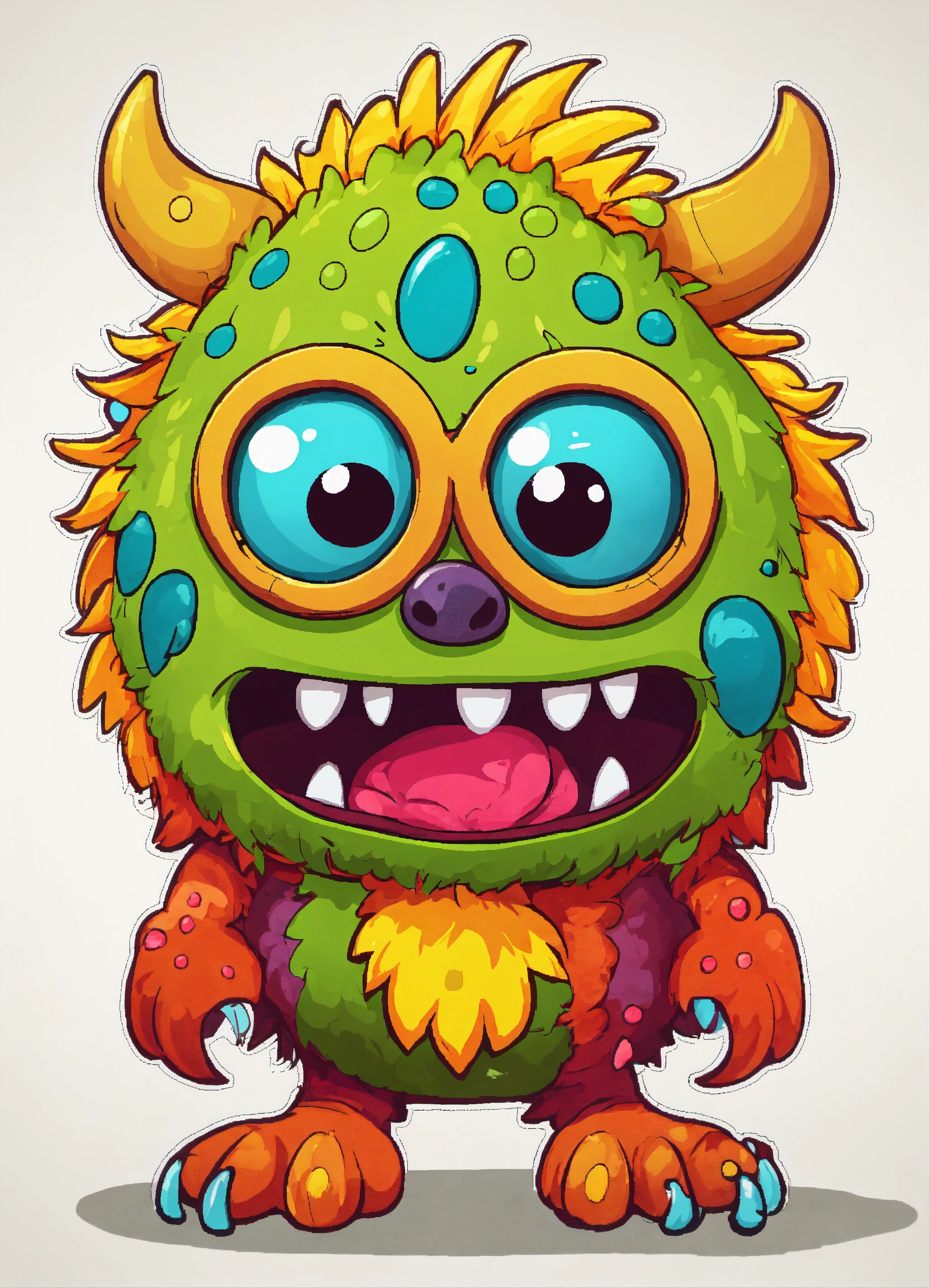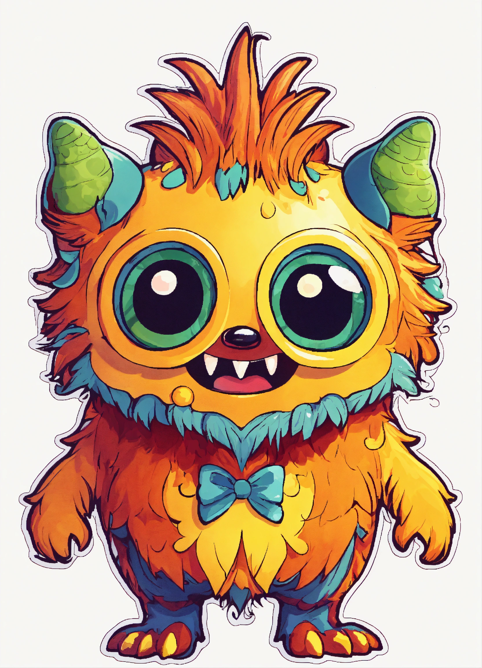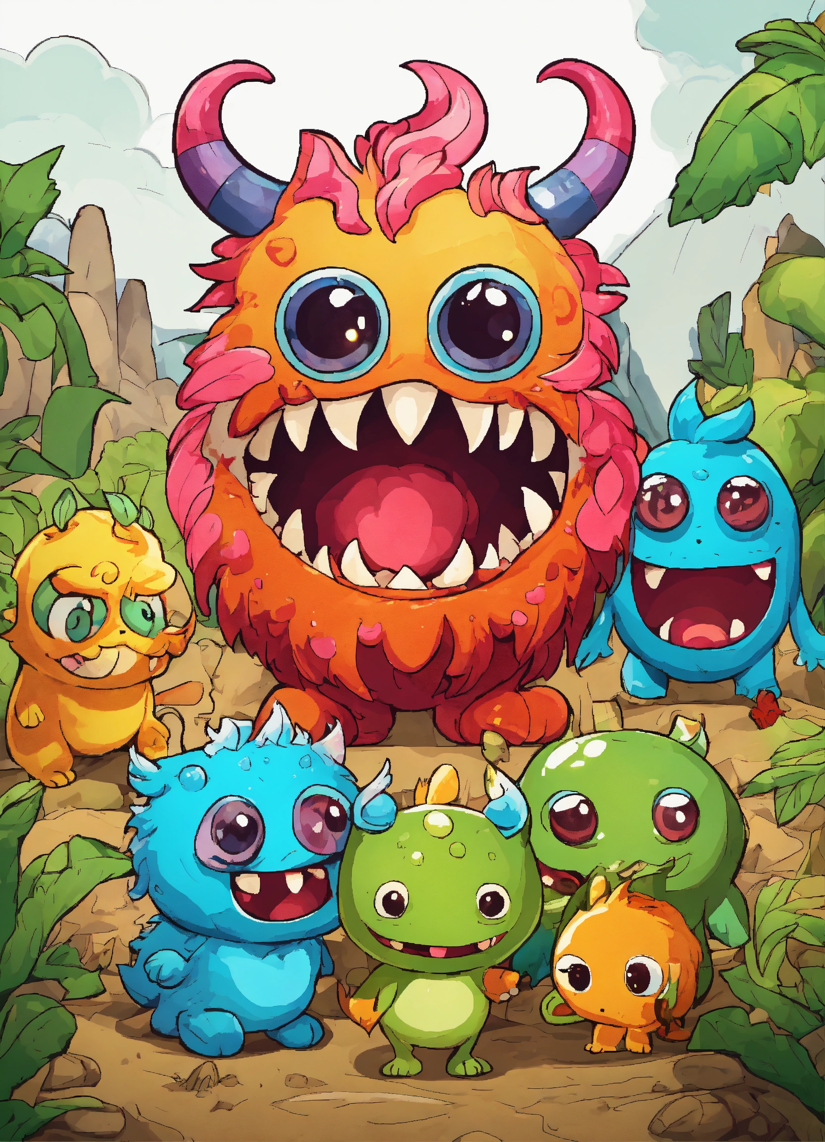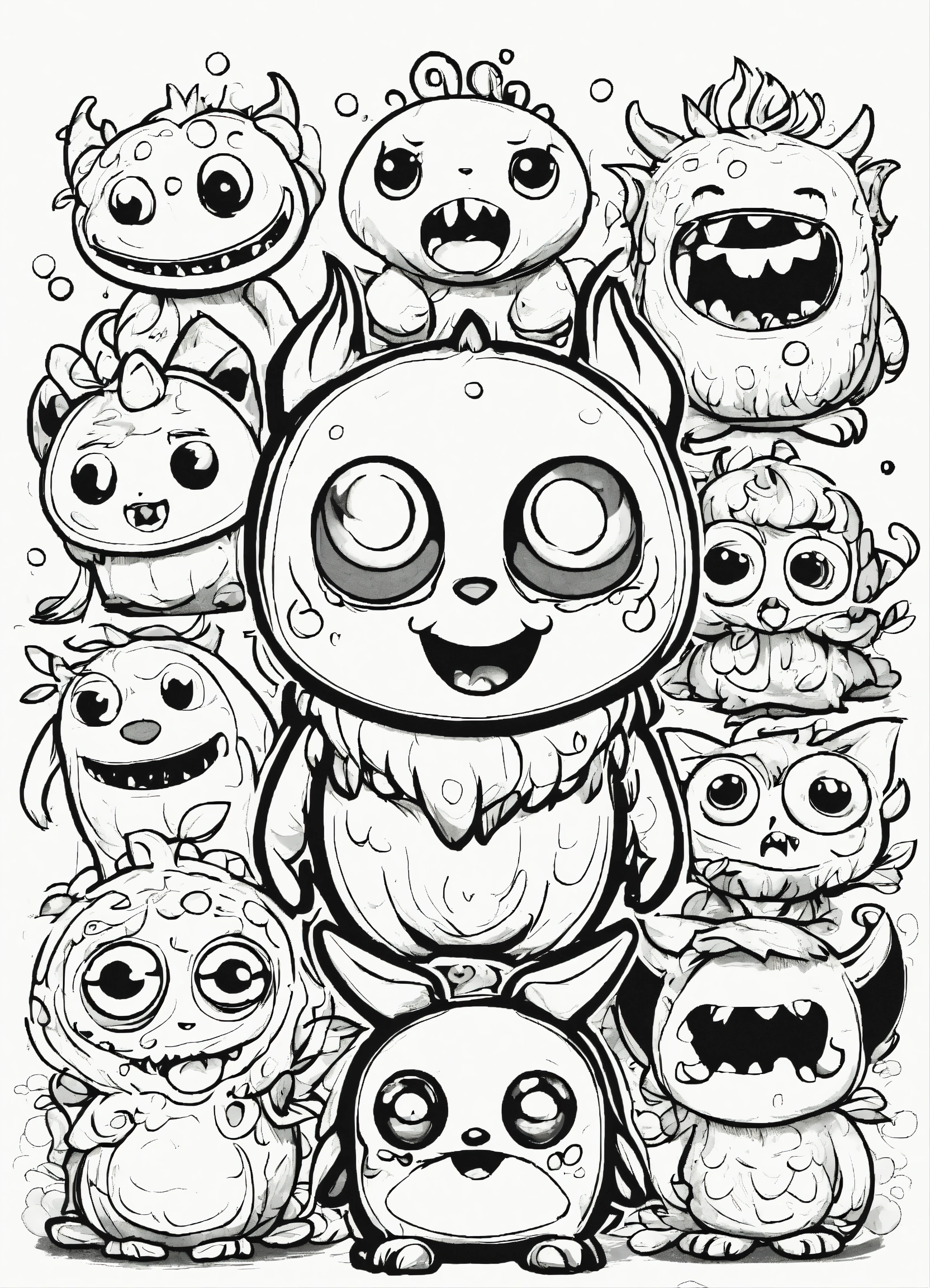 Generate a cute little monsters illustration, 4k resolution, cartoon-sticker style with clear lines on a pure white background suitable for a children's coloring book.