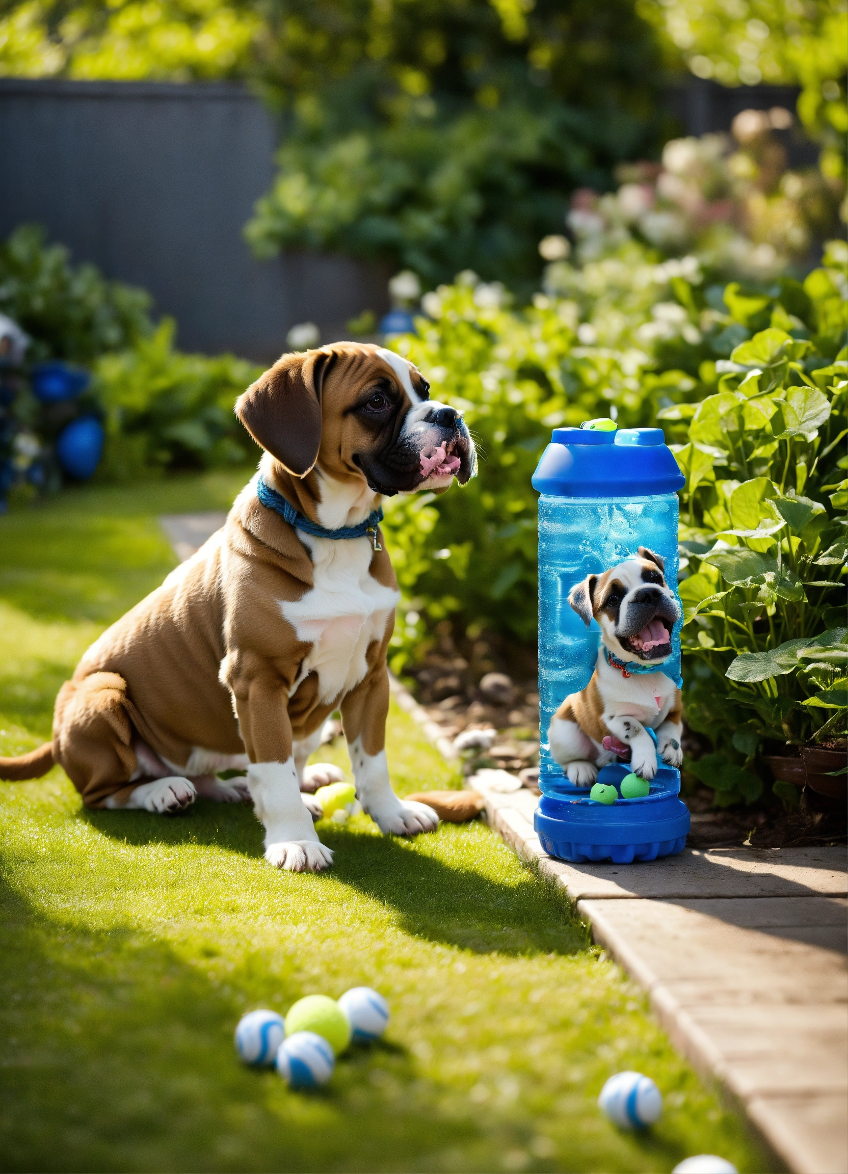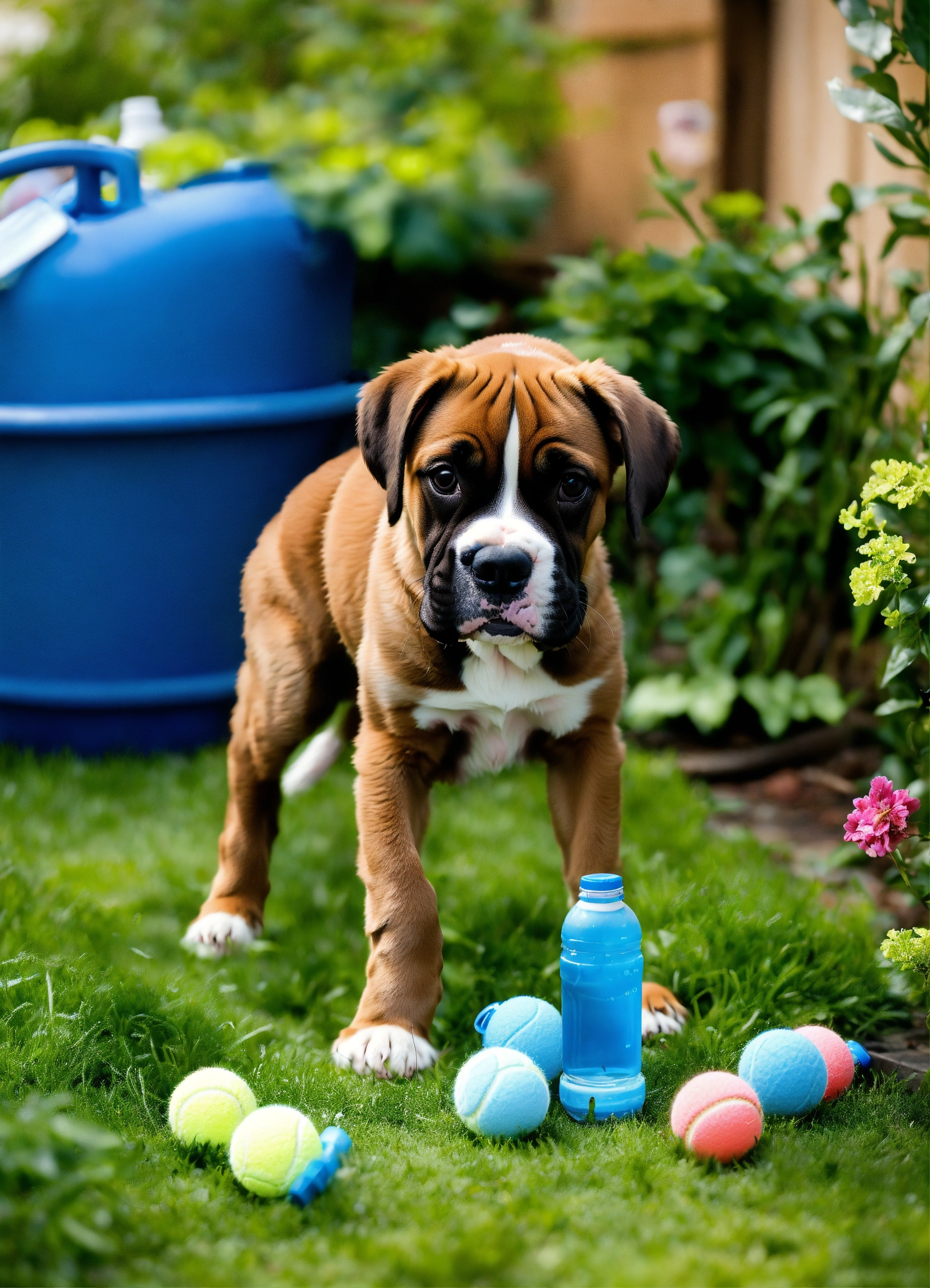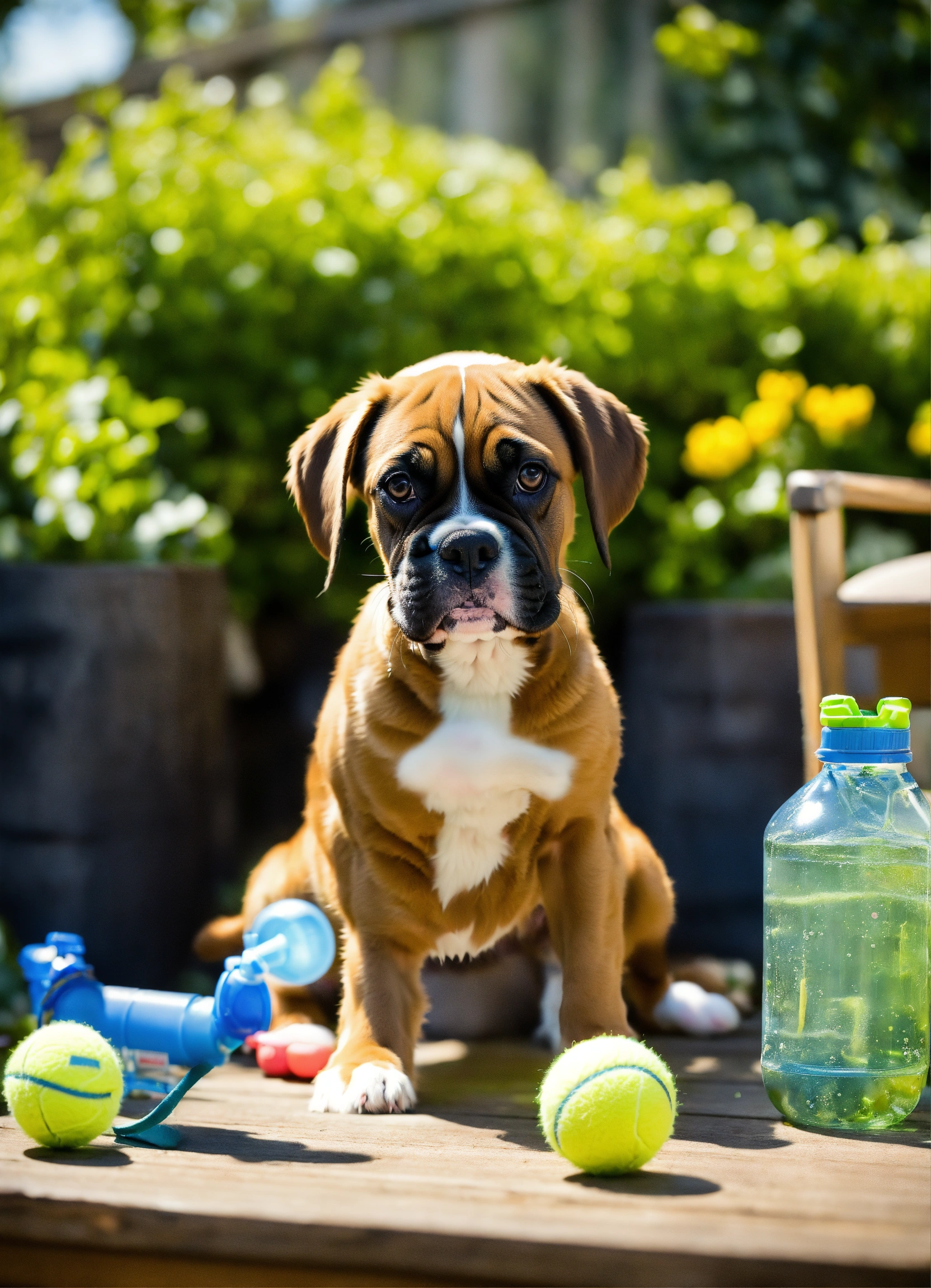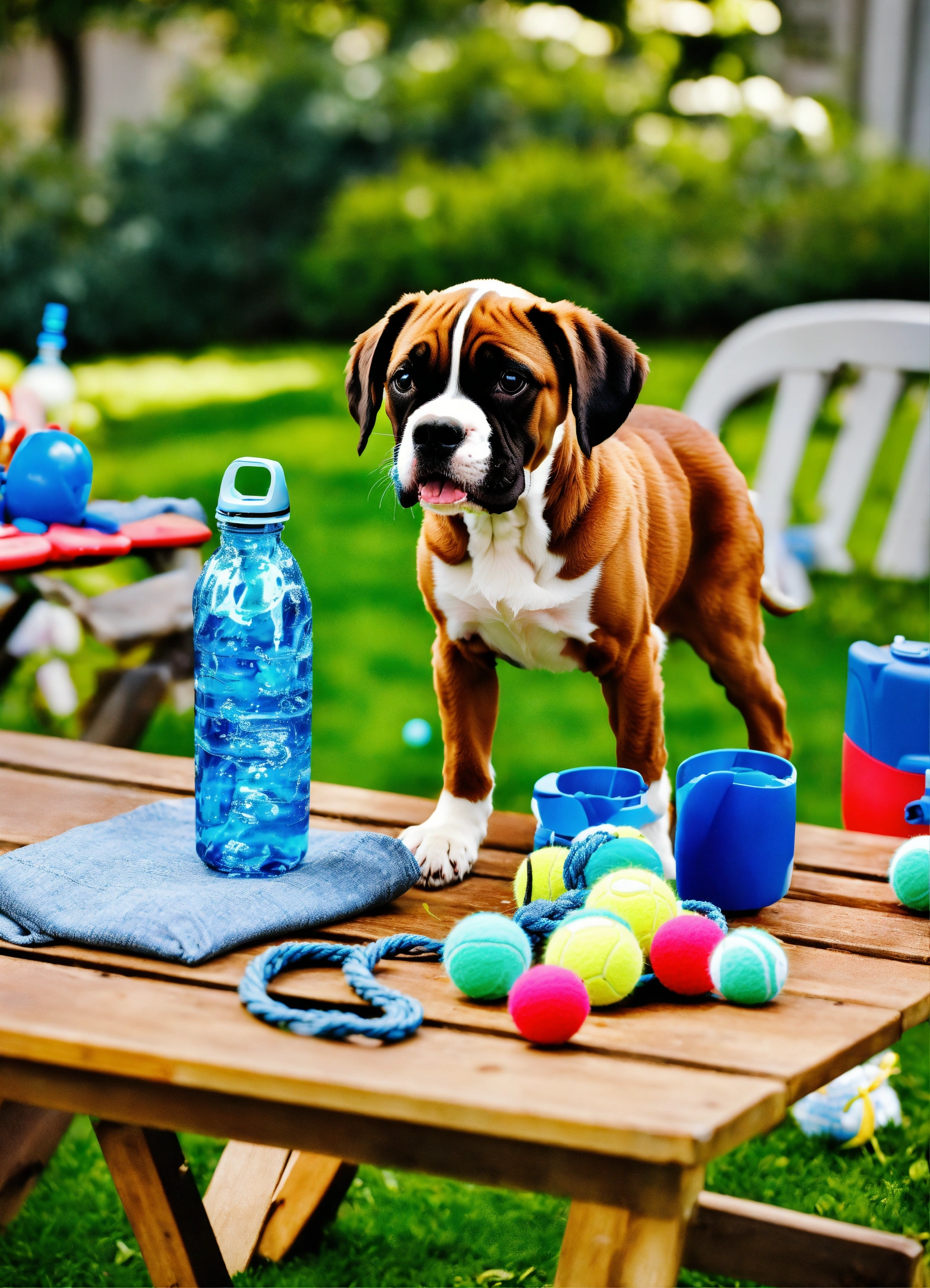 "in a garden setting, puppies eagerly queue up beside a table laden with diy dog toys crafted from denim, tennis balls, and ropes. a boxer puppy excitedly wrestles with a repurposed water bottle cruncher, the scene oozing joy."