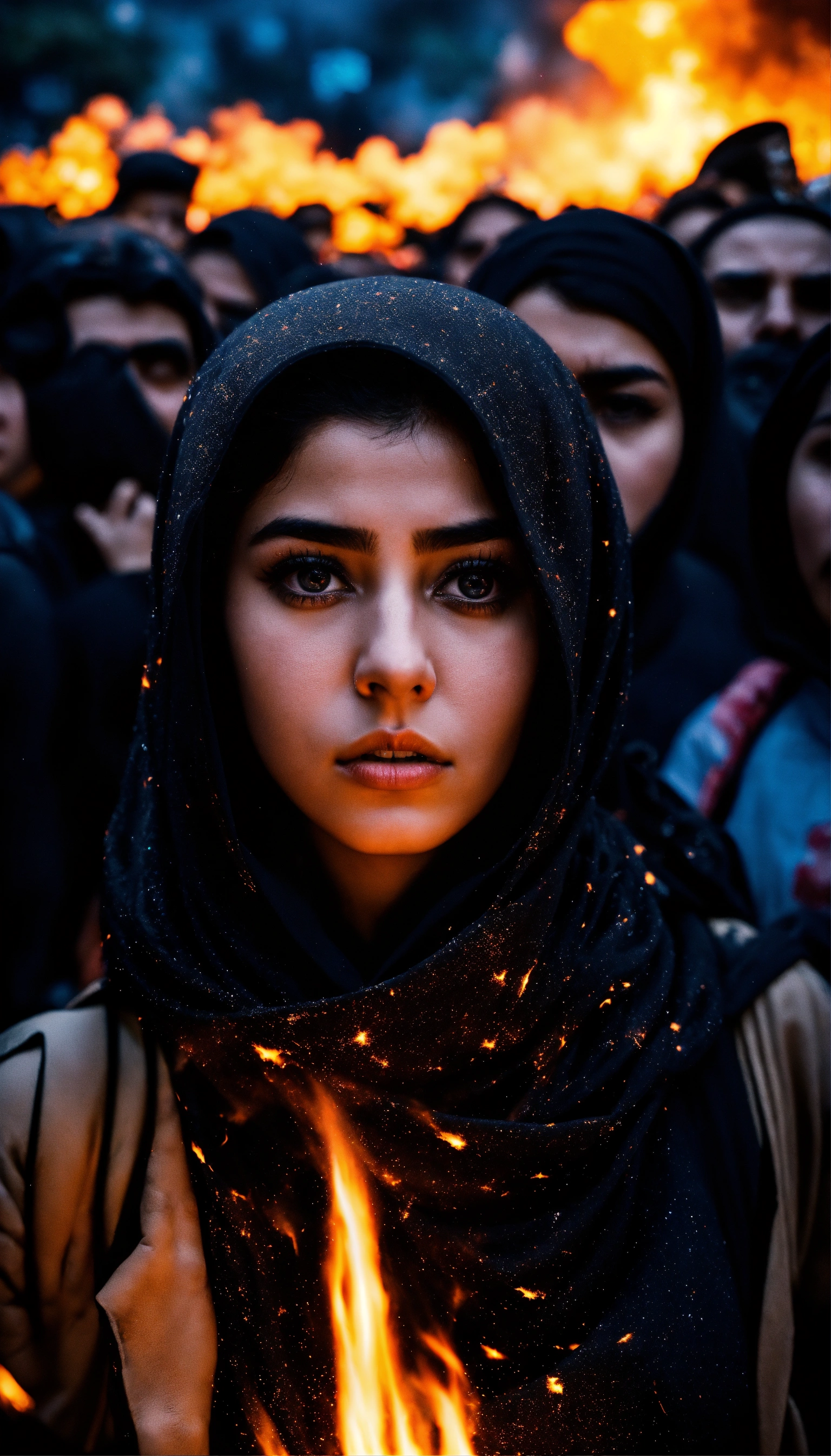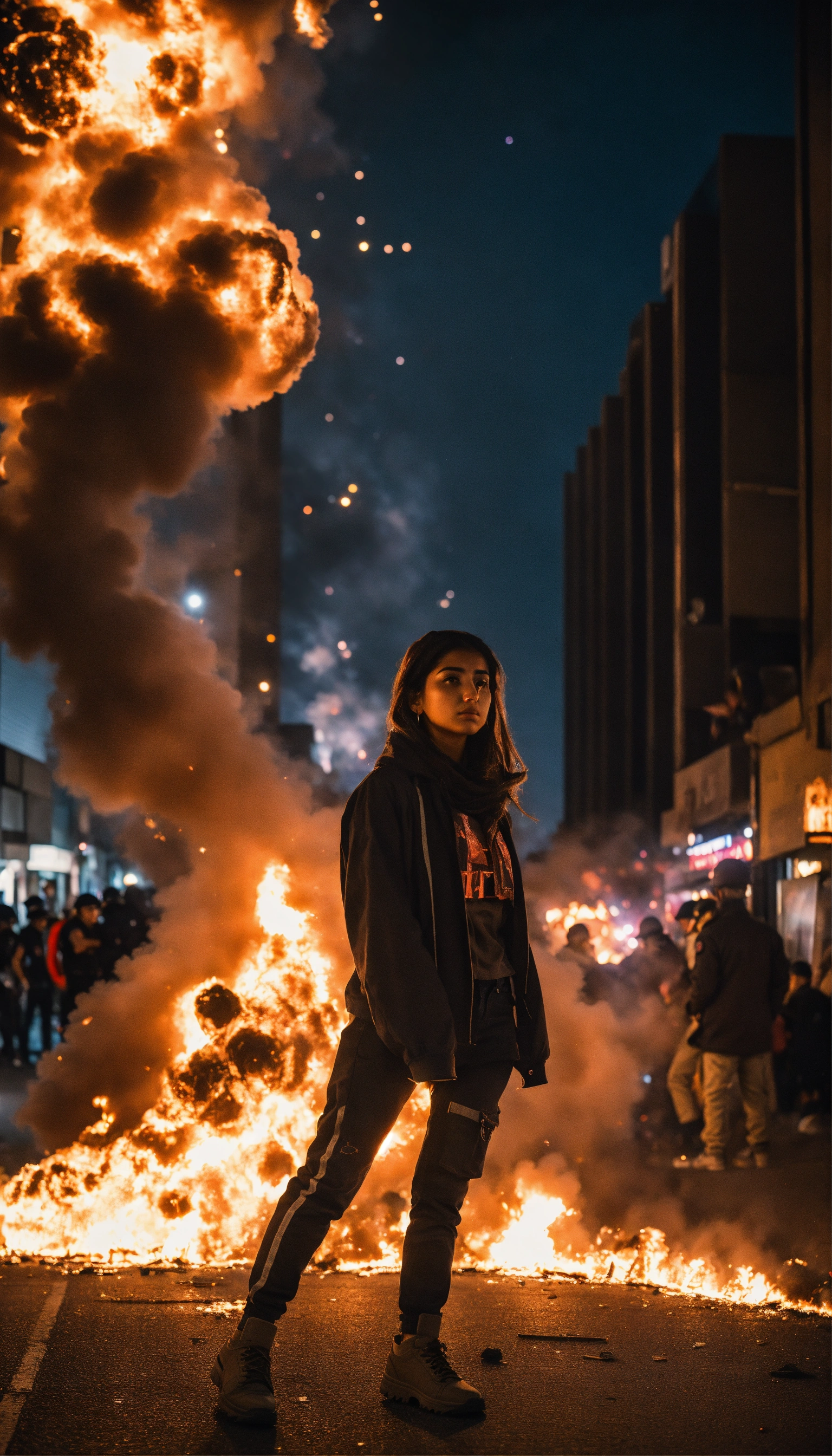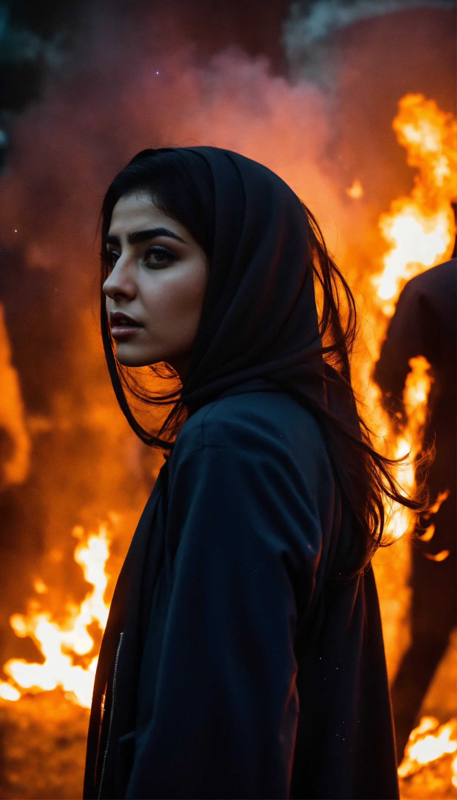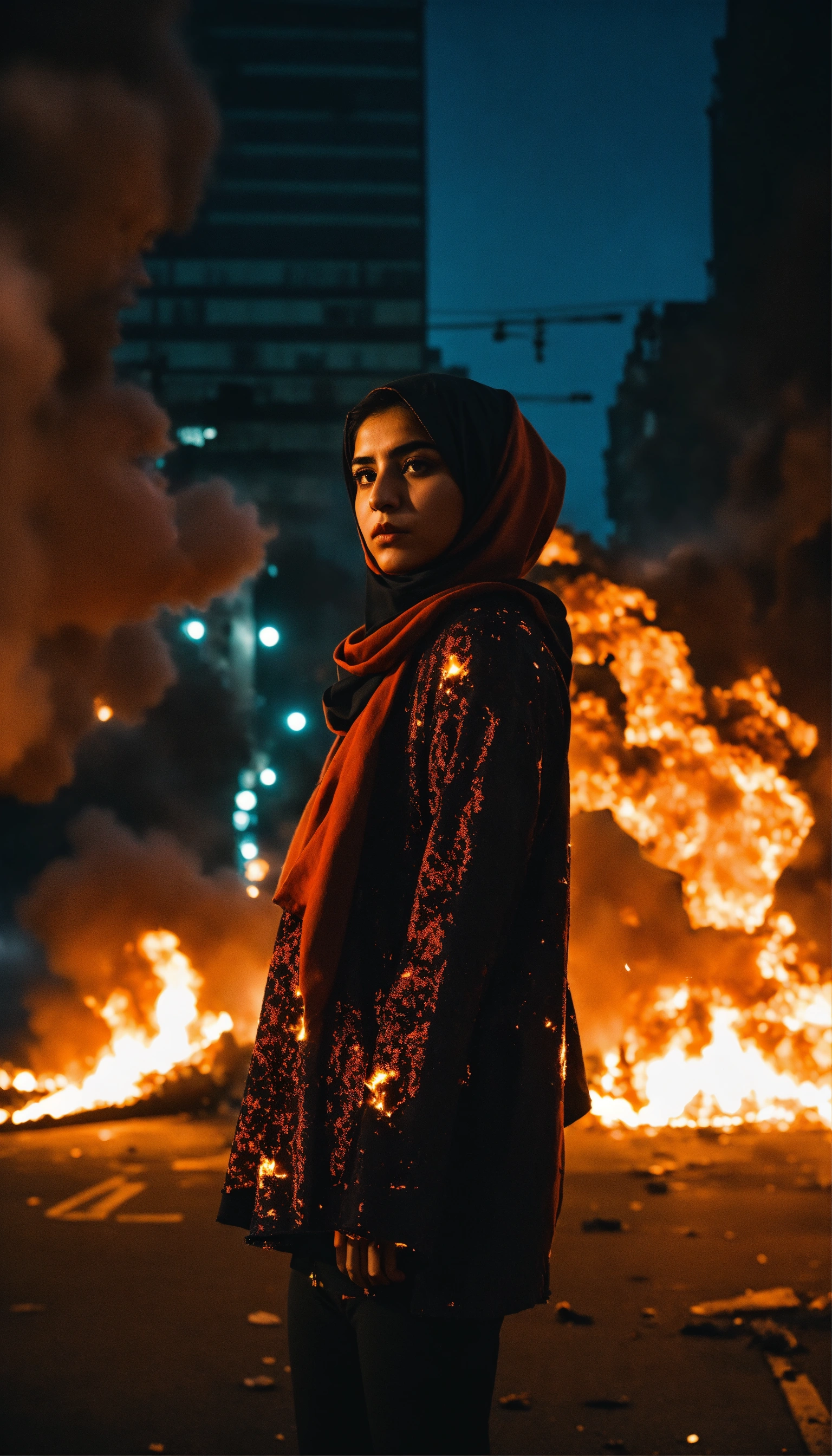 Dark aesthetic photo, an iranian girl amidst a chaotic street protest in tehran, the scene is filled with tension and unrest, as flames from an explosion illuminate the night sky, stunning surreal photo of an intense scene. she is looking at the camera.