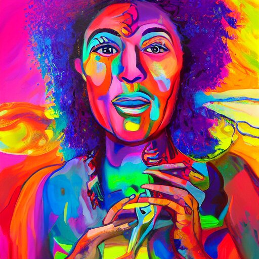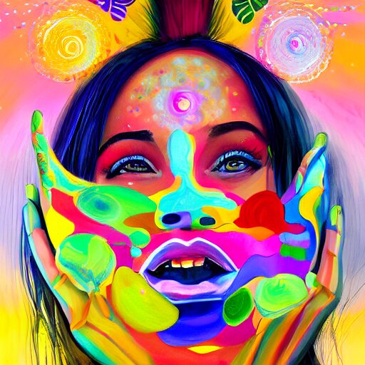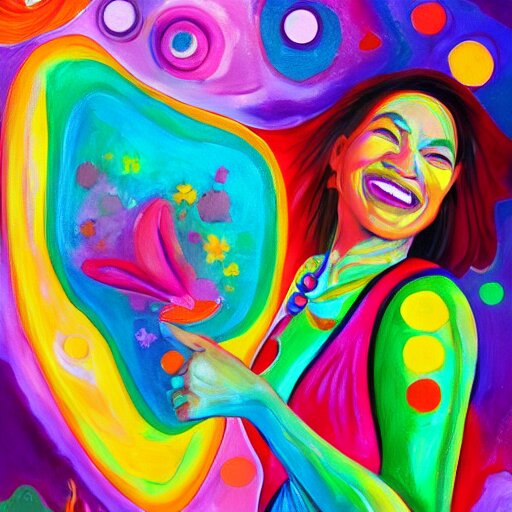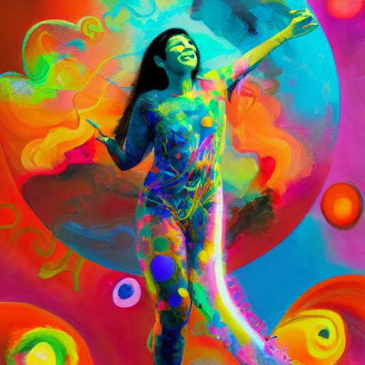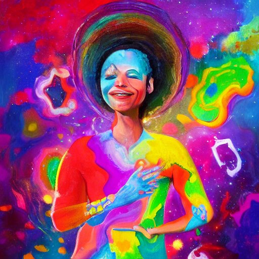 A colorful painting of a joyful artist playing with her creativity in the infinite loving universe by brenda zlamany and craig wylie, trending on artstation.