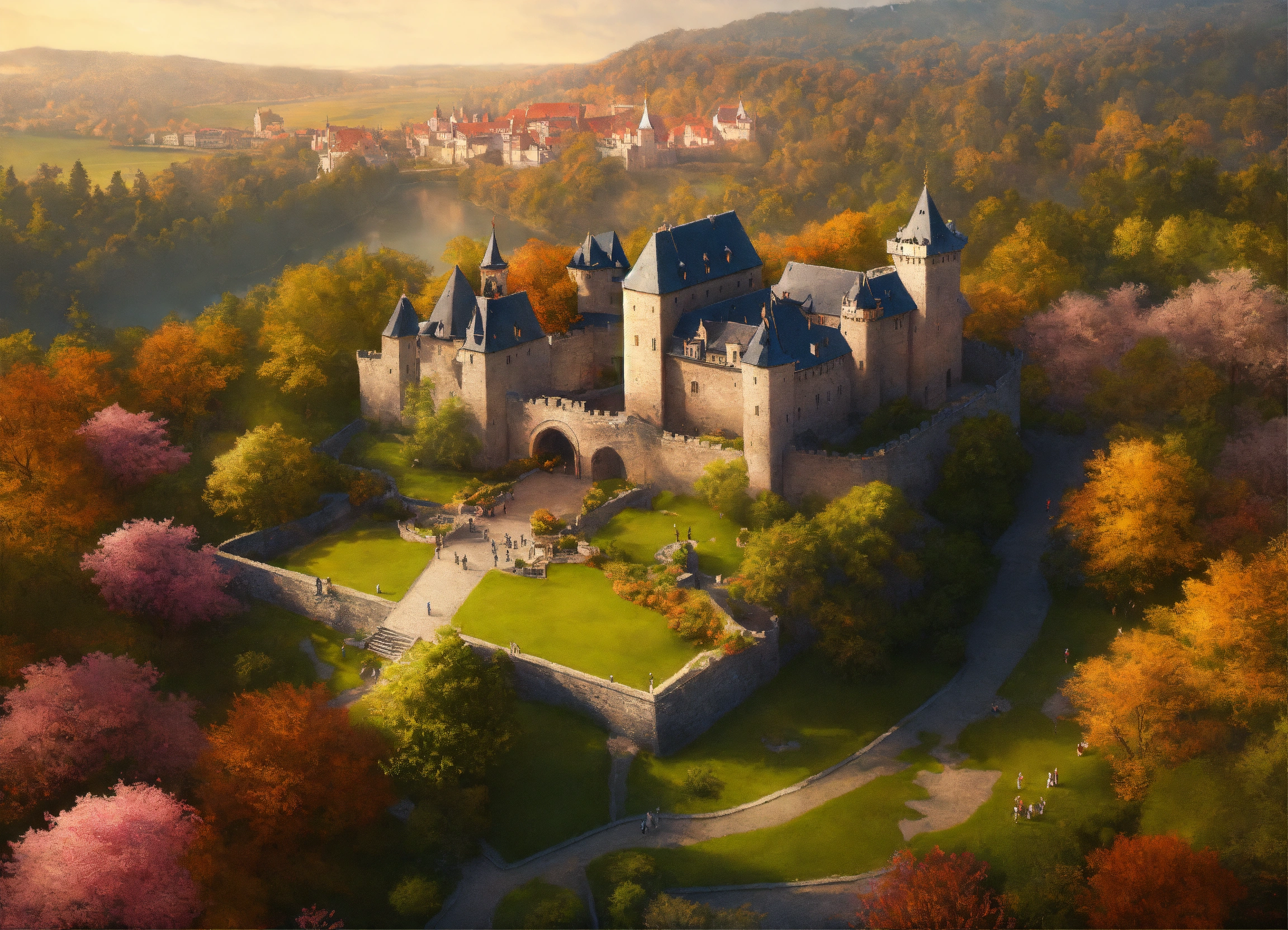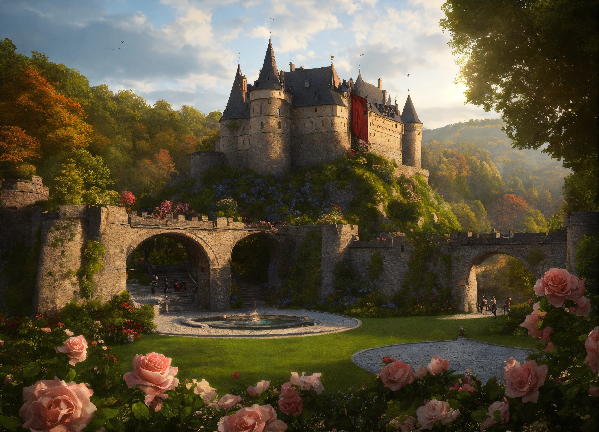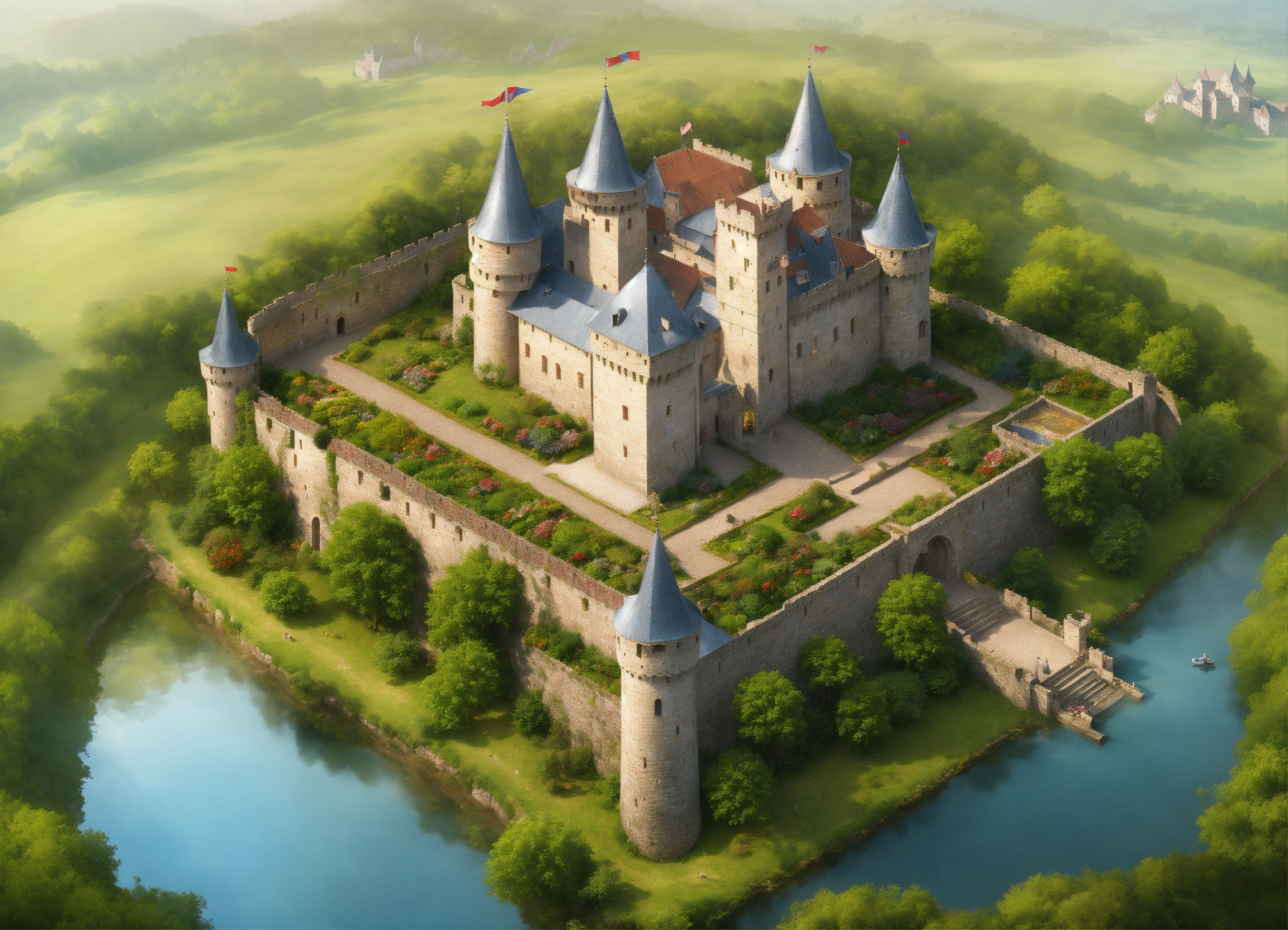 Ultra realistic, photorealistic, bird's eye view, on a narrow mountain plateau a small medieval castle sits enthroned on the back end of a narrow mountain plateau and can only be reached via a bridge with a gatehouse, from the gatehouse at the front end of the plateau a tree-lined boulevard leads to the castle gate, the boulevard is surrounded by rose gardens and water features, on the sides of the castle garden the rocky hangs slope dozens of steps steeply downwards, crenellated stone wall with a central wall gate and watchtowers surrounds the castle, magnificent fountain, marble figures in the gardens, servants quarters and stables, rose pavillon, pleasure grotto, large forecourt, ultra detailled, focus on castle, sharp focus, sharp, ambient lighting, ksiąz castle in poland