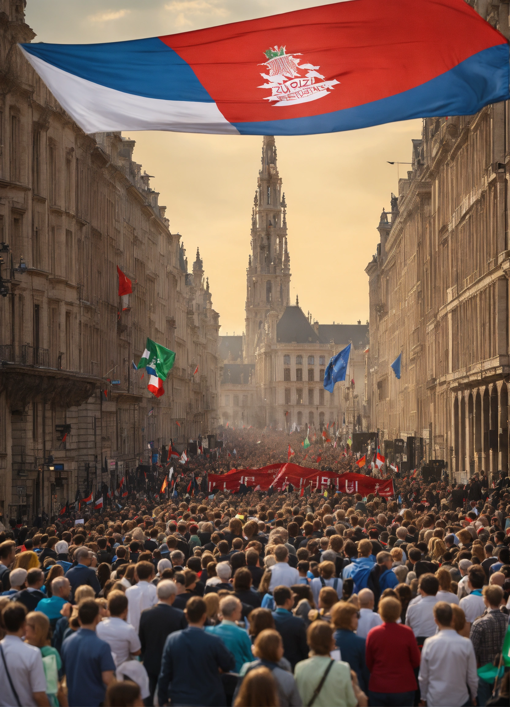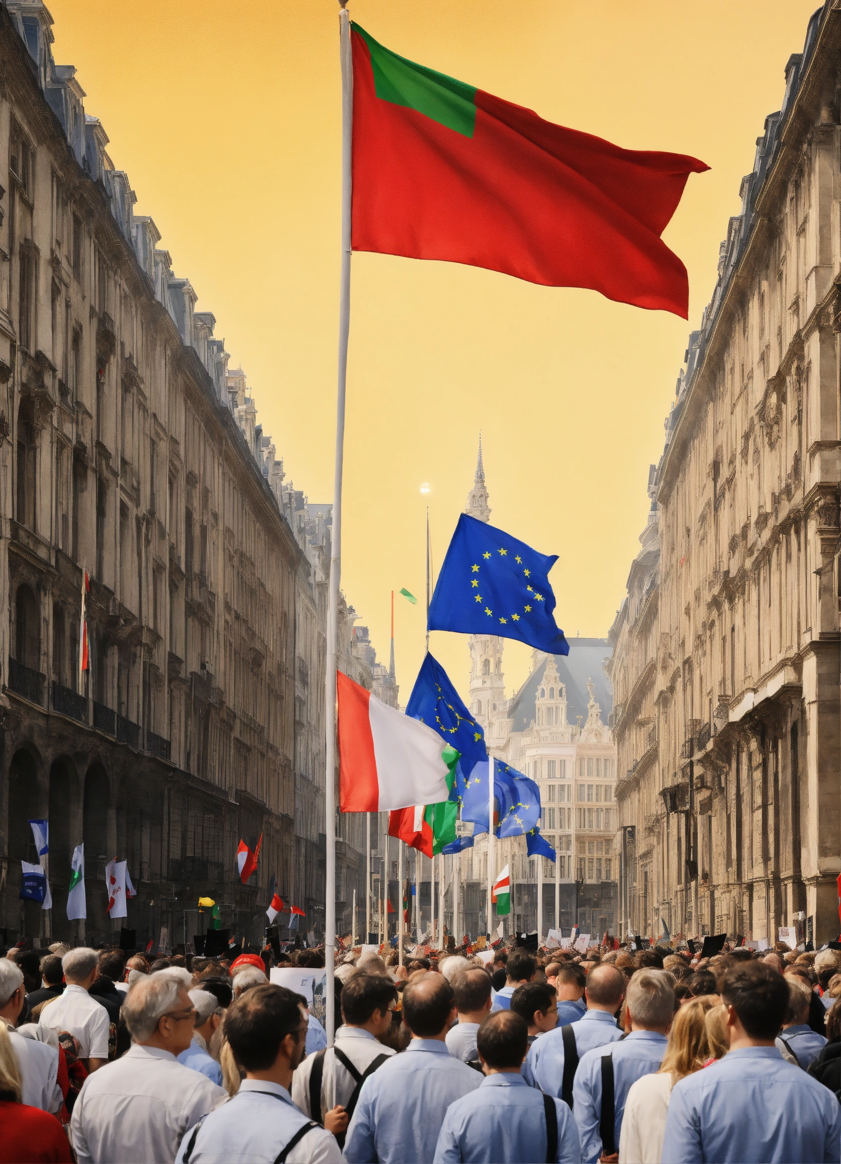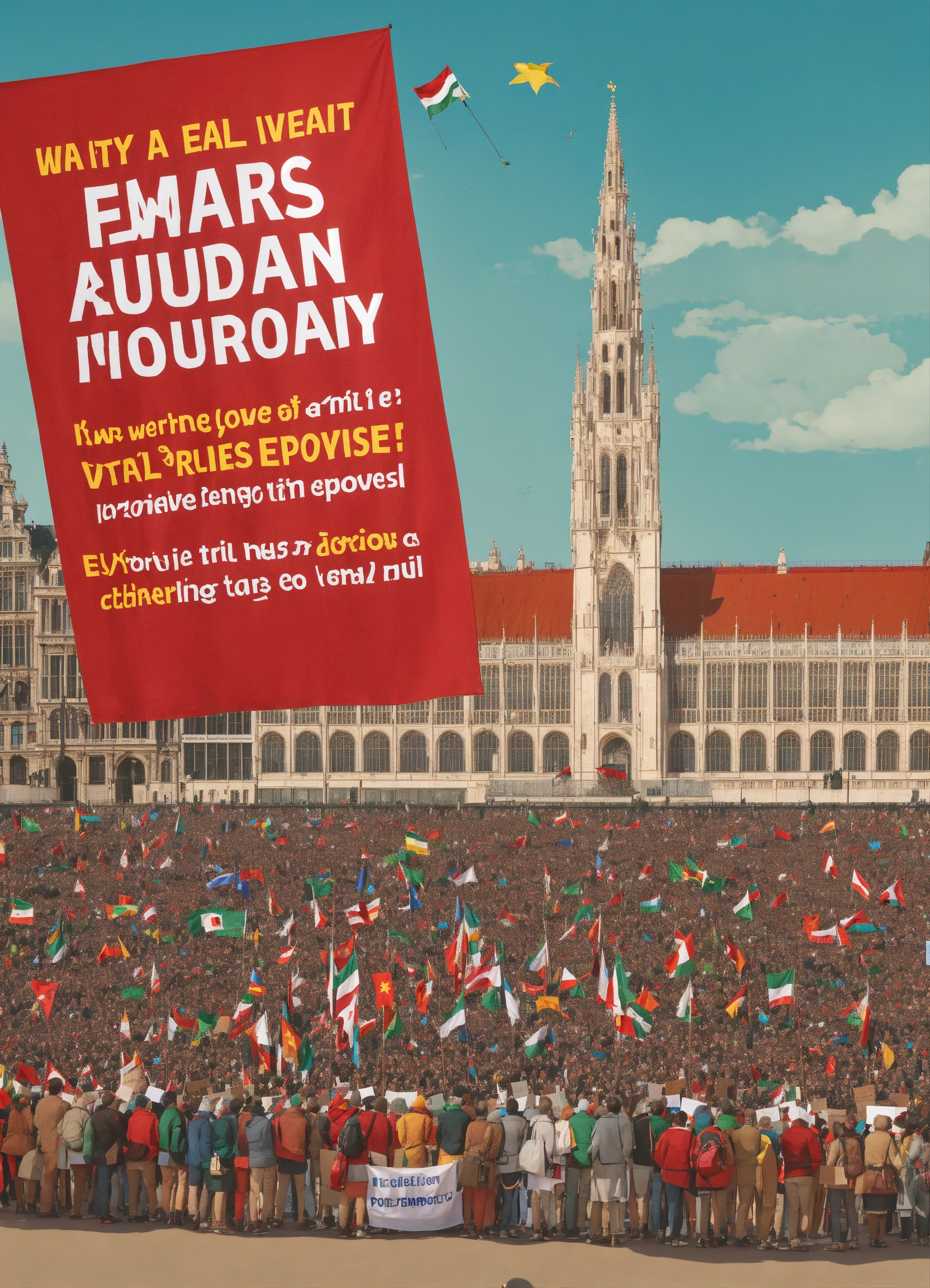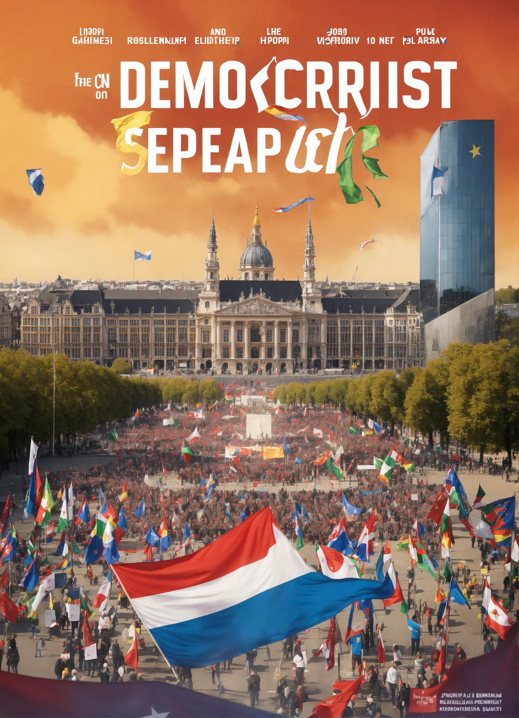 Create a poster for an invitation to the conference, with the european parliament square in brussels in the background, for an invitation to a gathering that will call the participants to come to the gathering. a crowd of protesting people, carrying the flag of israel, the flag of hungary, the flag of poland and the flag of the european union. in front of them, above them, a long banner they carry by sticks on both sides, with the text "democrisis" realistic