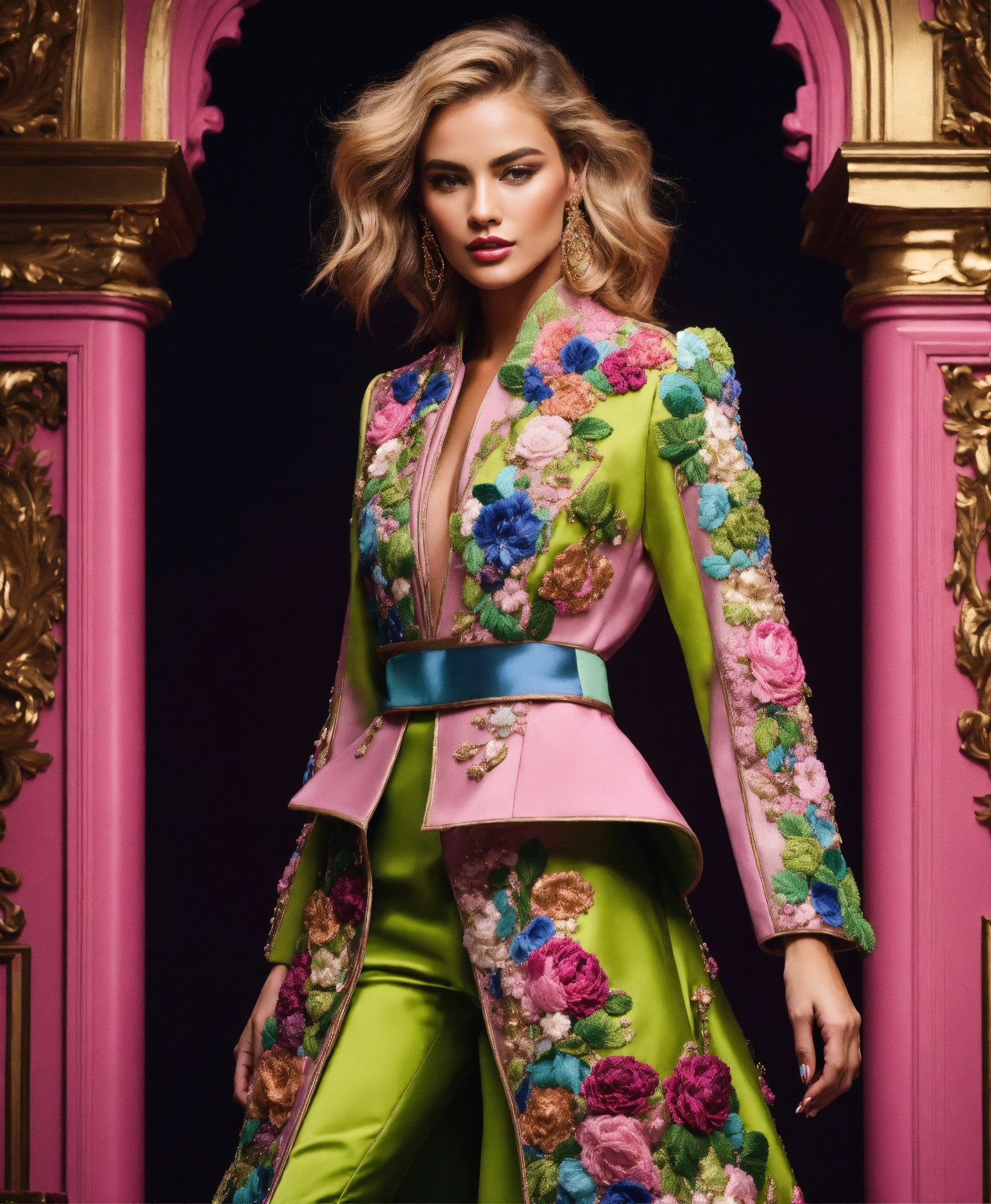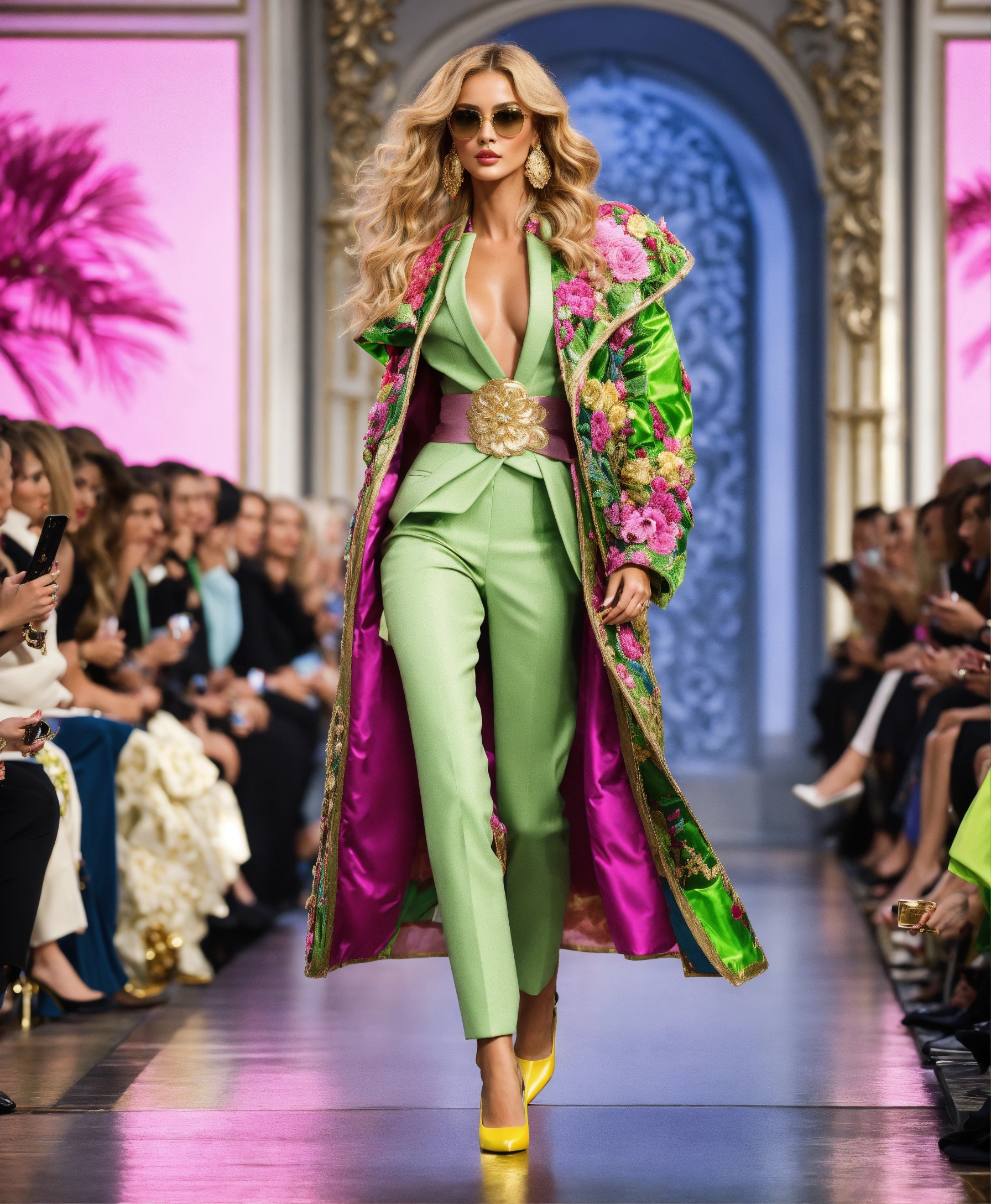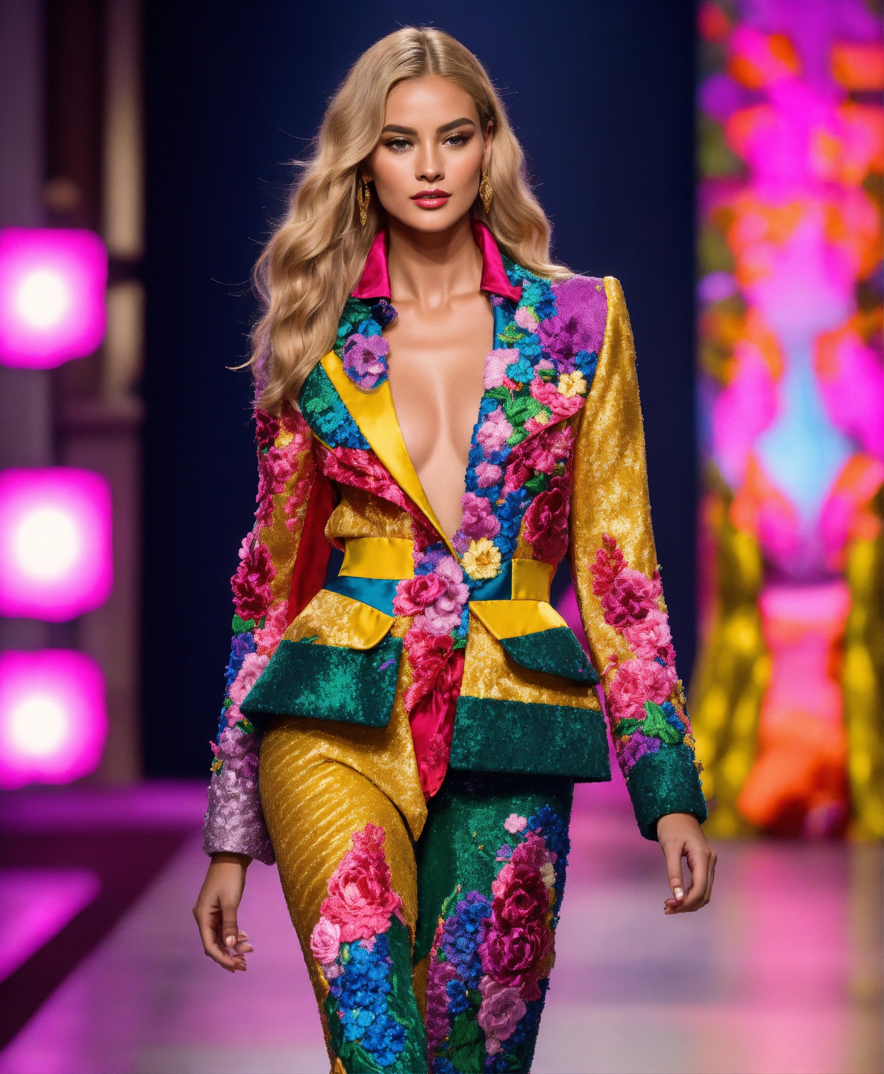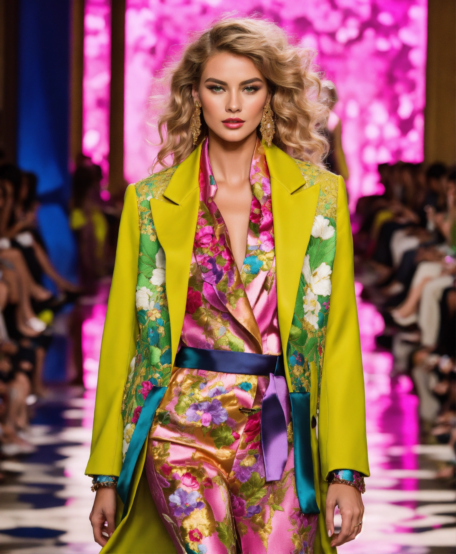 Ultra realistic full body photo of a stylish beautiful elegant blonde supermodel voluminous wavy hair walking the runway modeling summer cruise designer wear brave, paris versailles details cutouts and gold geometric pattern floral structured tailored jacket pink gold green lilac peridot silver magenta lime fuchsia yellow blue black gray copper mauve bronze haute couture embroidered contrasting colors vivid intricate bold vibrant glamorous ultimate elegance beautiful luxurious awesome wealthy opulent exquisite resplendent magnificent sublime 12k