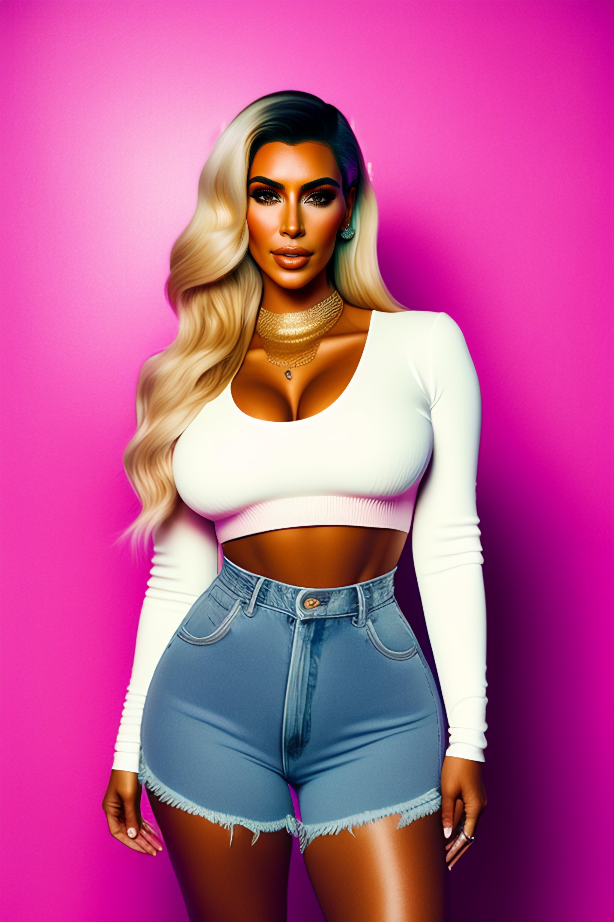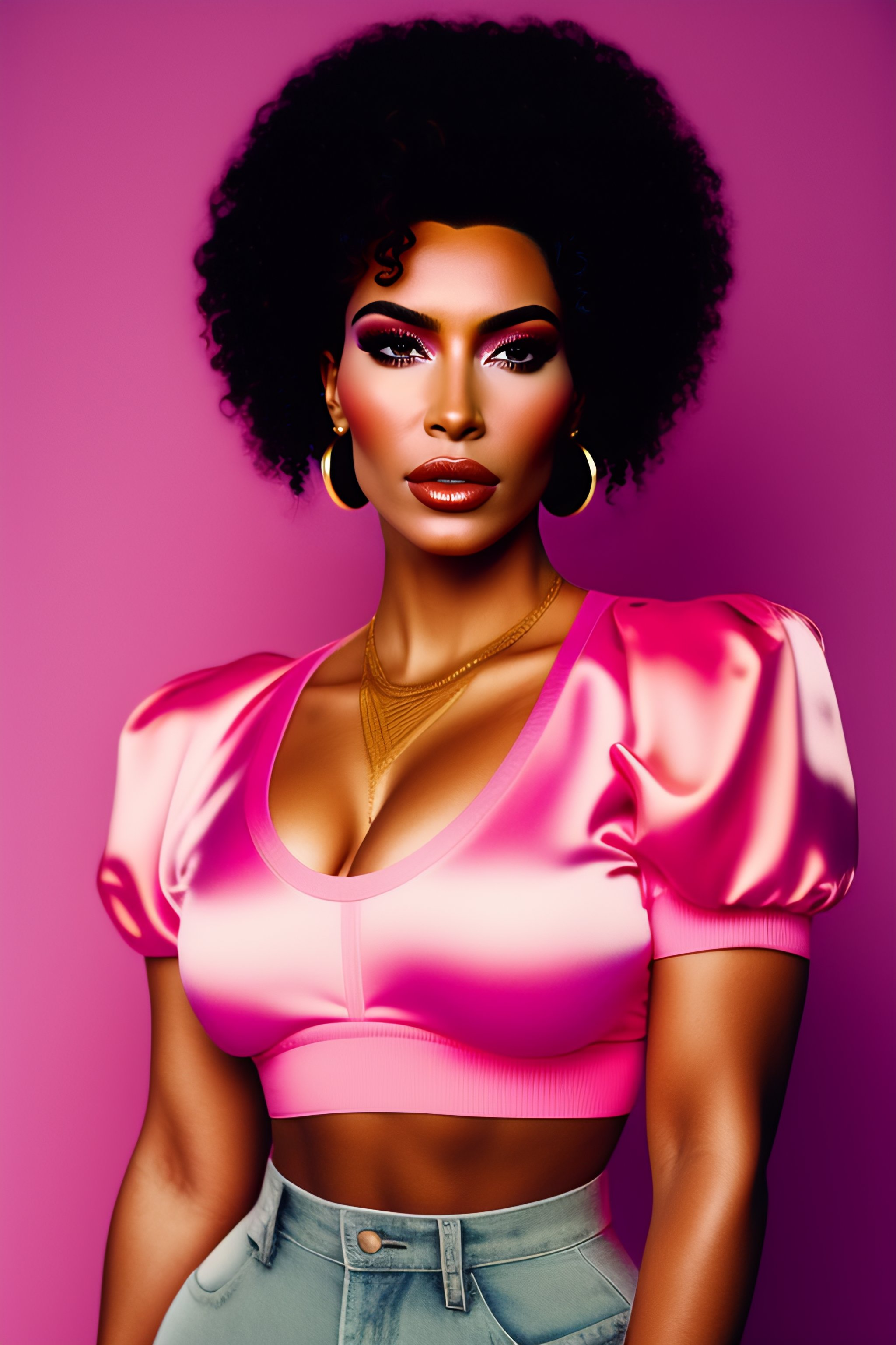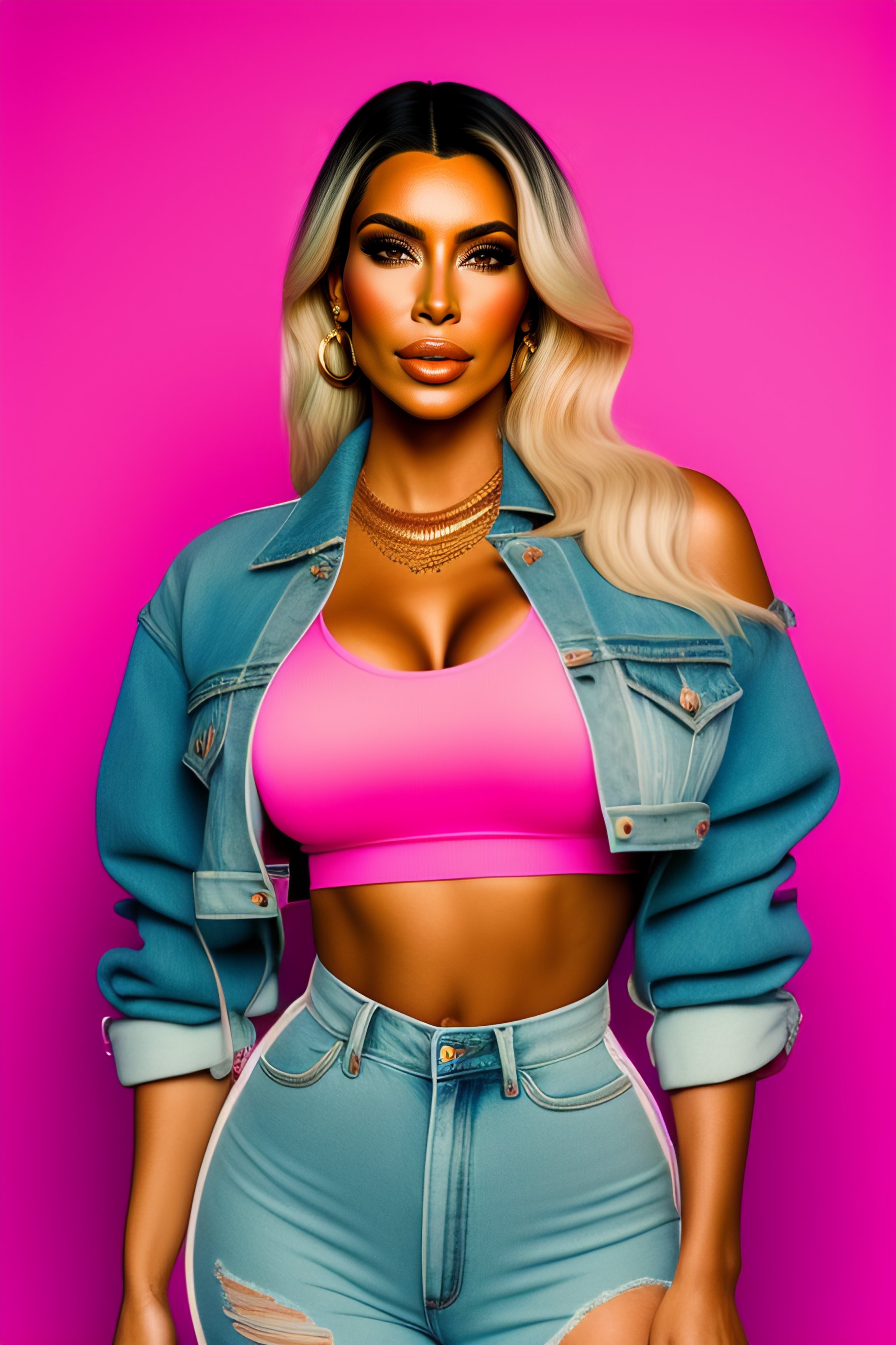 Kim kardashian wearing mom jeans, tight crop top, blond hair, pink background photoshoot, medium format, portra 400
