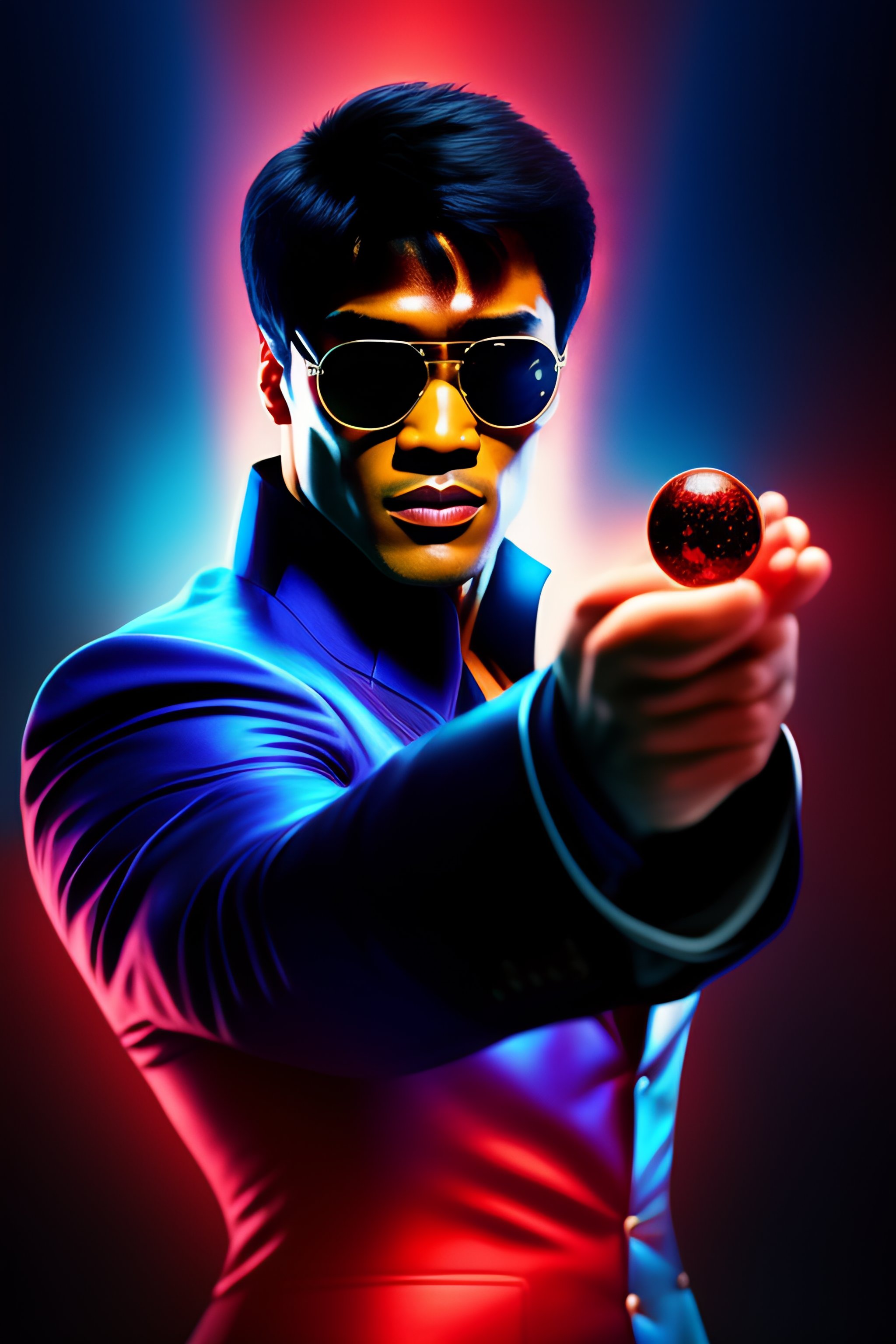 Morpheus from the matrix but he's bruce lee, 8k, holding a small red pill in the palm of one hand and a small blue pill in the palm of the other hand, background is a warehouse